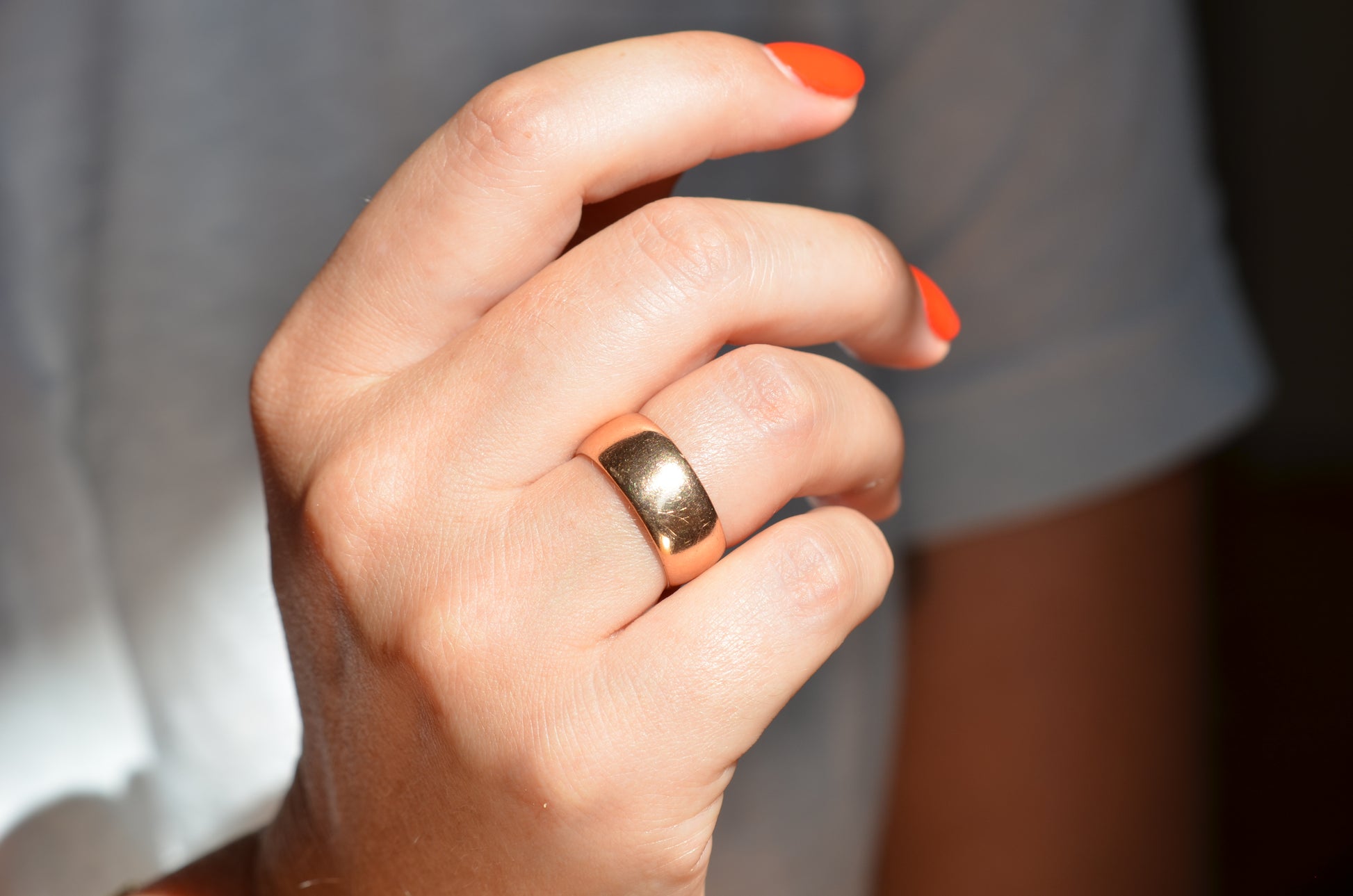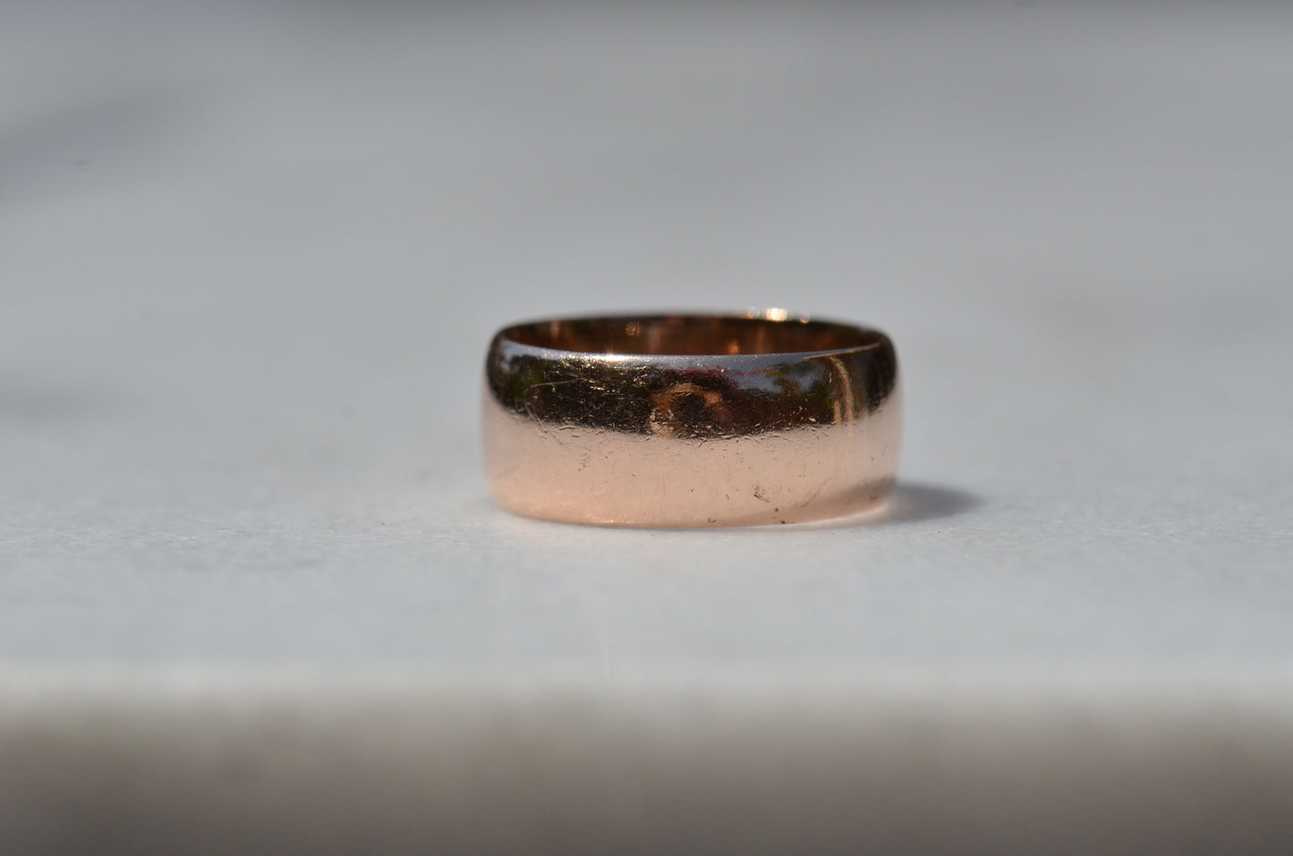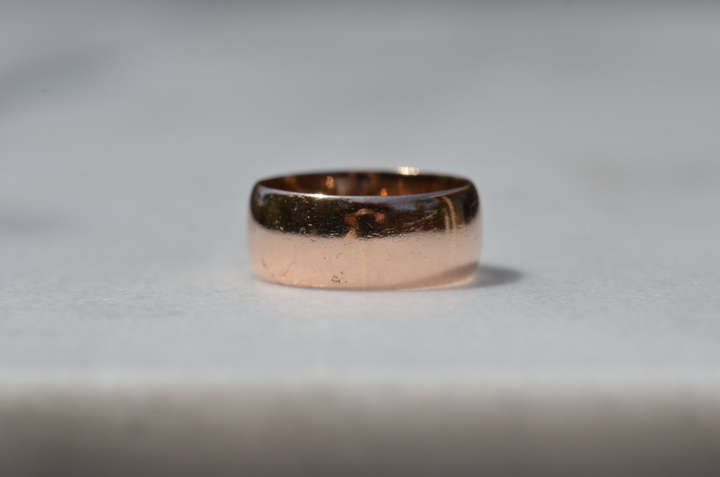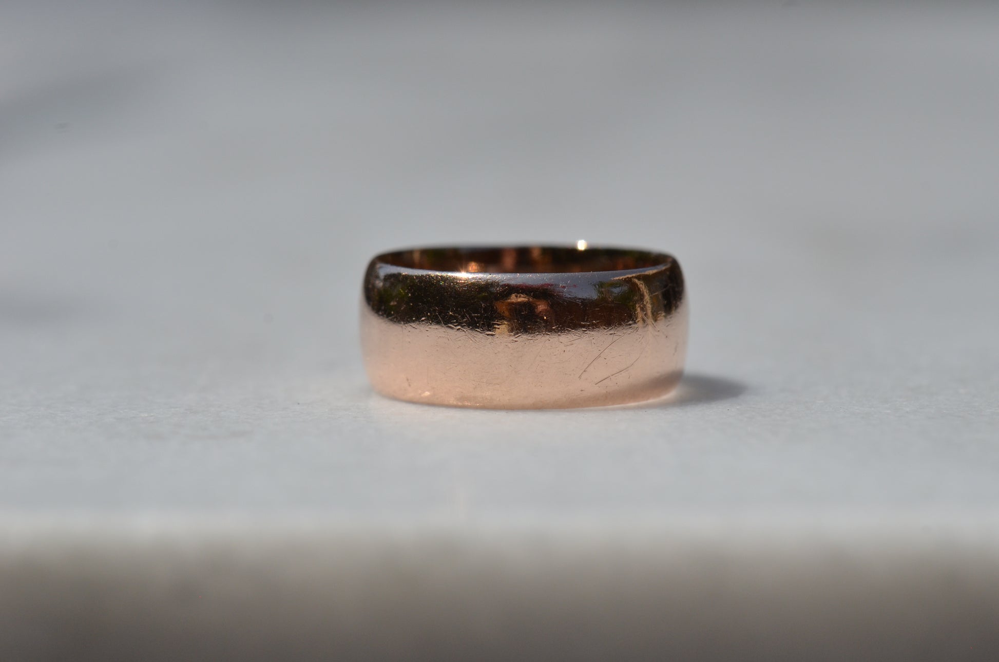 This ring! Radiating warmth and softness from the colour and wear of the gold, but with a powerful presence from its sheer size - we're smitten. British hallmarks date the ring to 1924, yet the style of the ring draws on generations before and sets the tone for generations to come. A flat interior and very gentle doming to the exterior mean that the ring has a slim fit between the fingers and doesn't feel bulky despite its broad width. We adore this ring as a wedding band, statement ring, or stacking ring.
