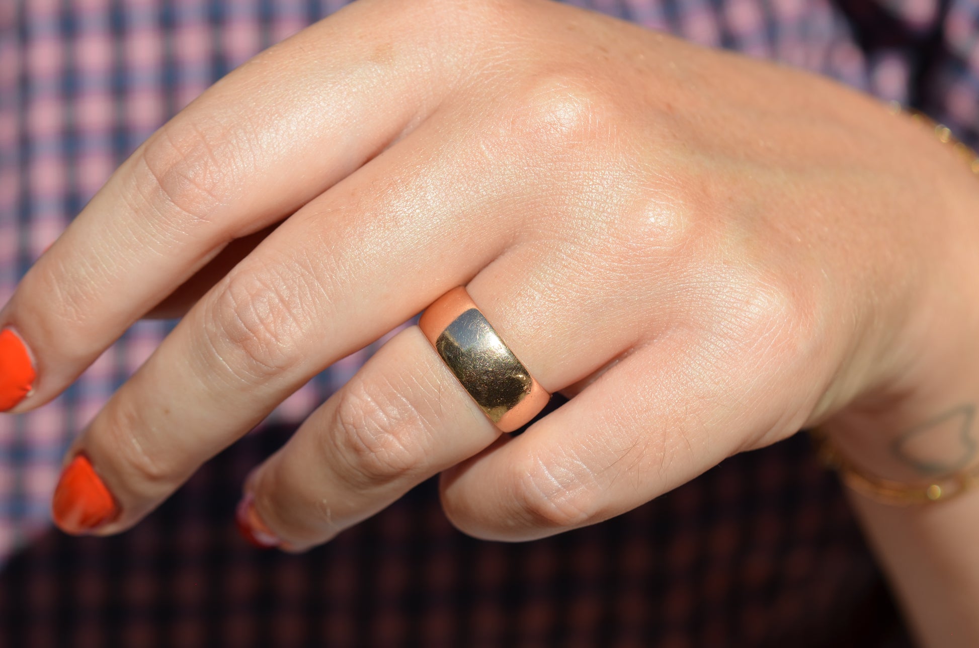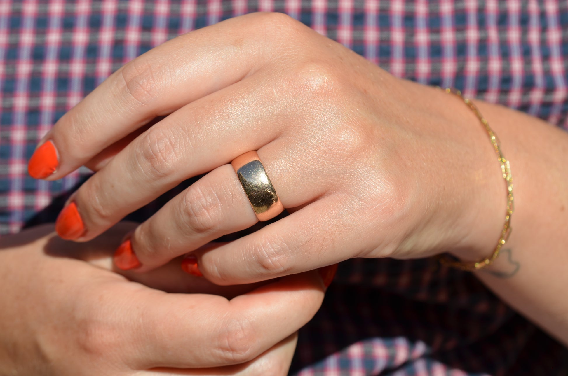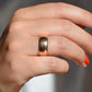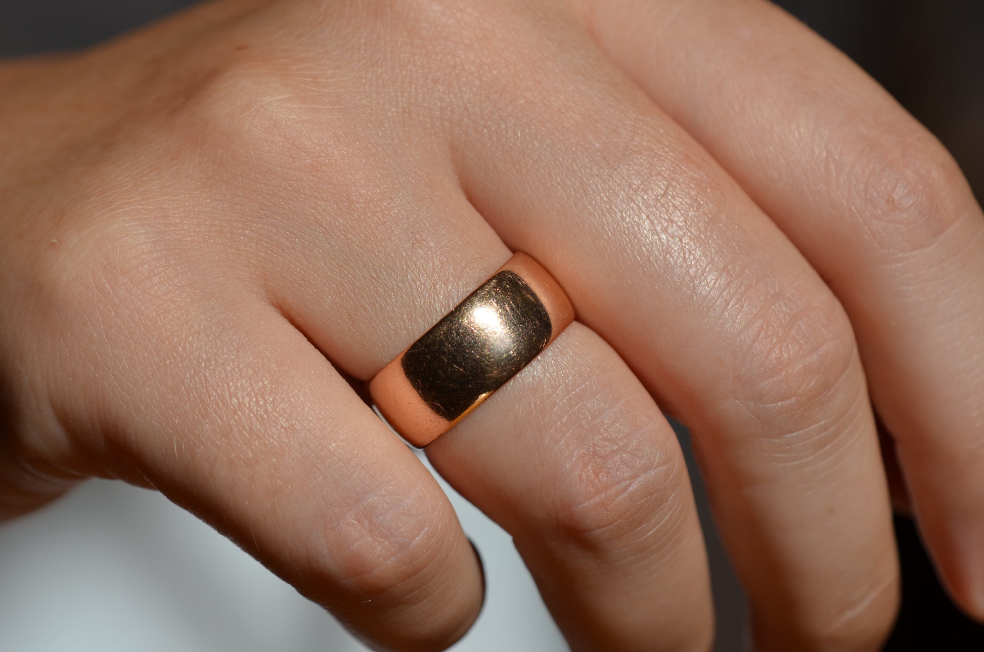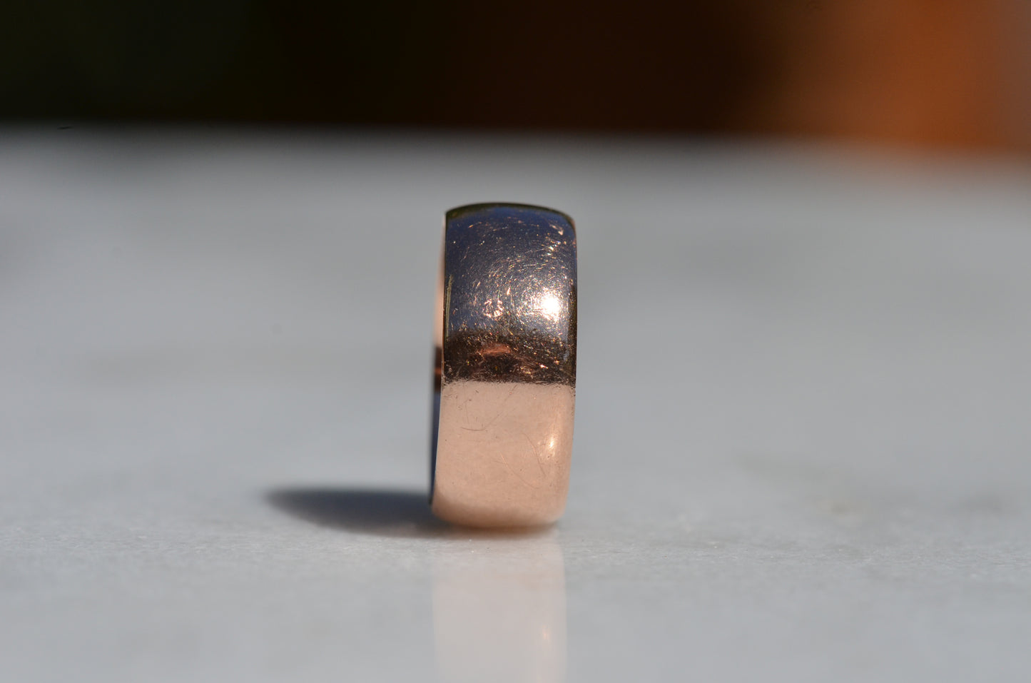 This ring! Radiating warmth and softness from the colour and wear of the gold, but with a powerful presence from its sheer size - we're smitten. British hallmarks date the ring to 1924, yet the style of the ring draws on generations before and sets the tone for generations to come. A flat interior and very gentle doming to the exterior mean that the ring has a slim fit between the fingers and doesn't feel bulky despite its broad width. We adore this ring as a wedding band, statement ring, or stacking ring.