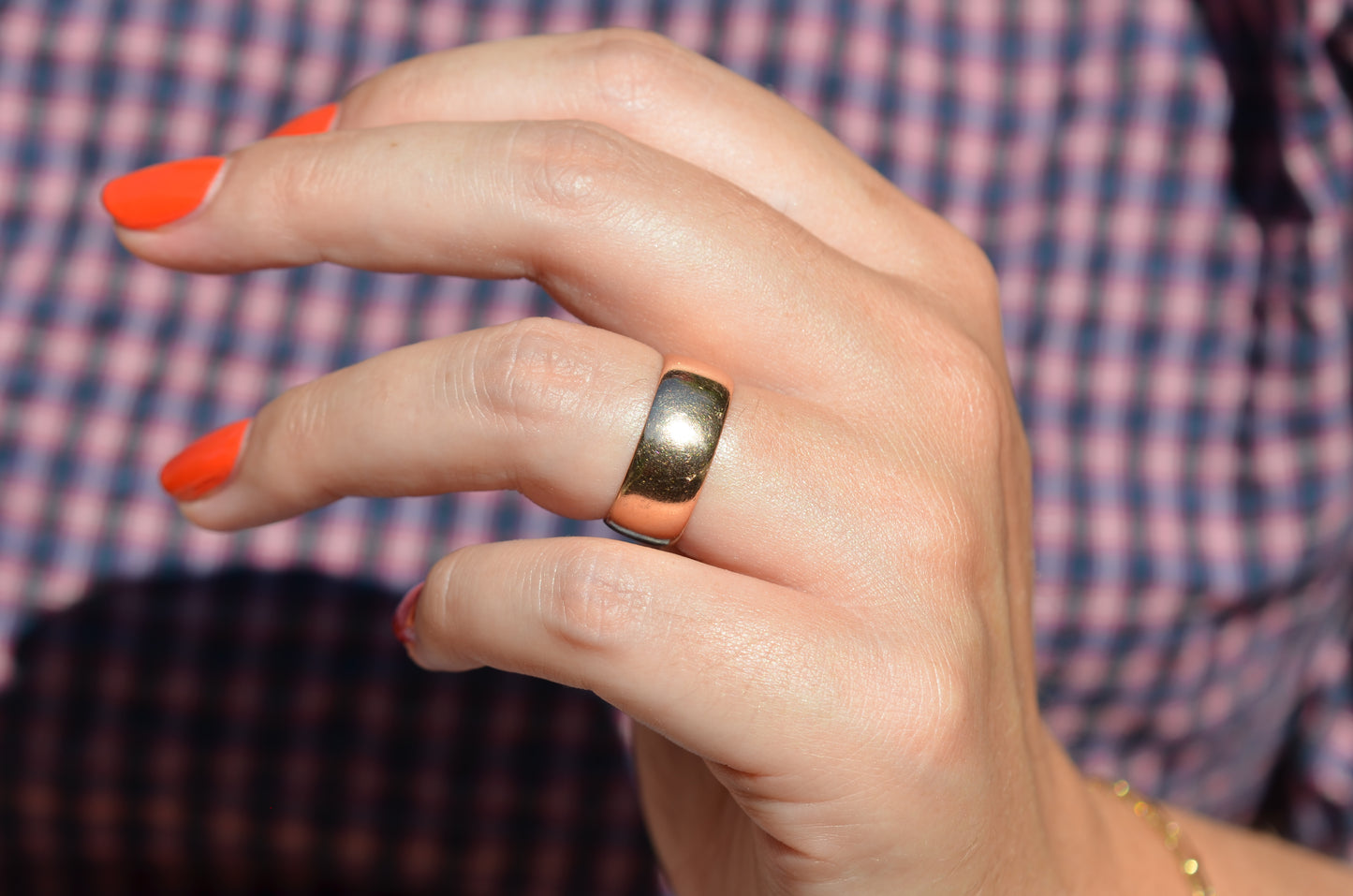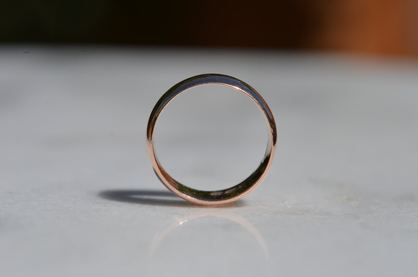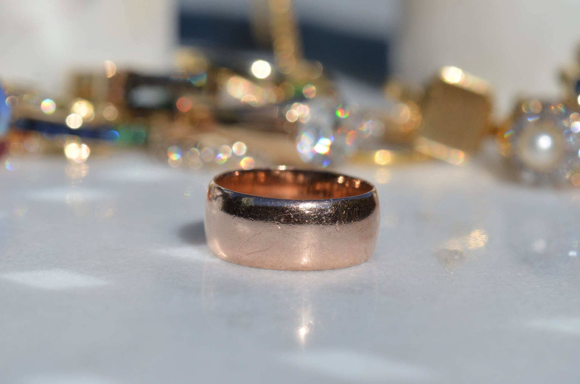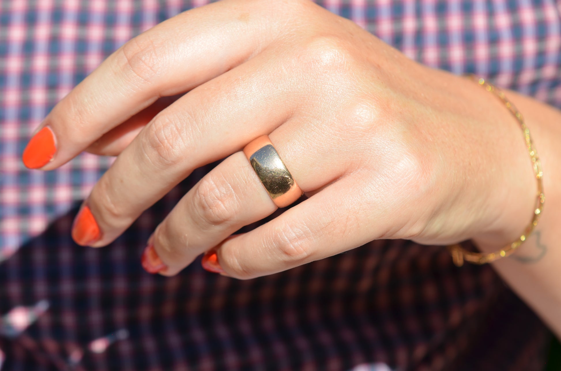 This ring! Radiating warmth and softness from the colour and wear of the gold, but with a powerful presence from its sheer size - we're smitten. British hallmarks date the ring to 1924, yet the style of the ring draws on generations before and sets the tone for generations to come. A flat interior and very gentle doming to the exterior mean that the ring has a slim fit between the fingers and doesn't feel bulky despite its broad width. We adore this ring as a wedding band, statement ring, or stacking ring.