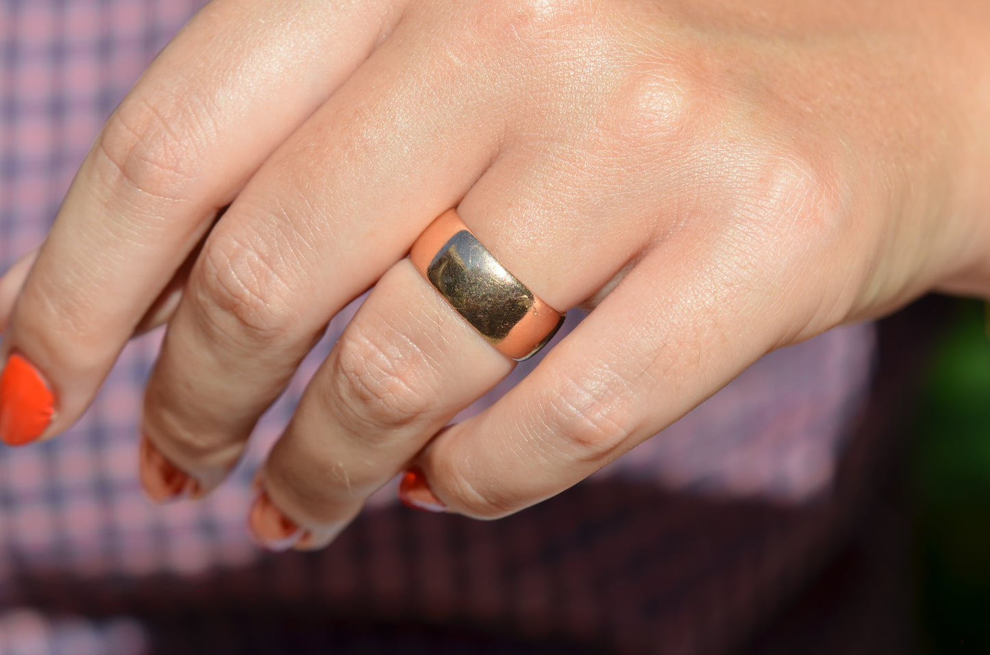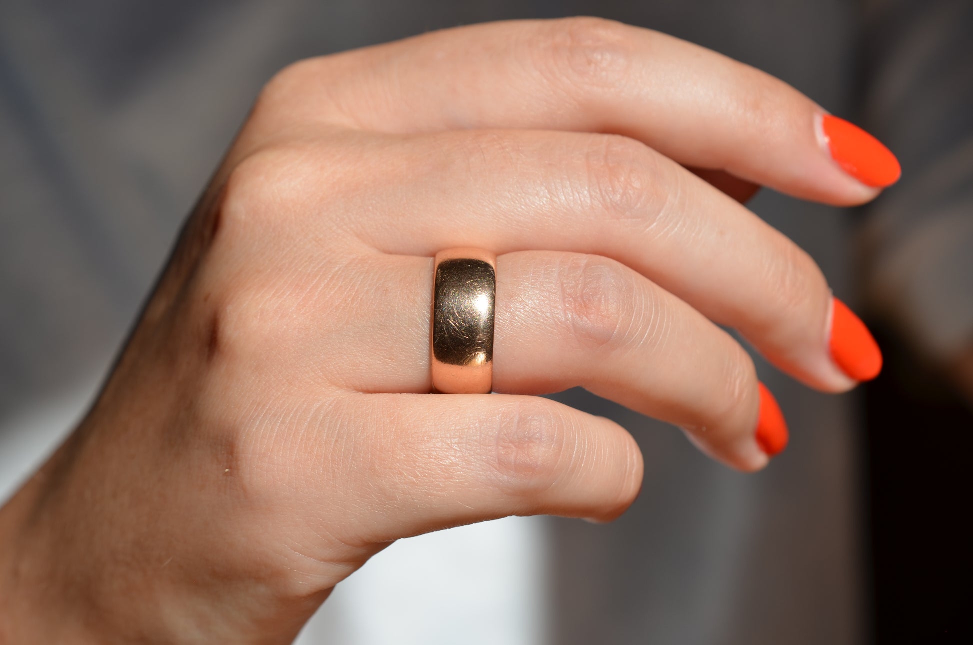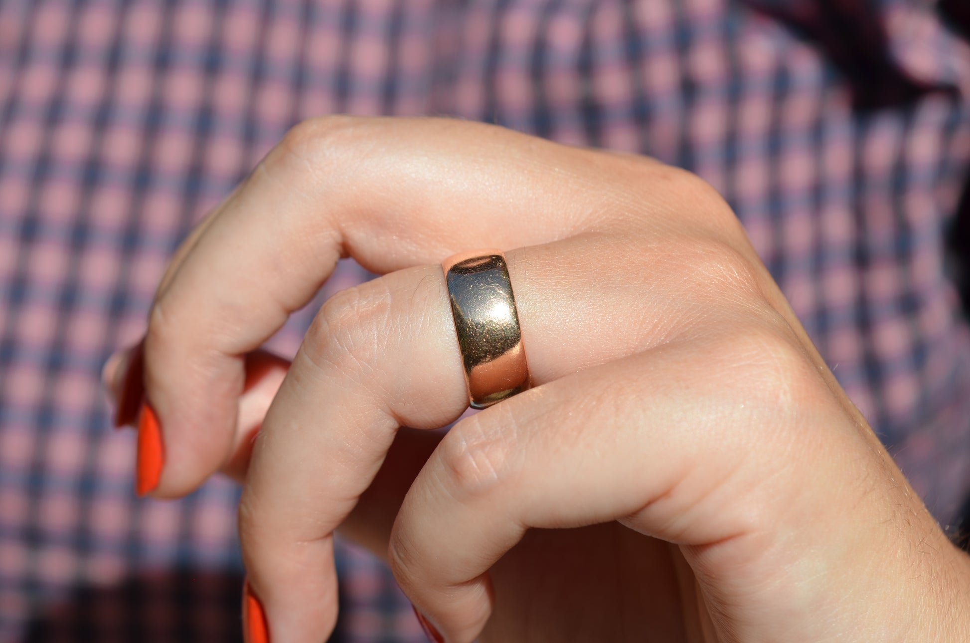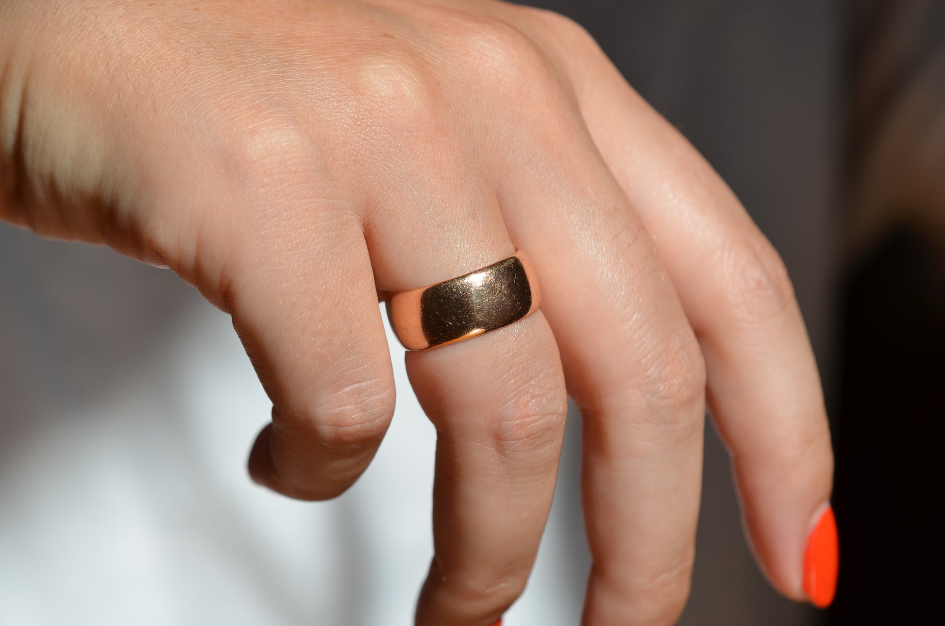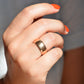 This ring! Radiating warmth and softness from the colour and wear of the gold, but with a powerful presence from its sheer size - we're smitten. British hallmarks date the ring to 1924, yet the style of the ring draws on generations before and sets the tone for generations to come. A flat interior and very gentle doming to the exterior mean that the ring has a slim fit between the fingers and doesn't feel bulky despite its broad width. We adore this ring as a wedding band, statement ring, or stacking ring.