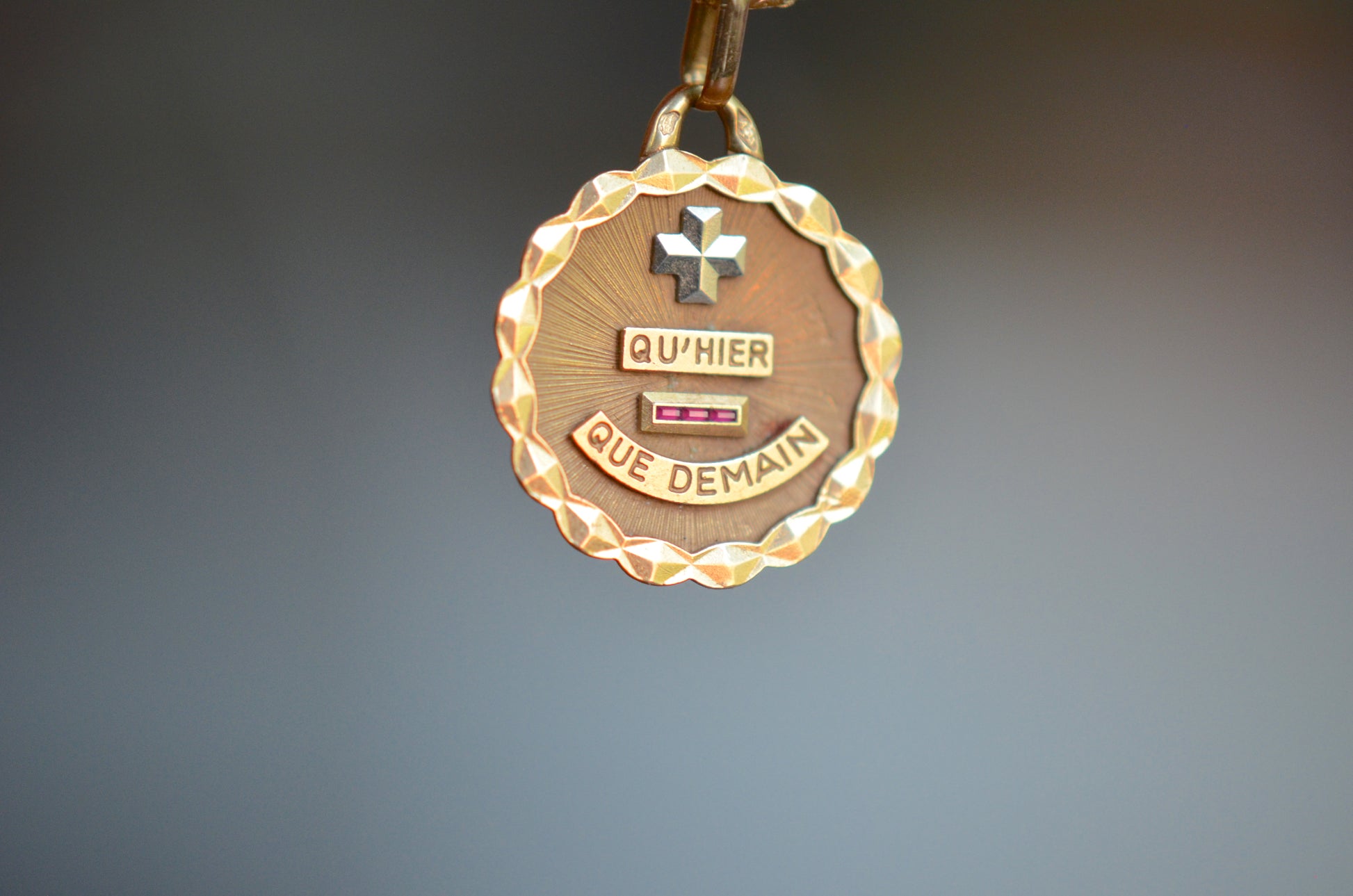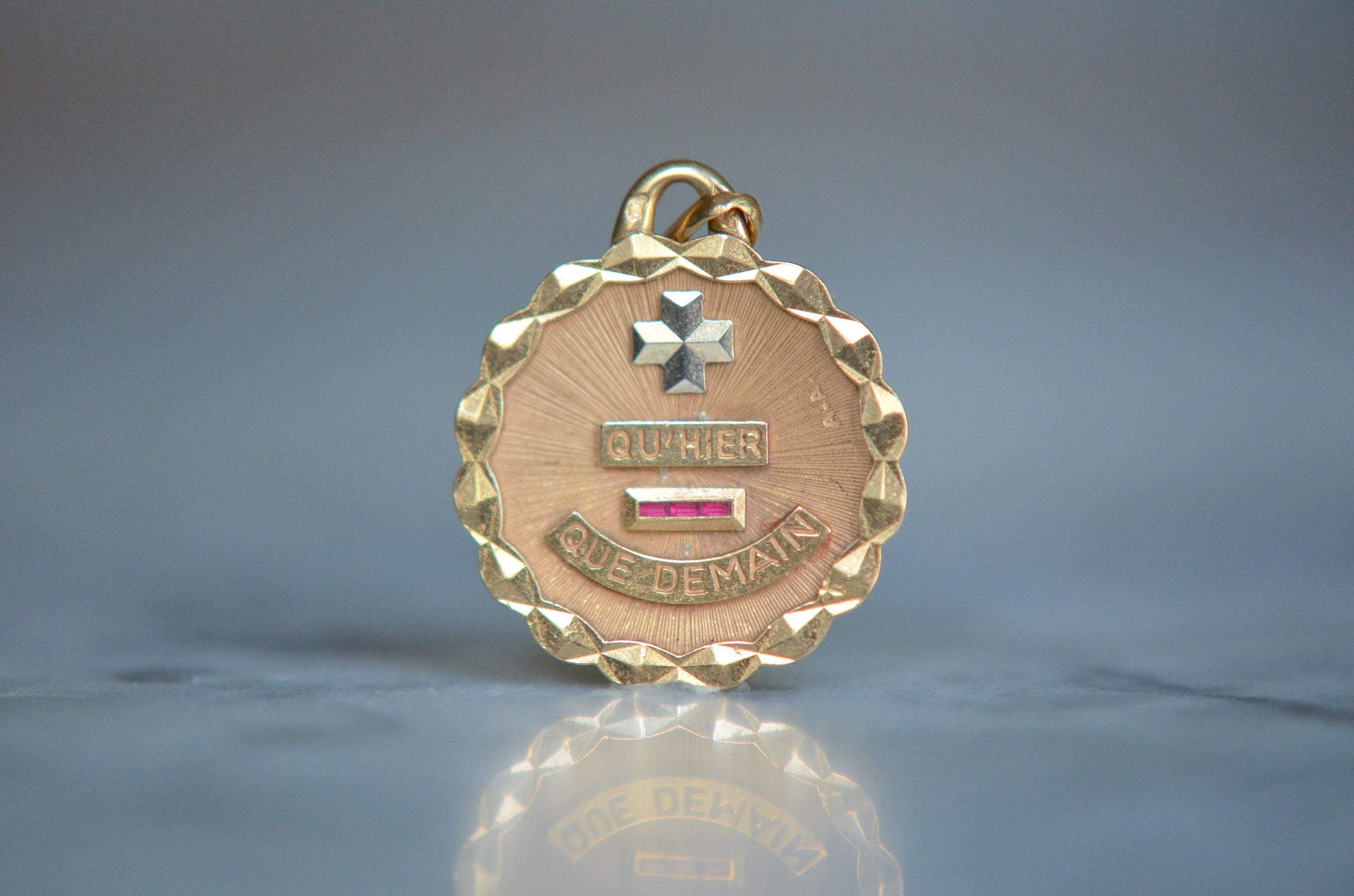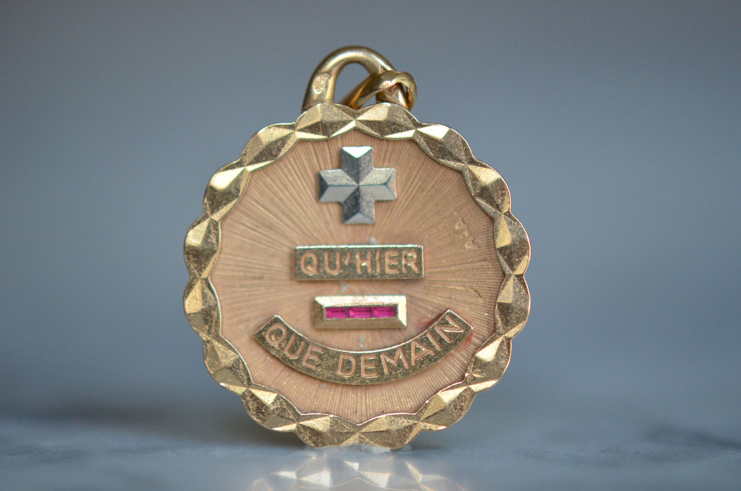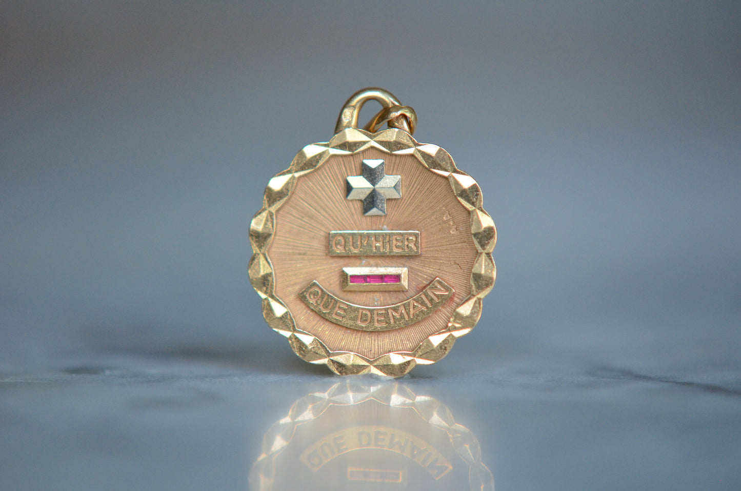 Beautiful vintage French love token, with contrasting white gold "+" sign and softly scalloped edge. Created by Alphonse Augis and inspired by a letter poet Rosemonde Gérard wrote to her husband, the writer Edmond Rostand, the pendant features a rebus reading "+ qu'hier - que demain" for the lines,