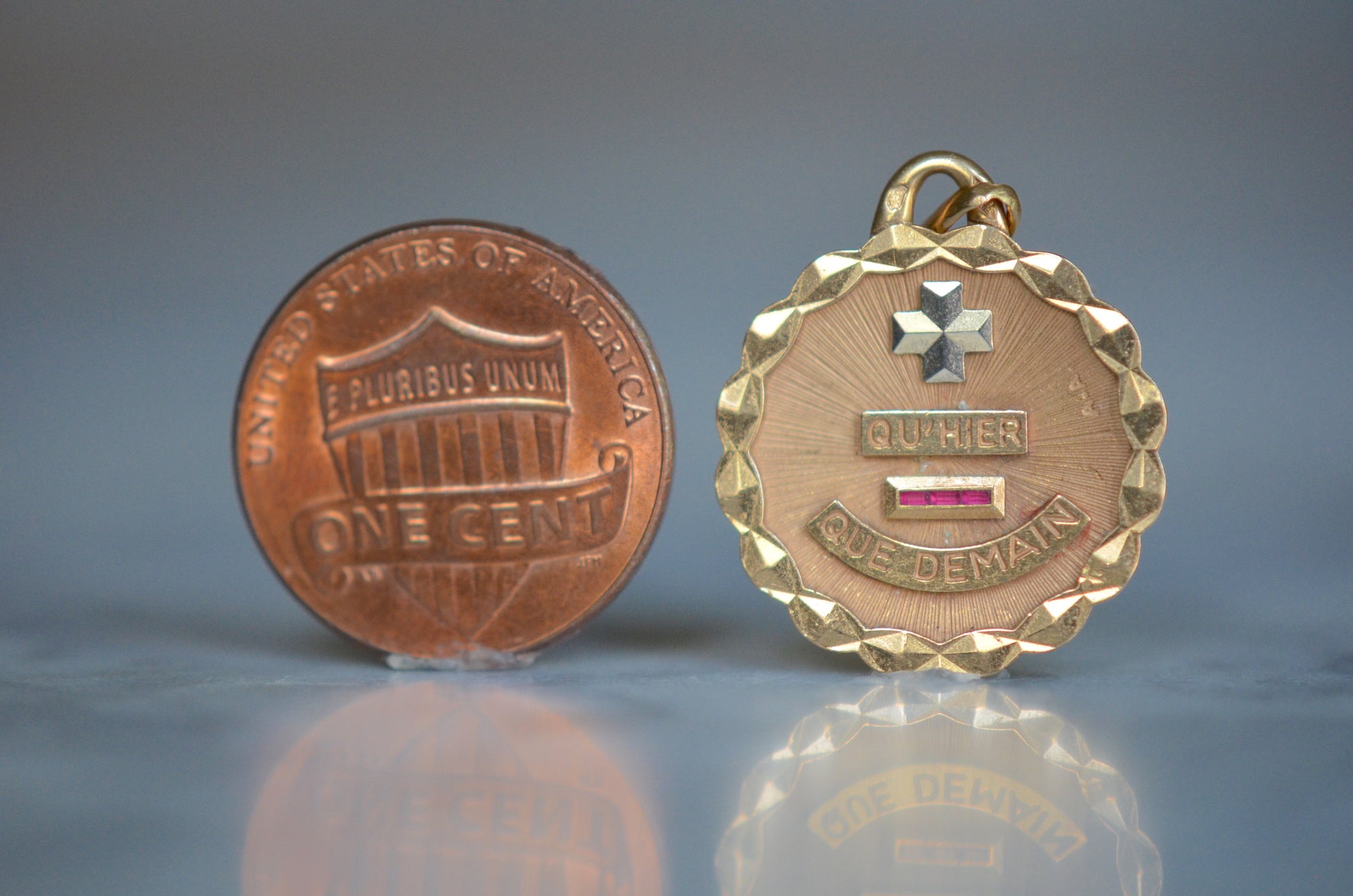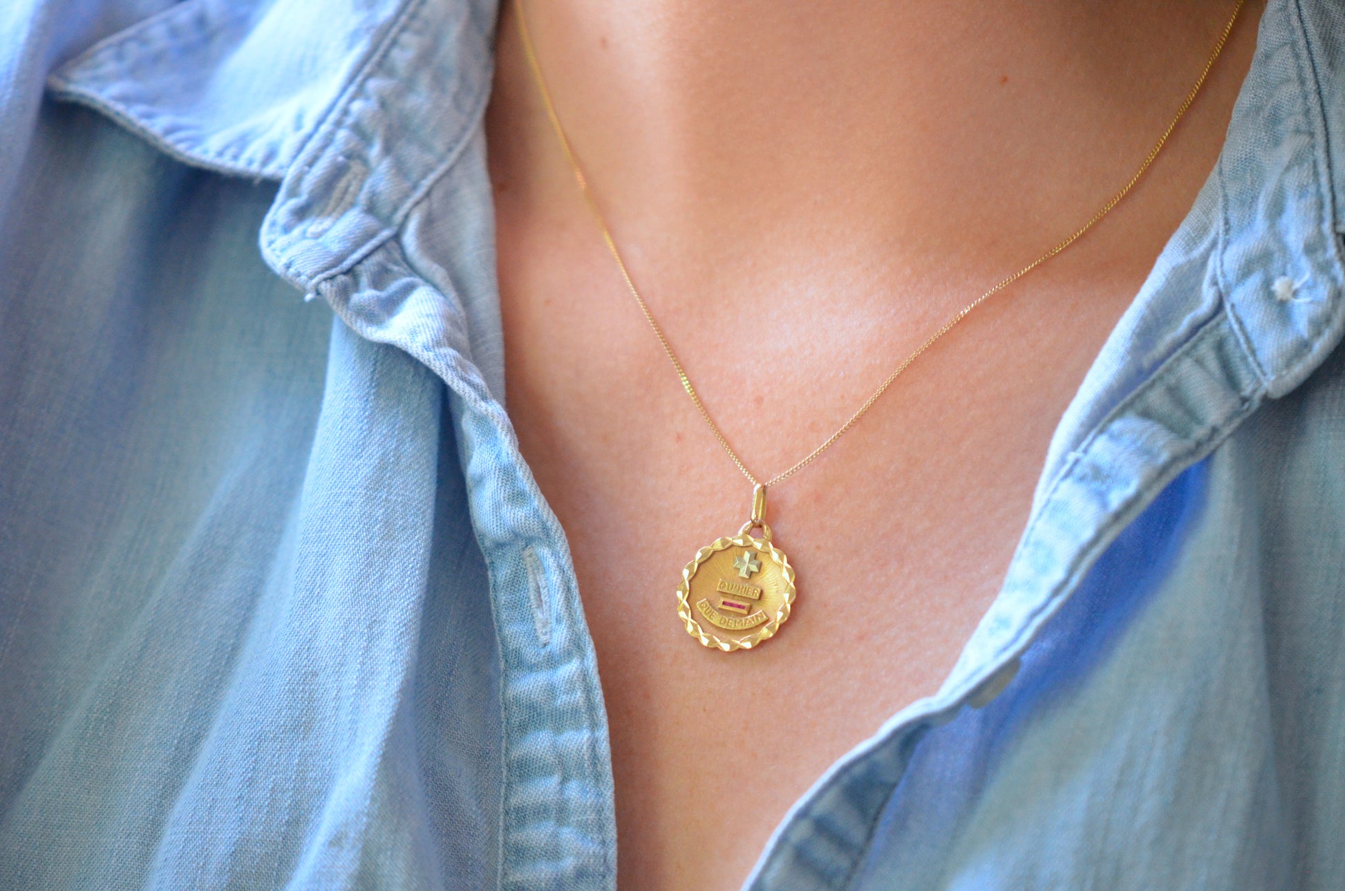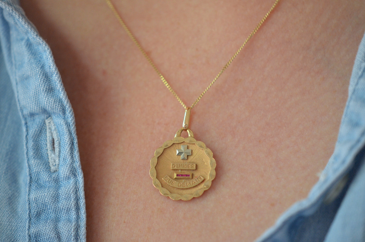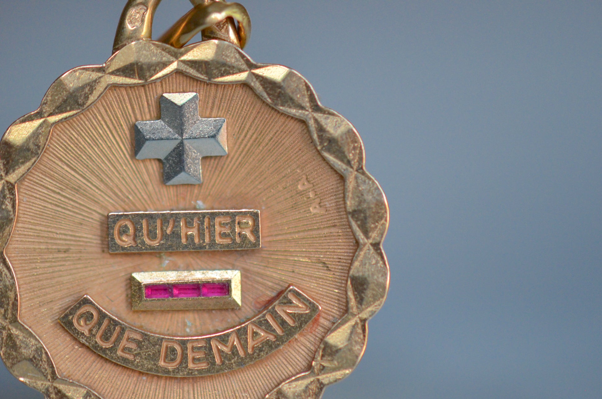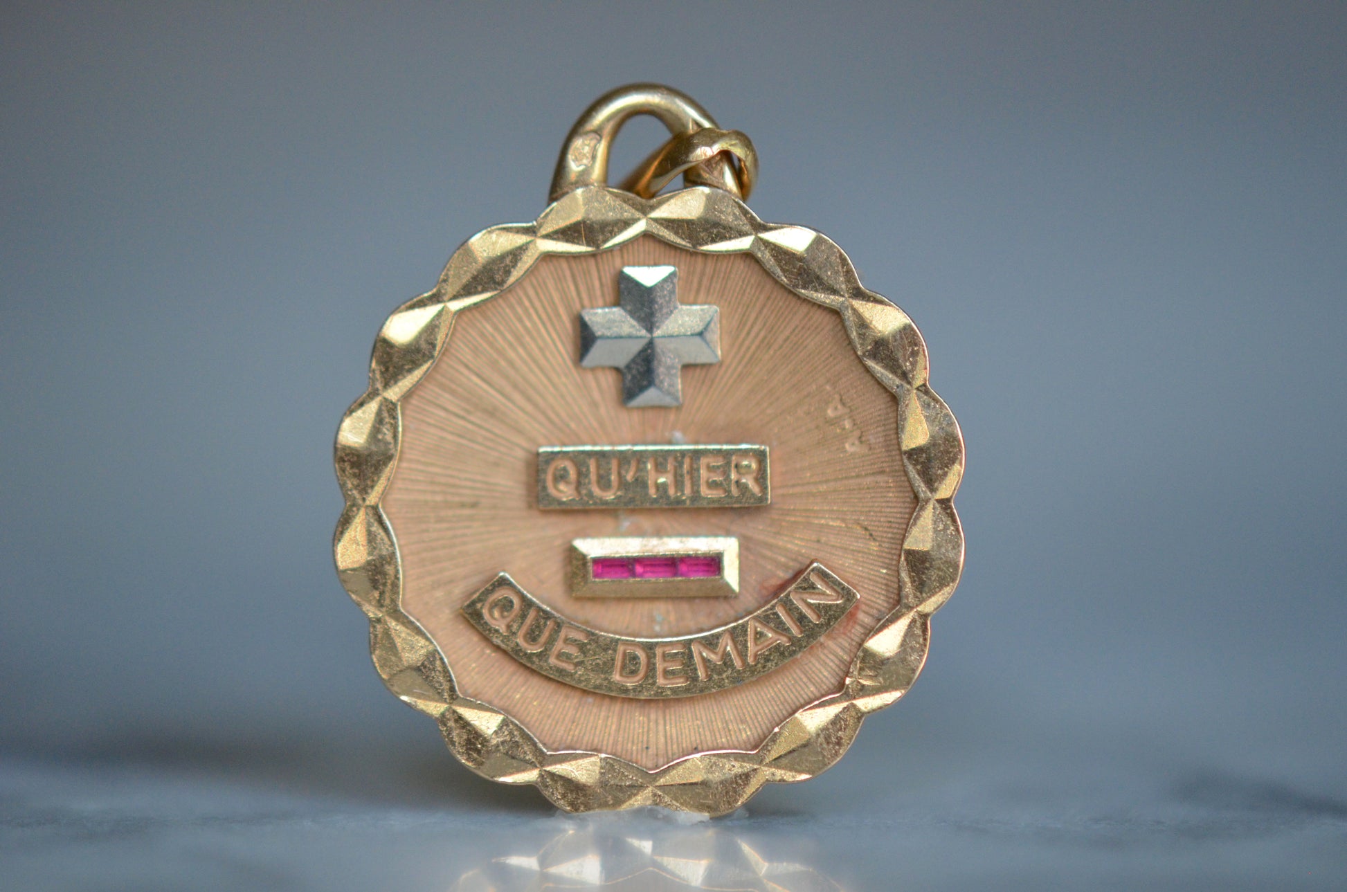 Beautiful vintage French love token, with contrasting white gold "+" sign and softly scalloped edge. Created by Alphonse Augis and inspired by a letter poet Rosemonde Gérard wrote to her husband, the writer Edmond Rostand, the pendant features a rebus reading "+ qu'hier - que demain" for the lines,