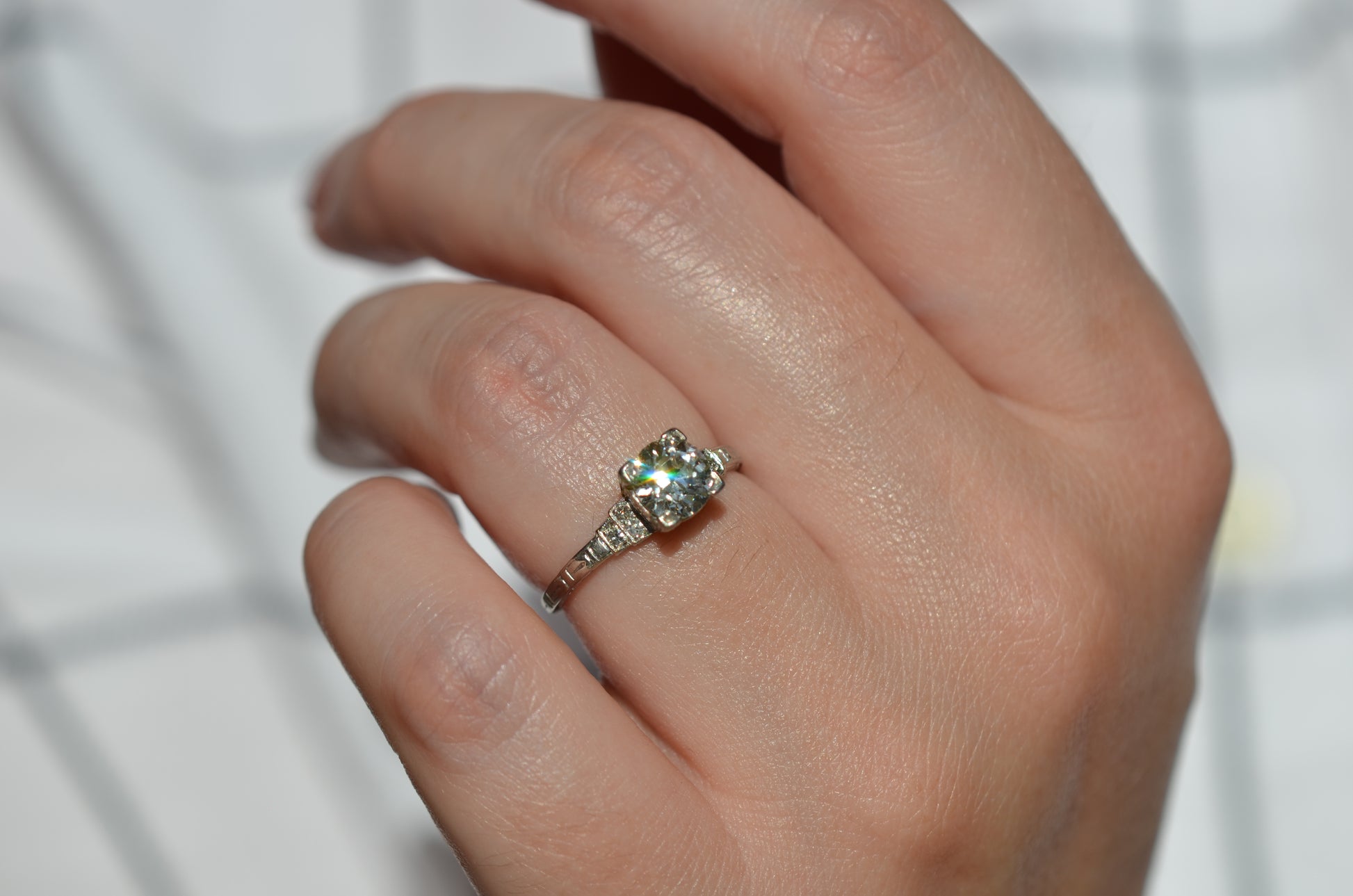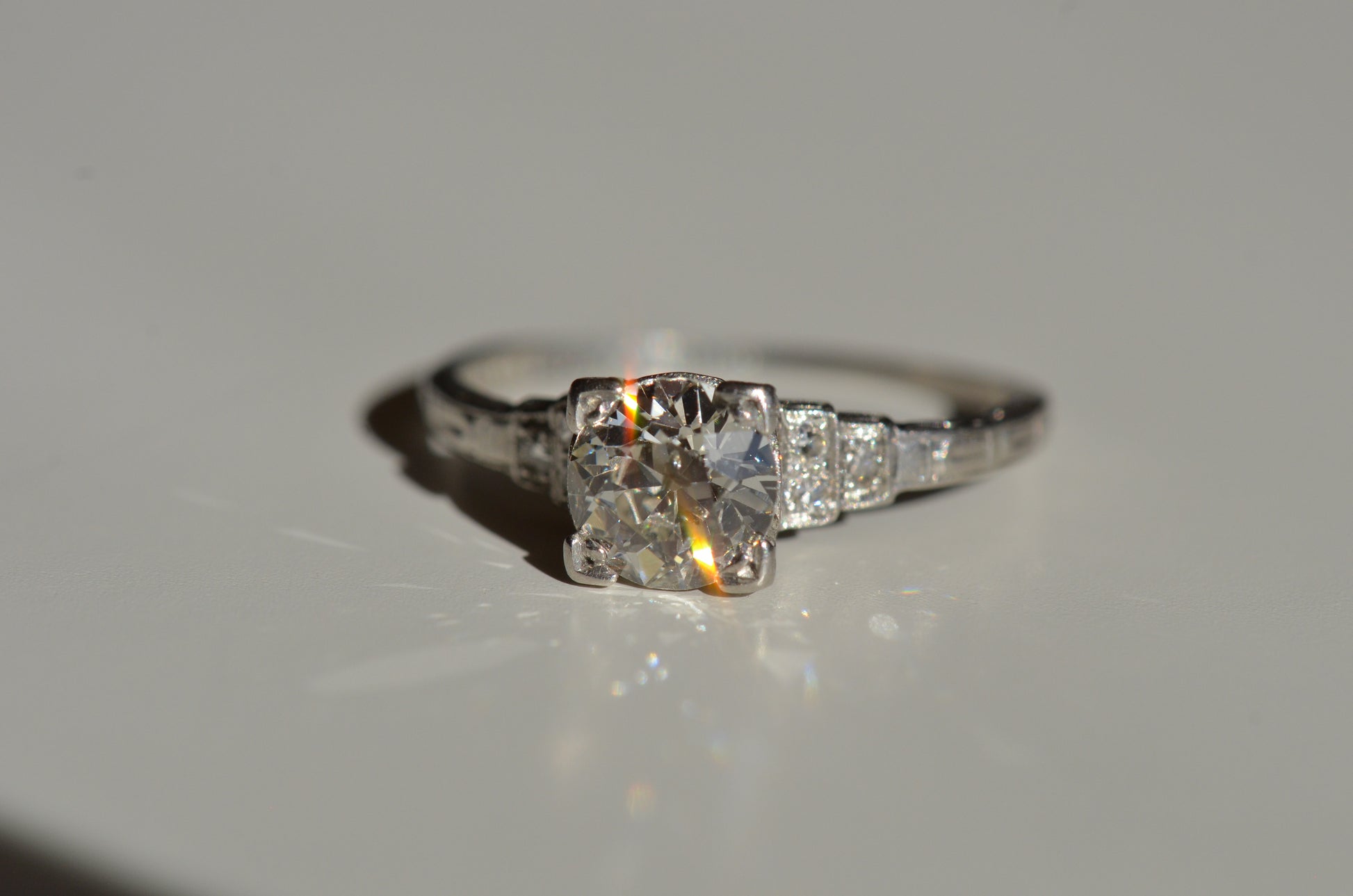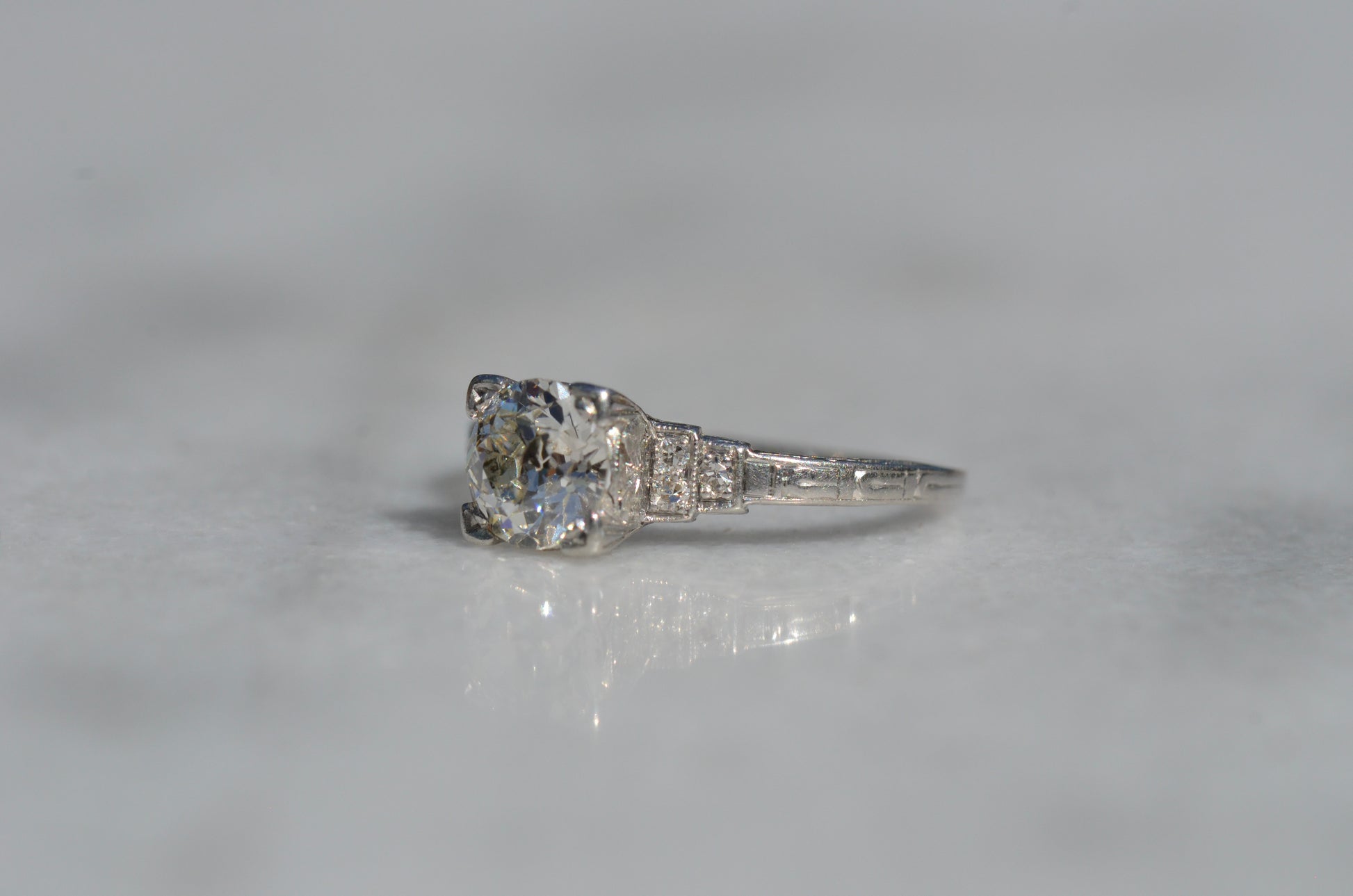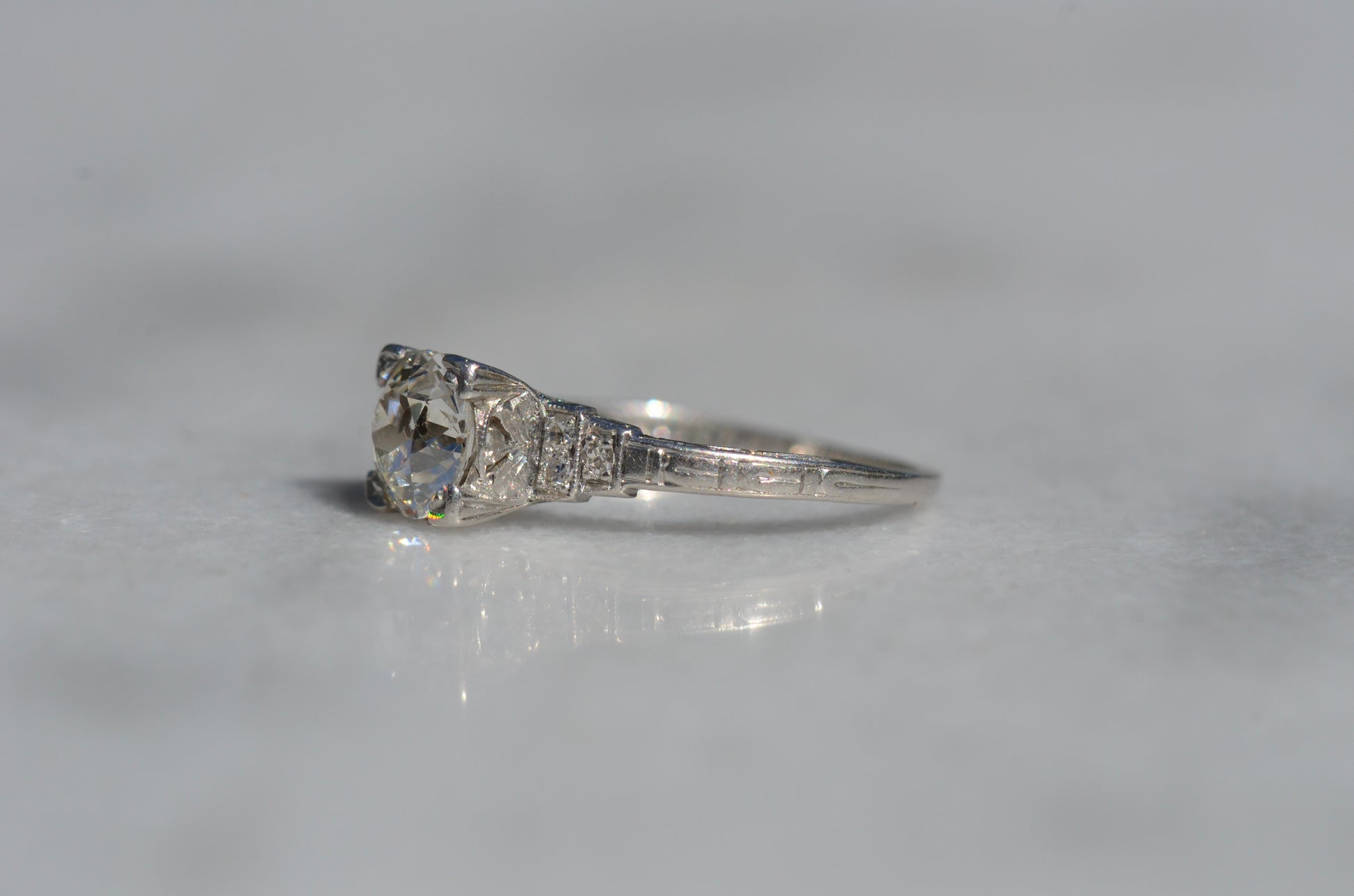 This outstanding ring comes to us from the Art Deco period and is as stunning today as she would have been approximately 100 years ago. The finest band is met with a lovingly engraved head, stepped and diamond-studded shoulders just barely easing the transition into a dazzling 1.04 carat old European cut diamond. This ring feels contemporary in its dainty styling, but possesses the charm and character that only a piece that has already lived several lives can have. This is an absolute dream ring that is sure to thrill its next caretaker. Crafted by historic New York jewelry manufacturers J.R. Wood & Sons (known still for their storied Artcarved brand), it's easy to see how a firm founded in 1850 continues to be in operation today with a reputation for standout wedding bands that hold up to the test of time. Be sure to check instagram.com/st.eloi for videos of this gorgeous ring in action.