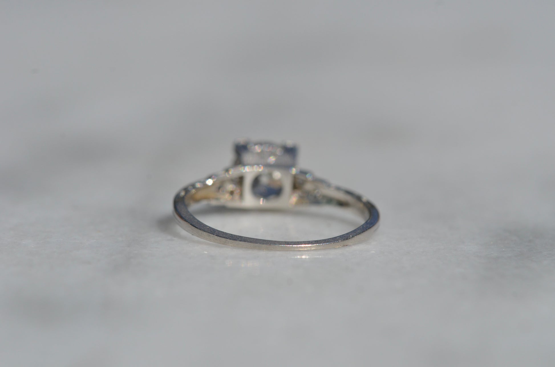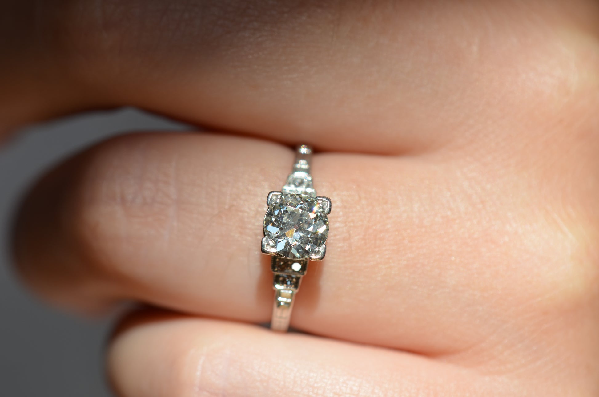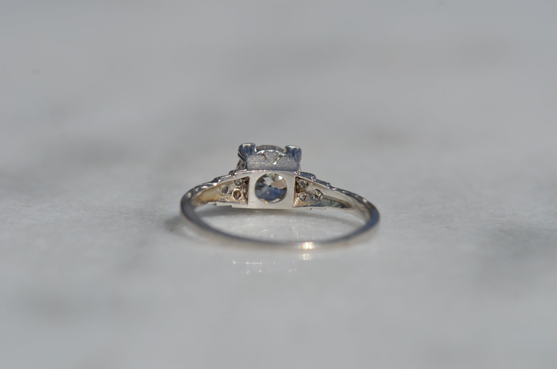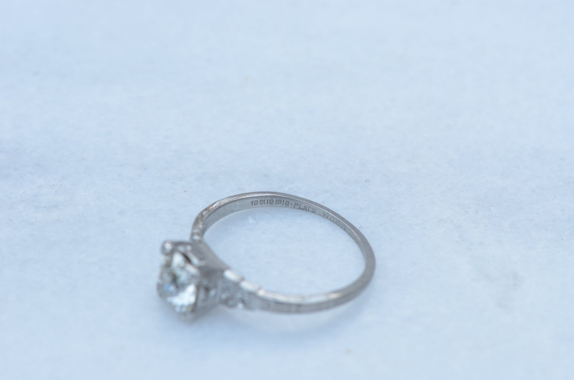 This outstanding ring comes to us from the Art Deco period and is as stunning today as she would have been approximately 100 years ago. The finest band is met with a lovingly engraved head, stepped and diamond-studded shoulders just barely easing the transition into a dazzling 1.04 carat old European cut diamond. This ring feels contemporary in its dainty styling, but possesses the charm and character that only a piece that has already lived several lives can have. This is an absolute dream ring that is sure to thrill its next caretaker. Crafted by historic New York jewelry manufacturers J.R. Wood & Sons (known still for their storied Artcarved brand), it's easy to see how a firm founded in 1850 continues to be in operation today with a reputation for standout wedding bands that hold up to the test of time. Be sure to check instagram.com/st.eloi for videos of this gorgeous ring in action.