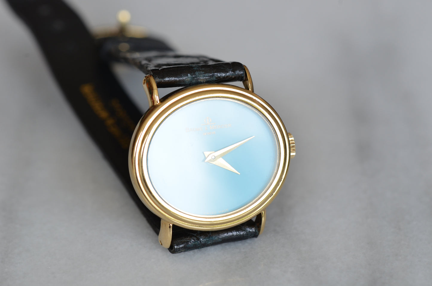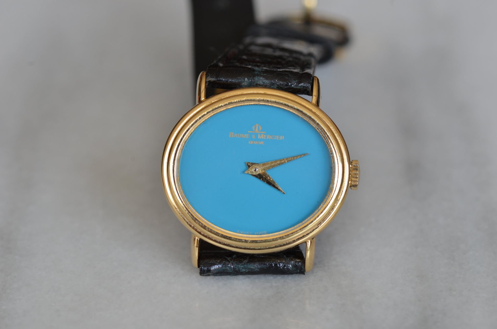 This striking watch is truly a timepiece for the jewelry lover. Baume & Mercier, Swiss watchmakers since 1830, made exceptional use of opaque gemstone material to create eye-catching dials wrapped in lush yellow in and around the 1960s. This turquoise dial is among the most vivid variations we've seen, with a sleek and simple oval-shaped gold bezel and a dial unencumbered by numerals allowing the turquoise to truly take centre stage. The dial is made of reconstituted turquoise, a common manufacturing process by which ground natural turquoise is combined with resin to create a smooth and even-coloured base.