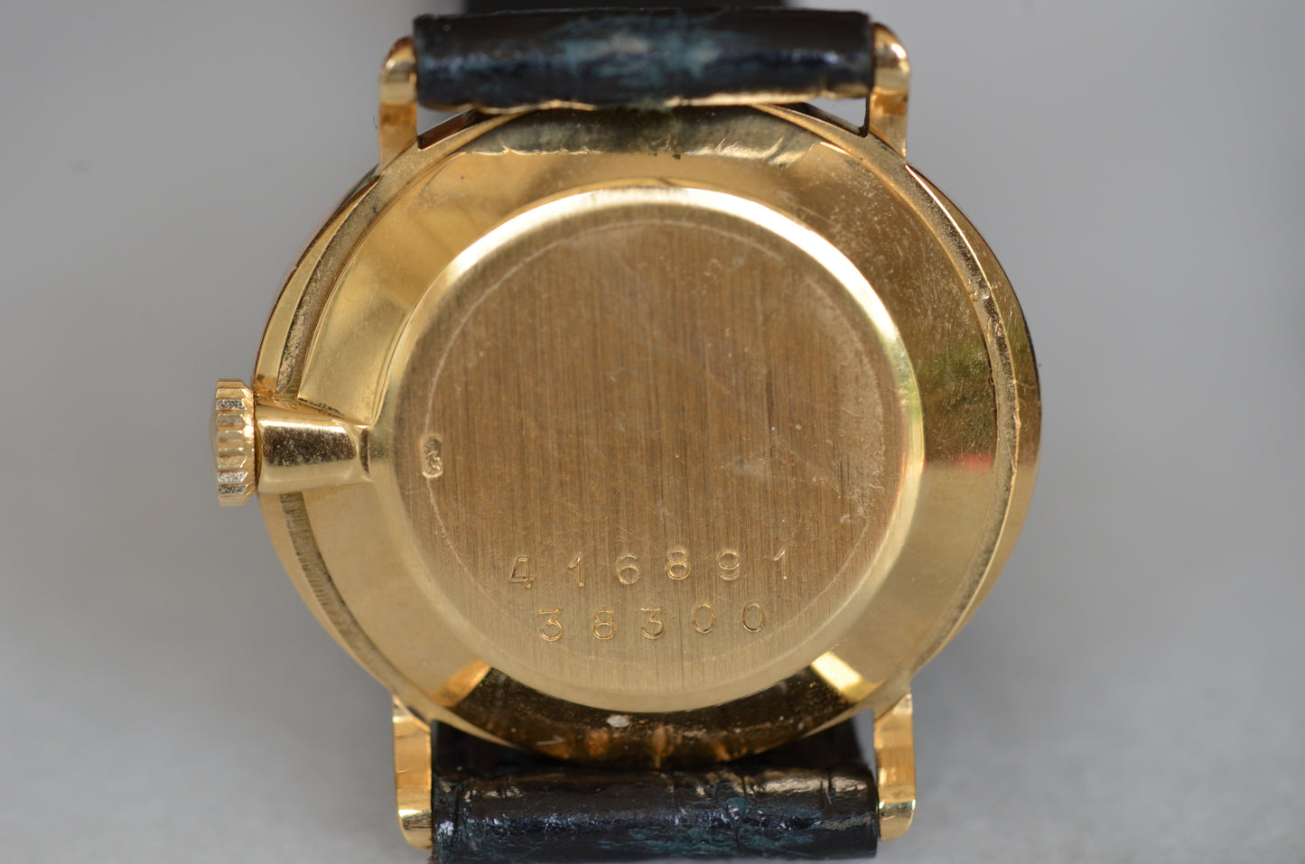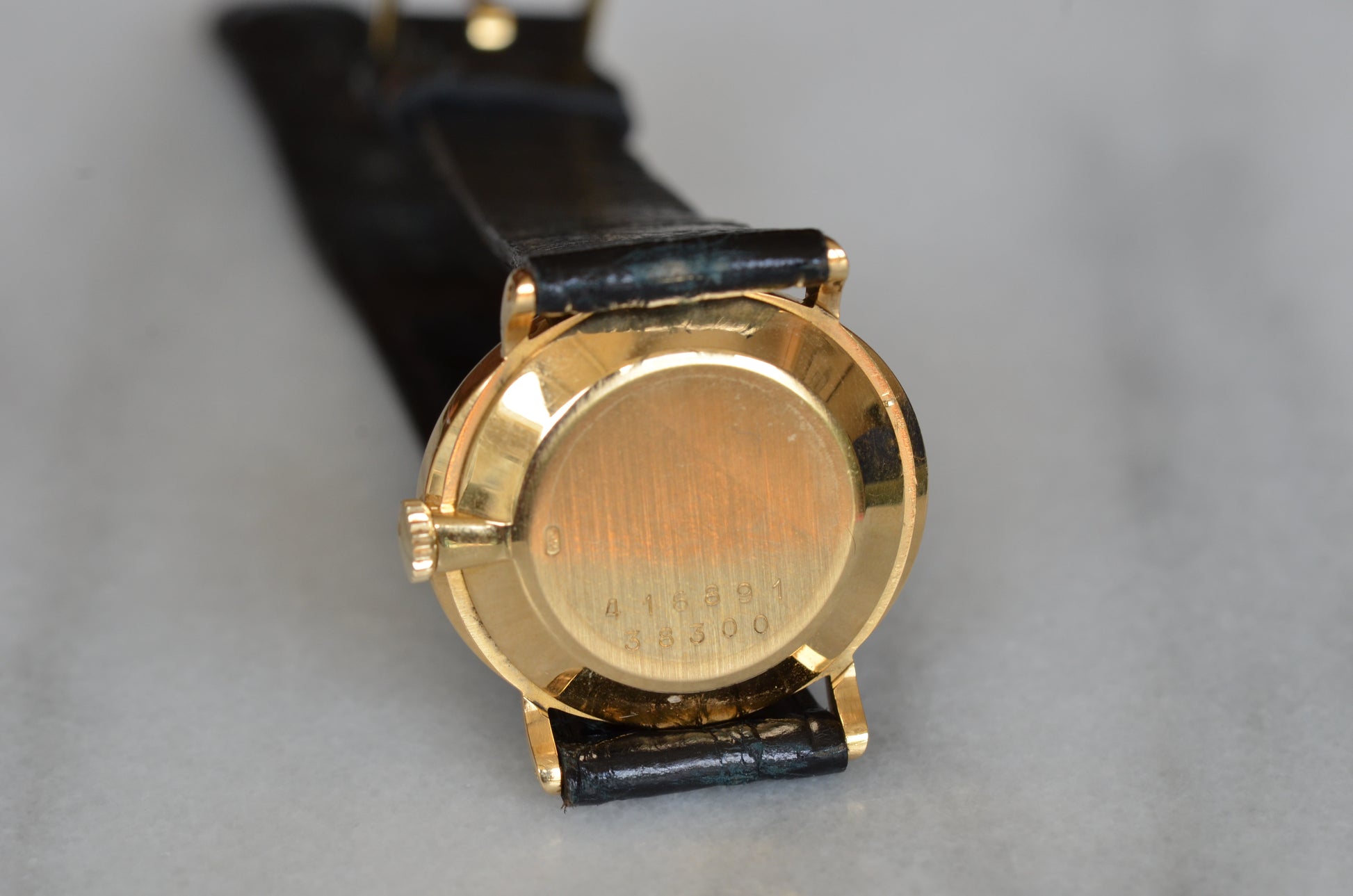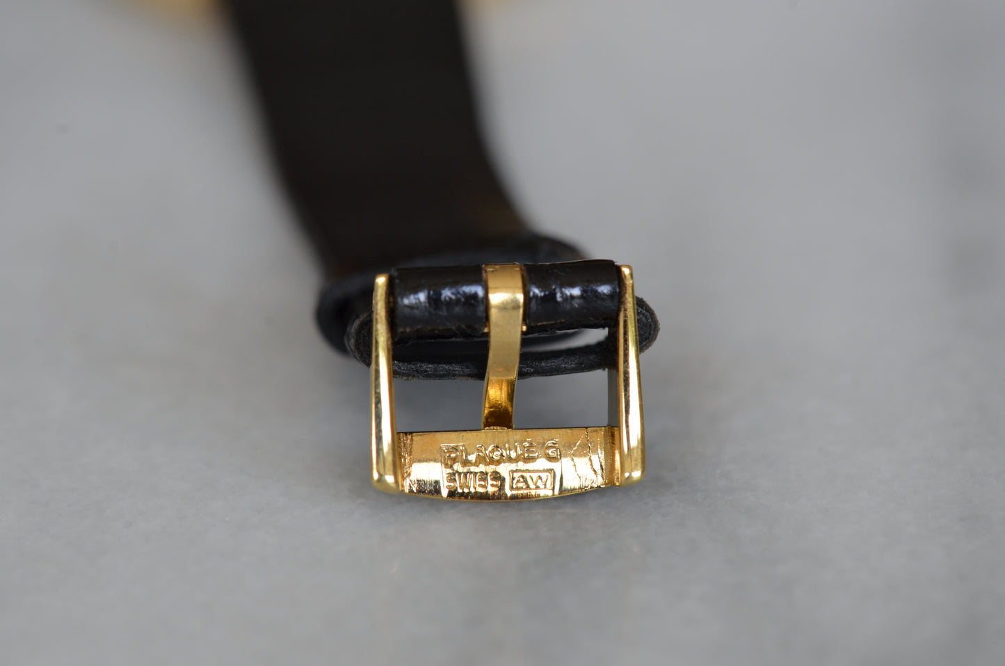 • 18k yellow gold, with Swiss hallmarks; buckle on strap plated and marked