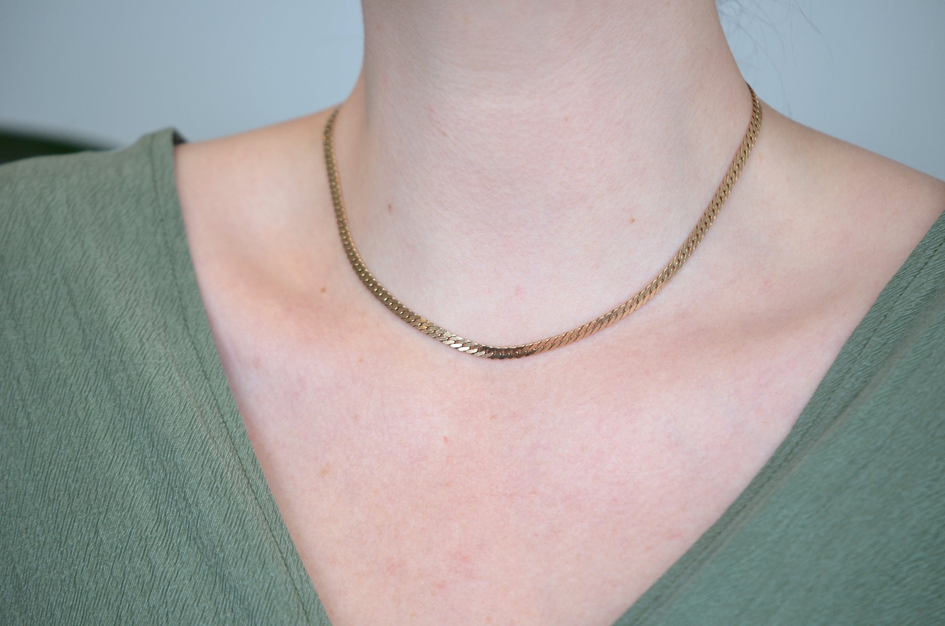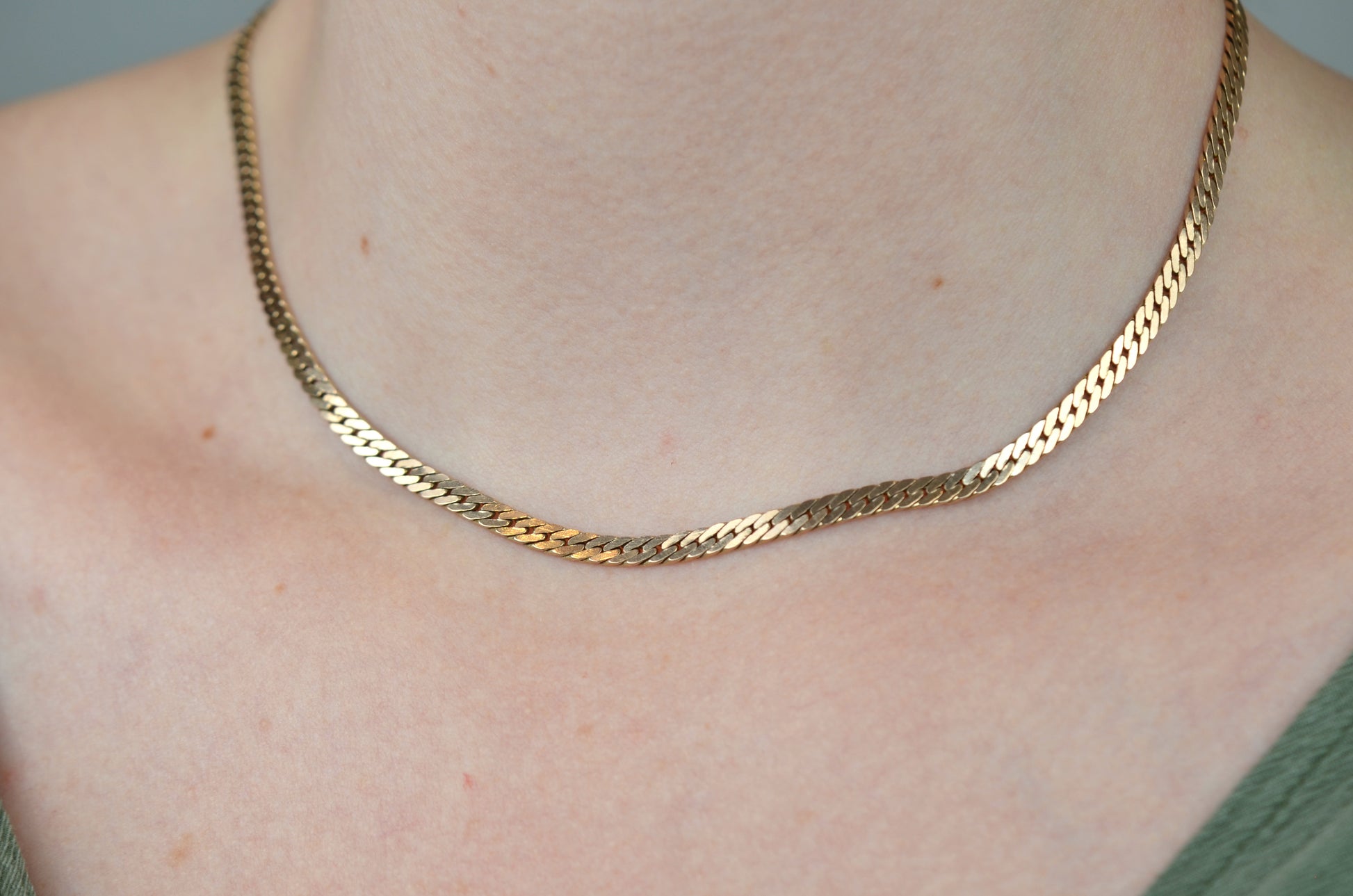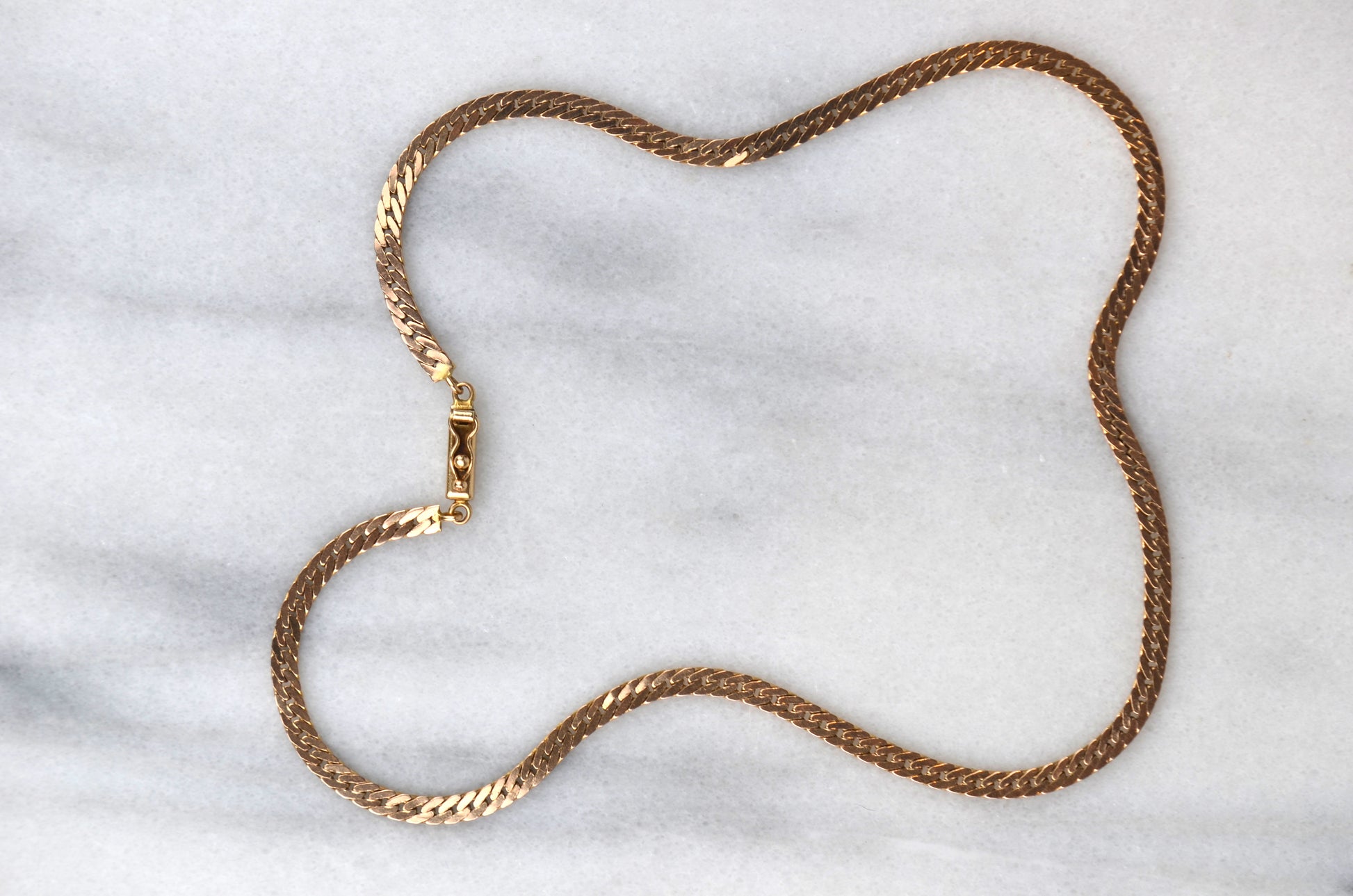 Smooth, slinky, and sexy as hell, this necklace is liquid gold for your neck. Made in the original, hard-to-find style with chunky individual links rather than than the modern zipper-style, the necklace has incredible movement and doesn't catch on hair. With heavy, evenly distributed weight, the chain will fall into place on its own and sit a little higher and rounder on the neck, resting perfectly along the clavicle.