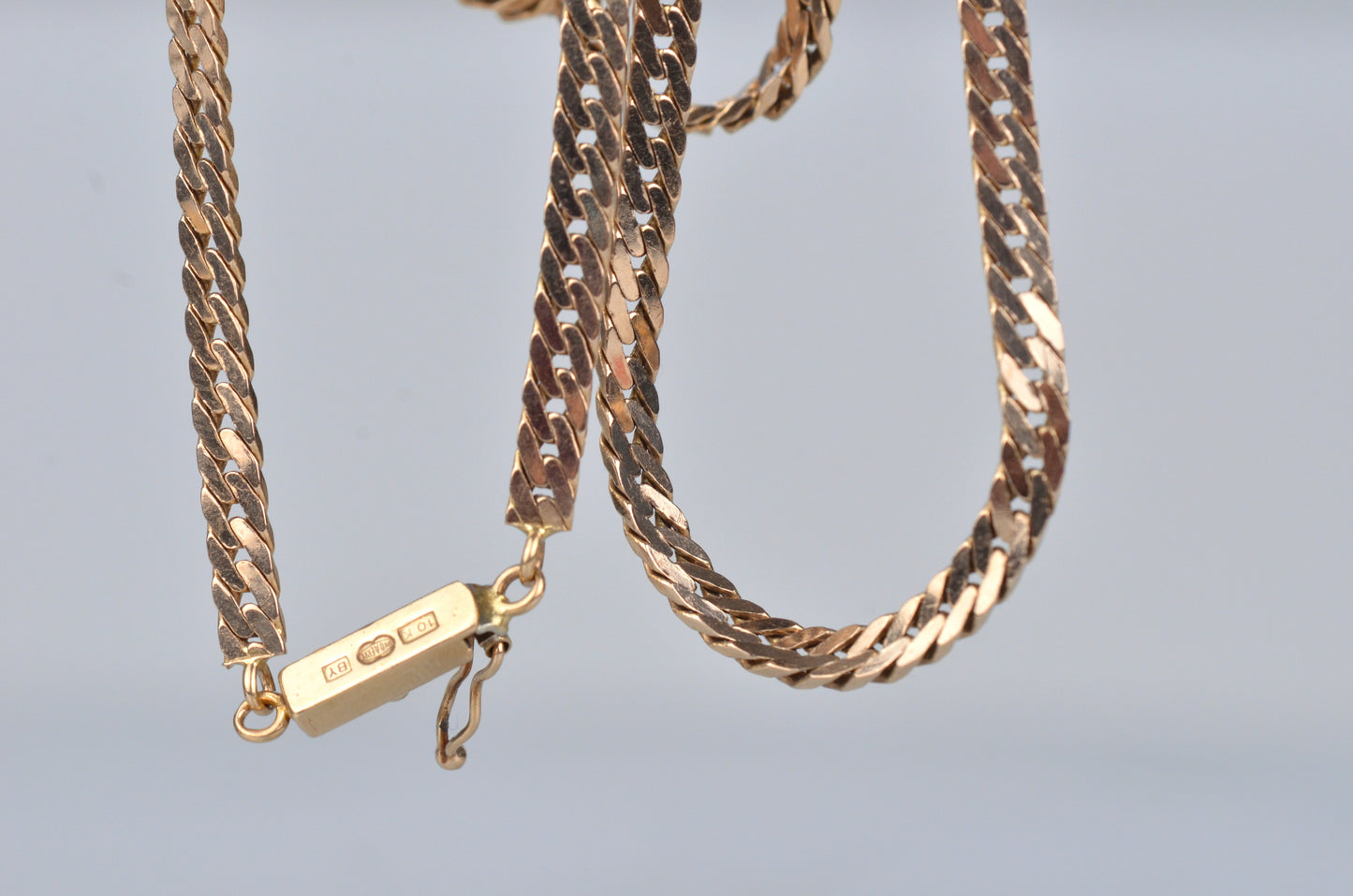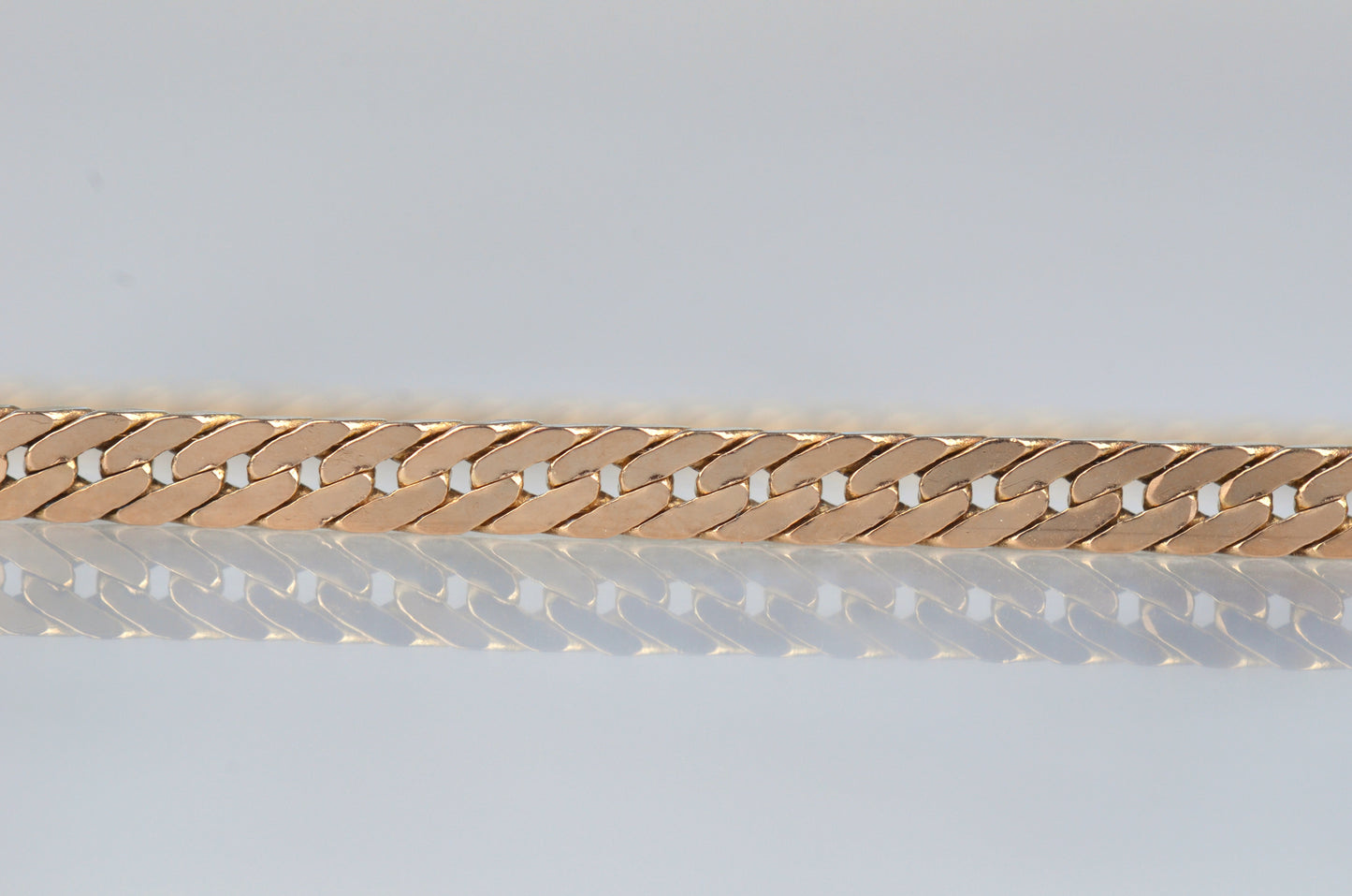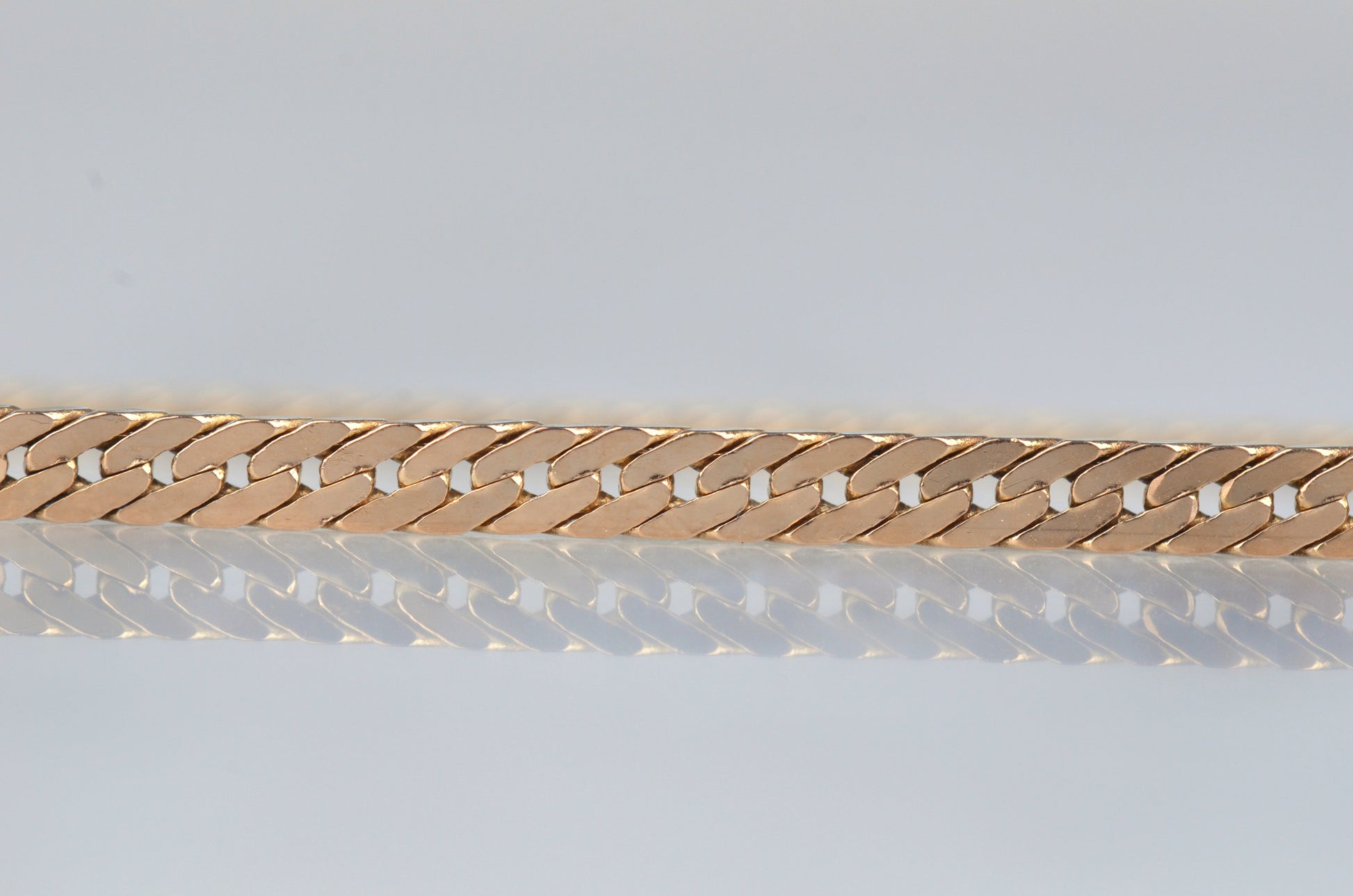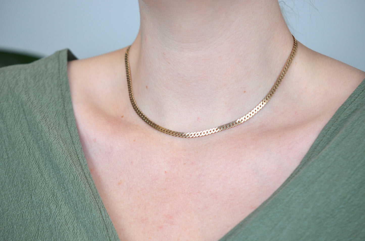 Smooth, slinky, and sexy as hell, this necklace is liquid gold for your neck. Made in the original, hard-to-find style with chunky individual links rather than than the modern zipper-style, the necklace has incredible movement and doesn't catch on hair. With heavy, evenly distributed weight, the chain will fall into place on its own and sit a little higher and rounder on the neck, resting perfectly along the clavicle.