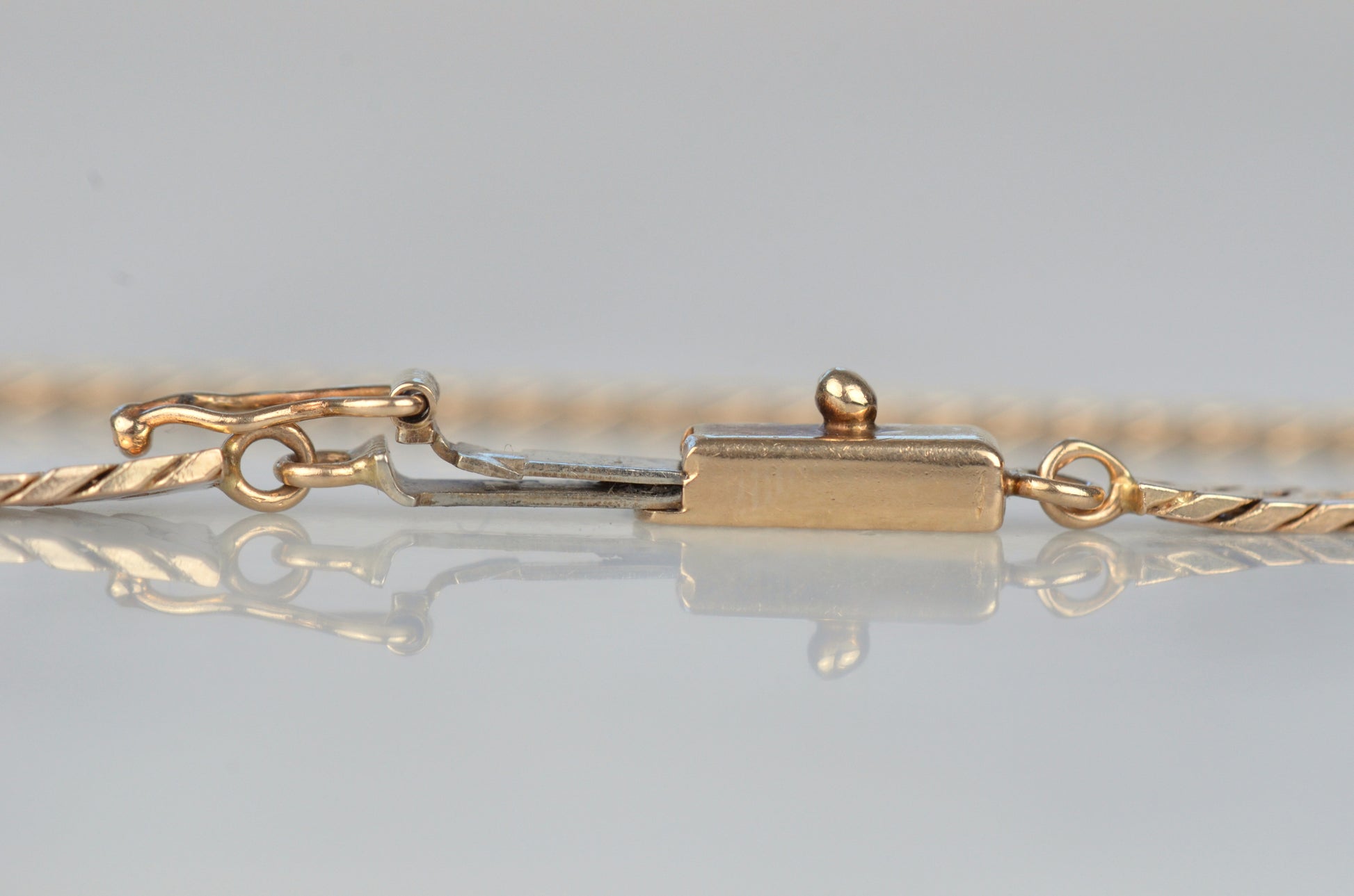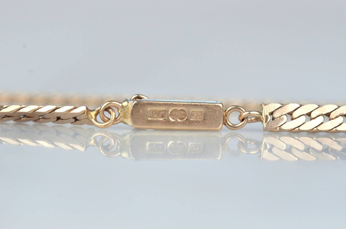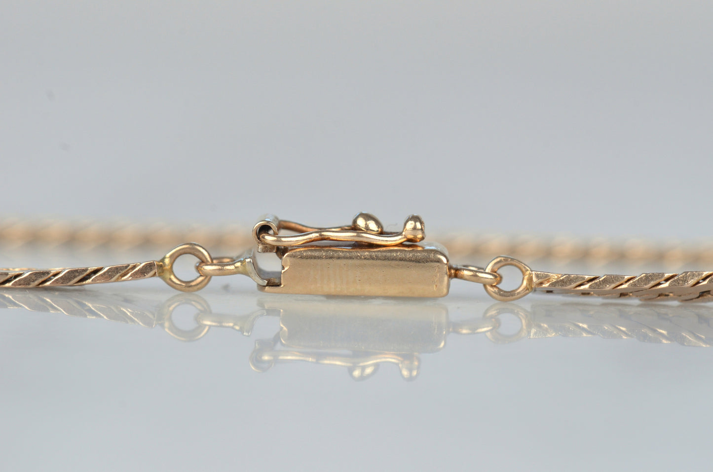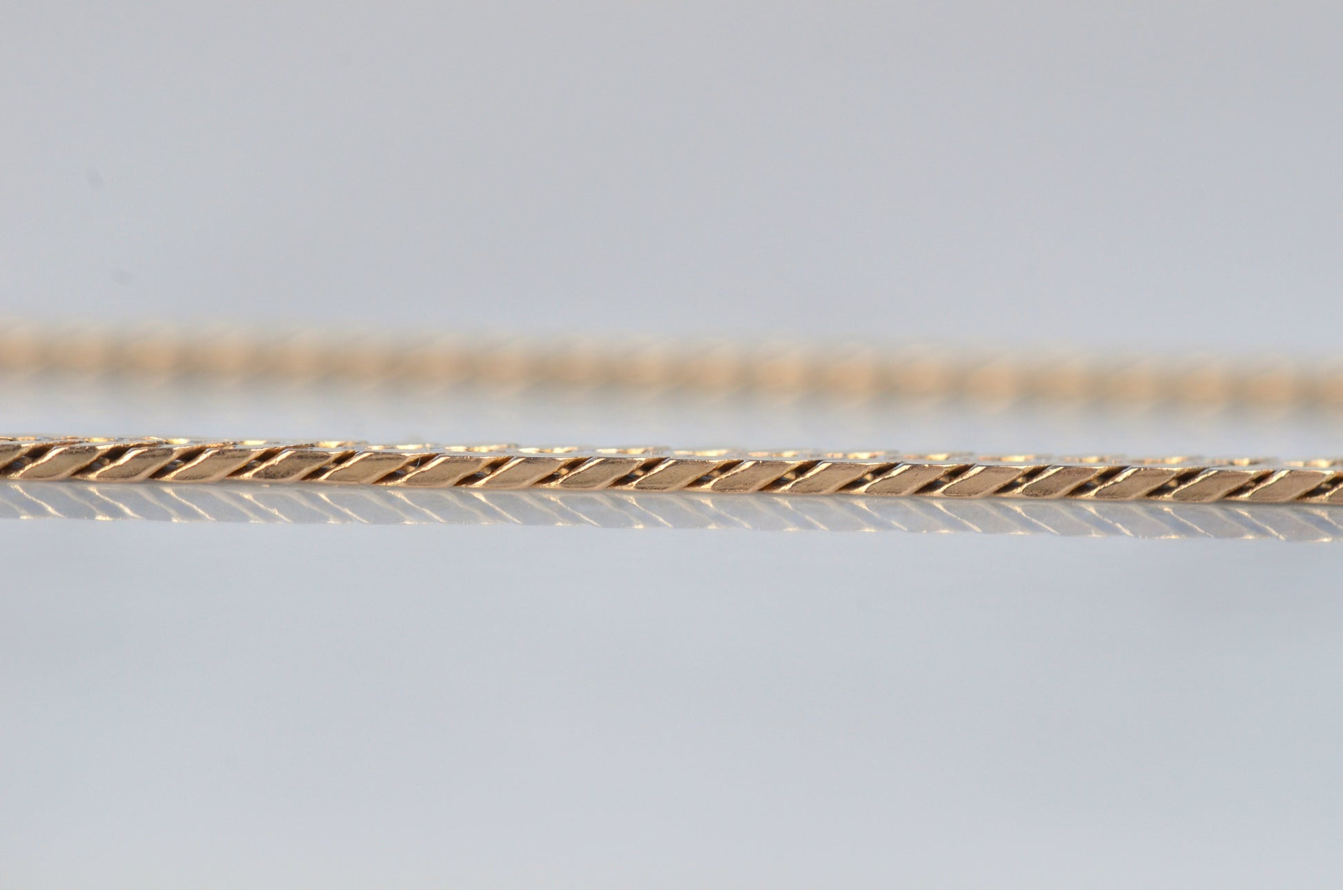Herringbone chains have caused many a jeweller grief as they can easily bend out of shape and "kink," leaving it near impossible to repair to the former smoothness. This necklace is in beautiful, sleek condition without any kinks, and can stay that way with a little TLC: be sure to take it off when sleeping, showering, or during physical activities (like swimming or the gym), and always lay it flat to store rather than tossing it into your jewelry box. We do not recommend hanging any charms or pendants on herringbone chains.