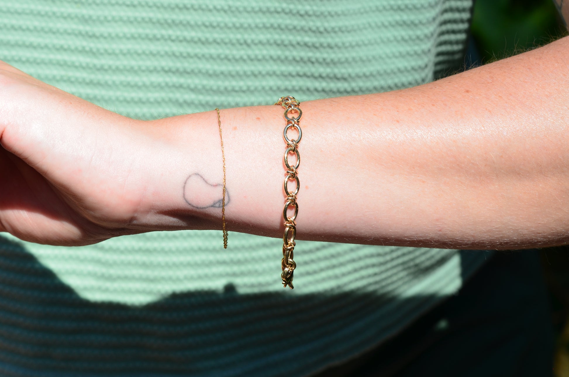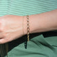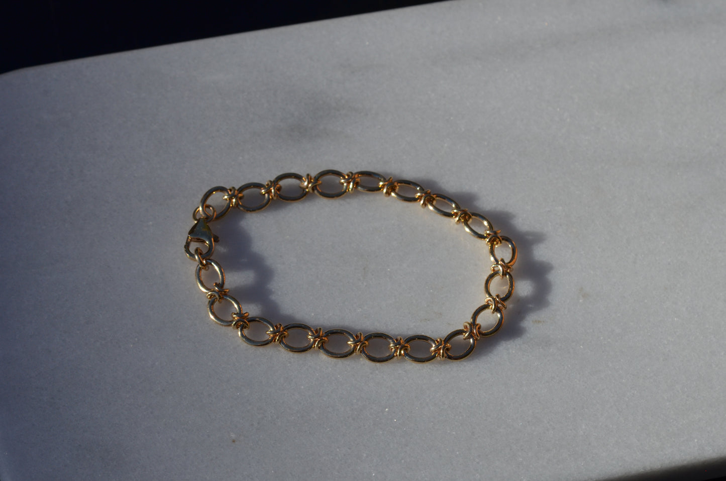 Sexy and a little edgy, this gorgeous bracelet reminds us a bit of barbed wire, with each little link cutting across bigger loops. Stunning alone, this bracelet could also function as a sturdy base layer upon which to build your uniquely personalized charm bracelet. With or without any additional flair, the bracelet will be sure to catch eyes and the rays of the sun, and keep you smiling whenever you look at it.