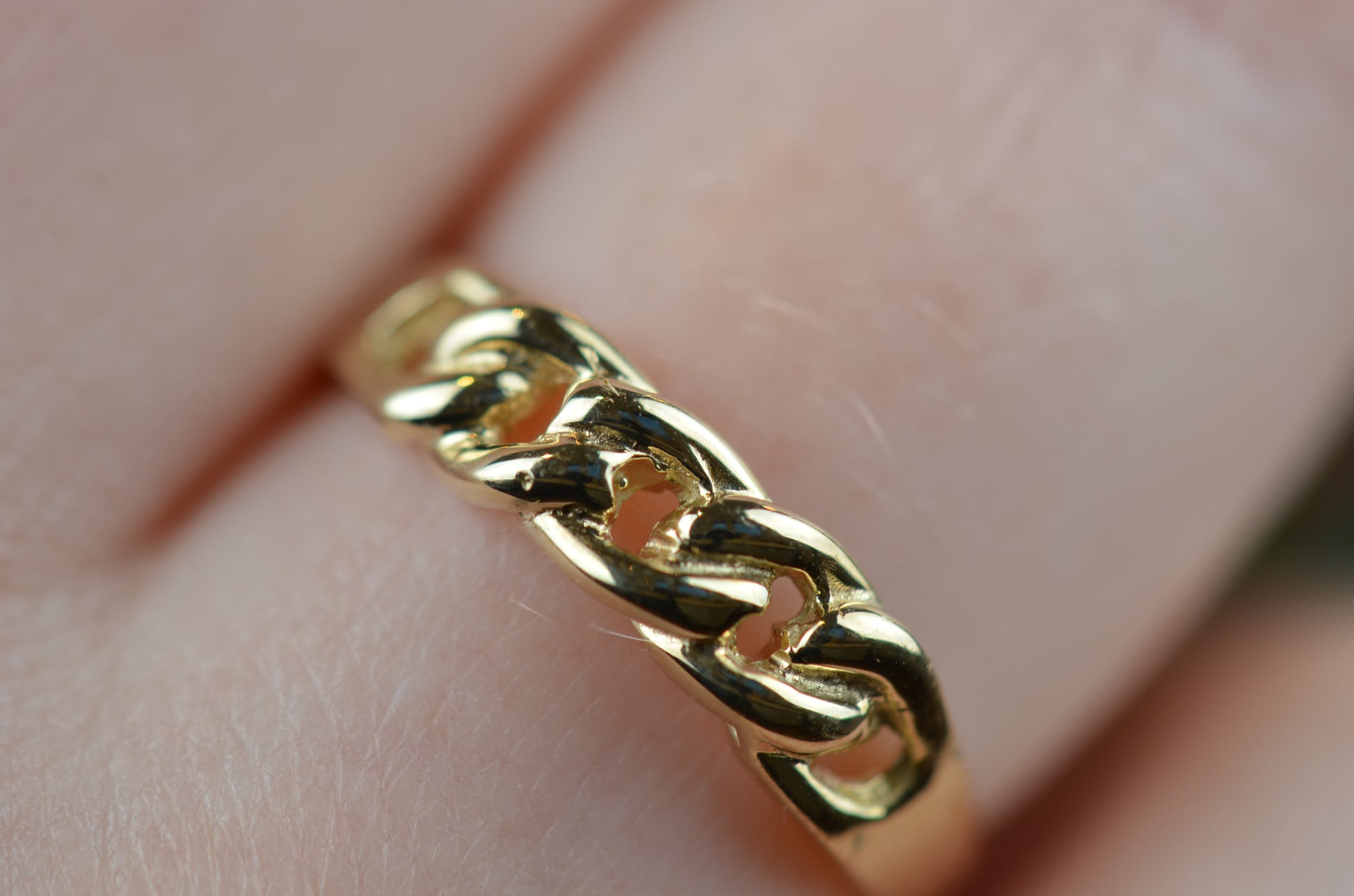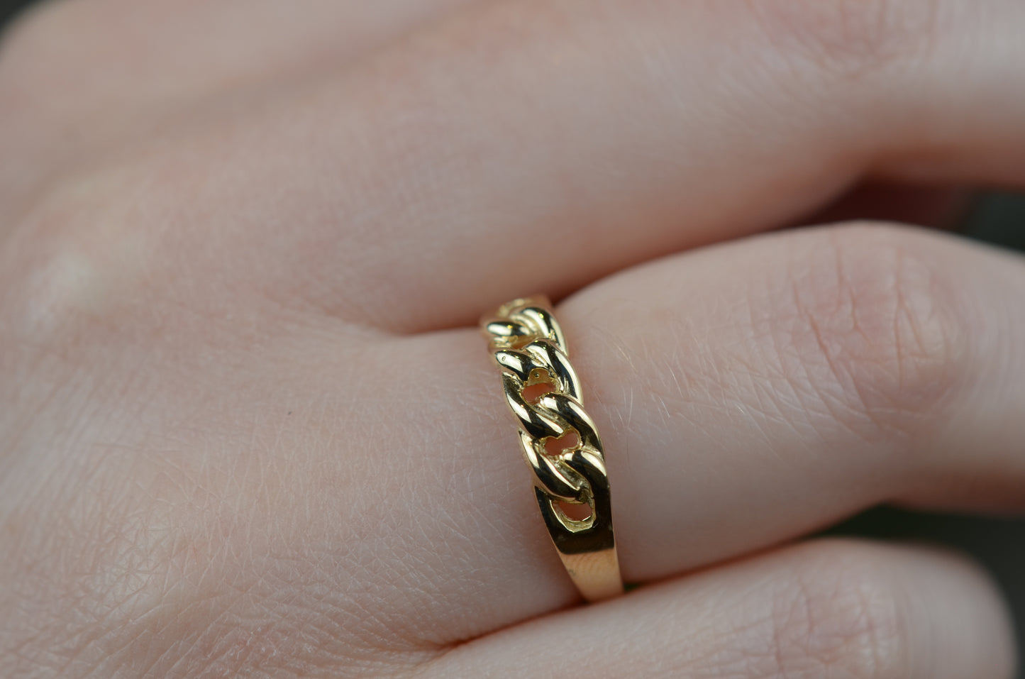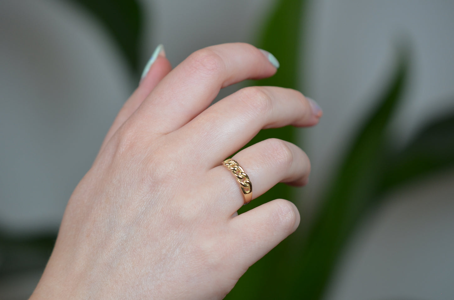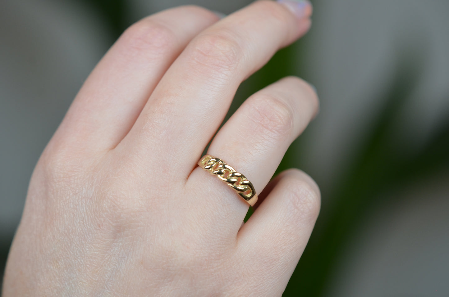 There's something about a gold chain link ring that just feels perfectly '90s sexy and a little menacing, like a really good barbed wire tattoo. This ring is ultra comfortable with a transition to a smooth, tapering band just before it curves around the sides of your finger, so it's slim and smooth between.