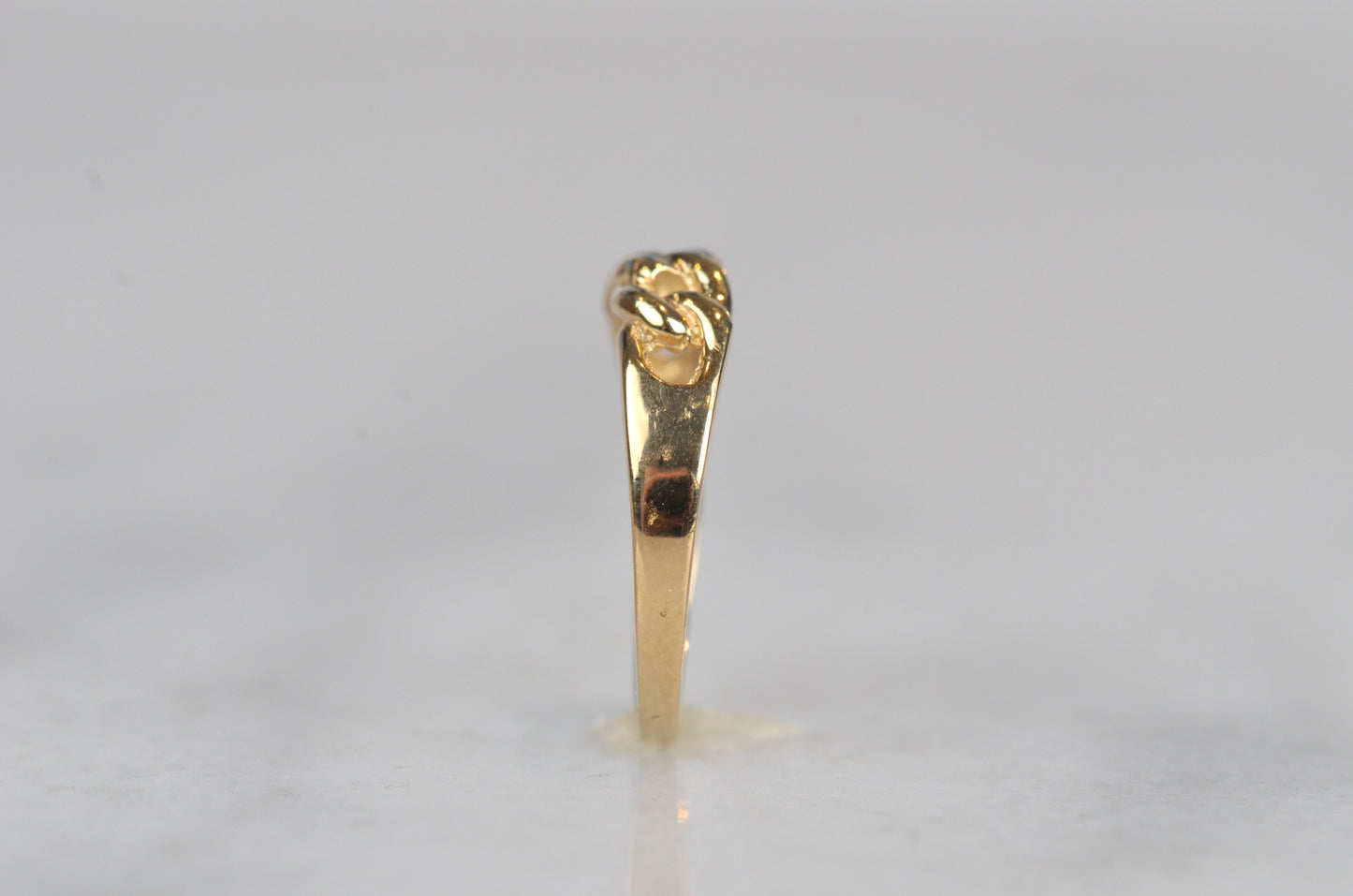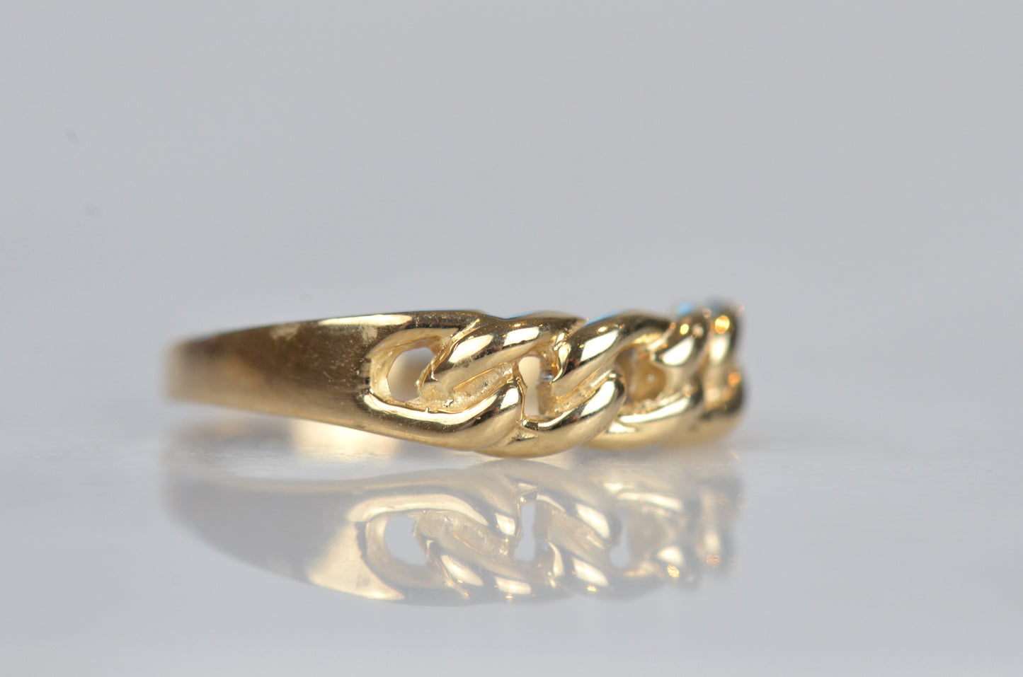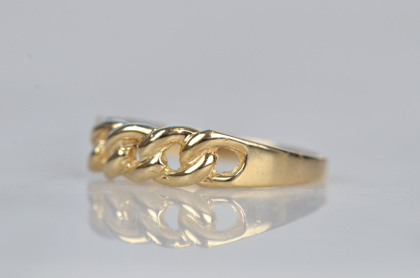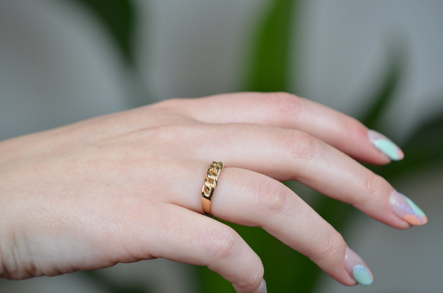 There's something about a gold chain link ring that just feels perfectly '90s sexy and a little menacing, like a really good barbed wire tattoo. This ring is ultra comfortable with a transition to a smooth, tapering band just before it curves around the sides of your finger, so it's slim and smooth between.