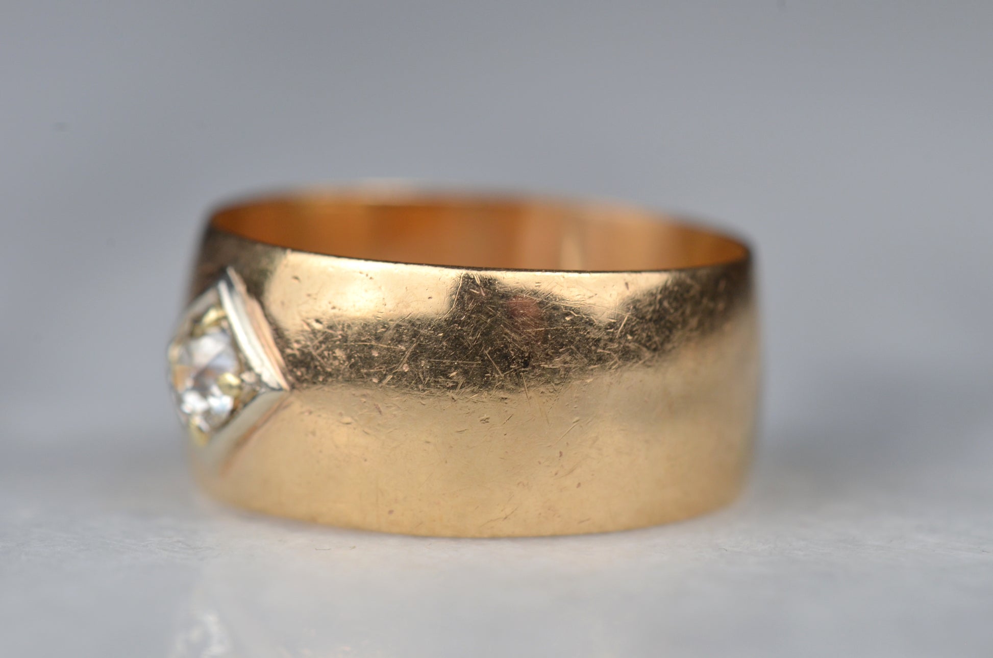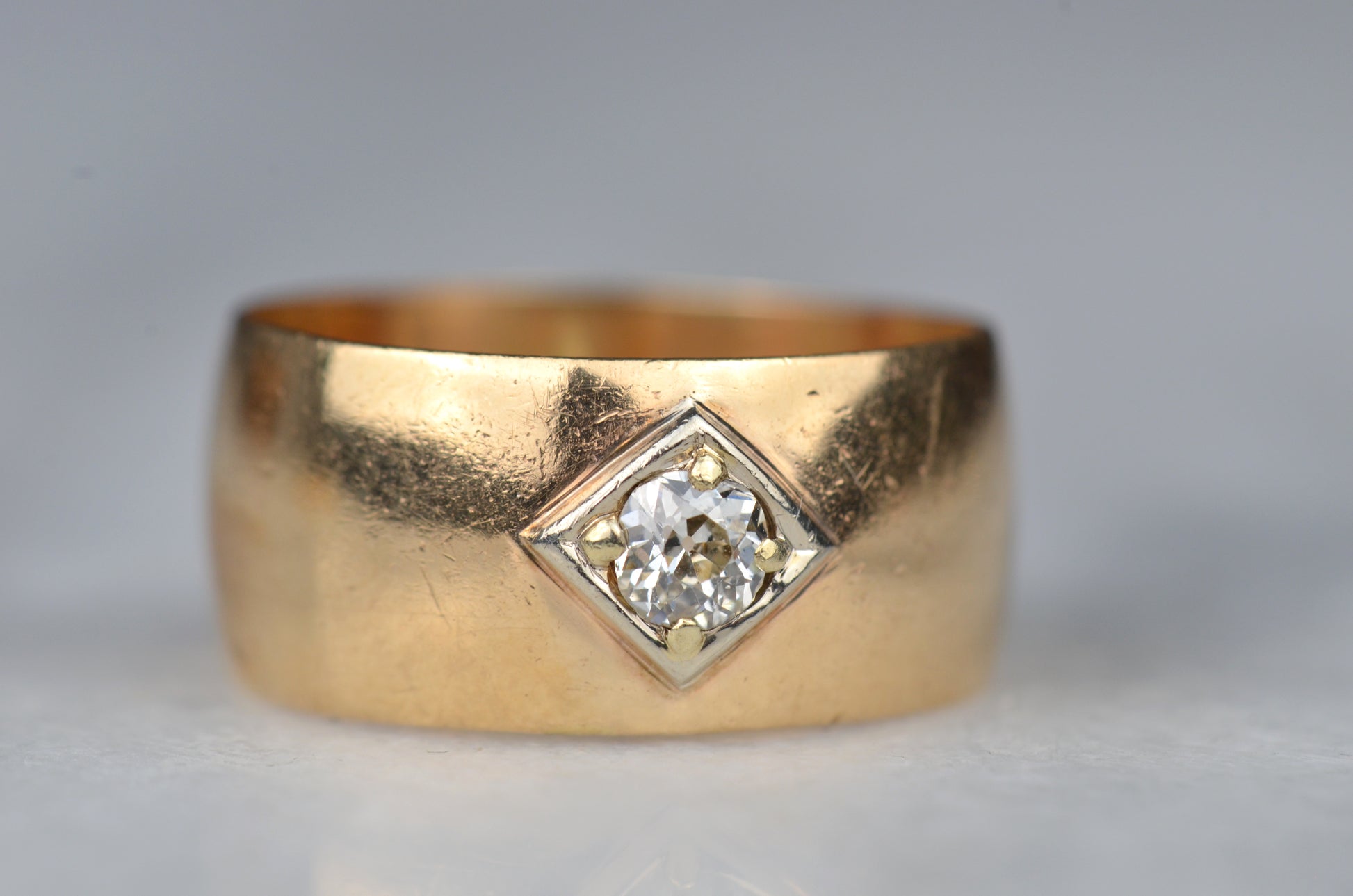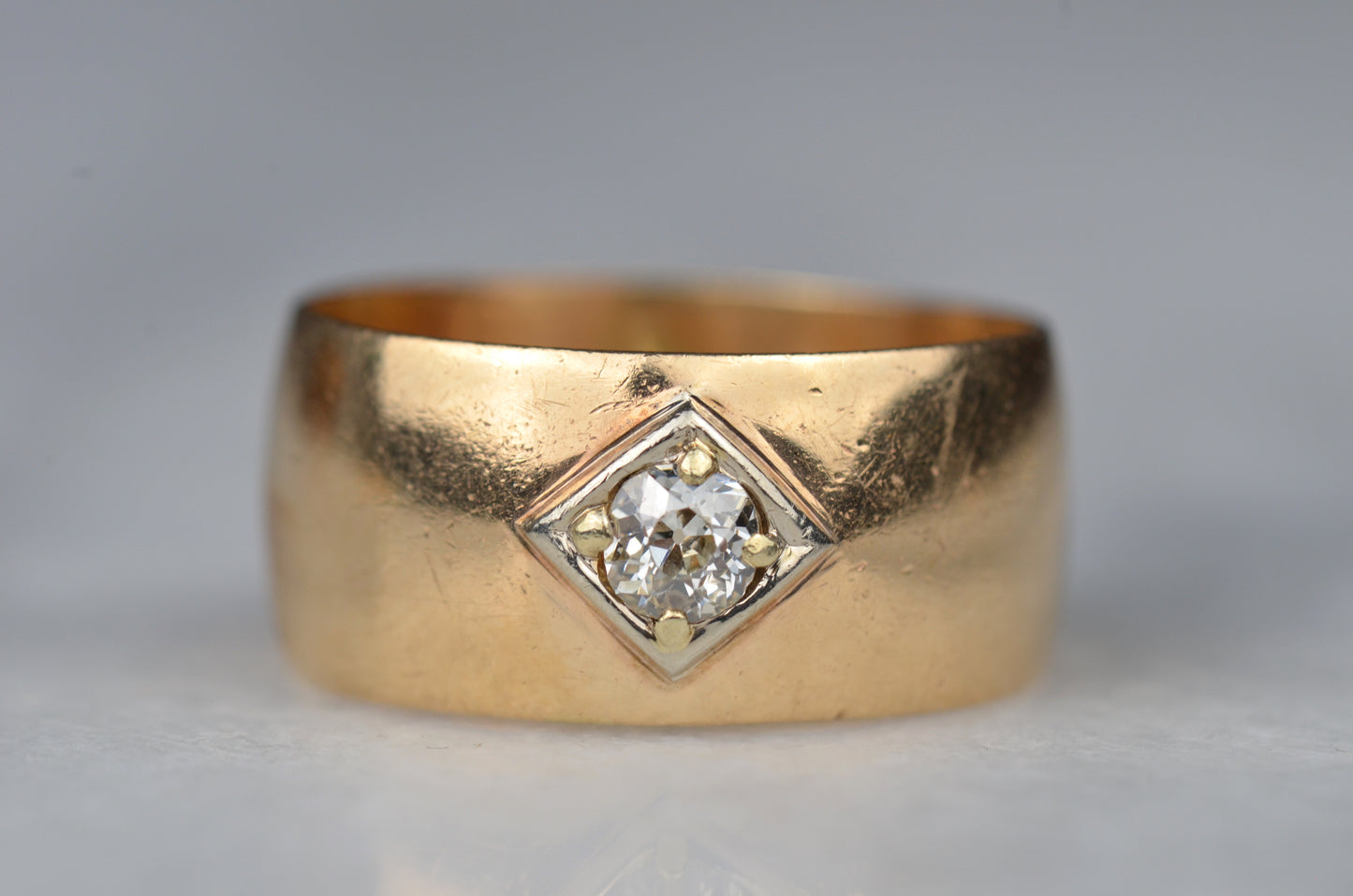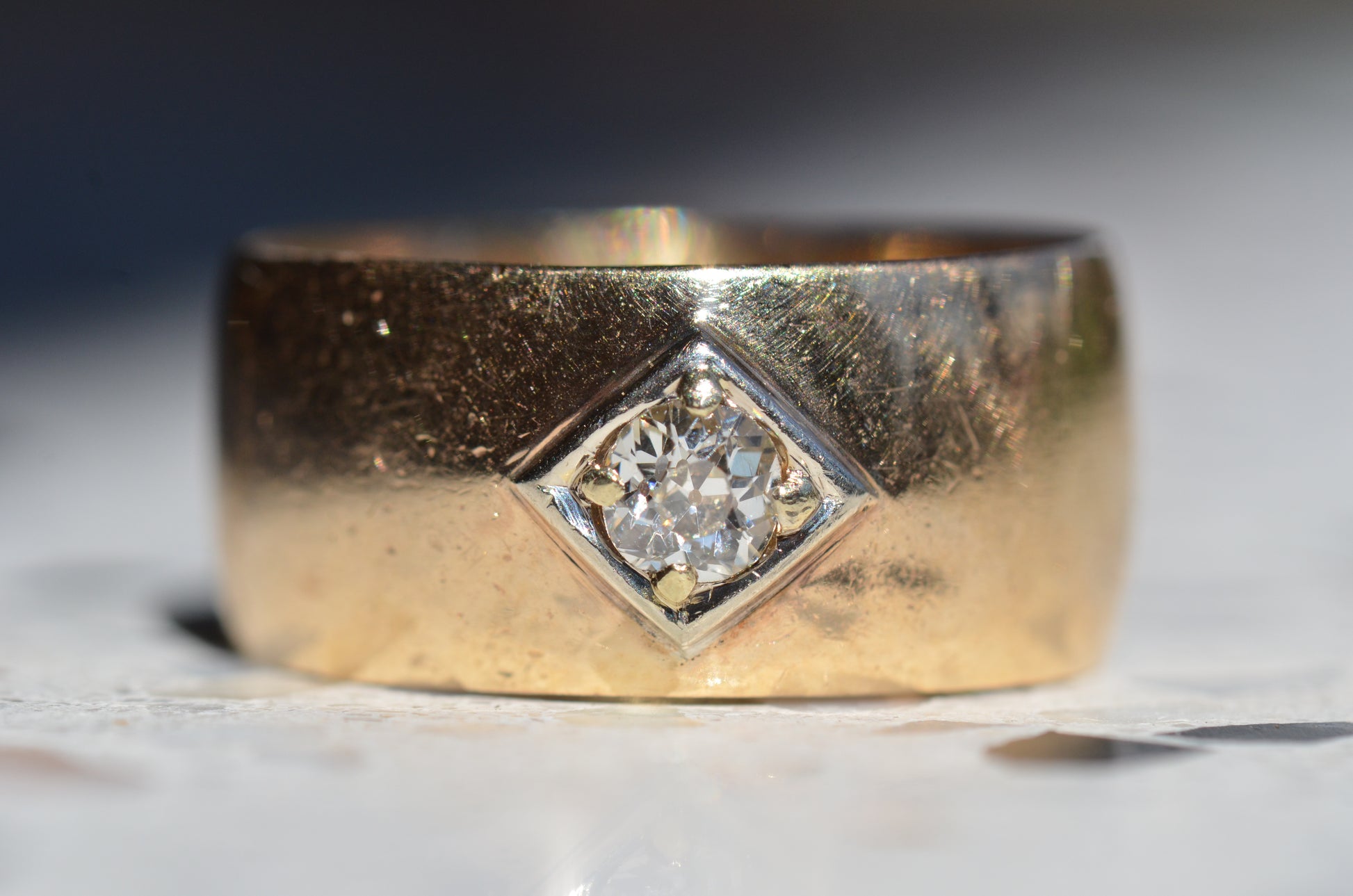 For such a simple and understated design, this ring has maximum impact. A wide, slightly domed cigar band with just the slightest taper in back gives glorious finger coverage and provides the perfect canvas for a simple diamond sunk low into the band. The soft cushion shape of the old mine cut diamond is perfectly offset by a white gold diamond-shaped frame, with points at NESW. The broad facets and high crown of the diamond give a rich payoff of rainbow dispersion and light return, with bright flashes of white and rainbow sparkles contrasting and complementing the velvety texture of the worn-in gold. This ring would be ideal as an alternative engagement ring, wedding band, or every day piece that combines statement drama with comfortable wearability.