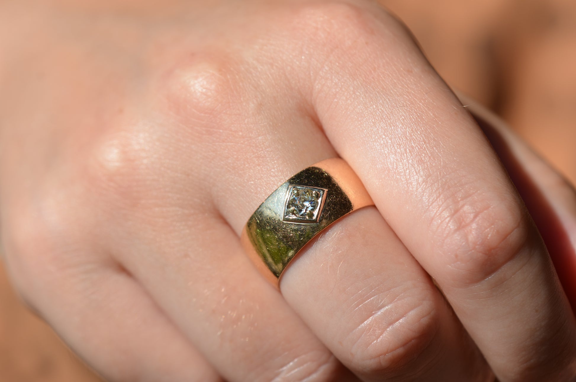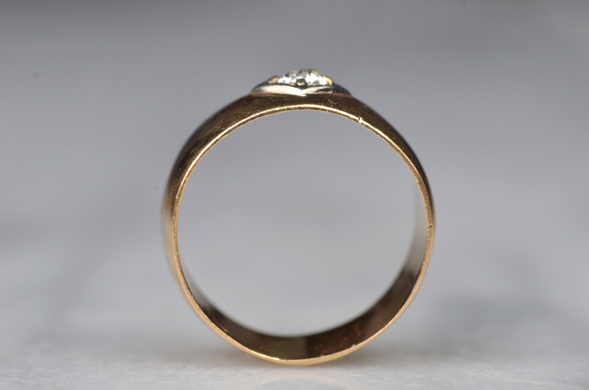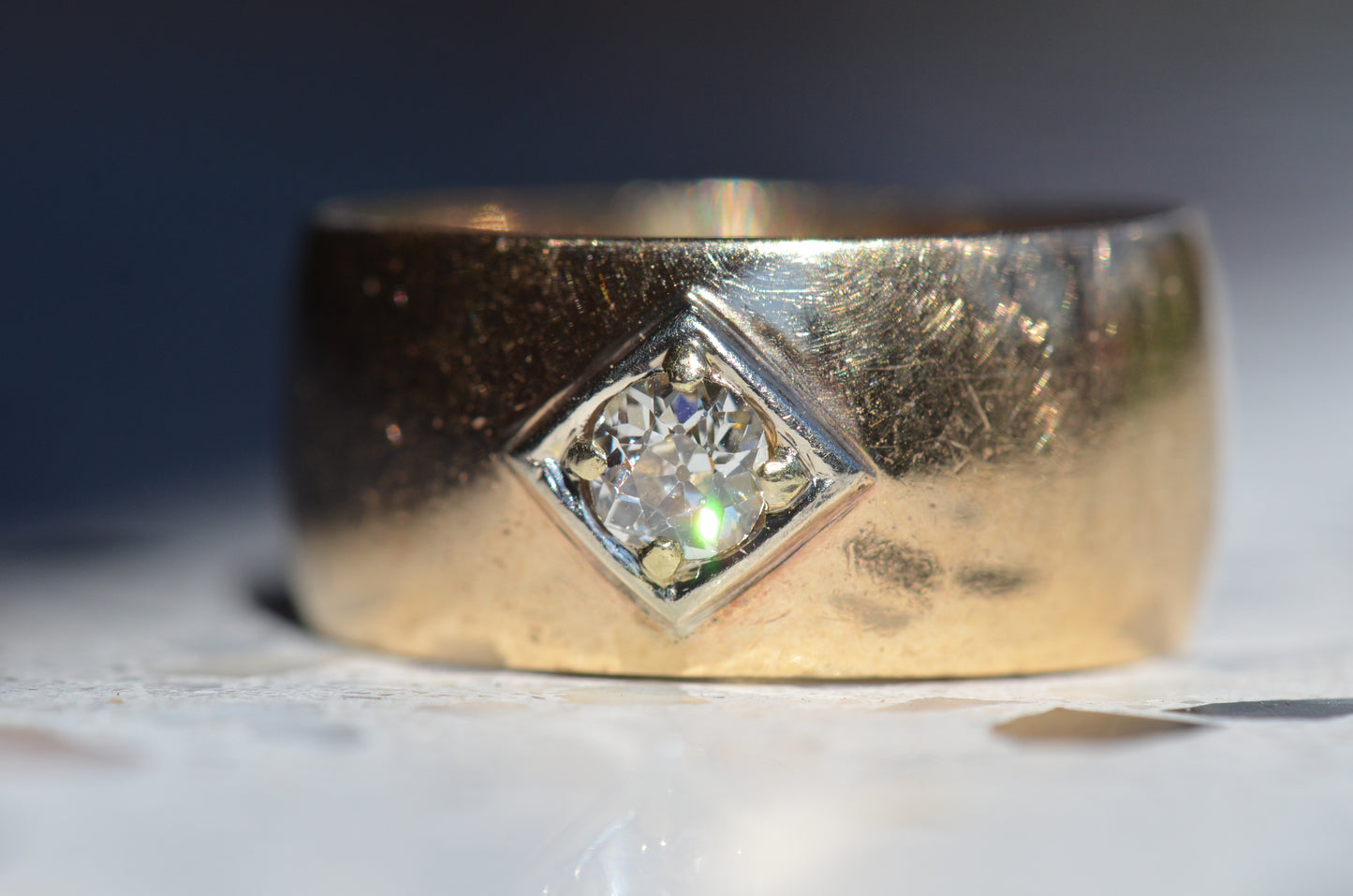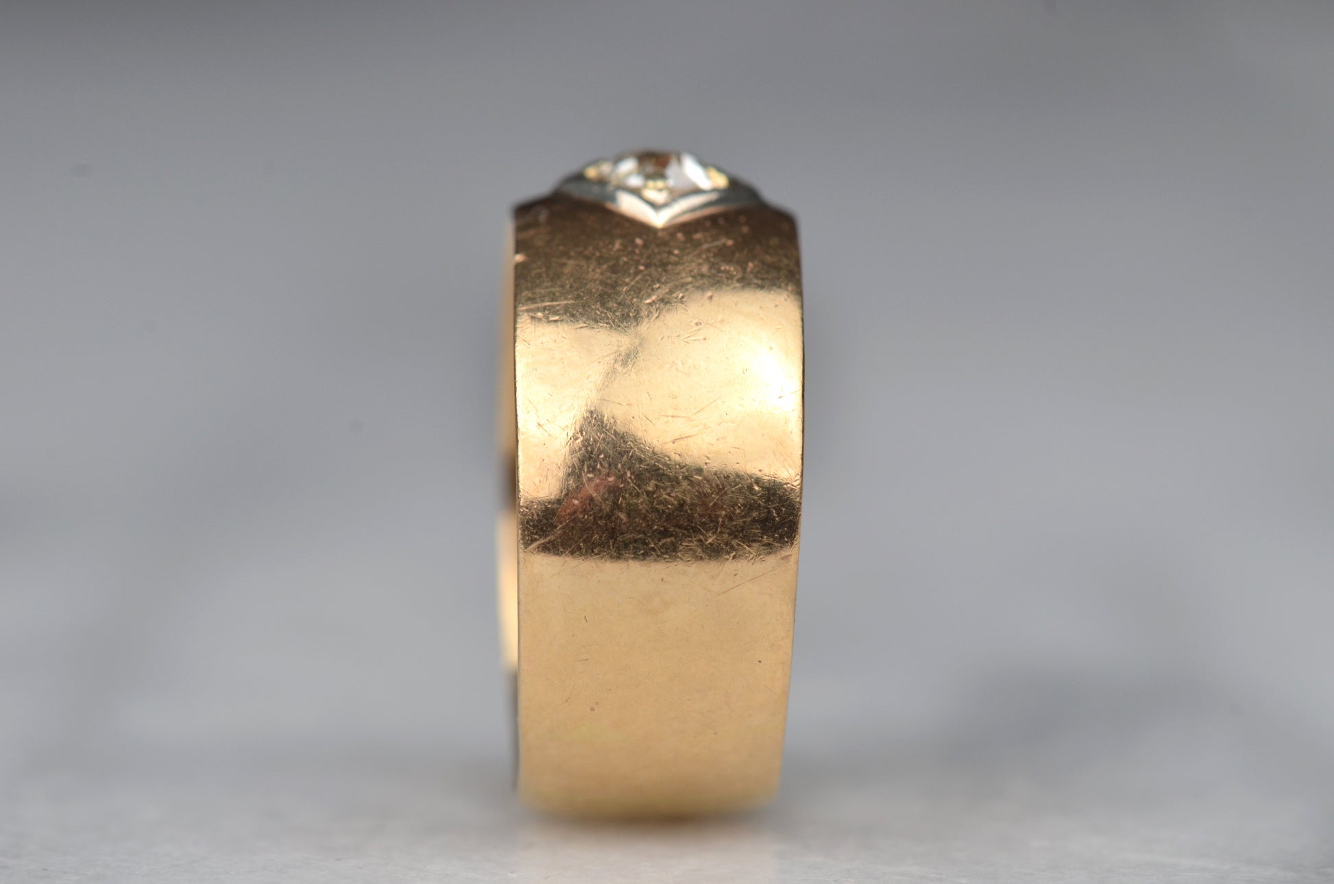 For such a simple and understated design, this ring has maximum impact. A wide, slightly domed cigar band with just the slightest taper in back gives glorious finger coverage and provides the perfect canvas for a simple diamond sunk low into the band. The soft cushion shape of the old mine cut diamond is perfectly offset by a white gold diamond-shaped frame, with points at NESW. The broad facets and high crown of the diamond give a rich payoff of rainbow dispersion and light return, with bright flashes of white and rainbow sparkles contrasting and complementing the velvety texture of the worn-in gold. This ring would be ideal as an alternative engagement ring, wedding band, or every day piece that combines statement drama with comfortable wearability.
