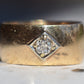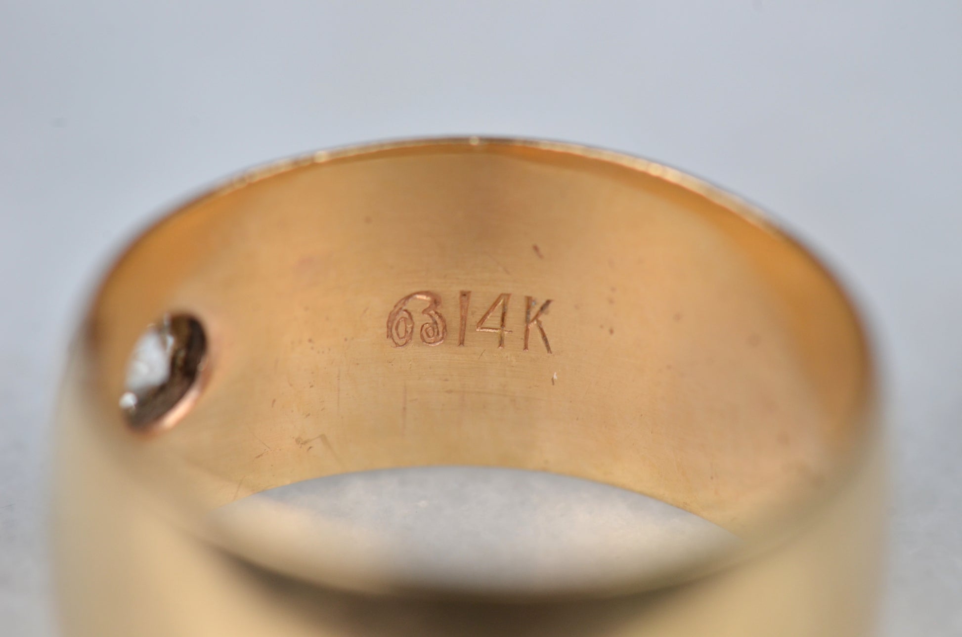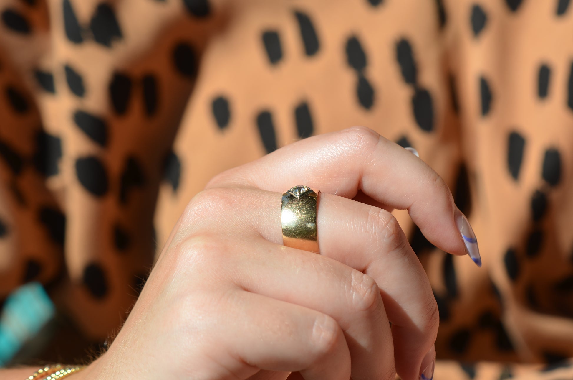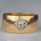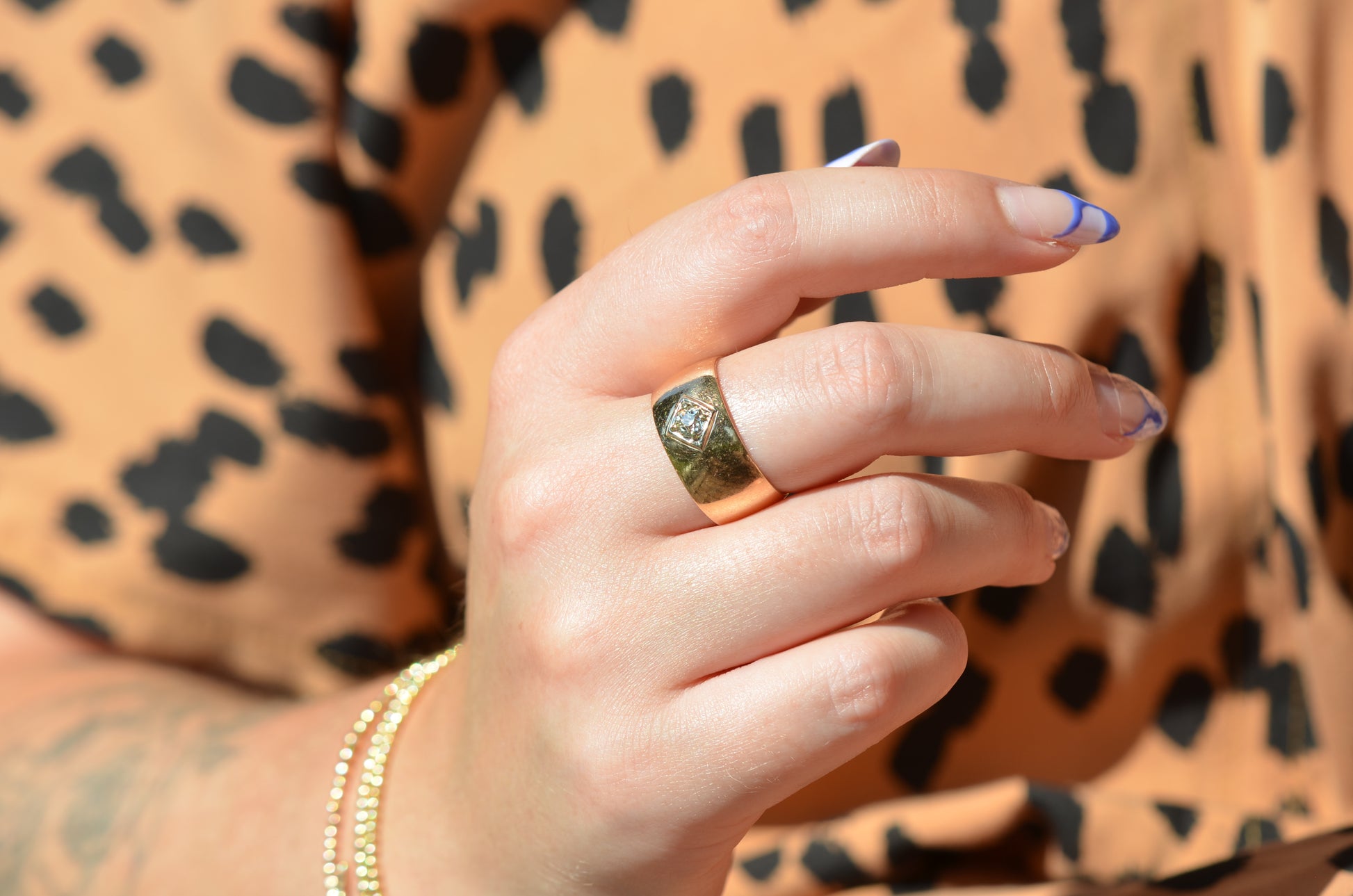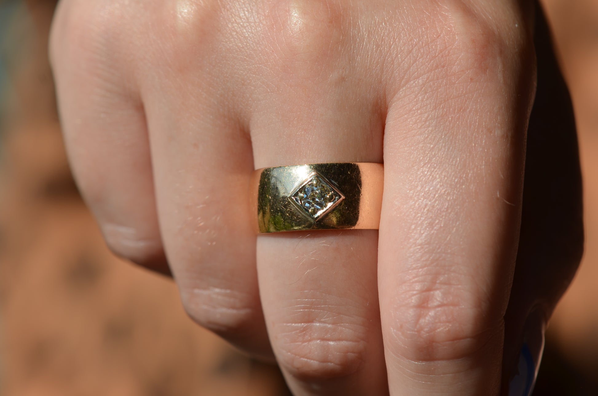 For such a simple and understated design, this ring has maximum impact. A wide, slightly domed cigar band with just the slightest taper in back gives glorious finger coverage and provides the perfect canvas for a simple diamond sunk low into the band. The soft cushion shape of the old mine cut diamond is perfectly offset by a white gold diamond-shaped frame, with points at NESW. The broad facets and high crown of the diamond give a rich payoff of rainbow dispersion and light return, with bright flashes of white and rainbow sparkles contrasting and complementing the velvety texture of the worn-in gold. This ring would be ideal as an alternative engagement ring, wedding band, or every day piece that combines statement drama with comfortable wearability.