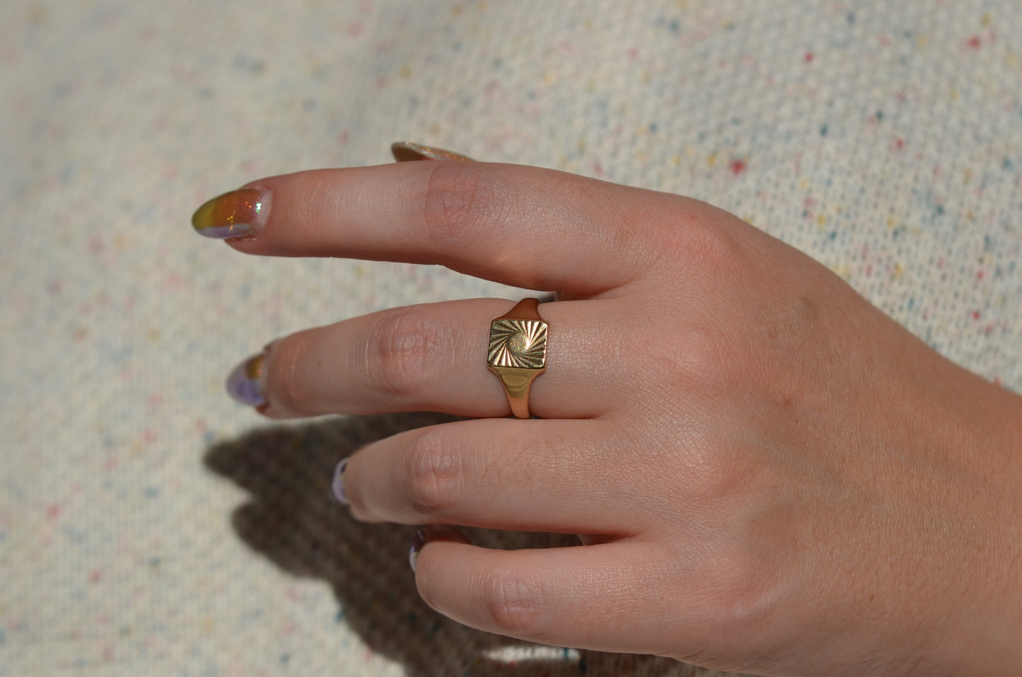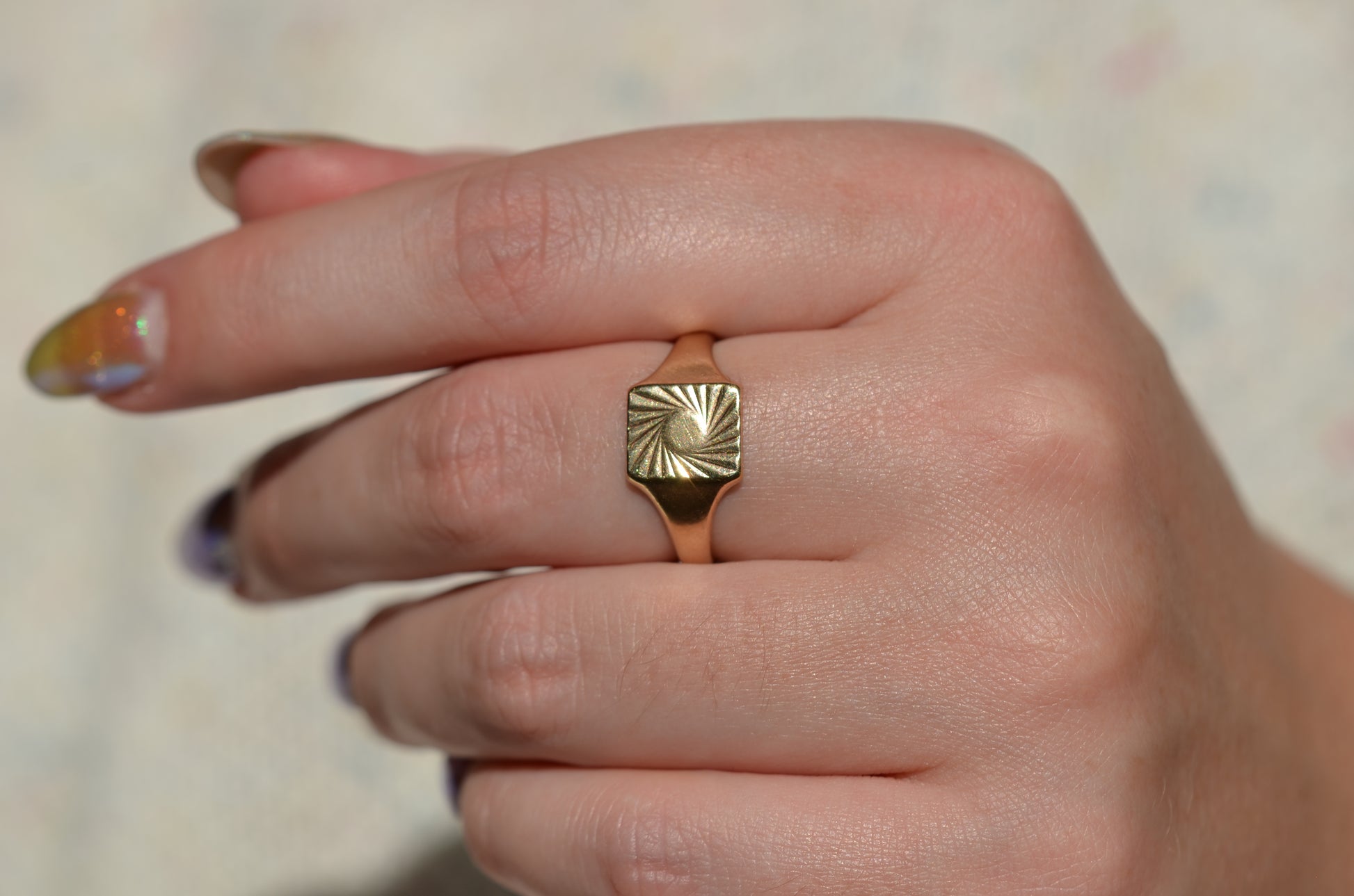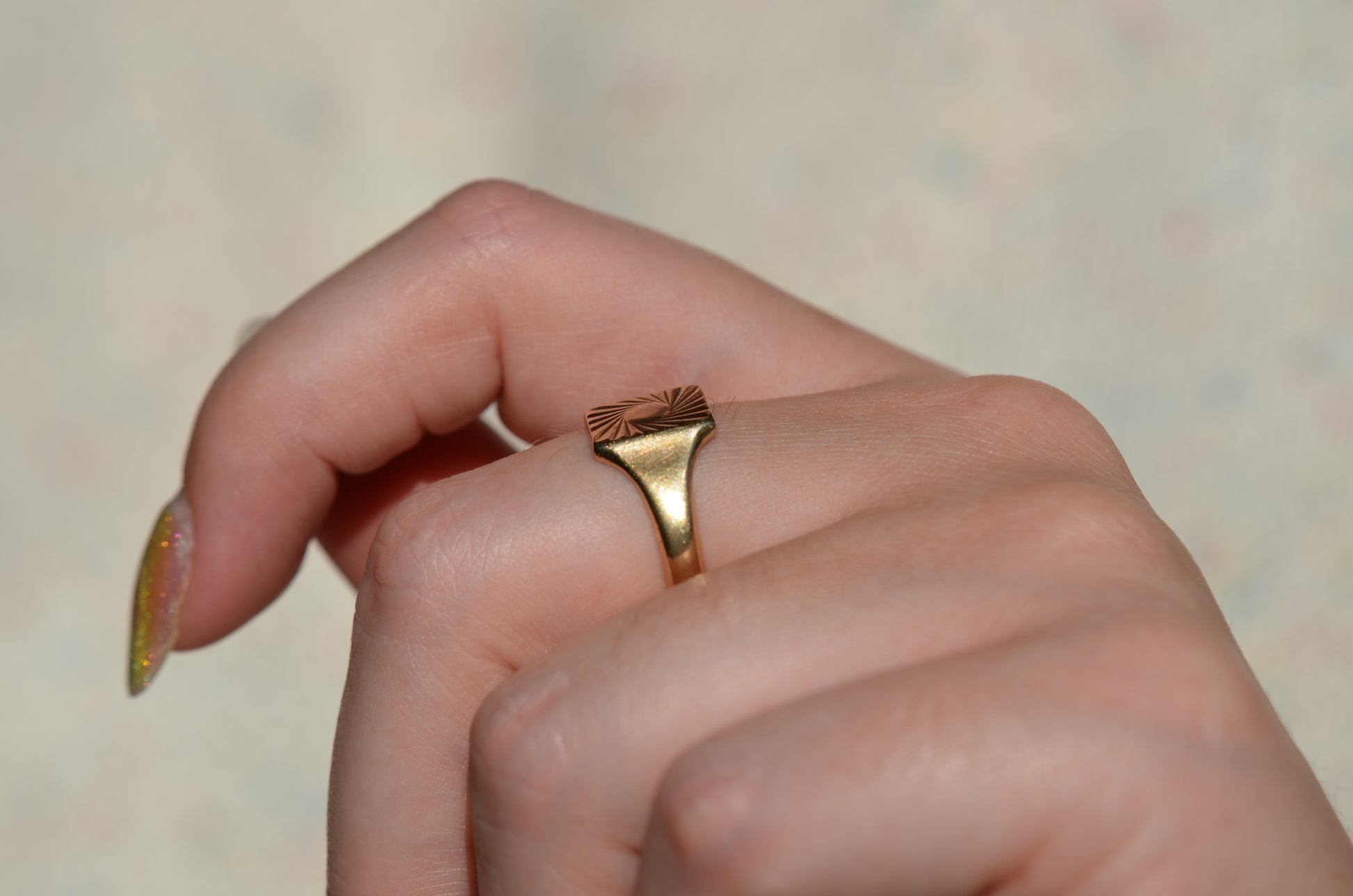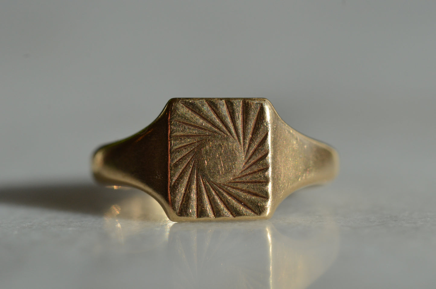 A beautiful sleek vintage signet that shimmers and glows. A bold rectangular face feels unusual and modern, while engraved rays shoot dreamily outwards from the centre. The light skips and dances across these rays beautifully, while the shape and finger coverage of the ring evokes a quiet power. We love this ring as a reminder of all the light you bring to the world, and the ways that it reaches outwards to everyone you know and everything you do.