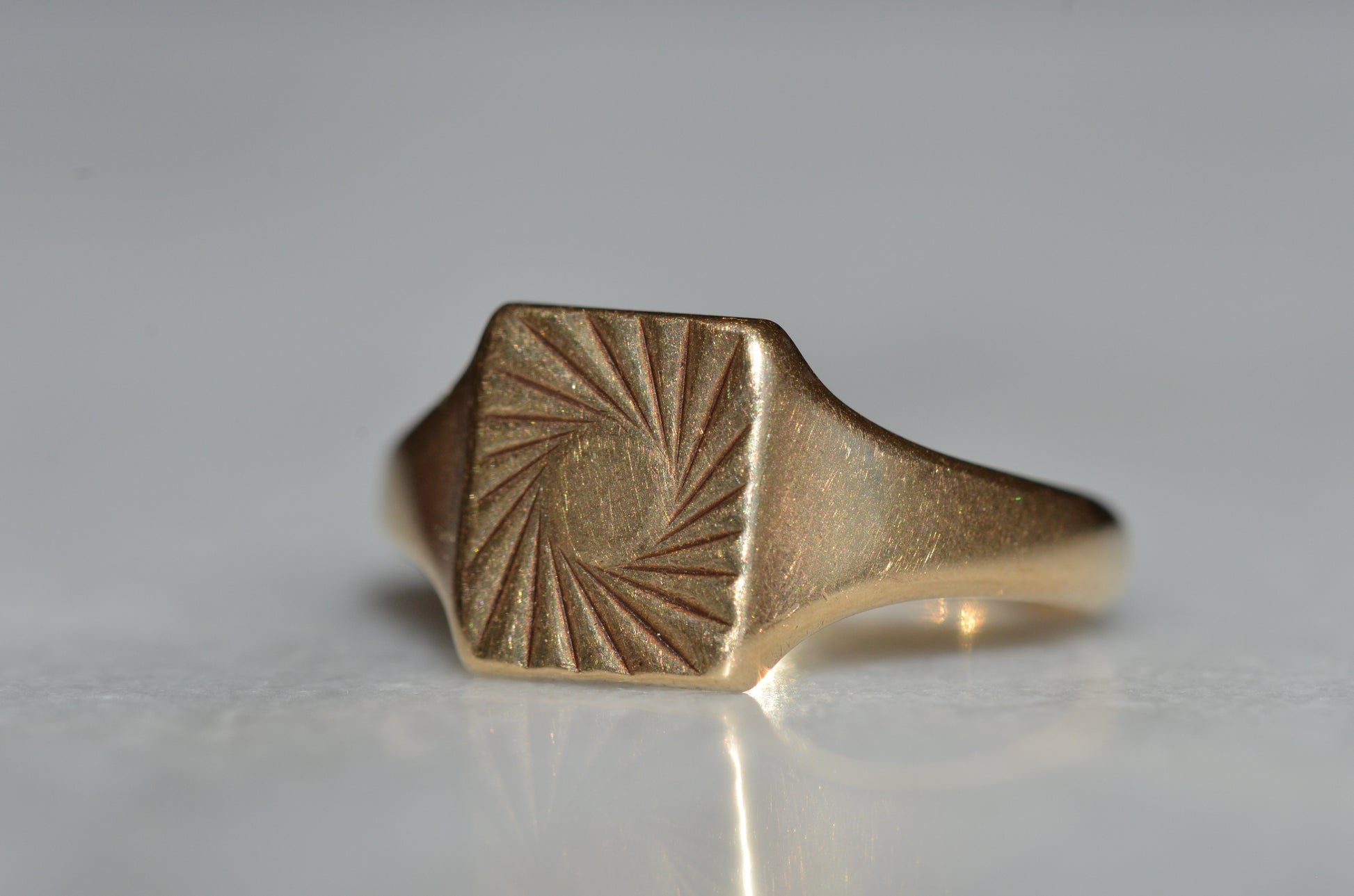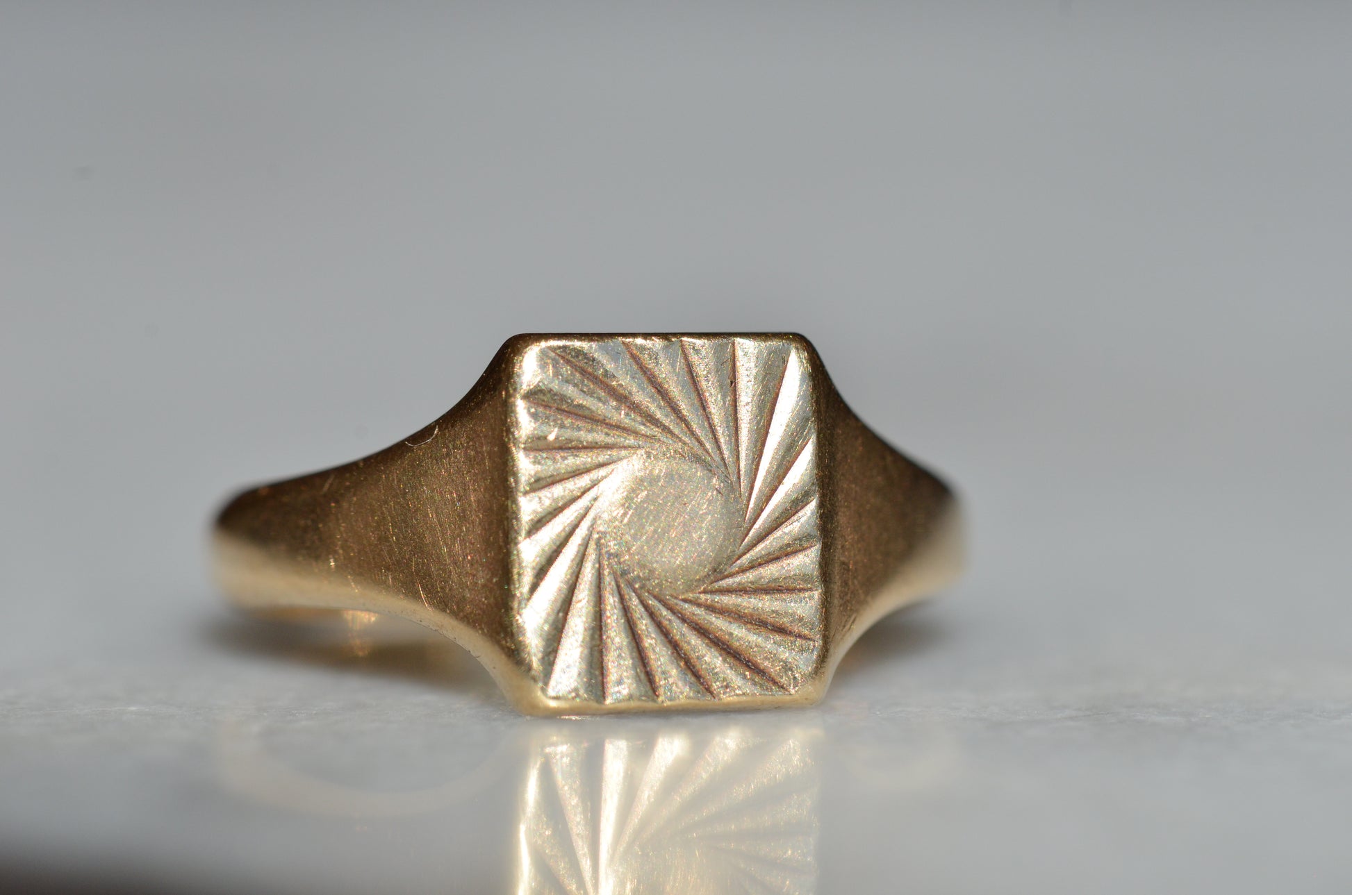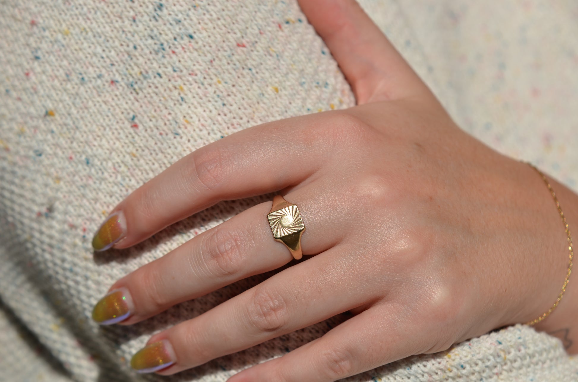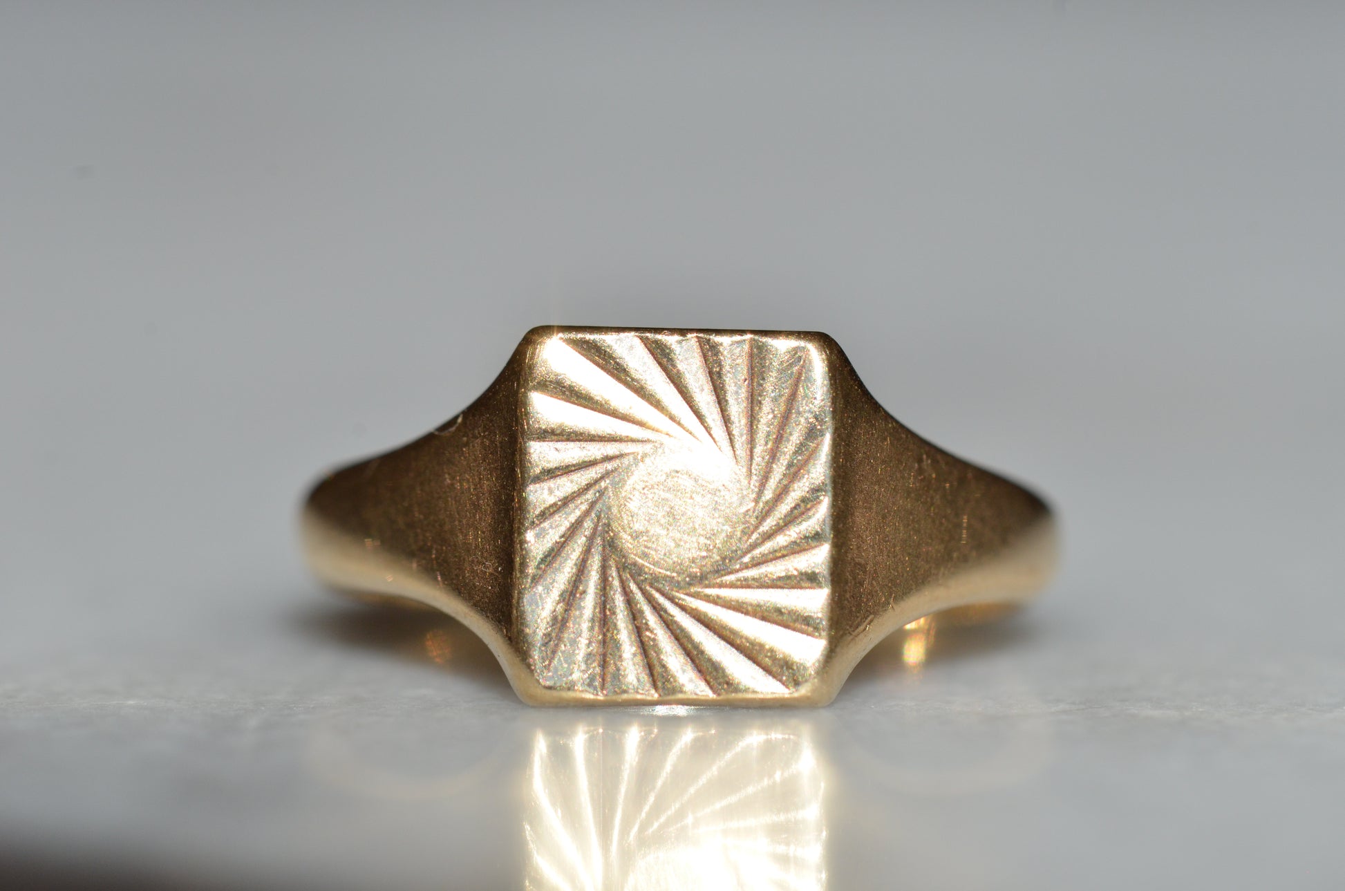 A beautiful sleek vintage signet that shimmers and glows. A bold rectangular face feels unusual and modern, while engraved rays shoot dreamily outwards from the centre. The light skips and dances across these rays beautifully, while the shape and finger coverage of the ring evokes a quiet power. We love this ring as a reminder of all the light you bring to the world, and the ways that it reaches outwards to everyone you know and everything you do.