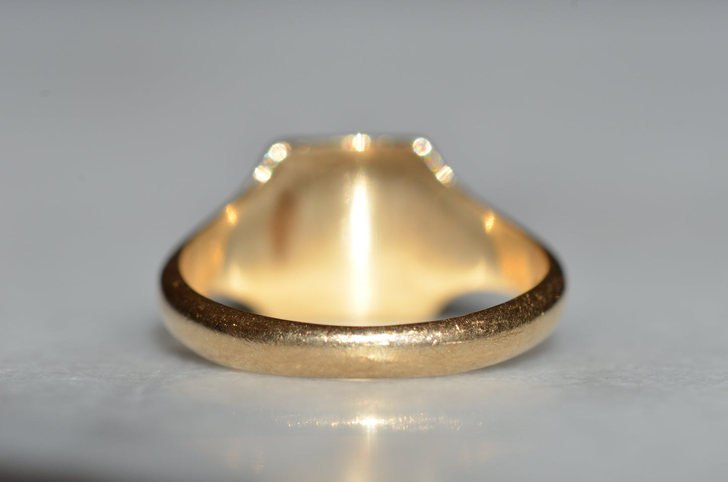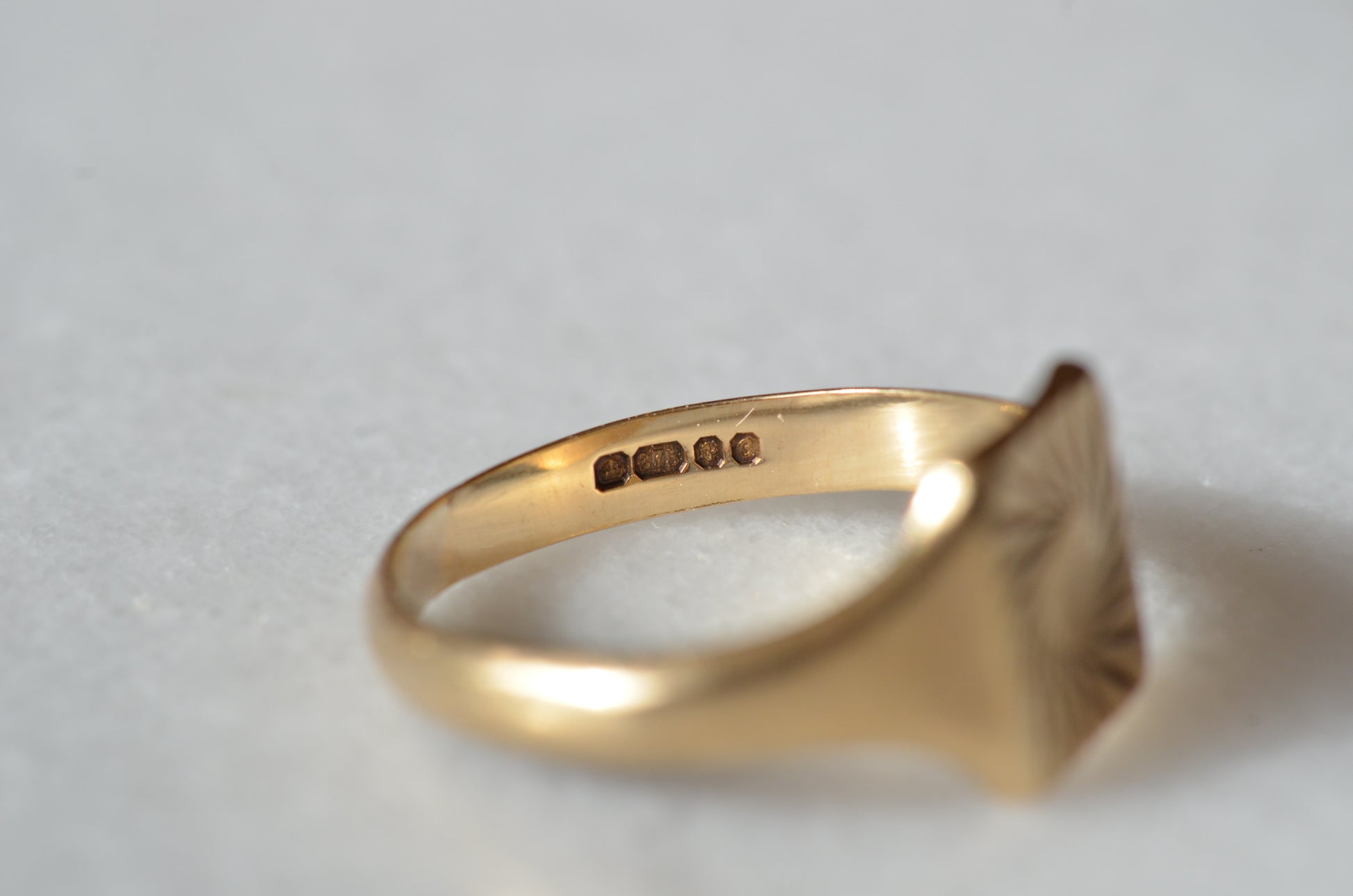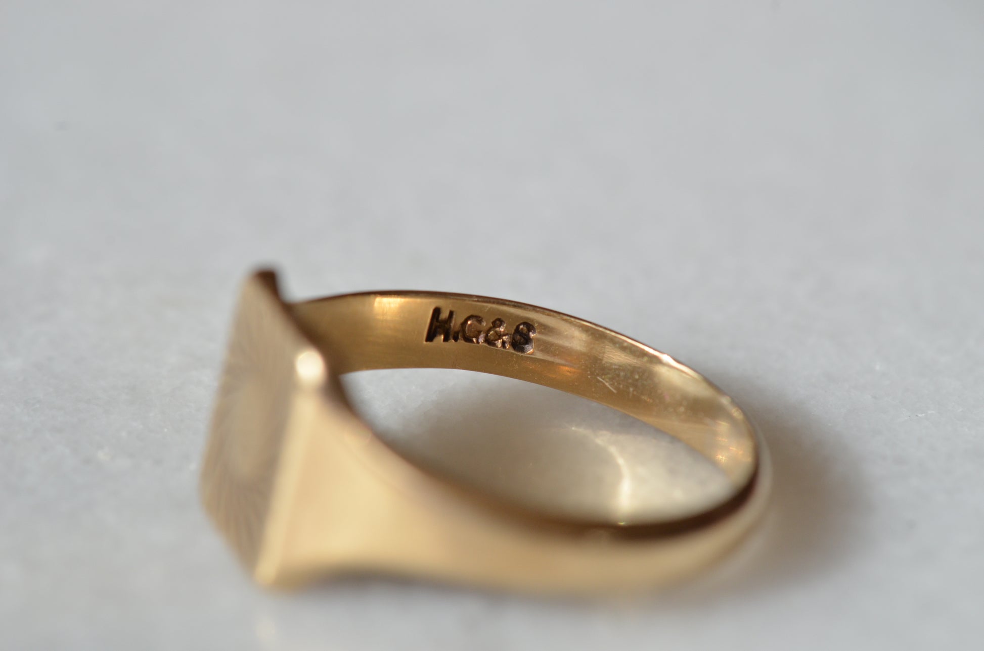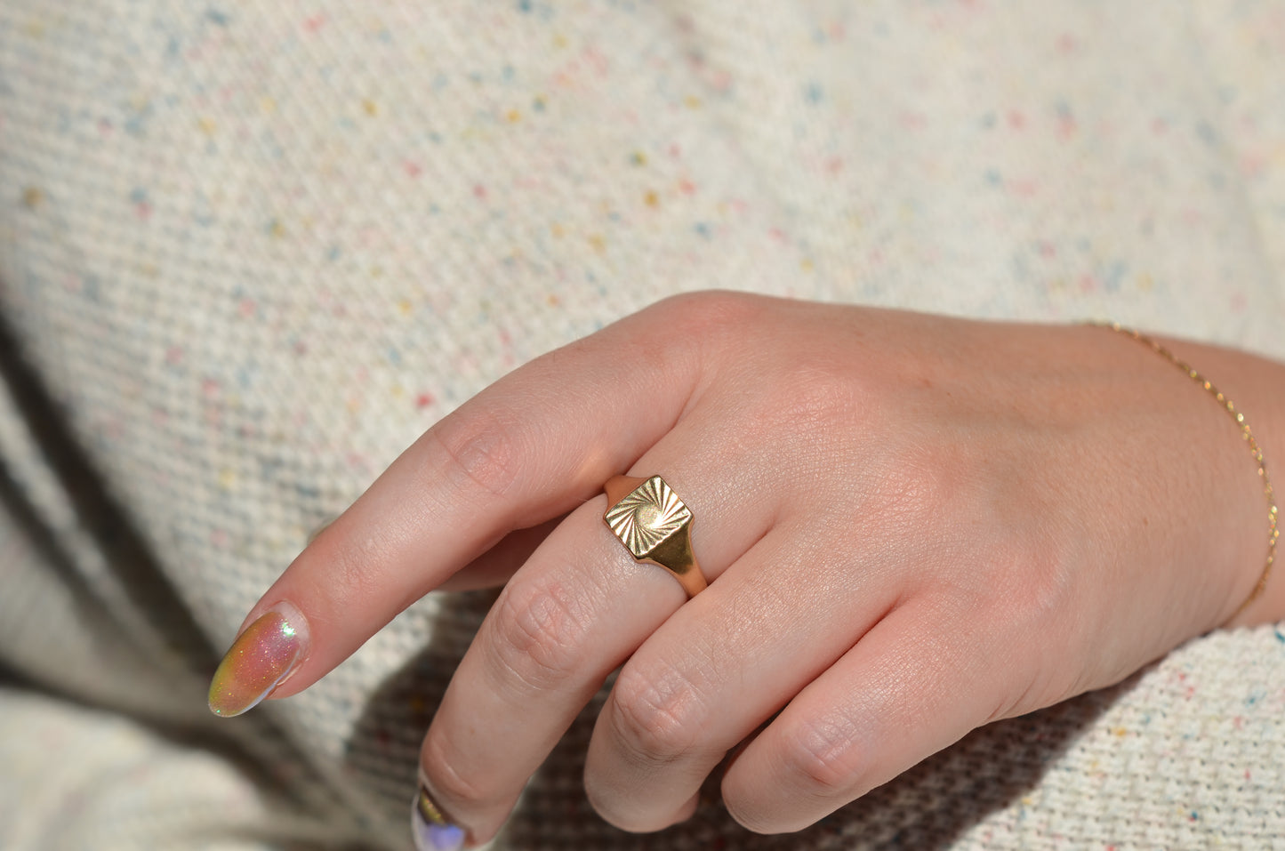 A beautiful sleek vintage signet that shimmers and glows. A bold rectangular face feels unusual and modern, while engraved rays shoot dreamily outwards from the centre. The light skips and dances across these rays beautifully, while the shape and finger coverage of the ring evokes a quiet power. We love this ring as a reminder of all the light you bring to the world, and the ways that it reaches outwards to everyone you know and everything you do.
