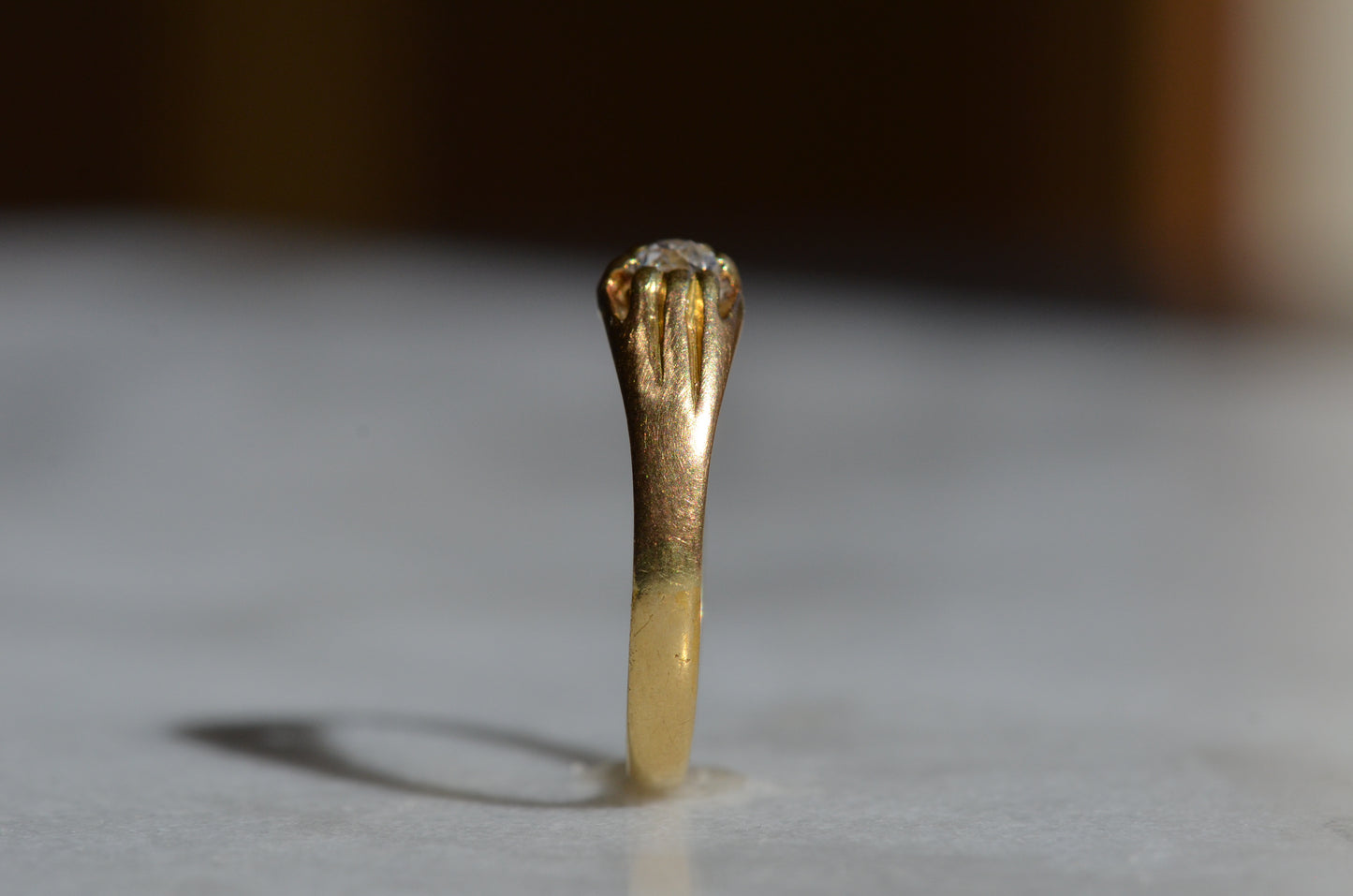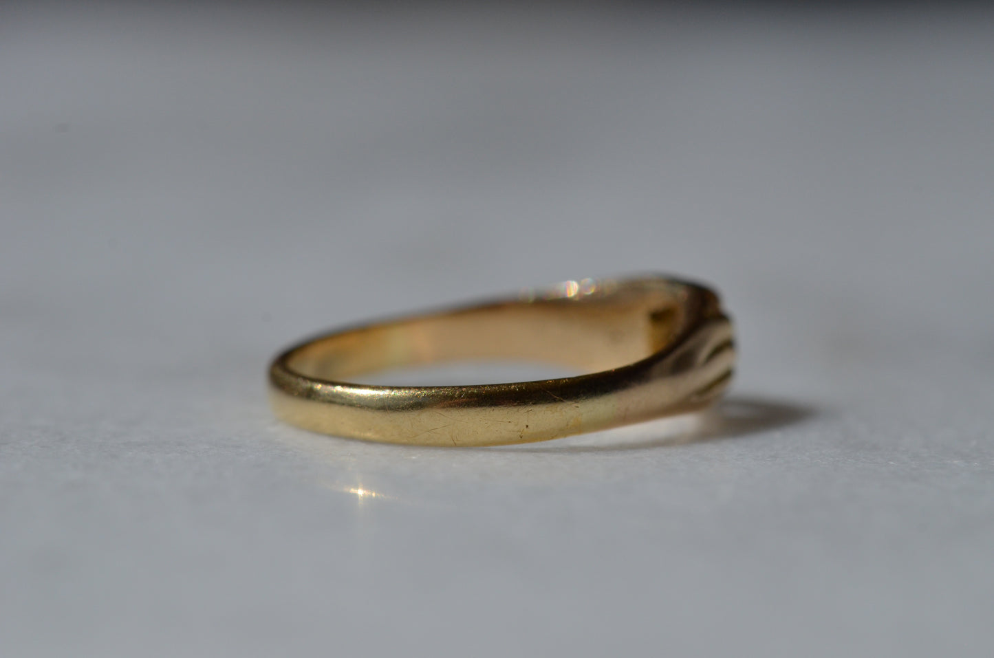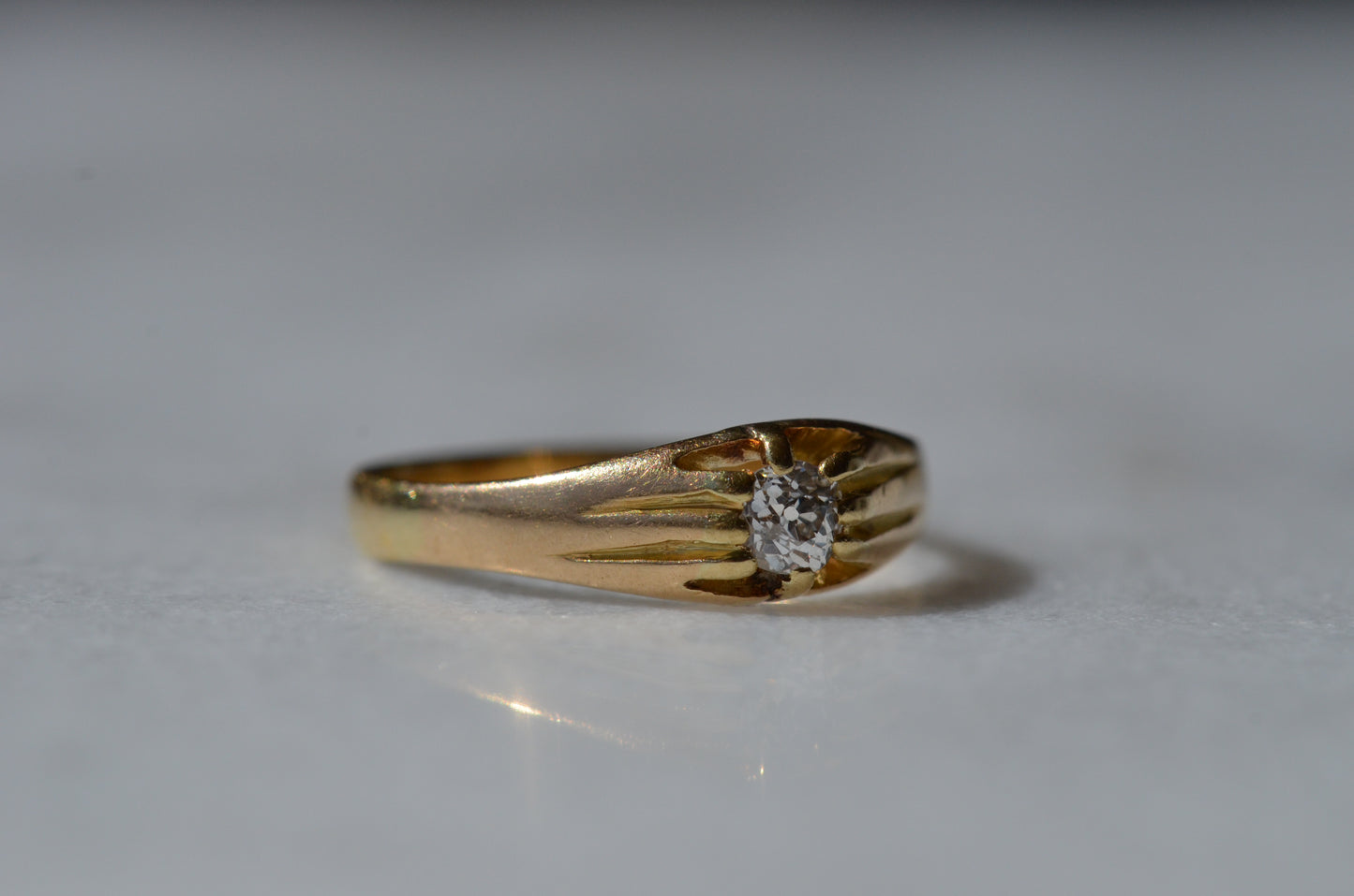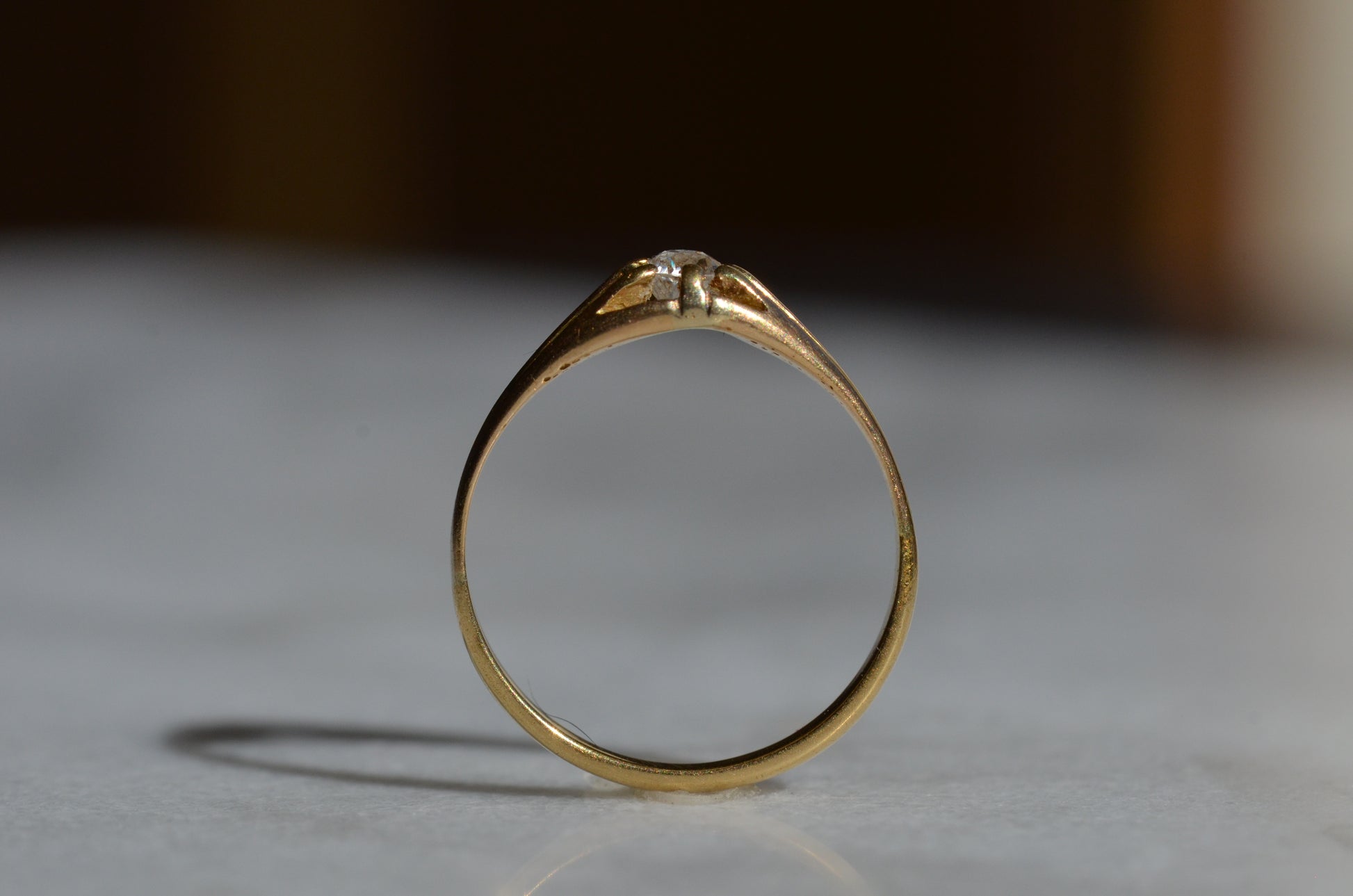 A gorgeous stirrup-style ring that straddles the features of the recent Victorian era (yellow gold, low belcher-like setting) and the coming Art Deco trend toward symmetry and linear designs, this luscious piece is perfect for everyday wear. With a bright quarter-carat diamond and a broad gold band, this could serve double duty as an engagement ring and wedding band in one, pair with a band, or make a great stacking ring or stand-alone piece. Low profile and ultra comfortable, this ring is an absolute dream.