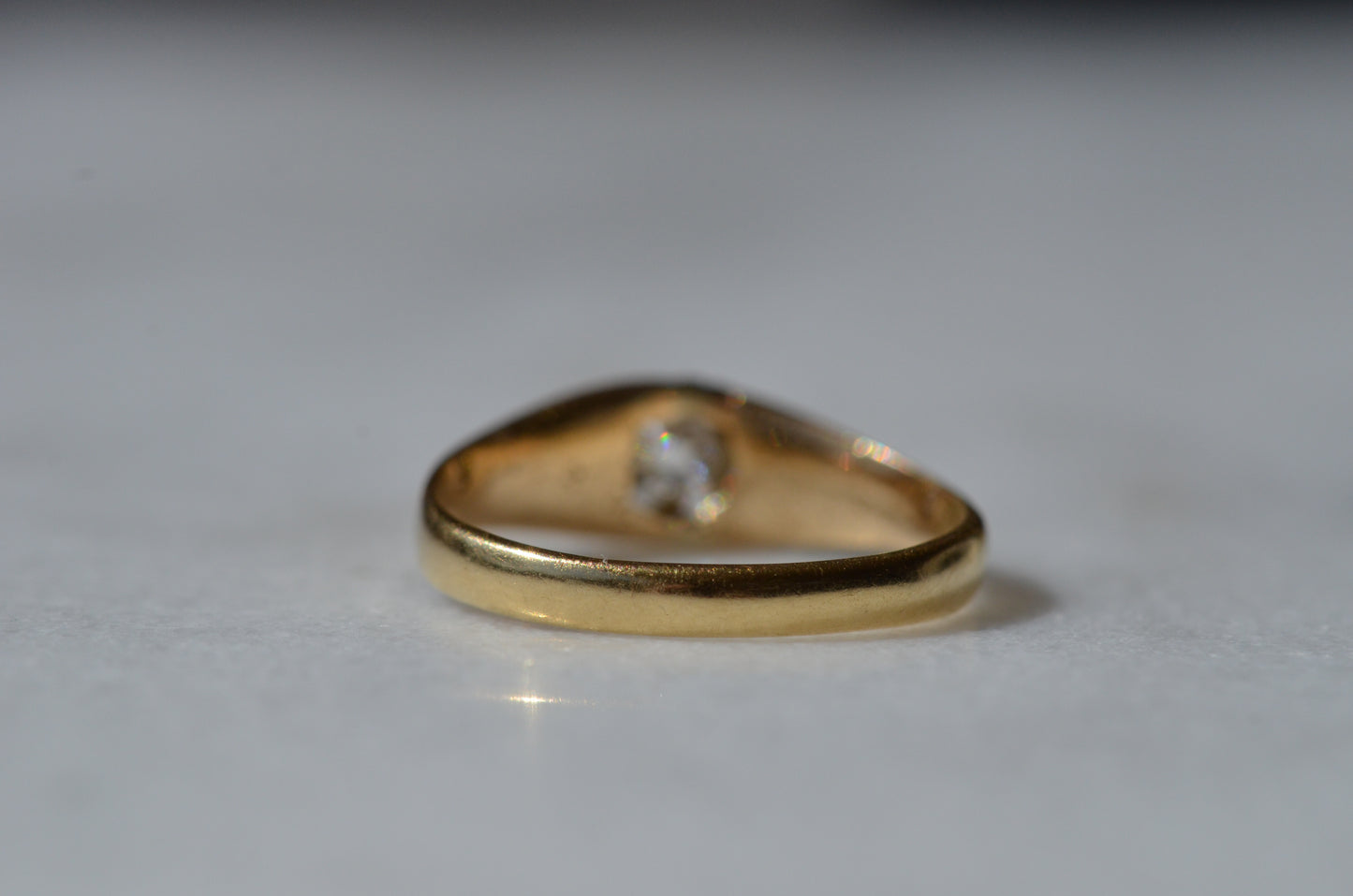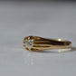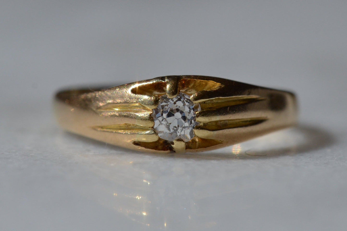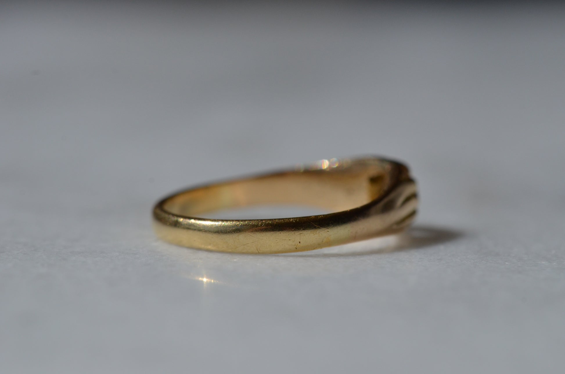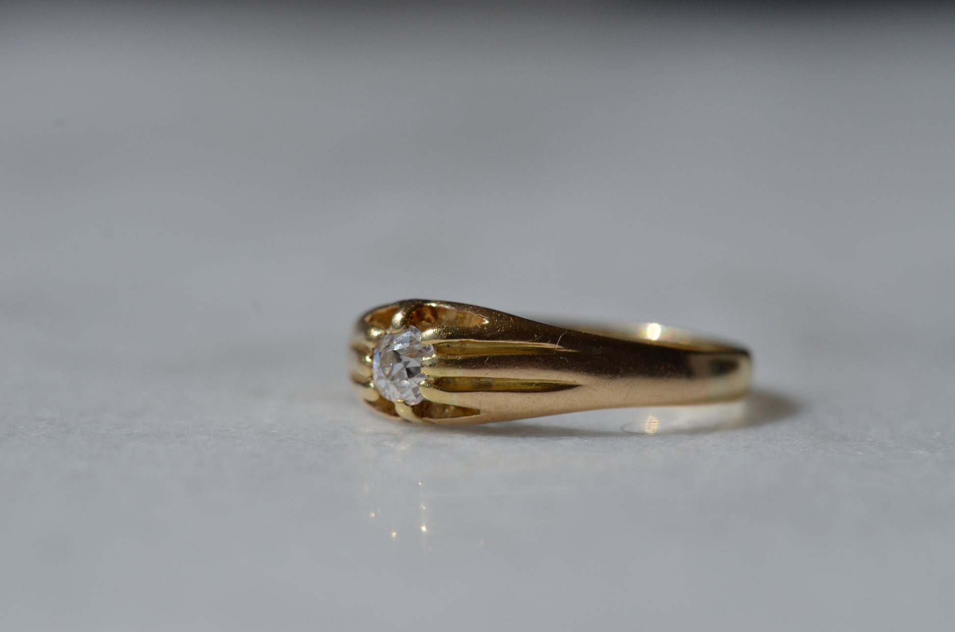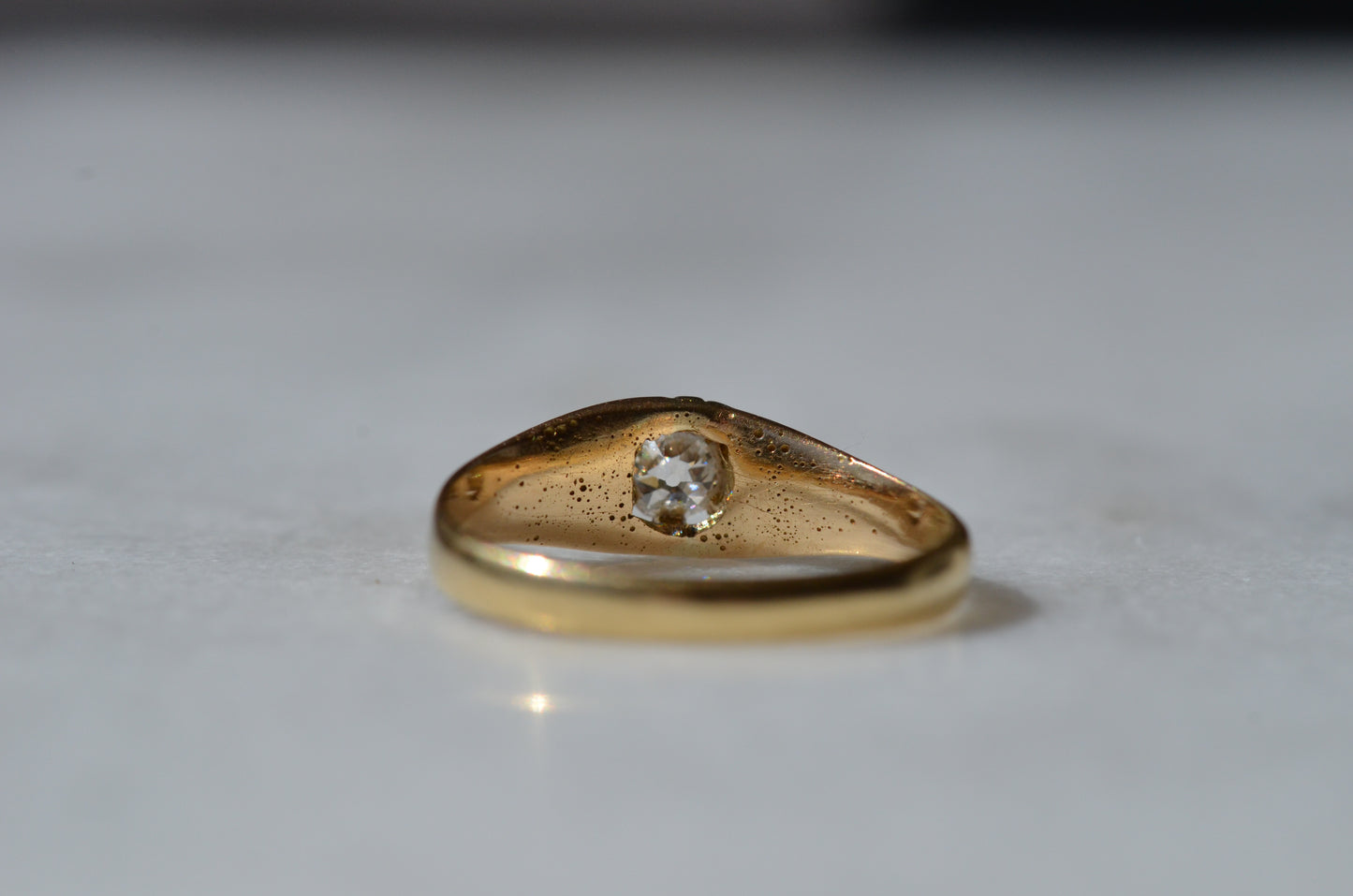 A gorgeous stirrup-style ring that straddles the features of the recent Victorian era (yellow gold, low belcher-like setting) and the coming Art Deco trend toward symmetry and linear designs, this luscious piece is perfect for everyday wear. With a bright quarter-carat diamond and a broad gold band, this could serve double duty as an engagement ring and wedding band in one, pair with a band, or make a great stacking ring or stand-alone piece. Low profile and ultra comfortable, this ring is an absolute dream.