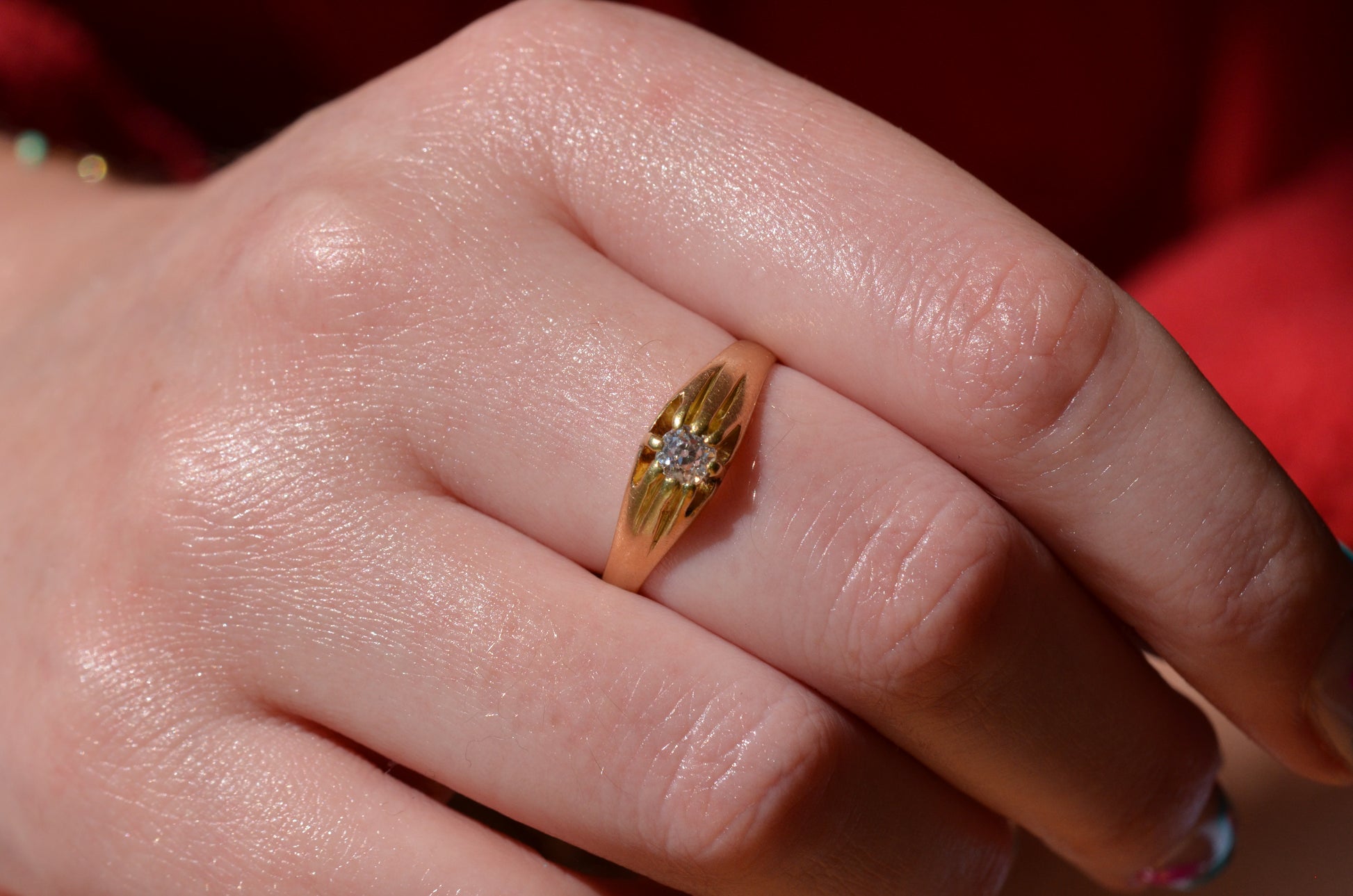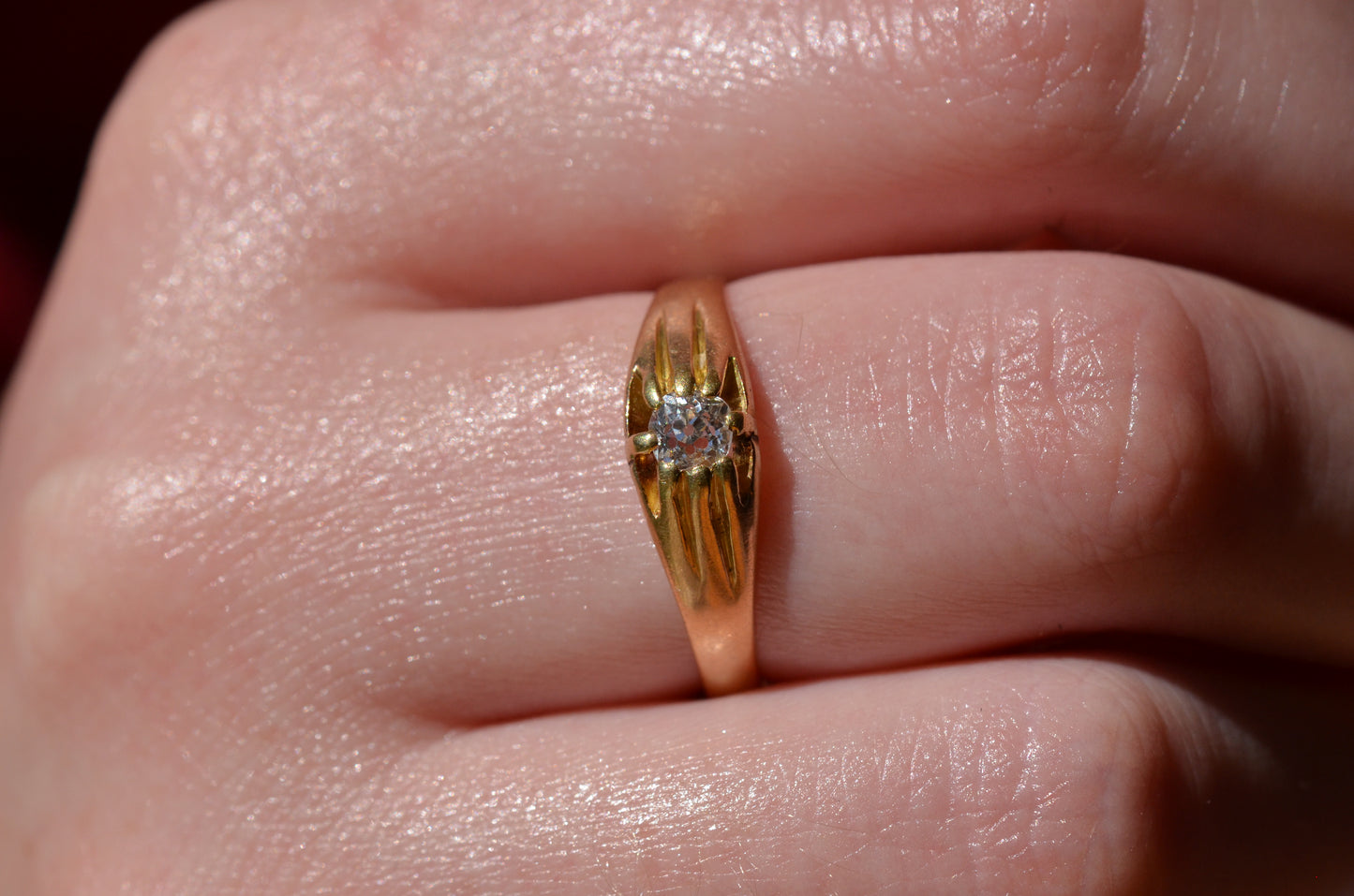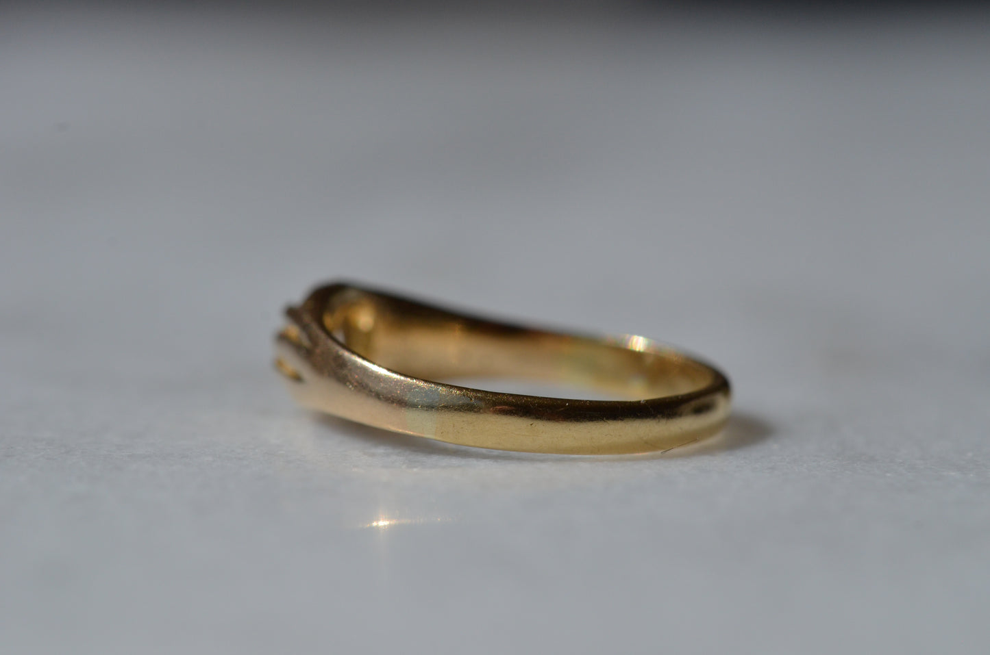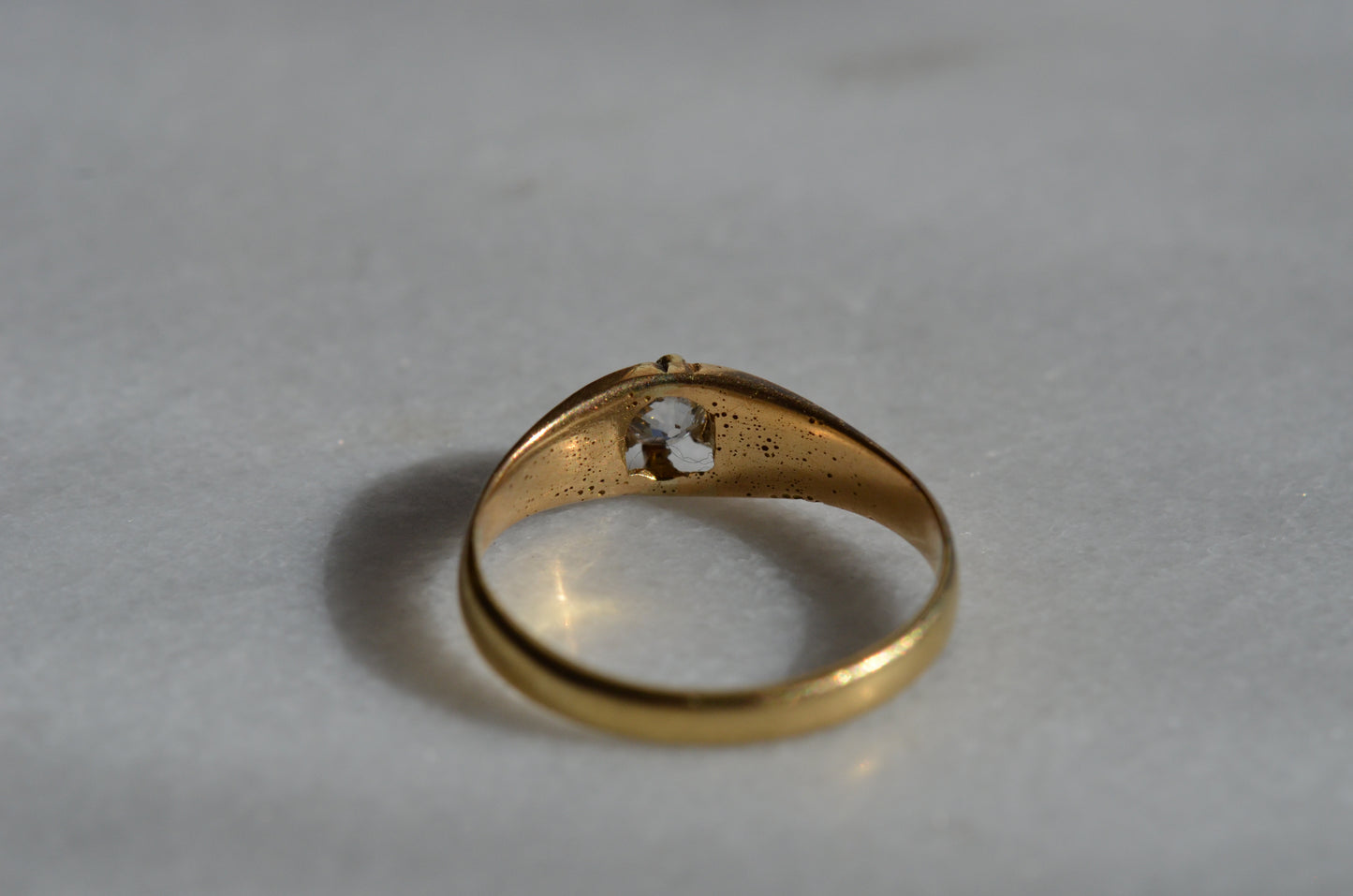 A gorgeous stirrup-style ring that straddles the features of the recent Victorian era (yellow gold, low belcher-like setting) and the coming Art Deco trend toward symmetry and linear designs, this luscious piece is perfect for everyday wear. With a bright quarter-carat diamond and a broad gold band, this could serve double duty as an engagement ring and wedding band in one, pair with a band, or make a great stacking ring or stand-alone piece. Low profile and ultra comfortable, this ring is an absolute dream.