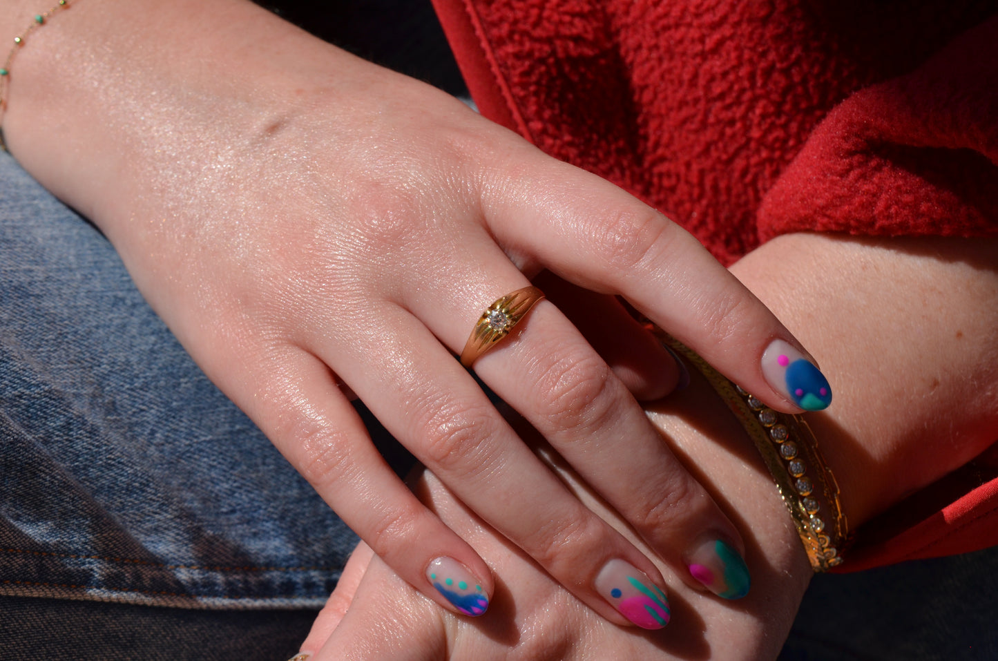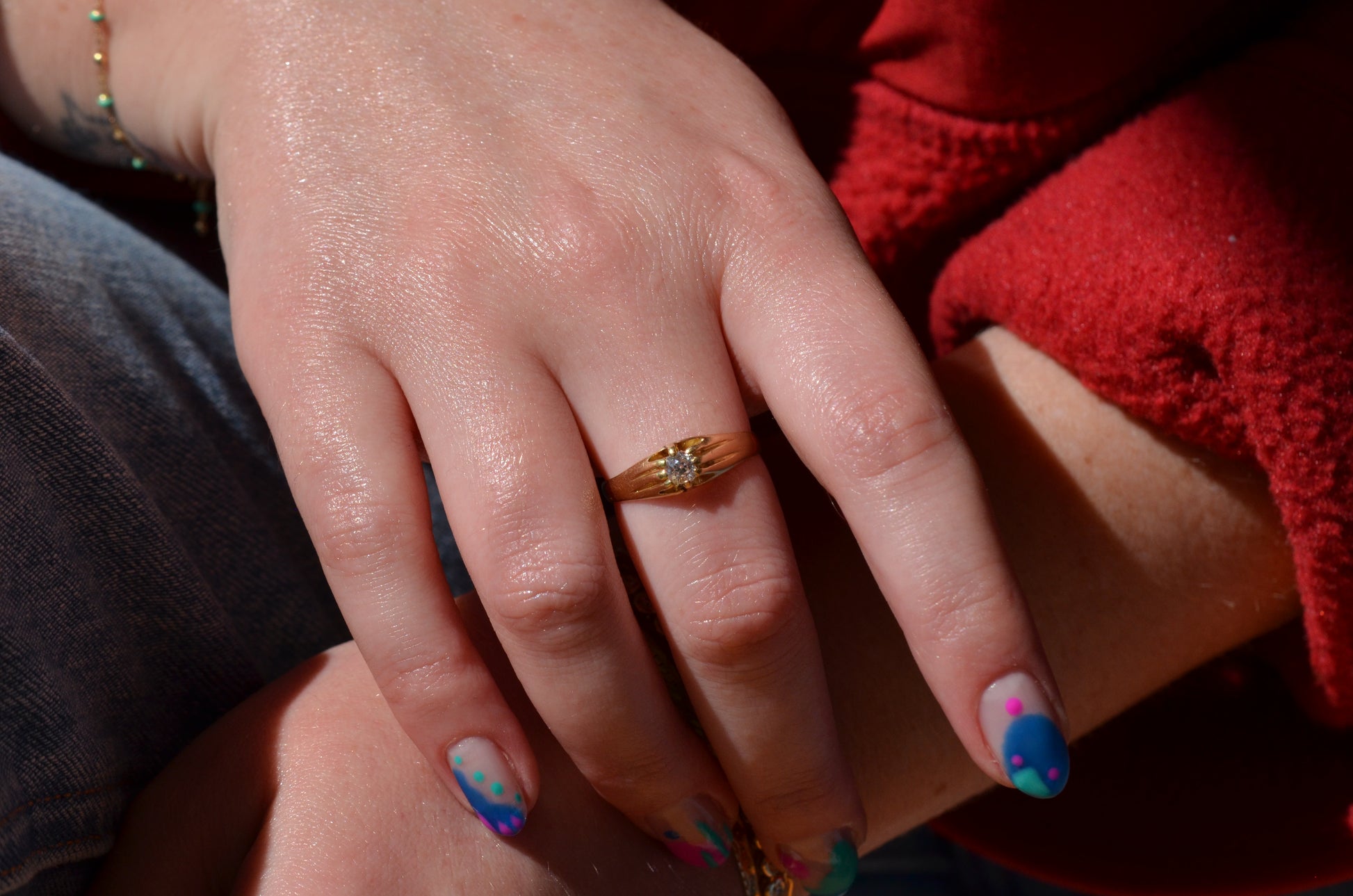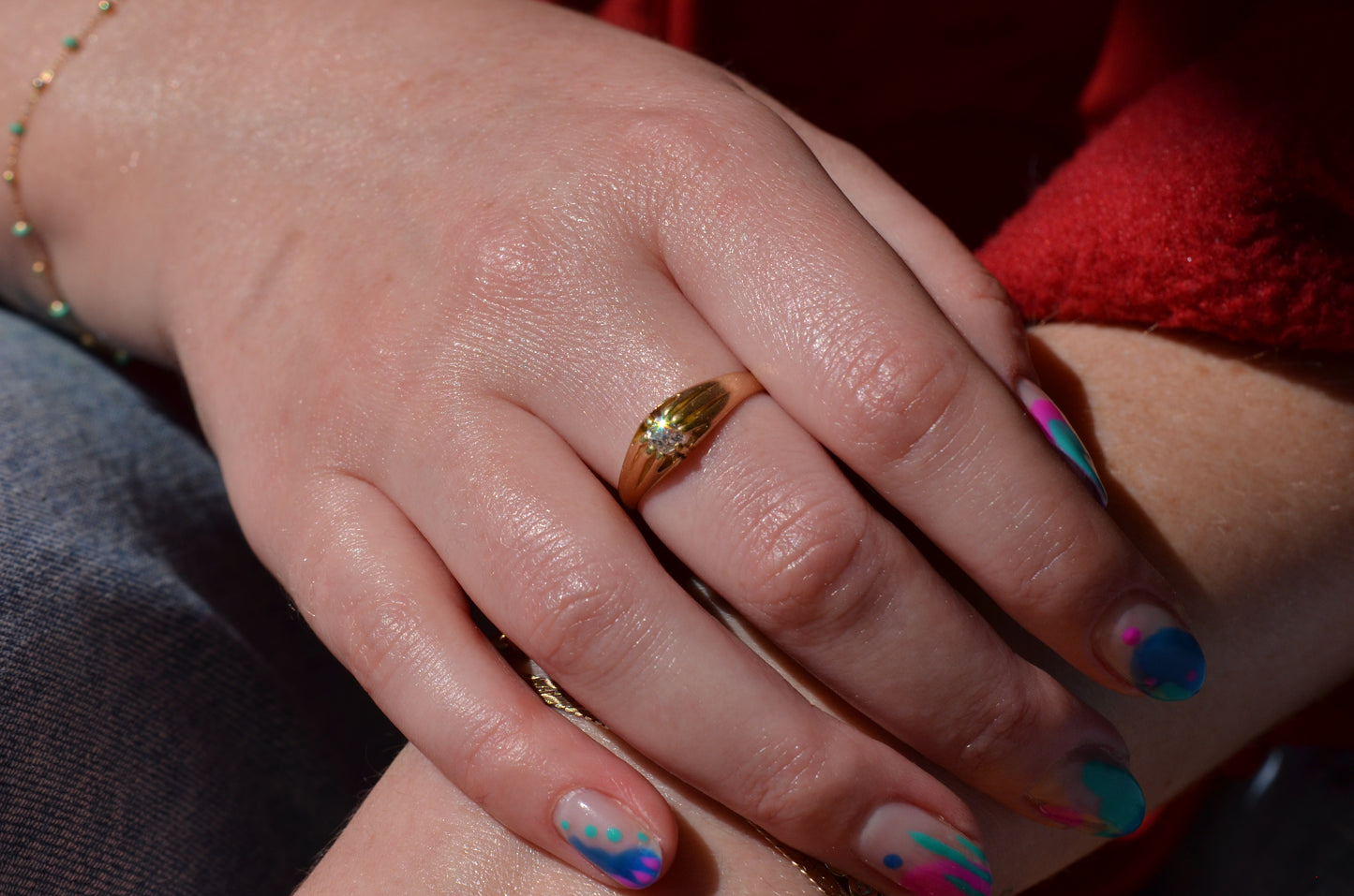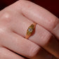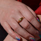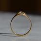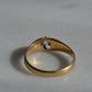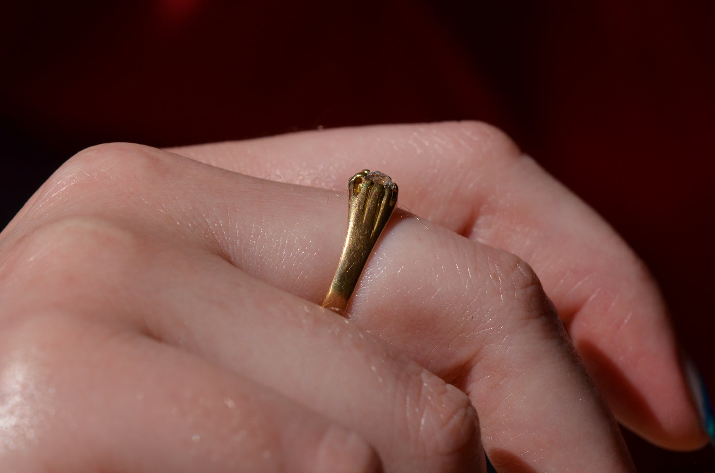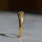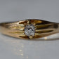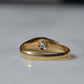 A gorgeous stirrup-style ring that straddles the features of the recent Victorian era (yellow gold, low belcher-like setting) and the coming Art Deco trend toward symmetry and linear designs, this luscious piece is perfect for everyday wear. With a bright quarter-carat diamond and a broad gold band, this could serve double duty as an engagement ring and wedding band in one, pair with a band, or make a great stacking ring or stand-alone piece. Low profile and ultra comfortable, this ring is an absolute dream.