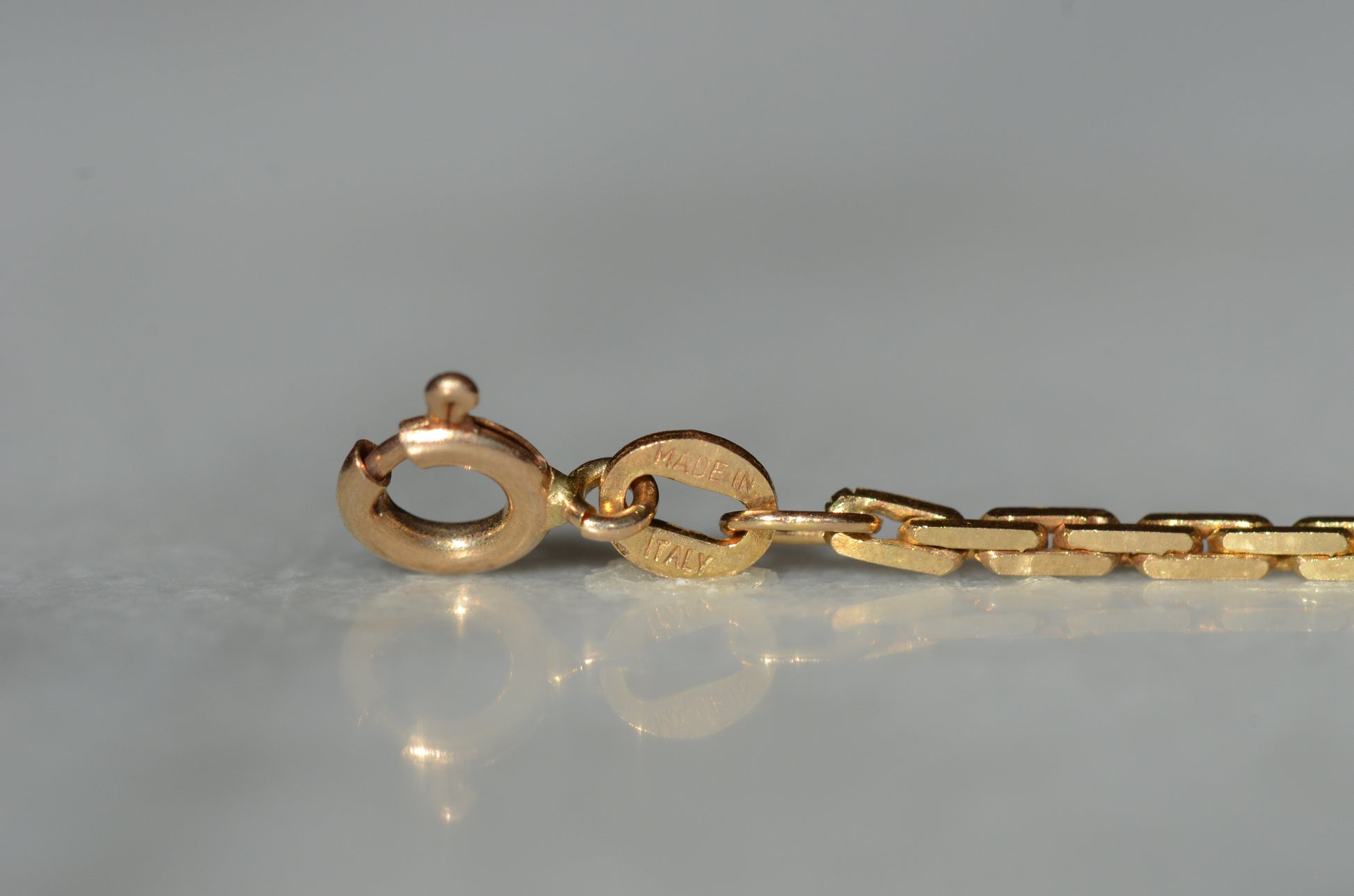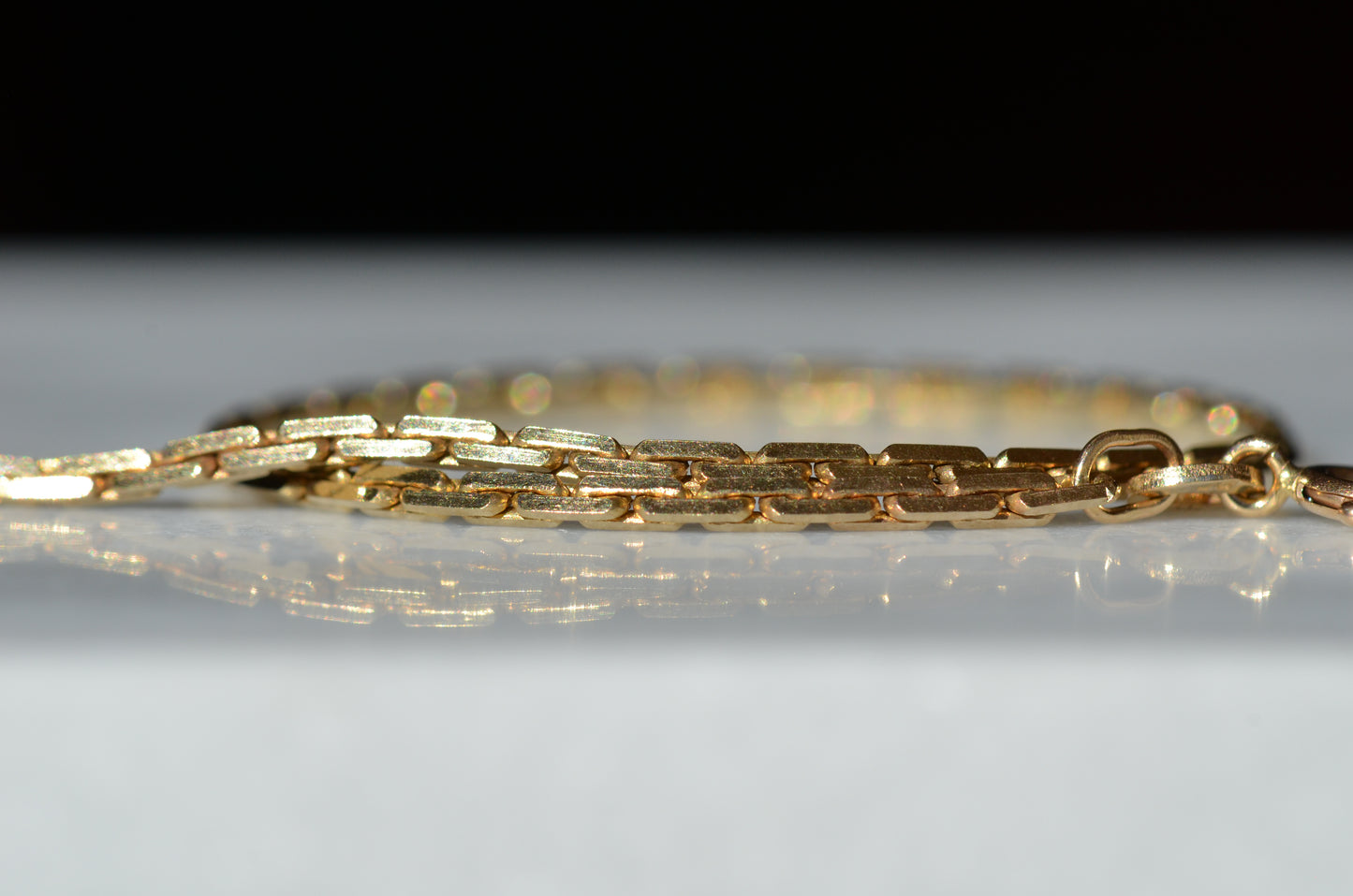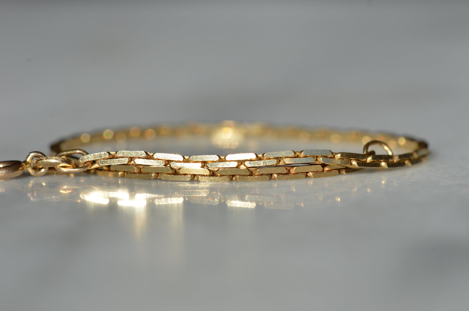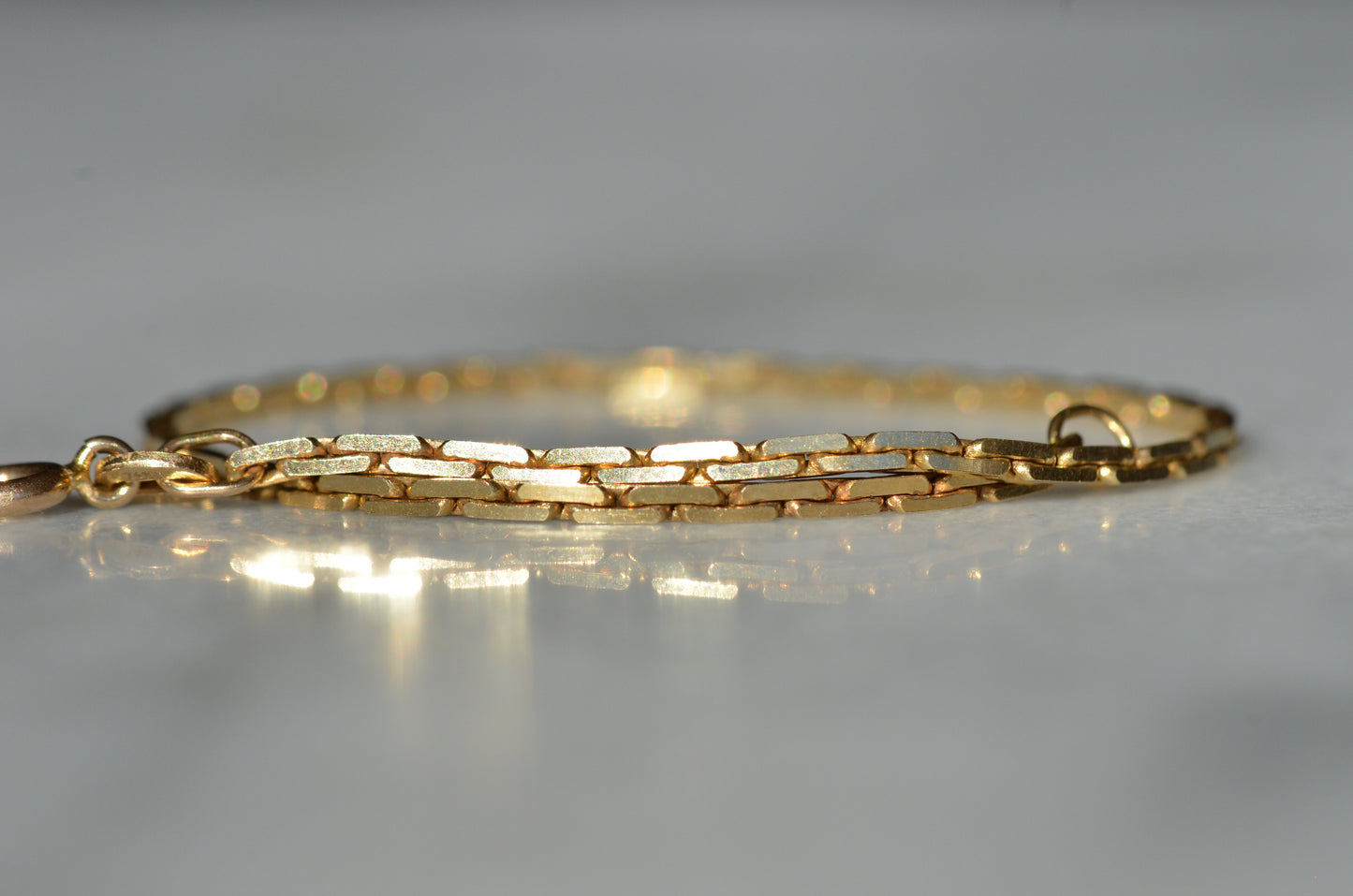 Slim and elegant, this deadstock (term for pieces that are not newly made but were never owned by a customer) bracelet looks like a narrow brick road of gold with alternating rectangular links of gold. Easily added to your everyday rotation, you'll love how this piece catches the light.