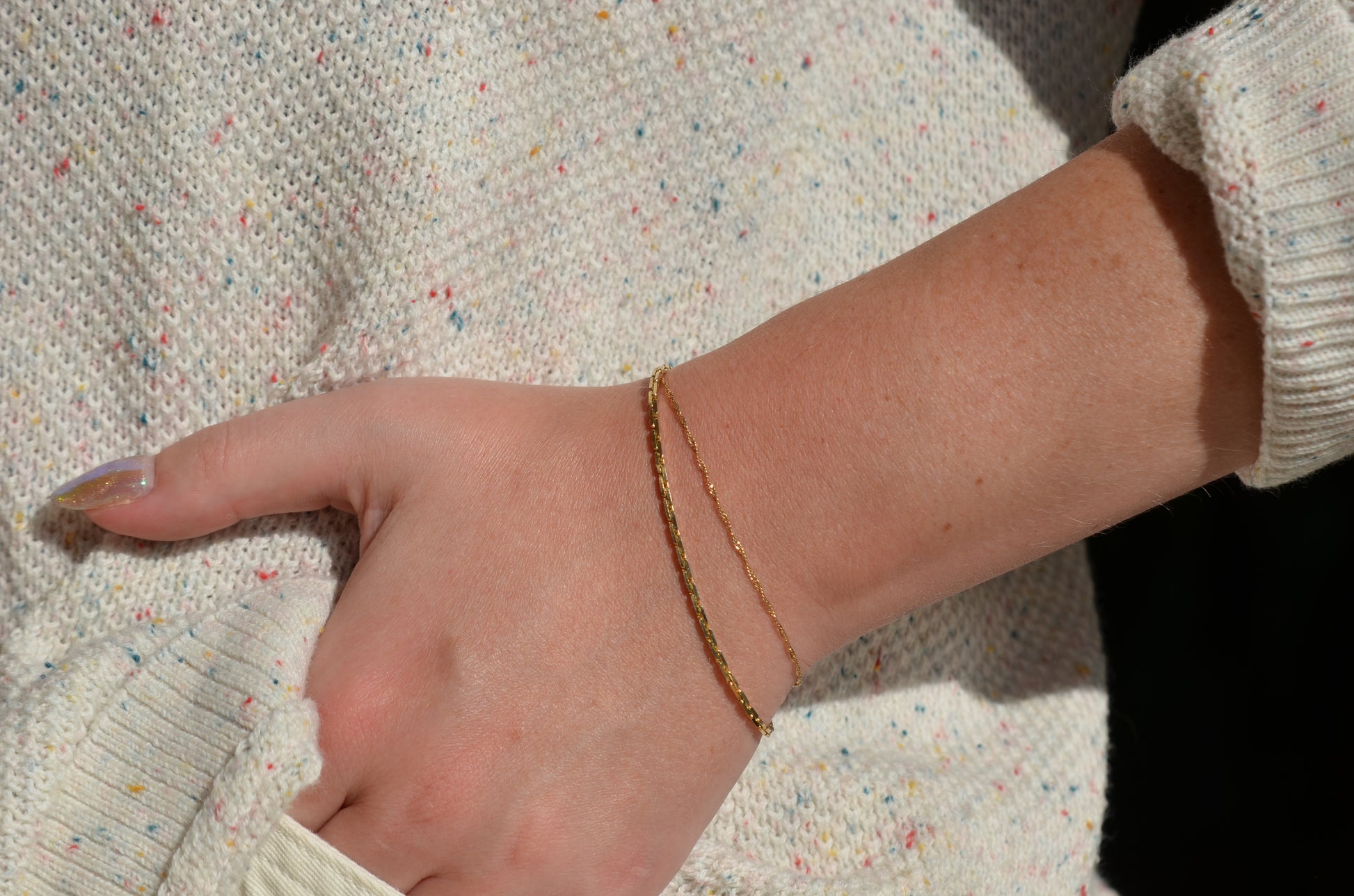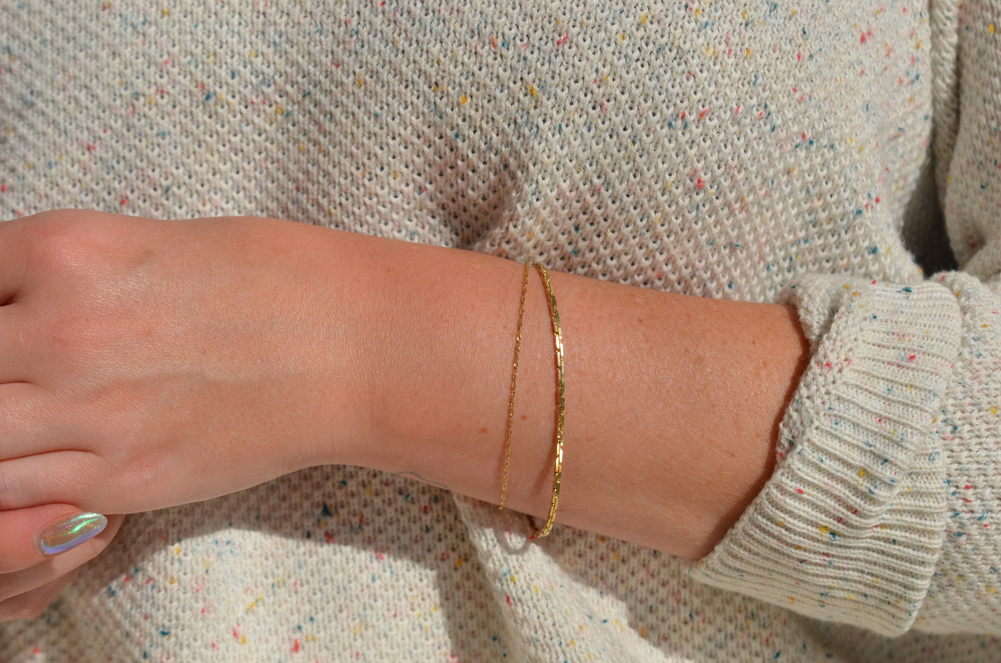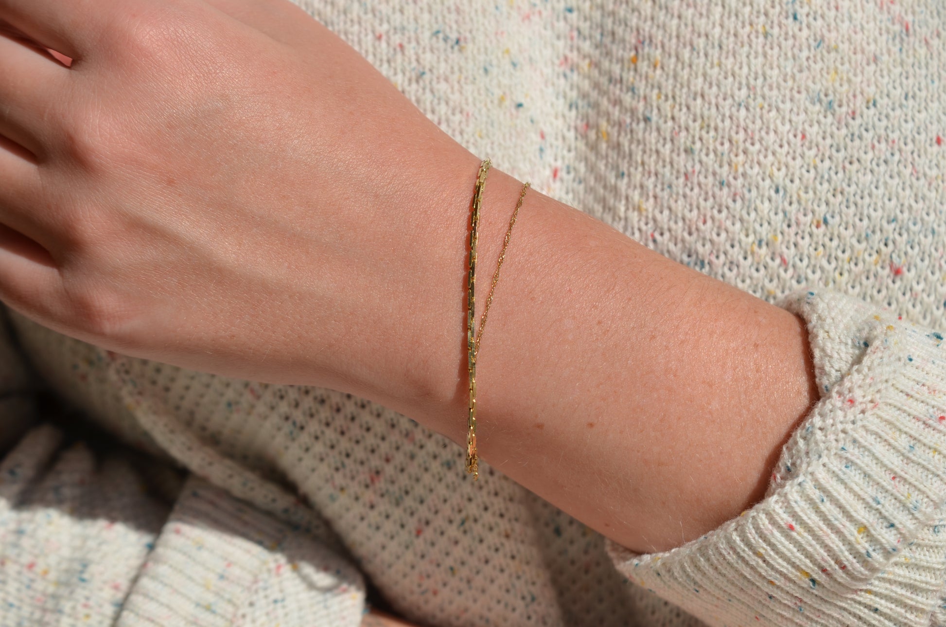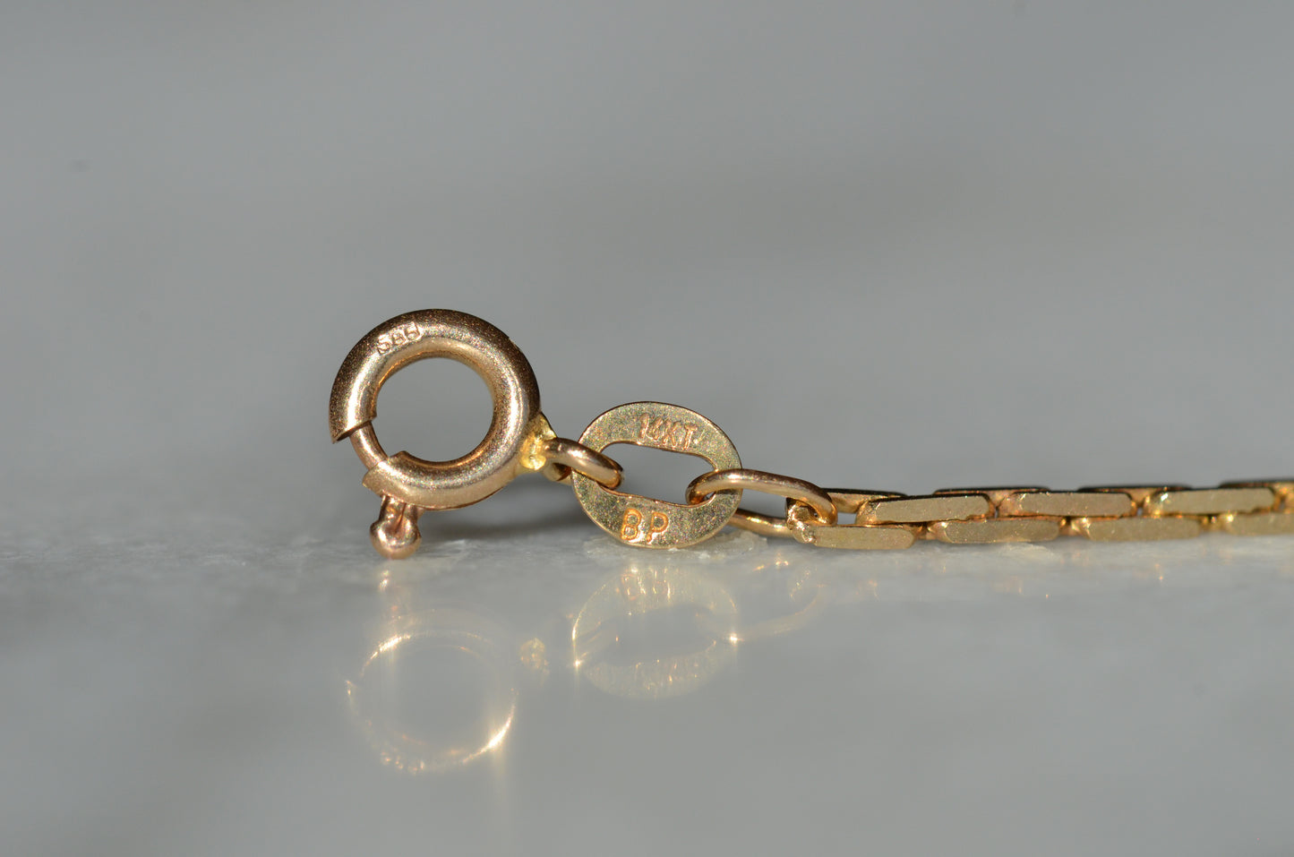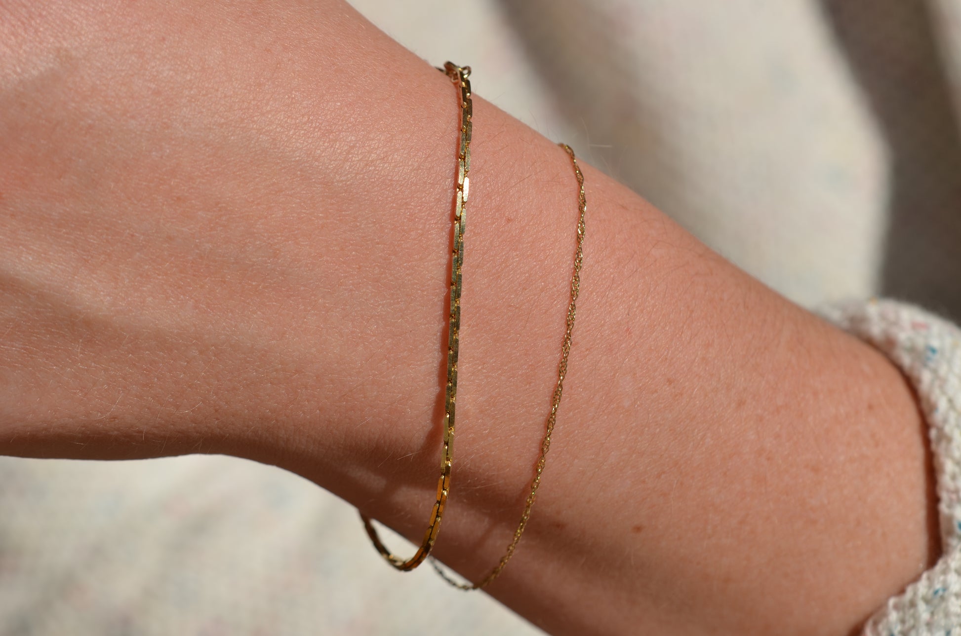 Slim and elegant, this deadstock (term for pieces that are not newly made but were never owned by a customer) bracelet looks like a narrow brick road of gold with alternating rectangular links of gold. Easily added to your everyday rotation, you'll love how this piece catches the light.