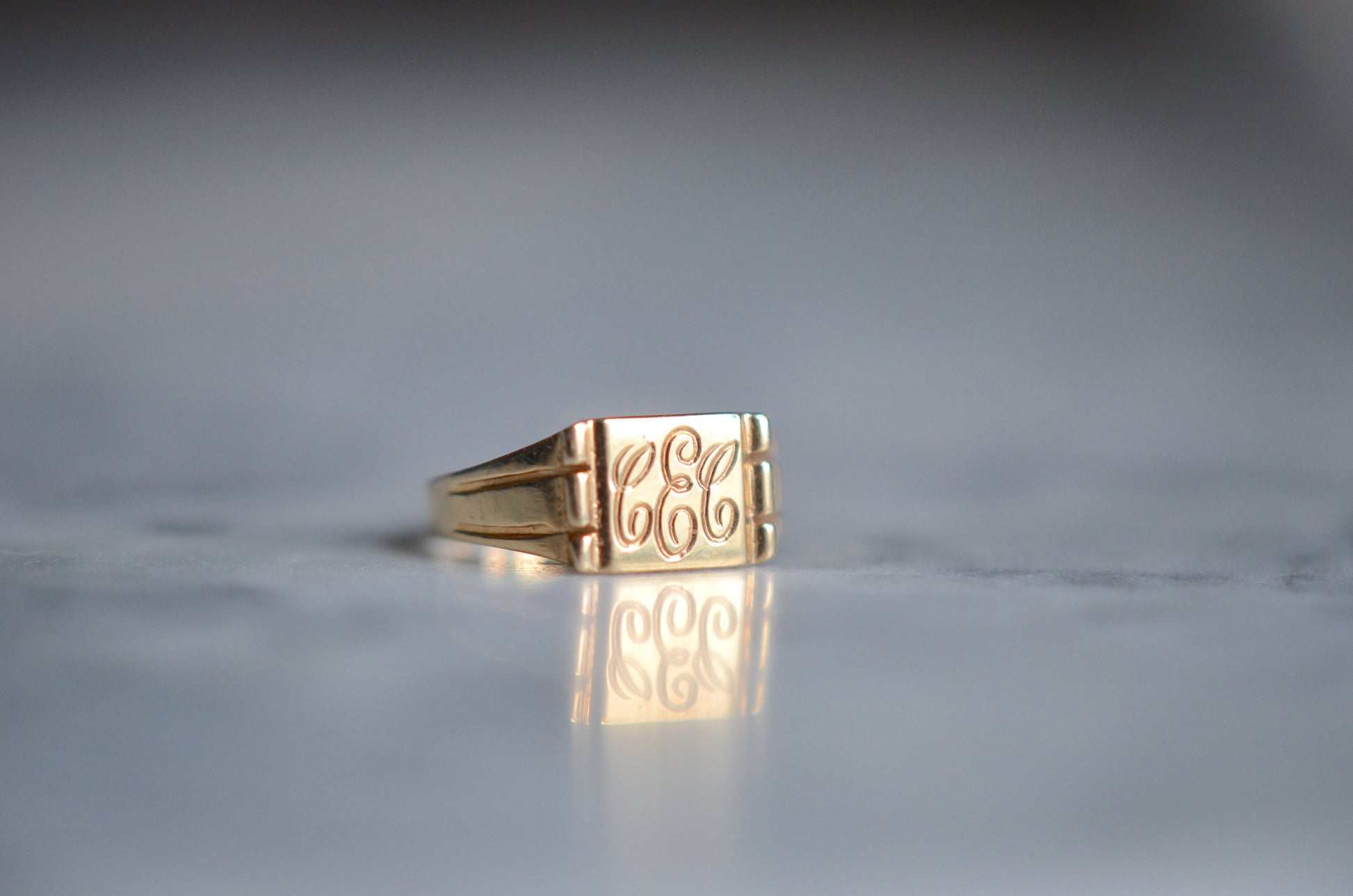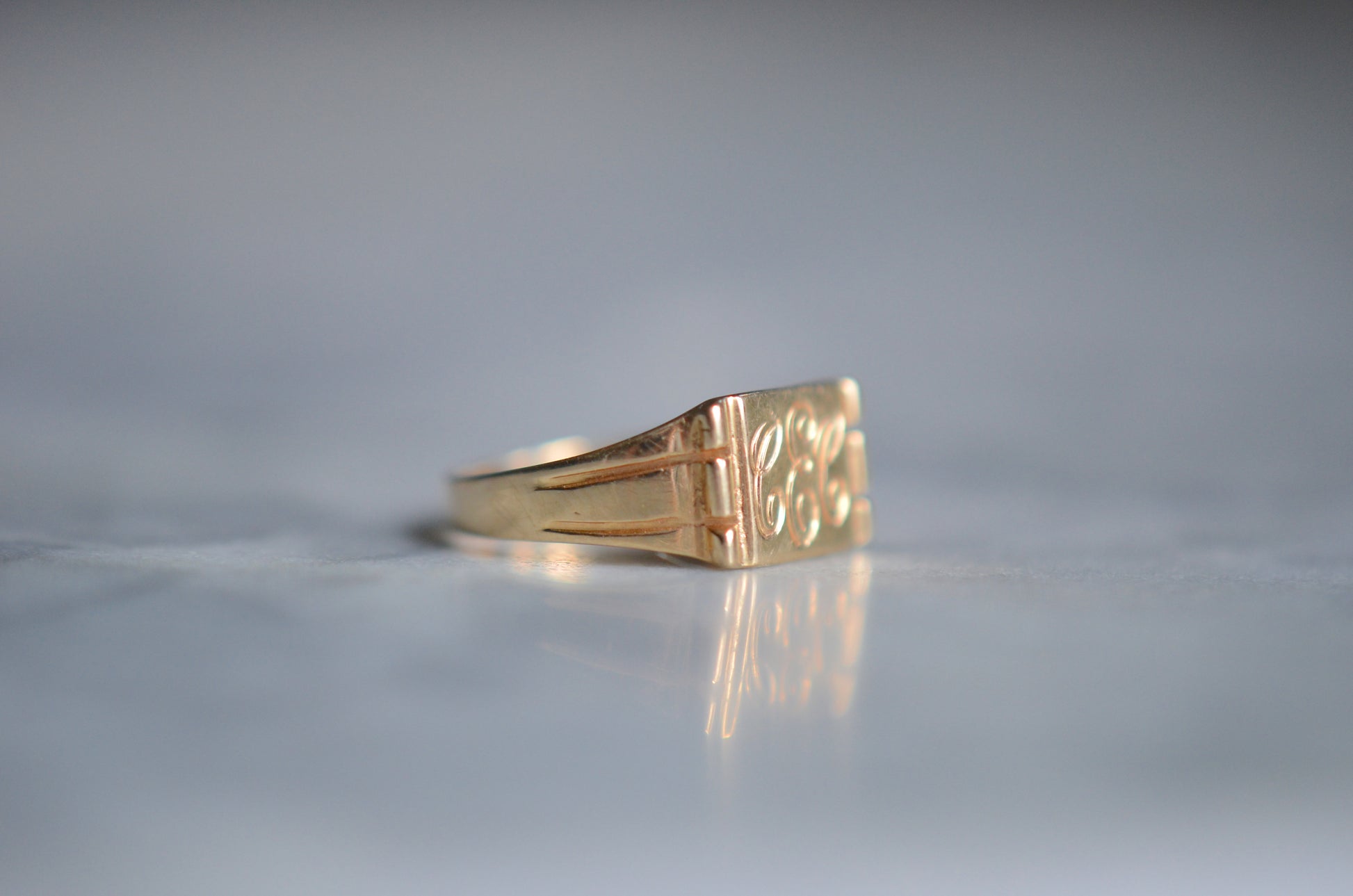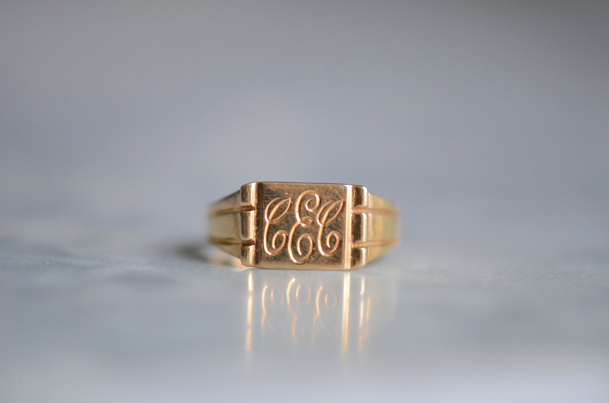 The broad square face tapers into a slim band, which, coupled with low rise and thin feel between the fingers makes for a very comfortable wearing ring. Engraved on the face are the letters E C E, which could be read as a traditional monogram for the initials EEC or interpreted as any other configuration as well - perhaps even as the individual initials of those who are most important to you!