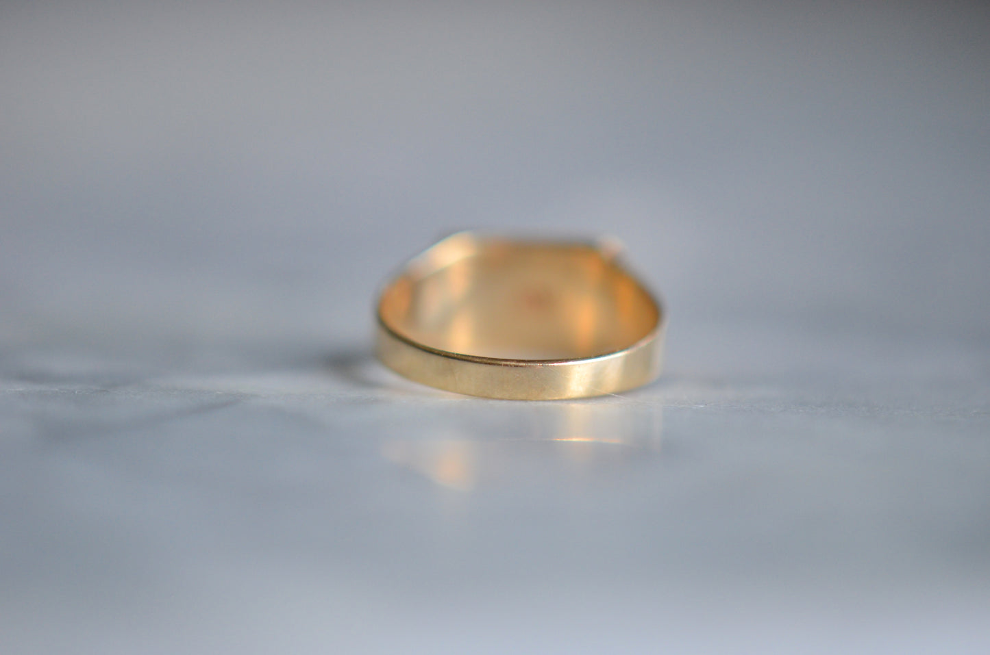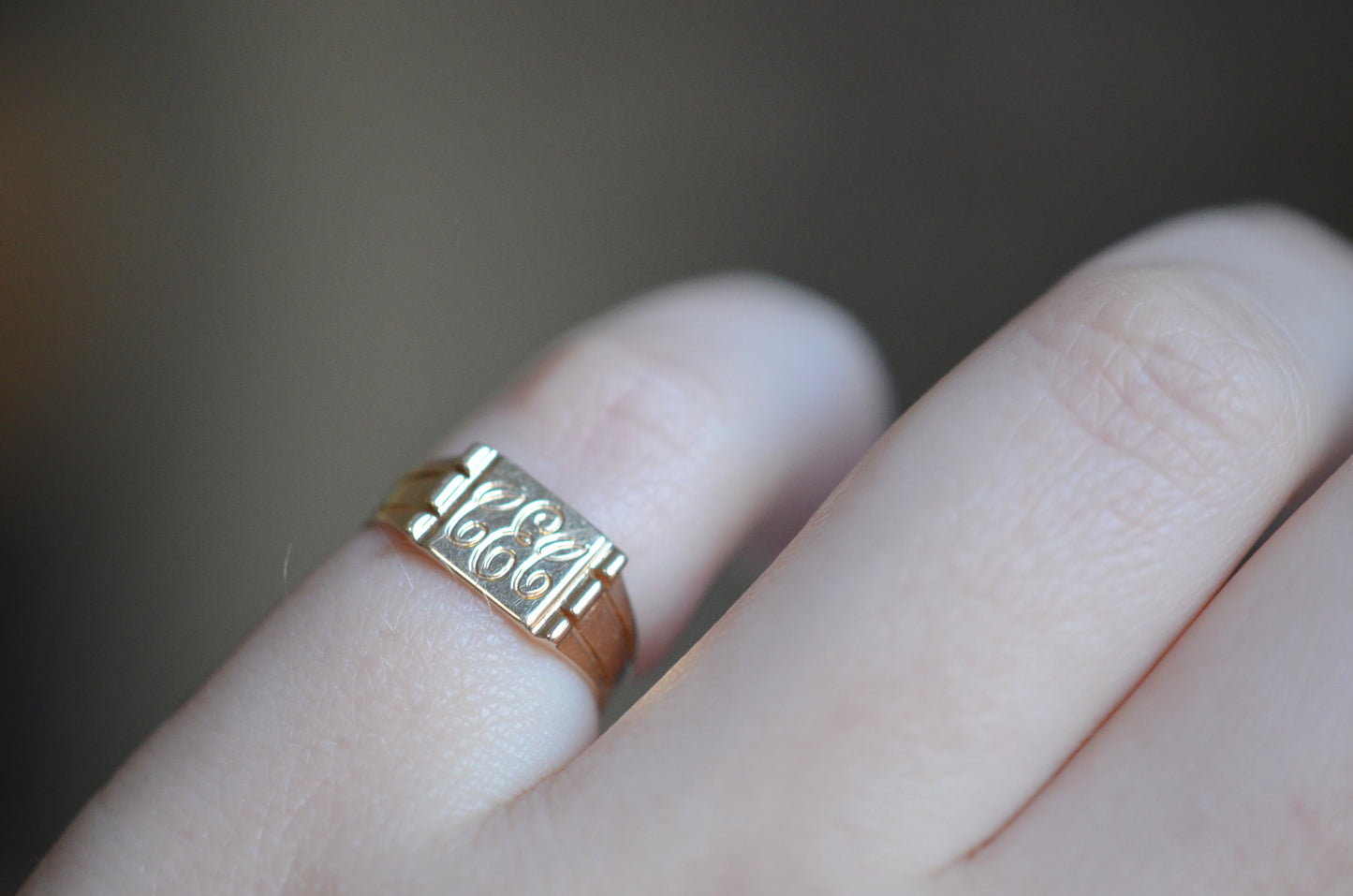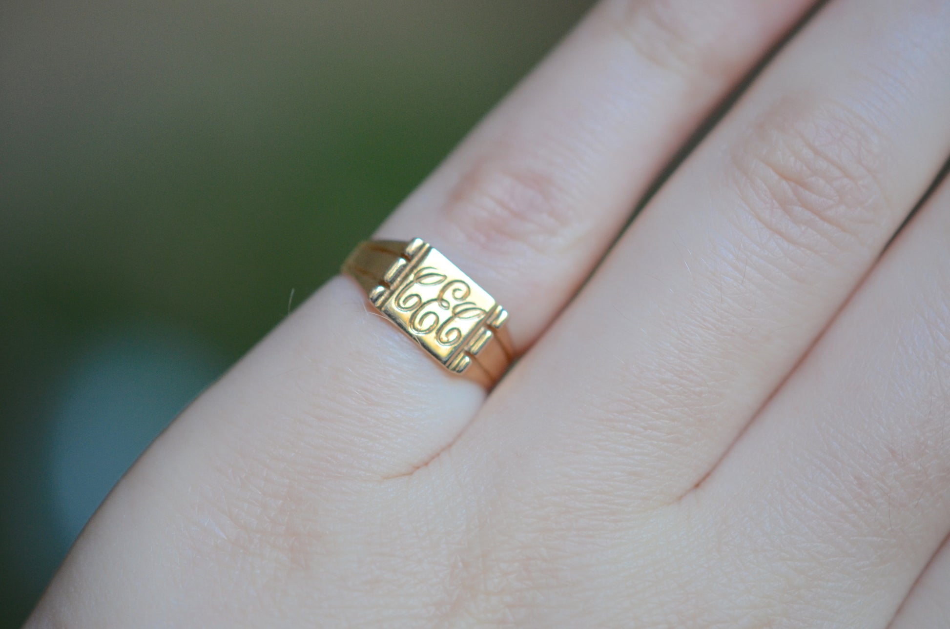 The broad square face tapers into a slim band, which, coupled with low rise and thin feel between the fingers makes for a very comfortable wearing ring. Engraved on the face are the letters E C E, which could be read as a traditional monogram for the initials EEC or interpreted as any other configuration as well - perhaps even as the individual initials of those who are most important to you!