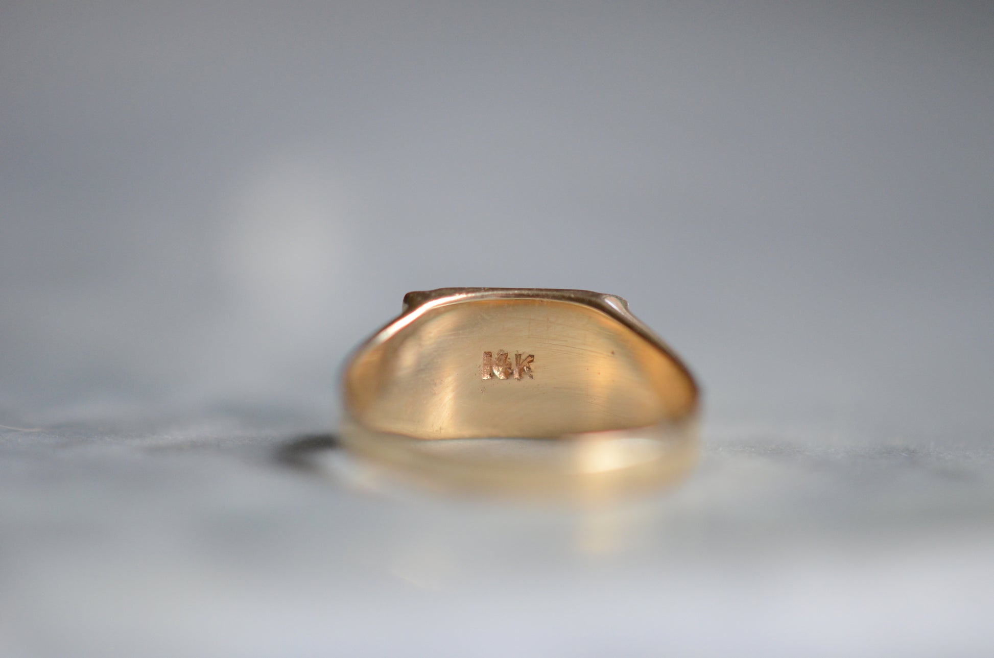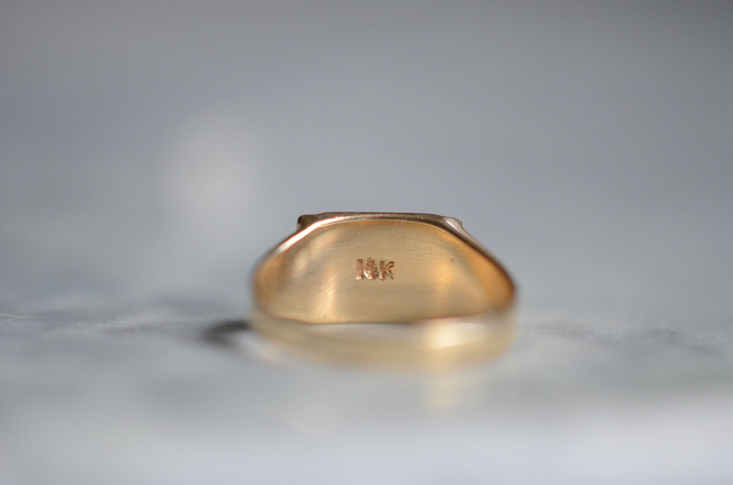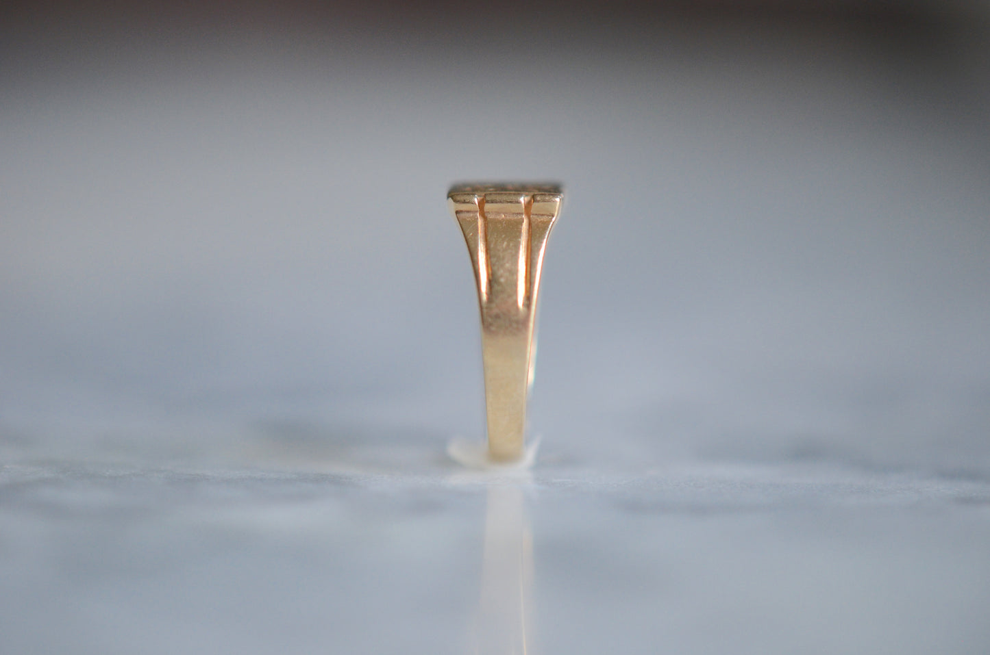 Sleek, smooth, and comfortable, this small signet ring features bold linear details complemented by soft script engraving on the face. Perfect as a baby ring, a pinky ring, a midi ring, or a charm on a chain, this piece strikes a balance between sweet and strong.