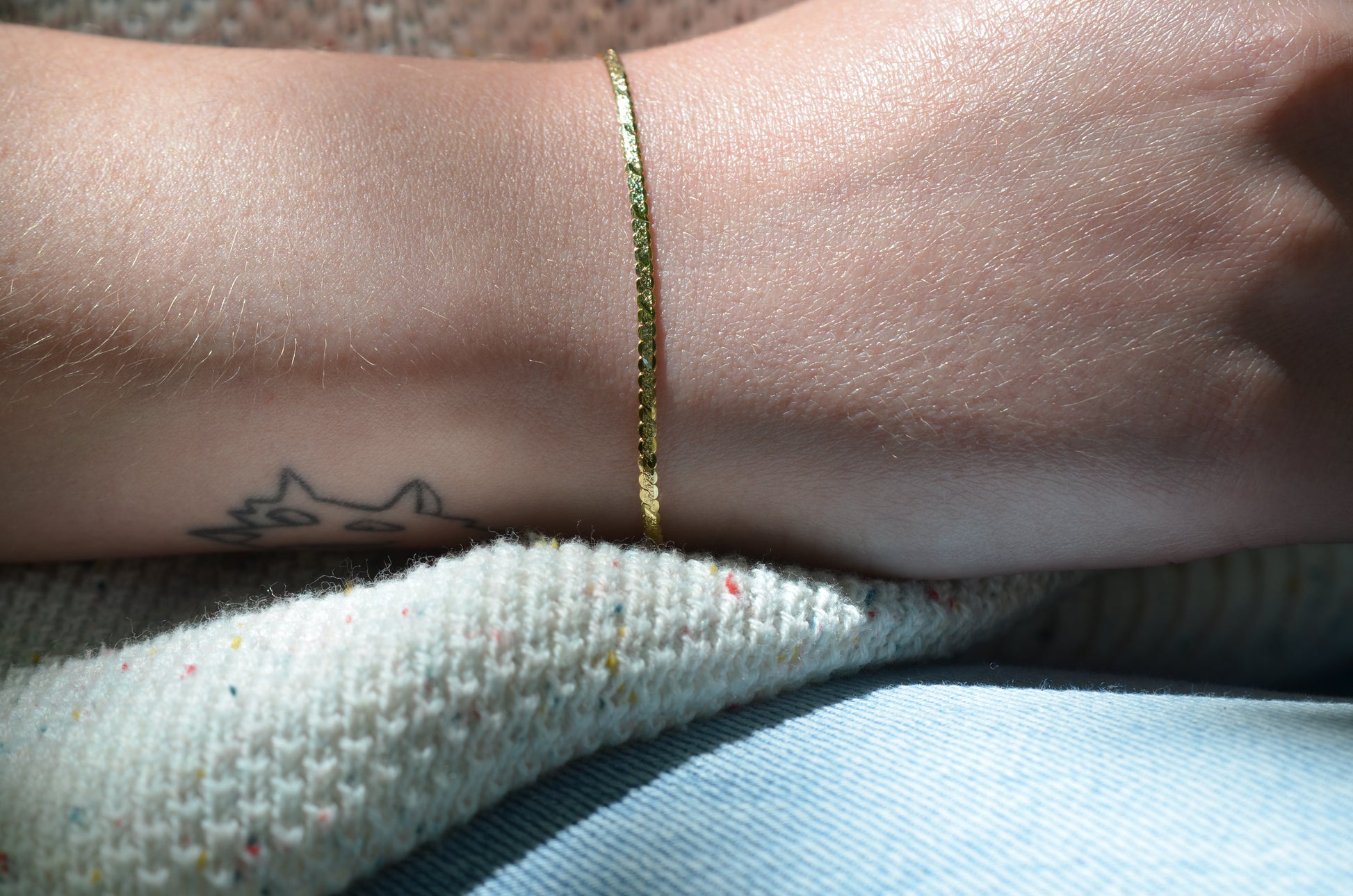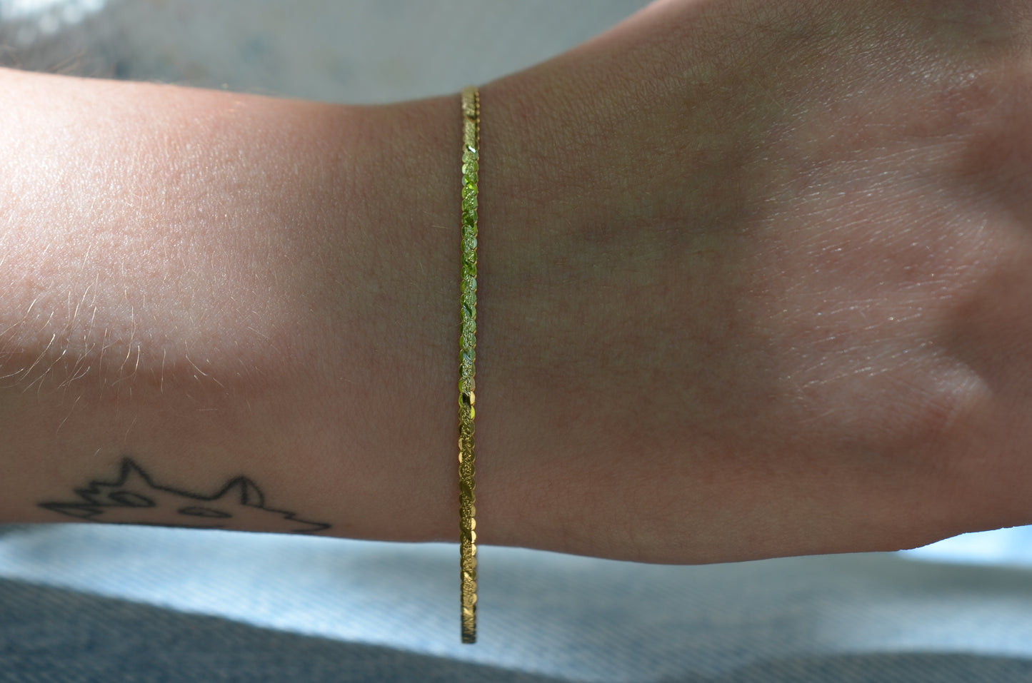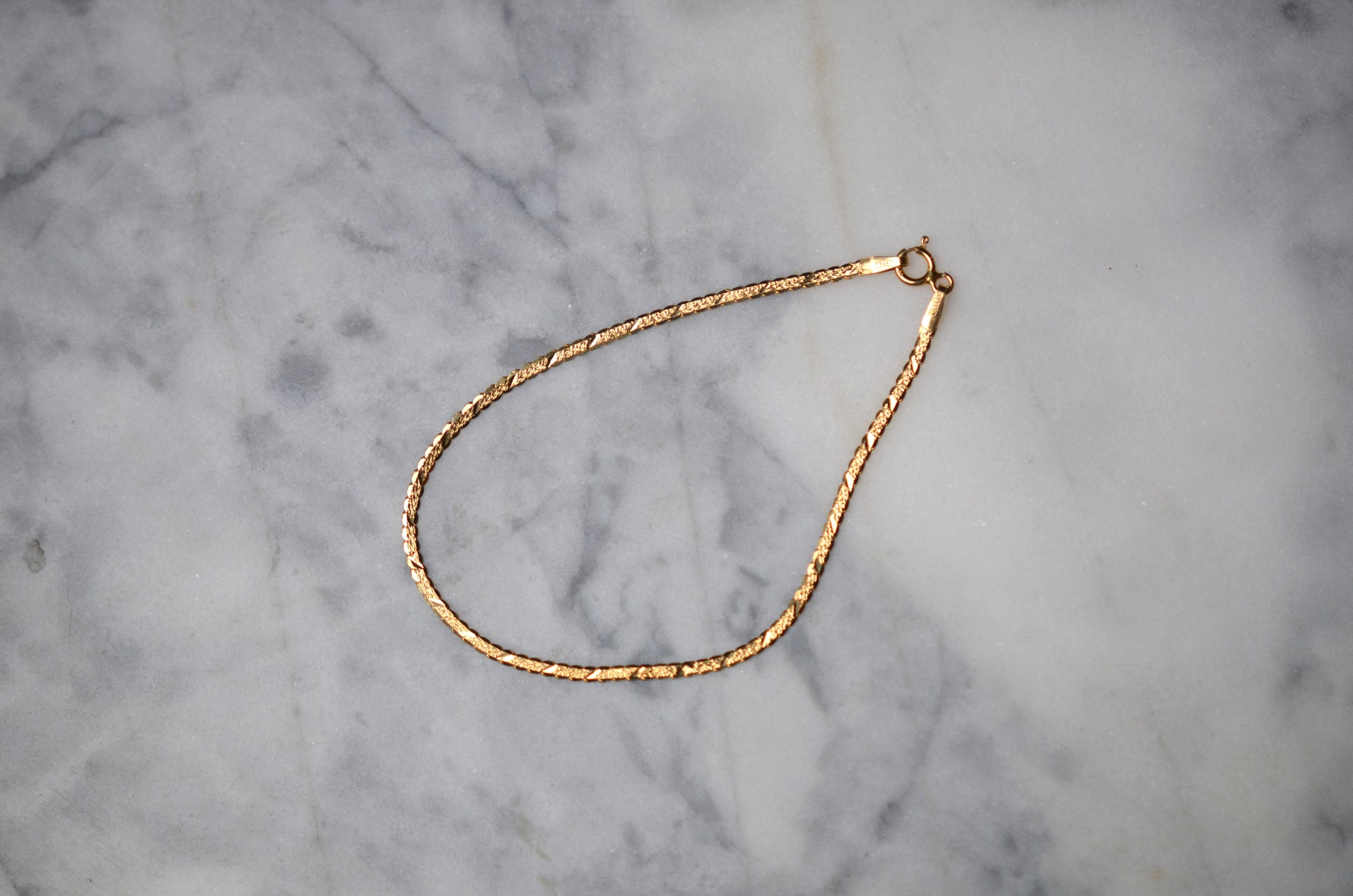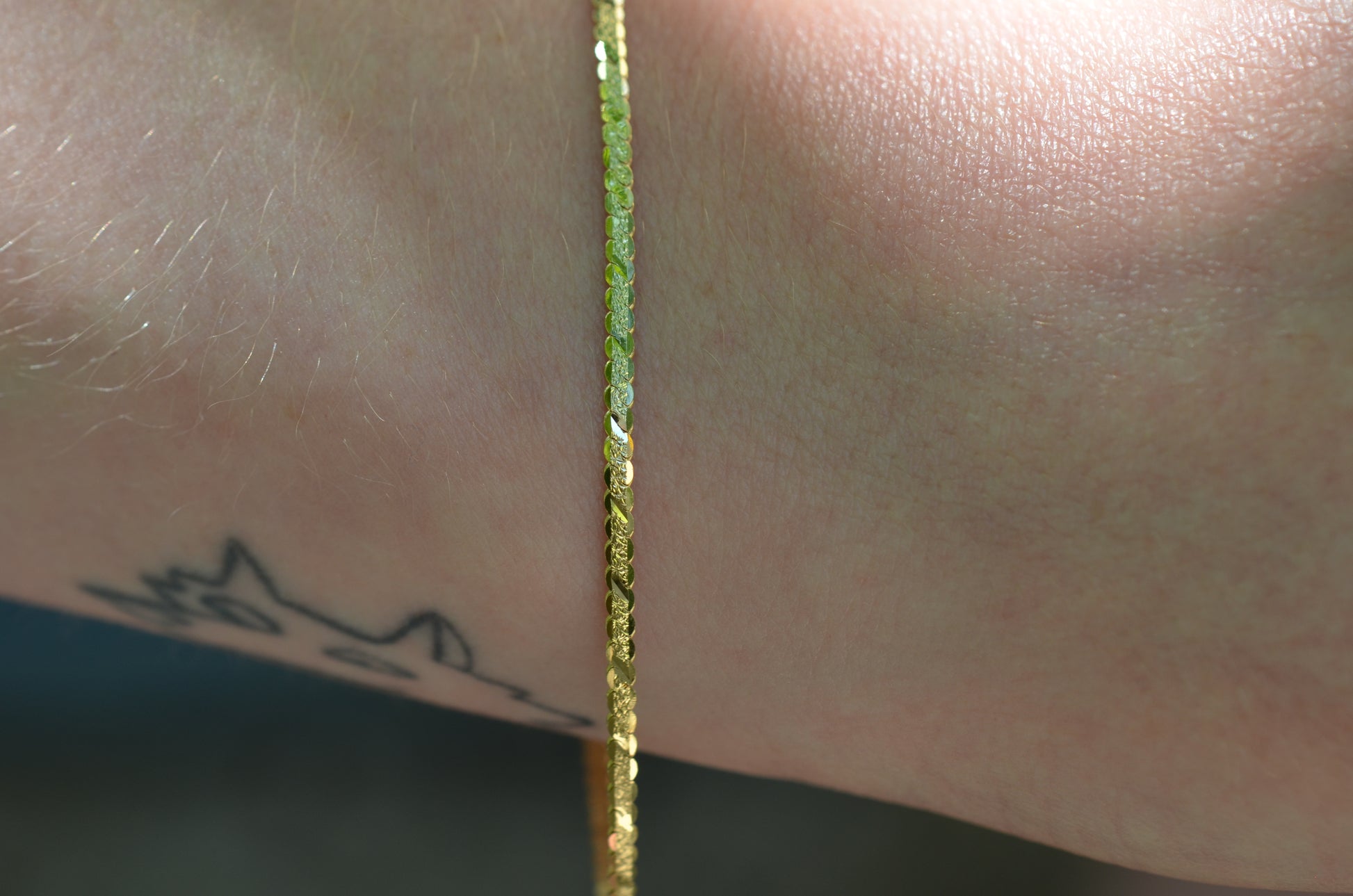 Gorgeous, slinky, and lightweight this bracelet balances smooth edges with bright texture and the most wonderful movement on the wrist. The reticulation-like texture catches and bounces the light in perfect sparkles, upping the ante with any outfit. Keep in mind that s-links, like other flat link chains, can be more prone to kinking, so we don't recommend sleeping and showering and leaving this lovely piece on allll the time. A little bit of extra care goes a long way!