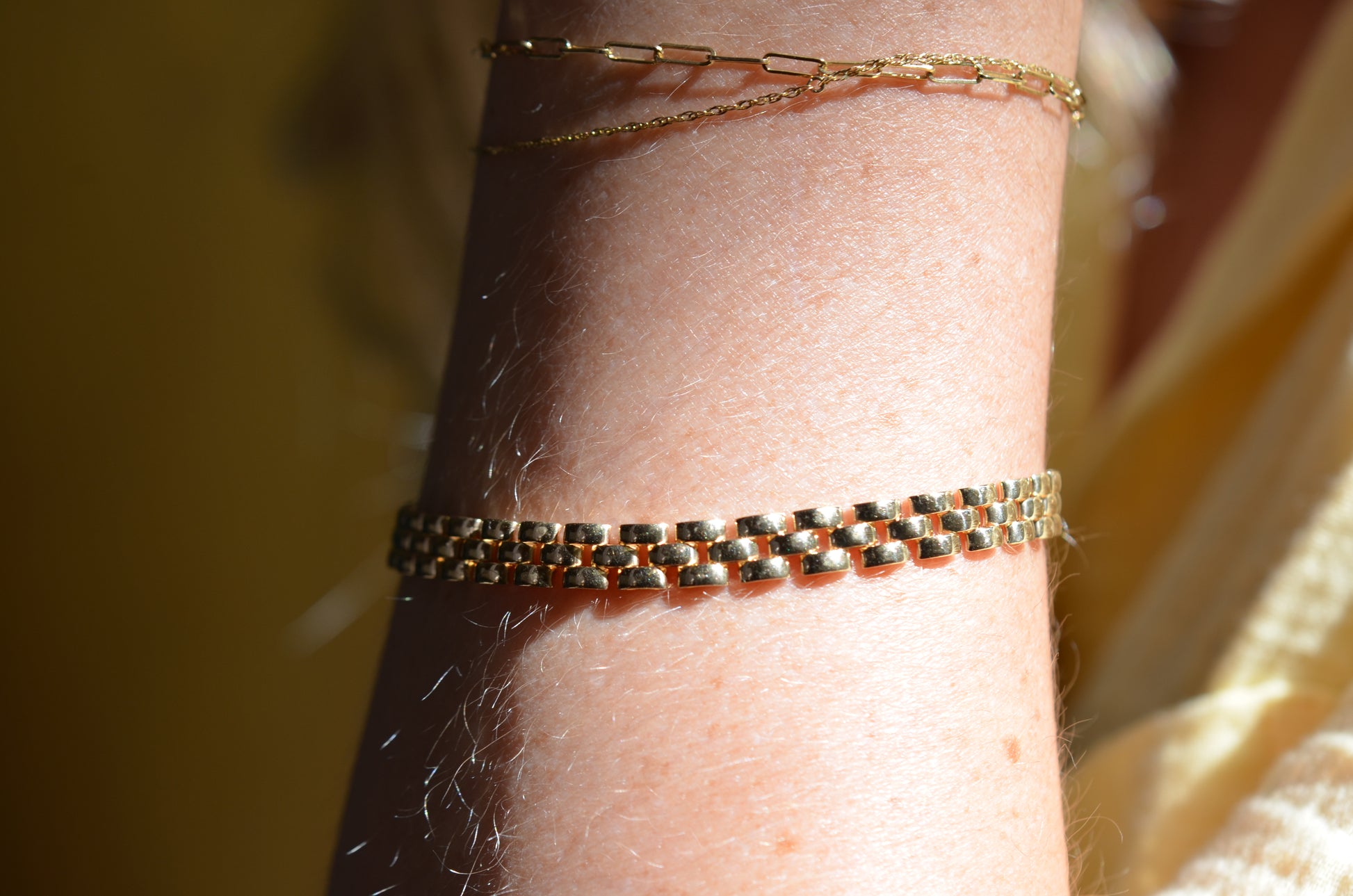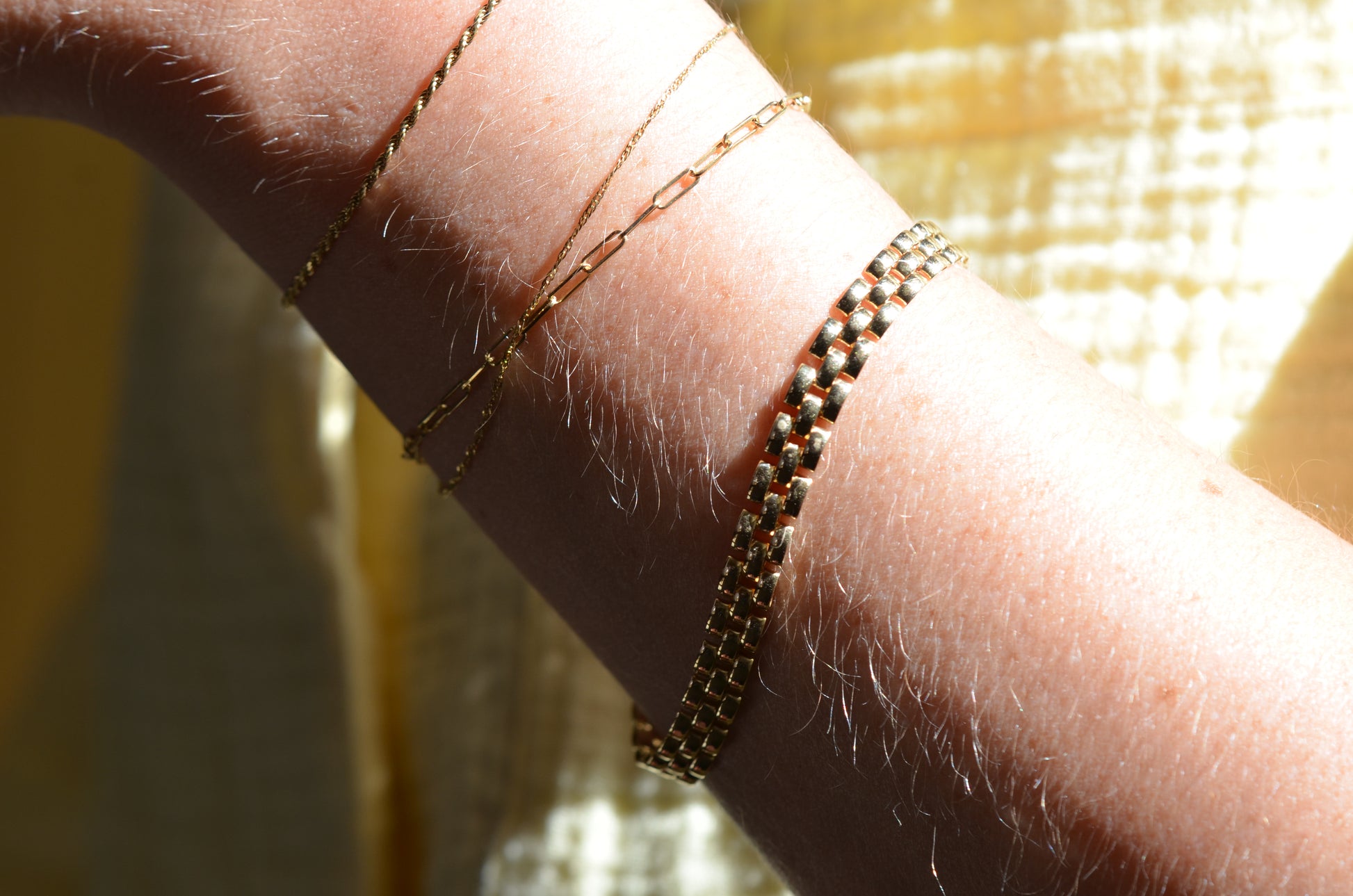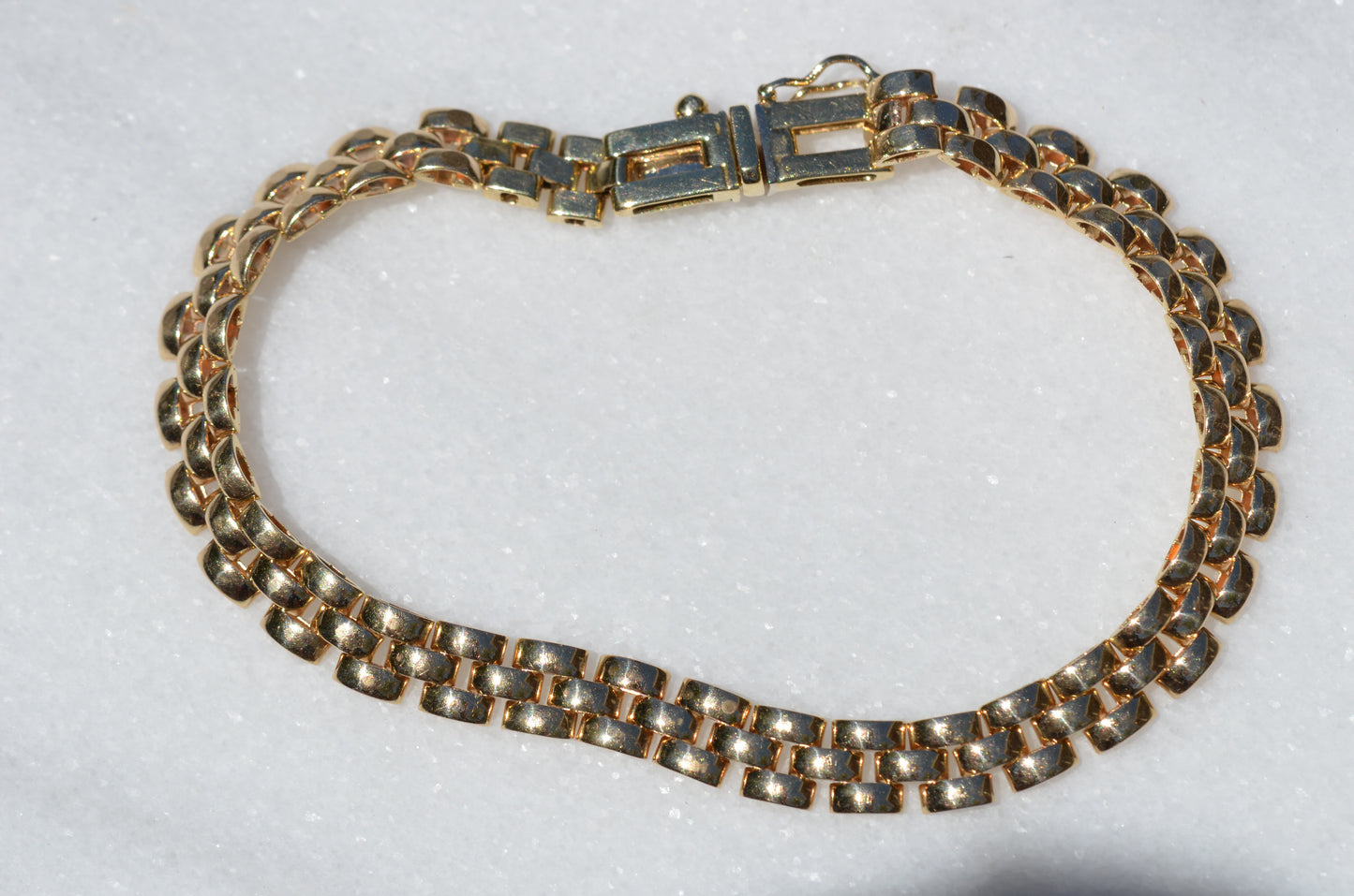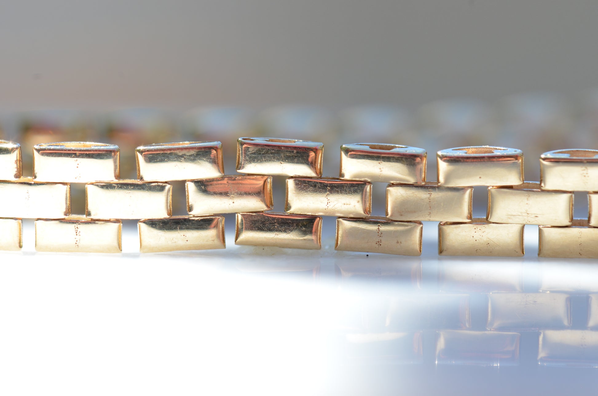 This delicious gold bracelet is the yellow brick road of our dreams. Smooth, hollow curved links with bold volume and a tight weave create that perfect Panthère-inspired effect, with a mirror finish that is near blinding in direct sun. The soft movement of the links makes for a wildly comfortable fit, while over 10 grams of gold mean you'll feel the gentle weight enough to know it's there.