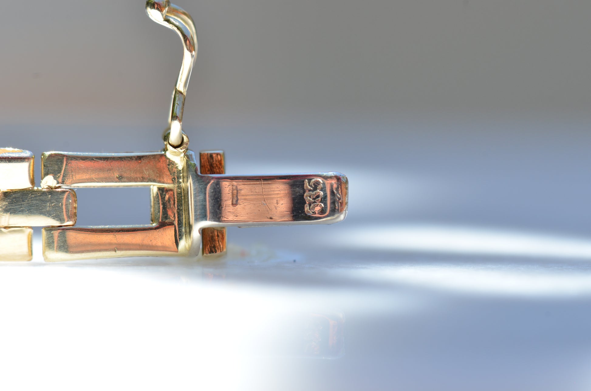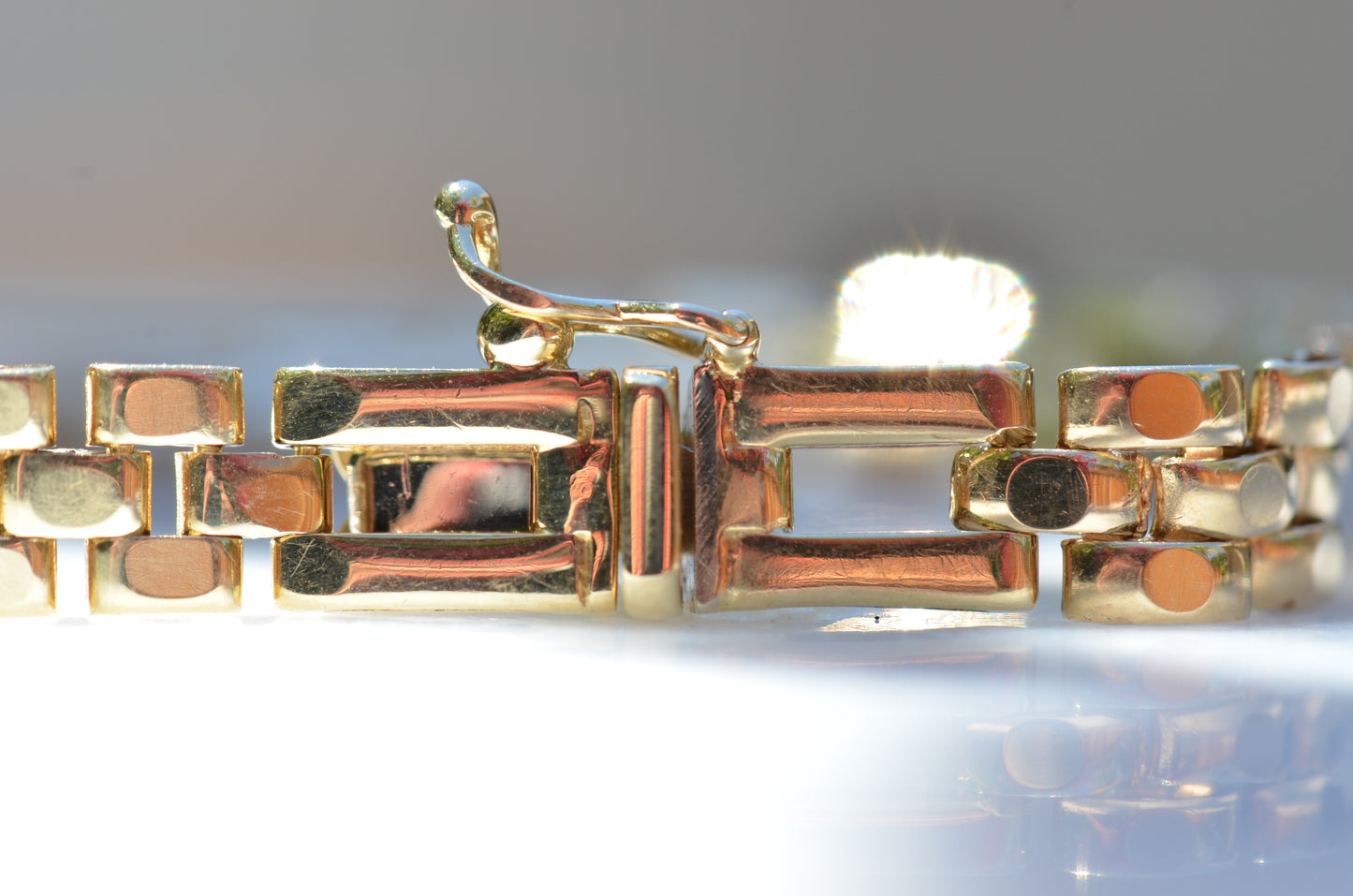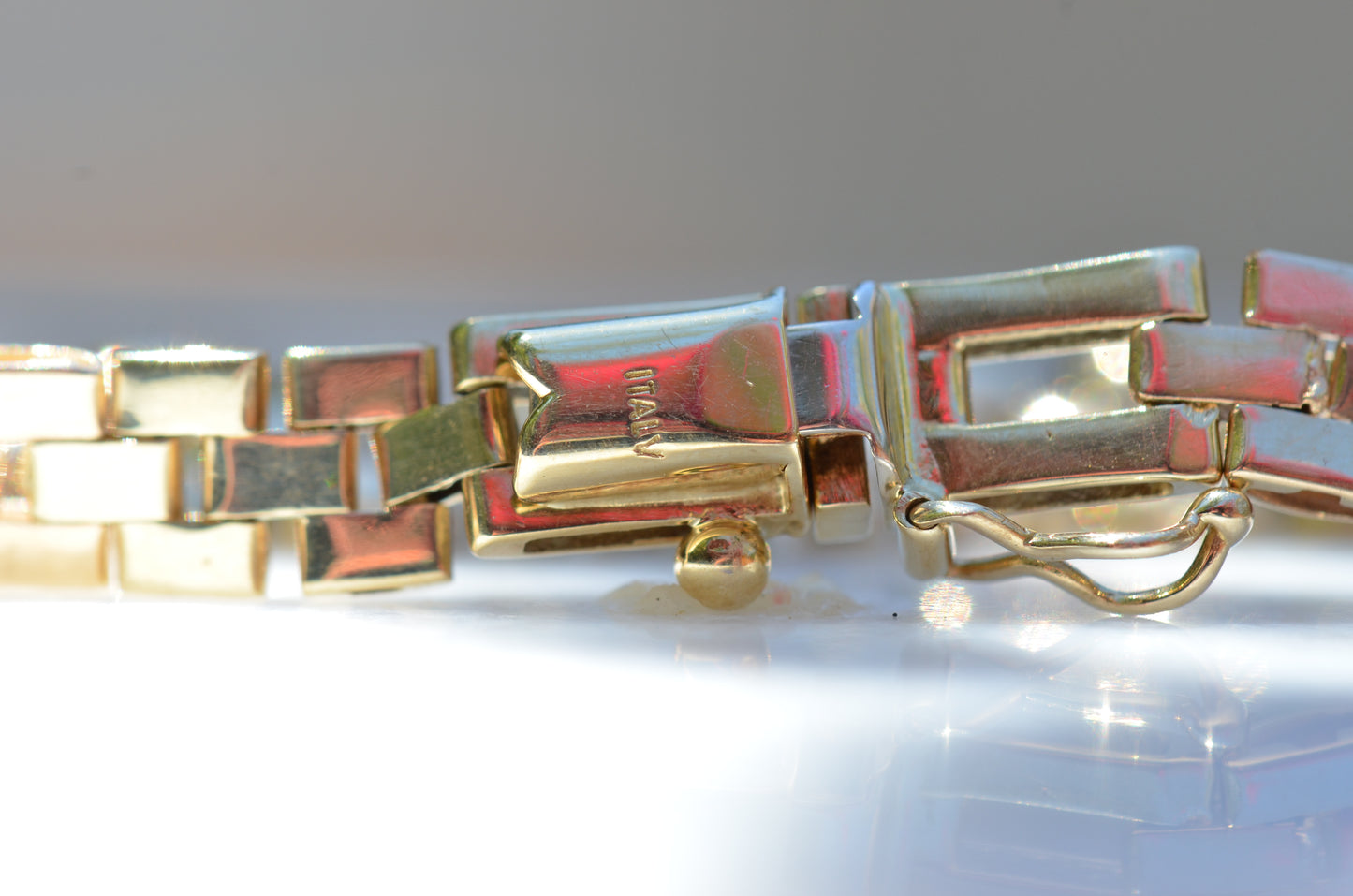 Good vintage condition with reasonable wear in line with age and use. One side appears to have had an extension added and links are just barely different in shape from original segment; this section could be removed in shortening by a jeweller. Closure is secure, and was likely replaced when the bracelet was extended.