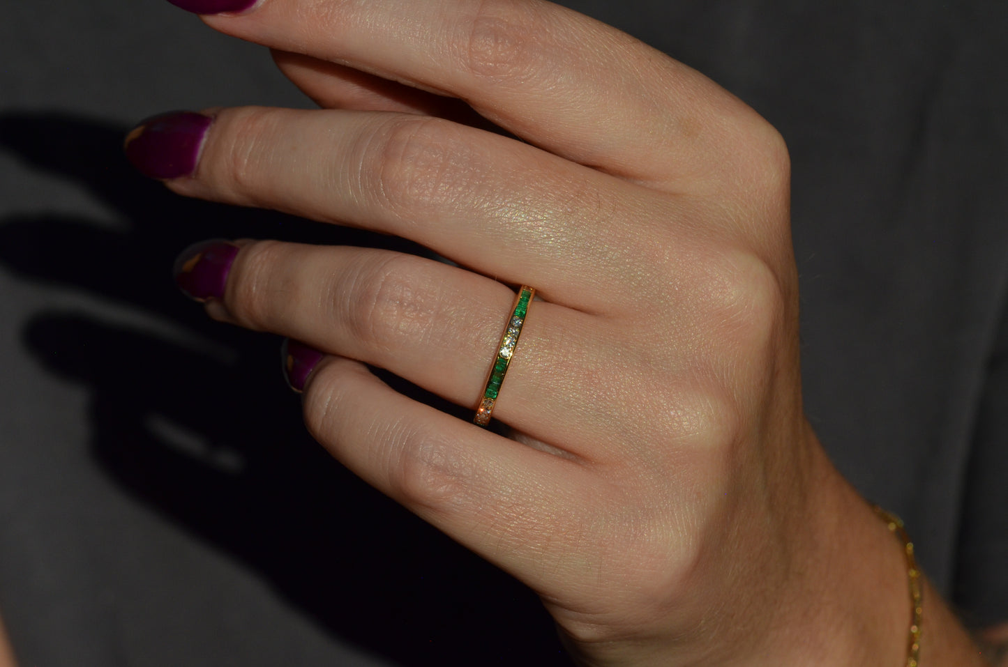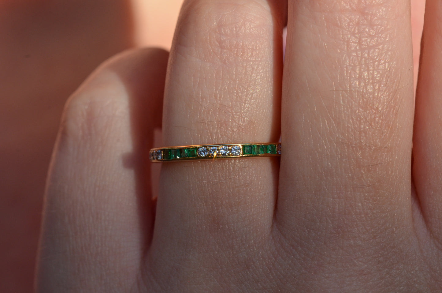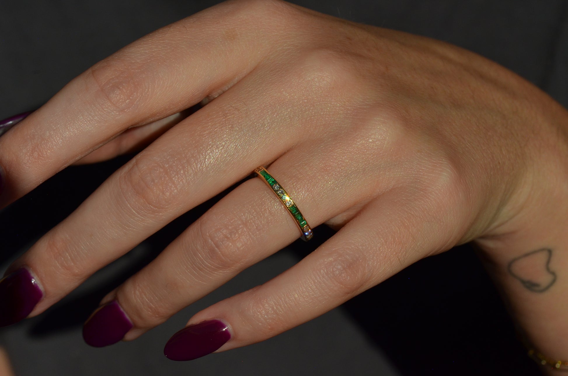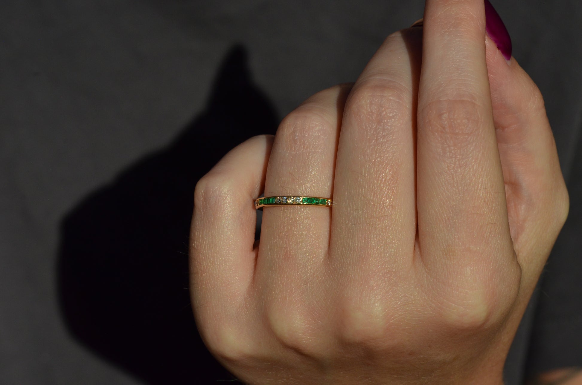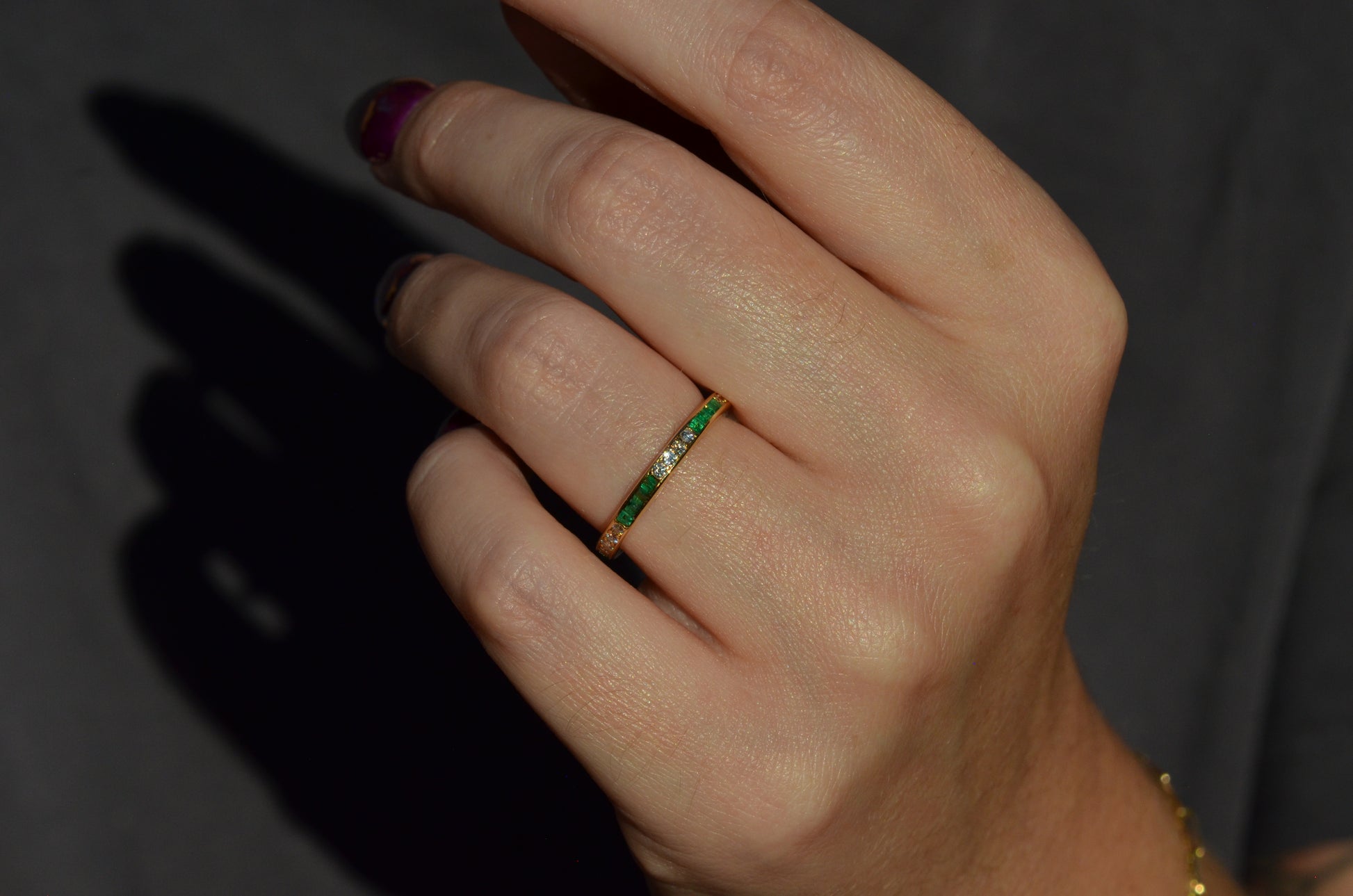 An absolutely gorgeous vintage piece that pairs the rich contrast of verdant emeralds and sunny yellow gold with crisp, white brilliant cut diamonds sprinkled between. The ring feels both sleek and luxurious, bold enough to wear alone yet minimal enough to stack.