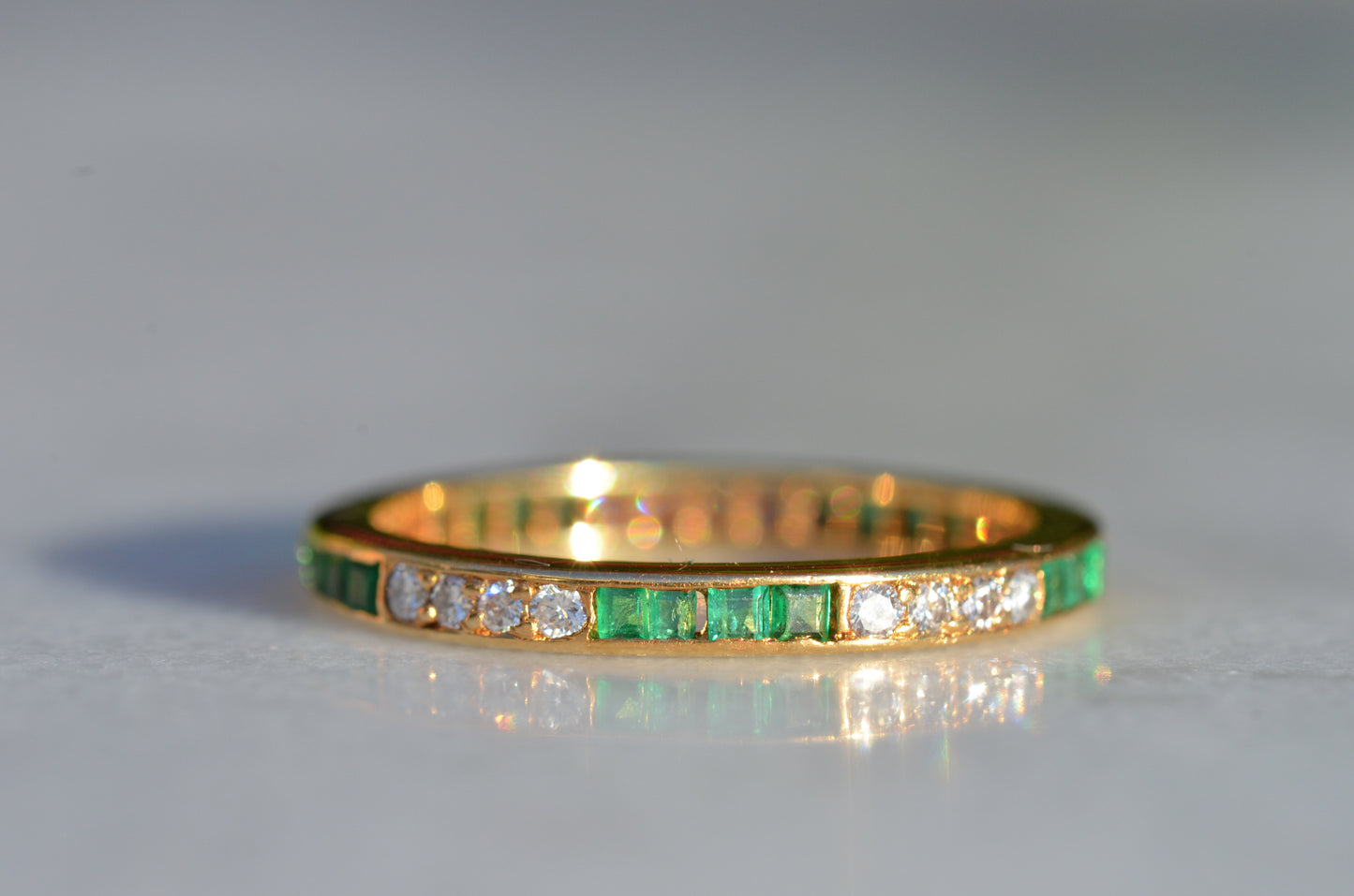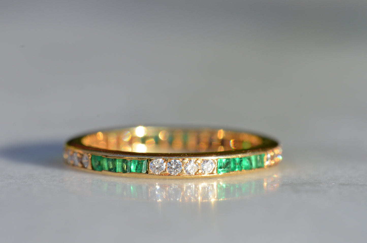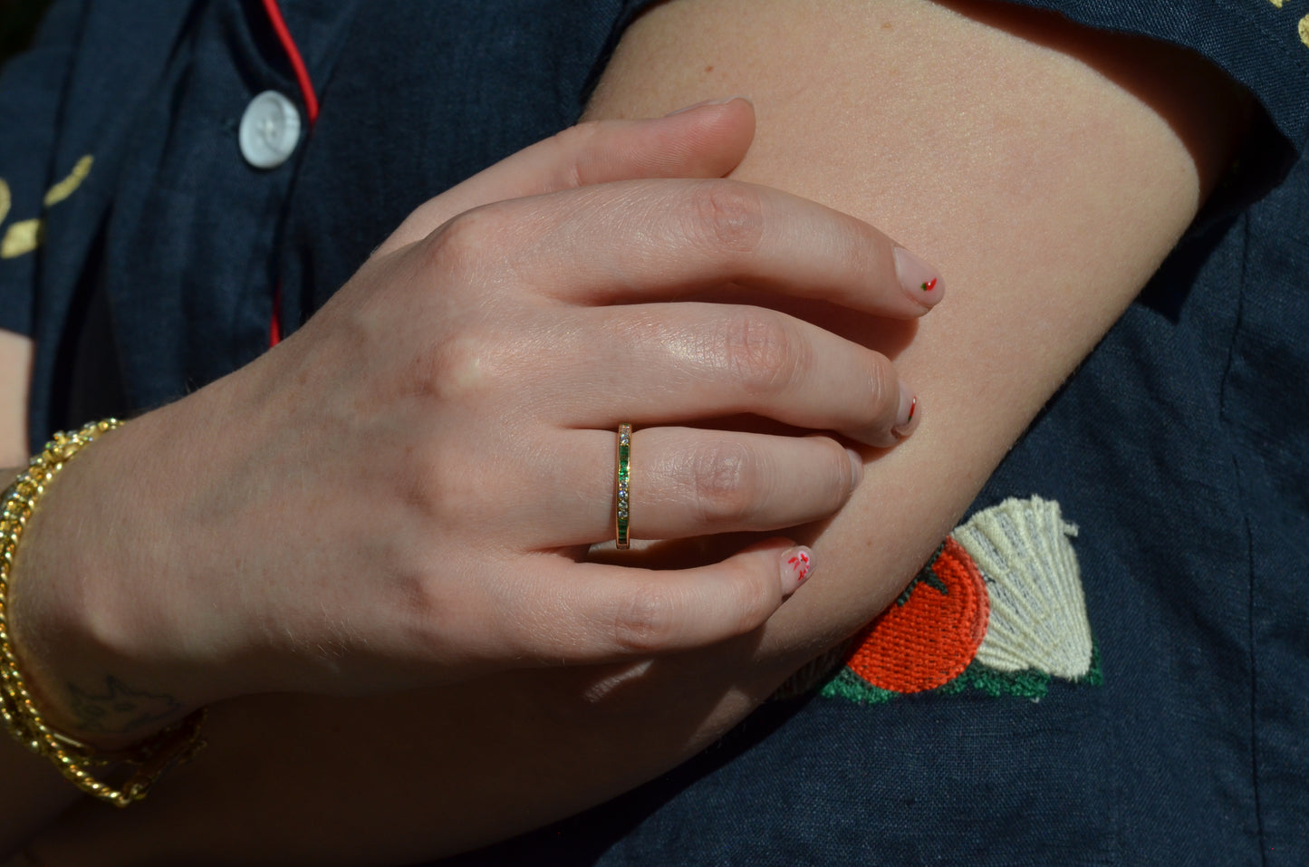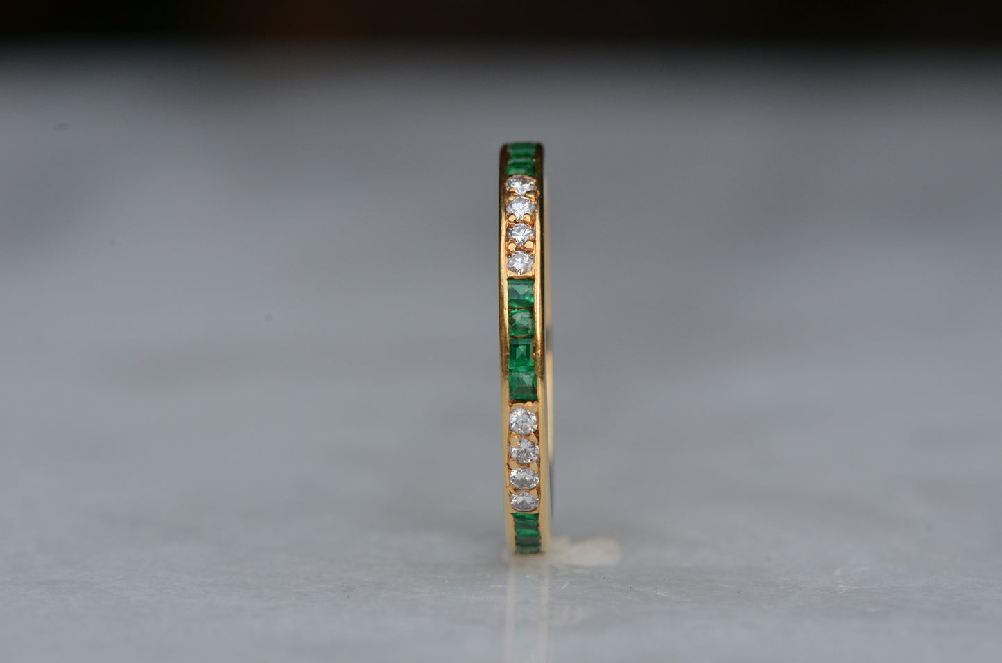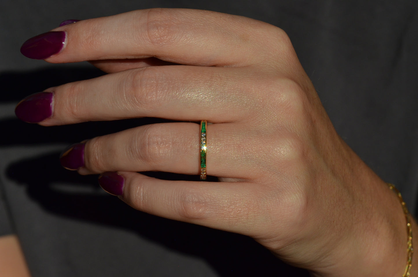 An absolutely gorgeous vintage piece that pairs the rich contrast of verdant emeralds and sunny yellow gold with crisp, white brilliant cut diamonds sprinkled between. The ring feels both sleek and luxurious, bold enough to wear alone yet minimal enough to stack.
