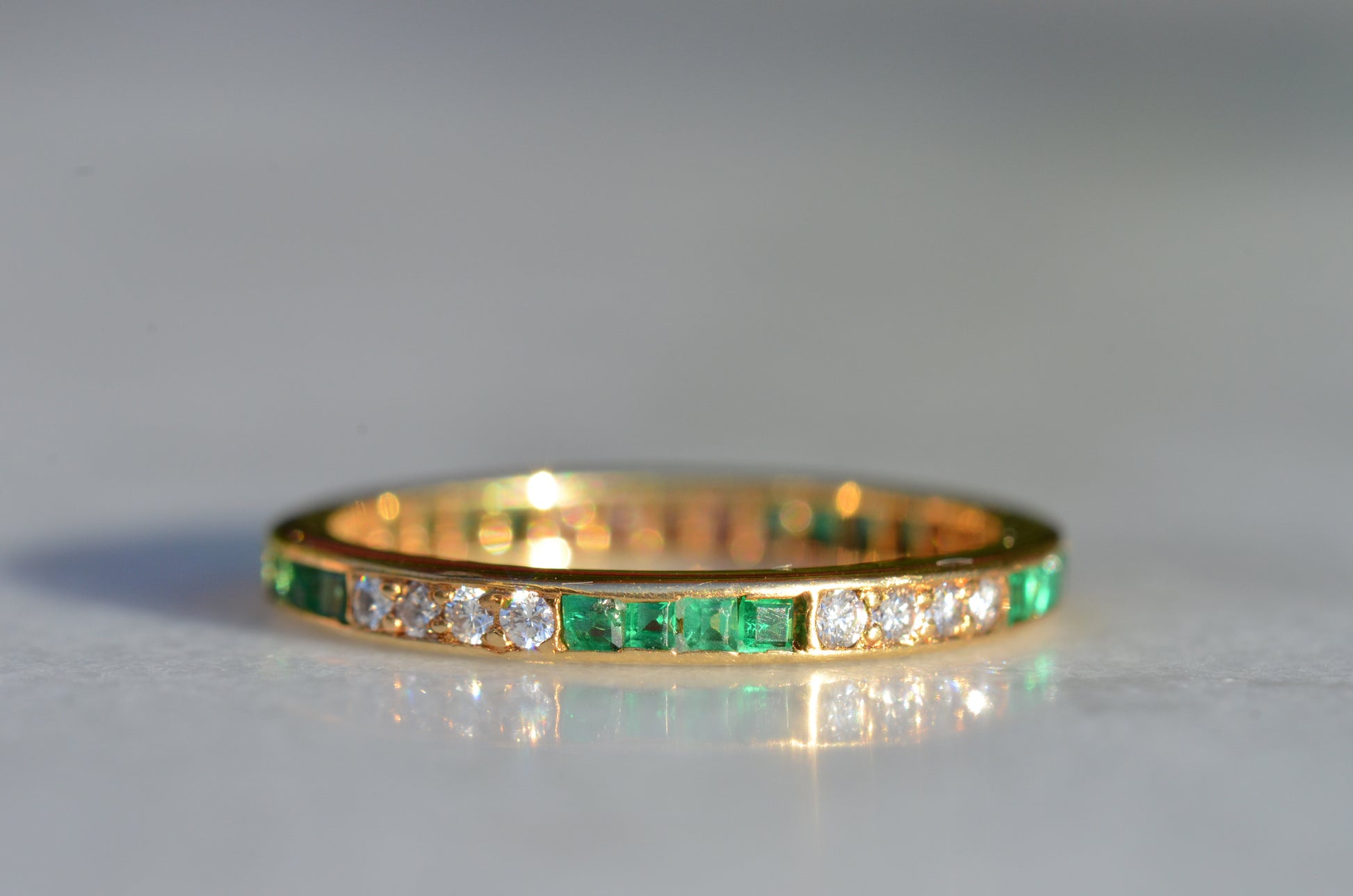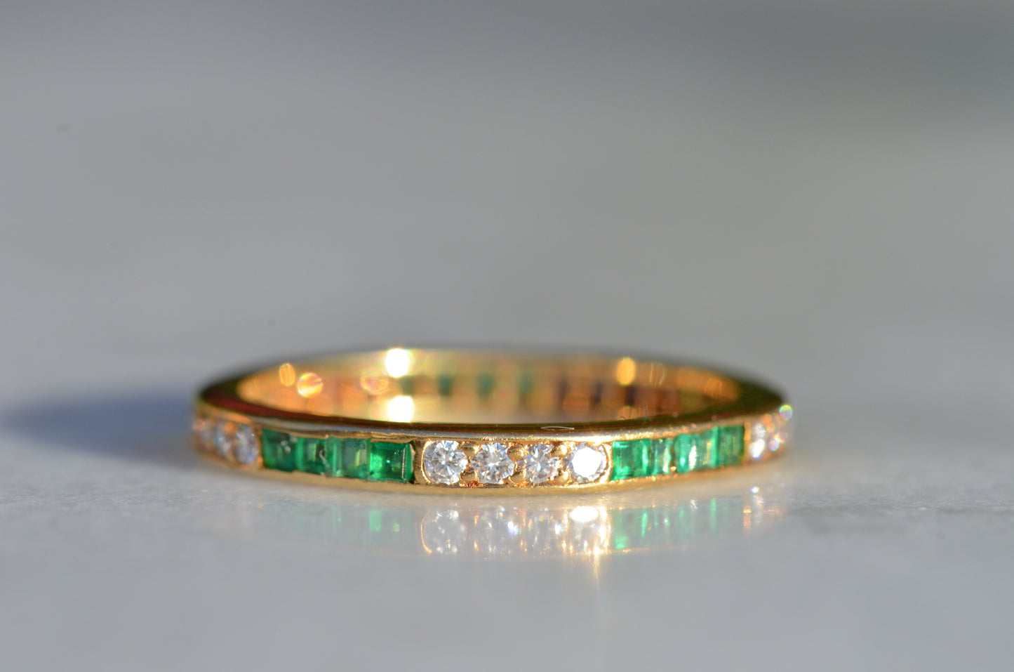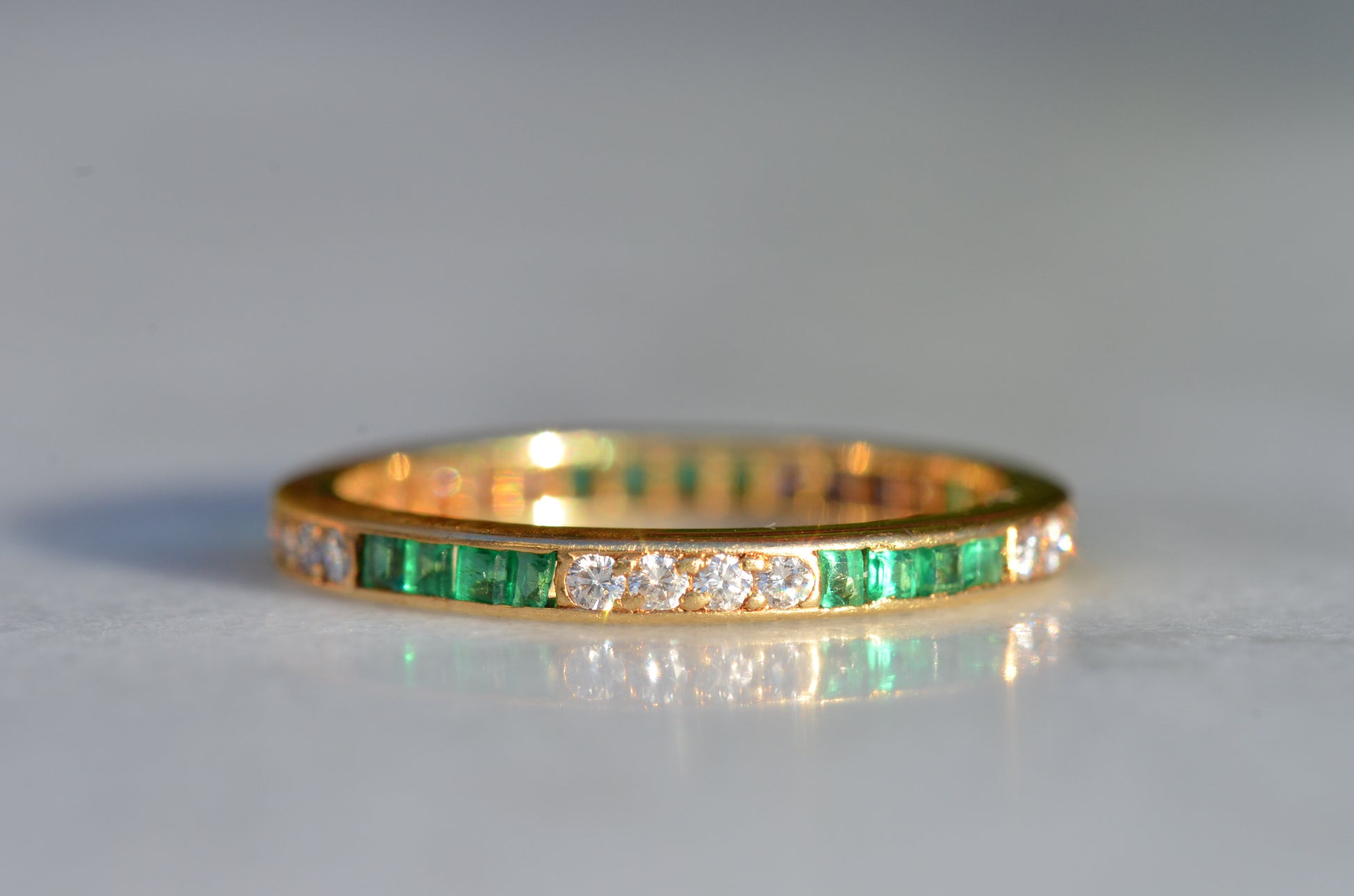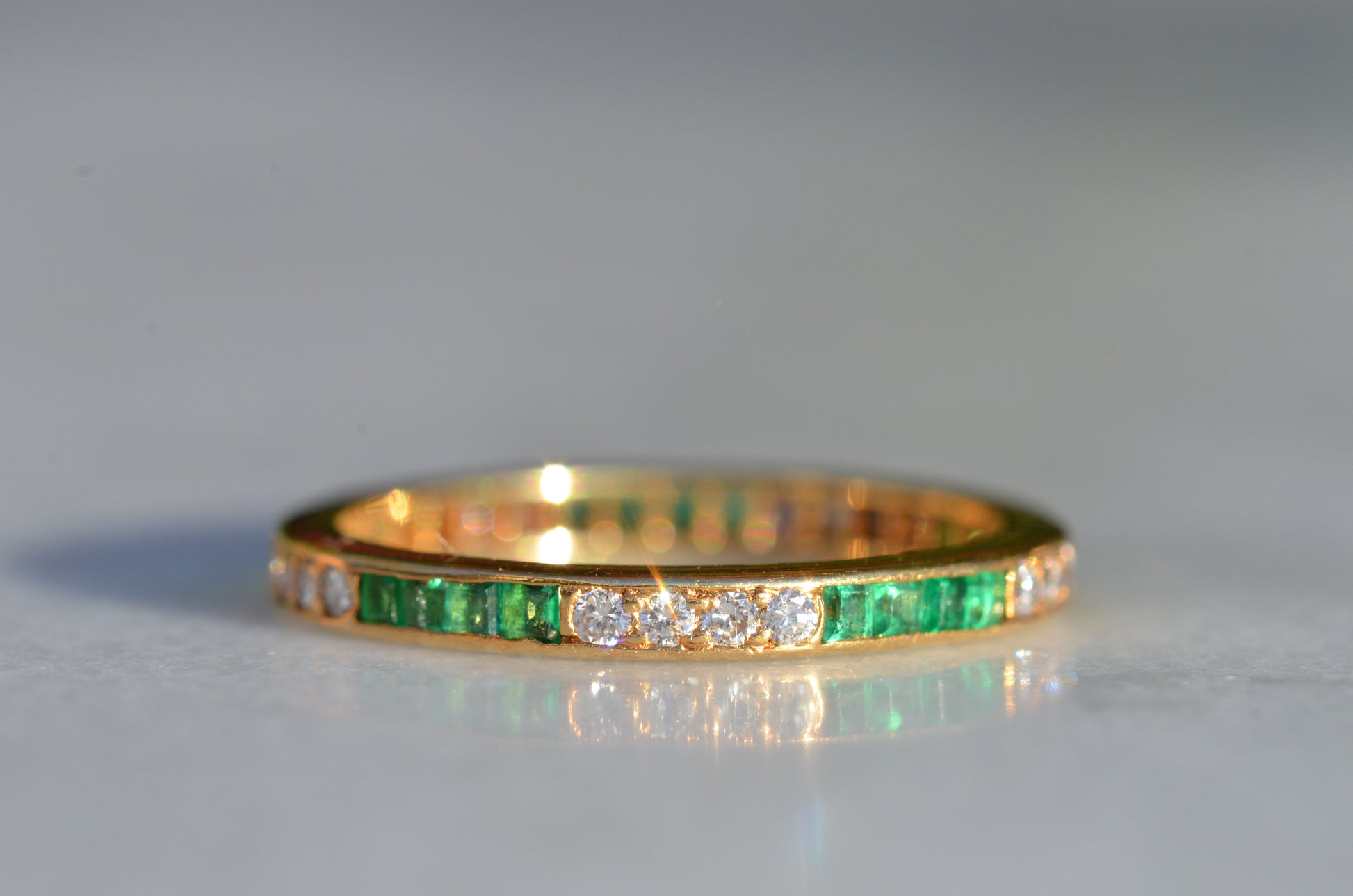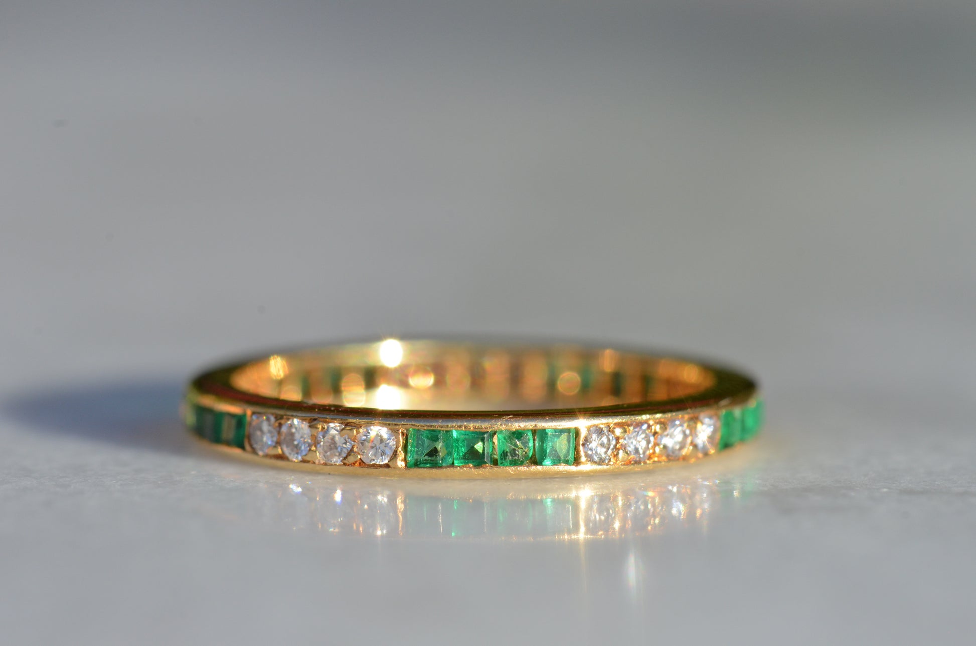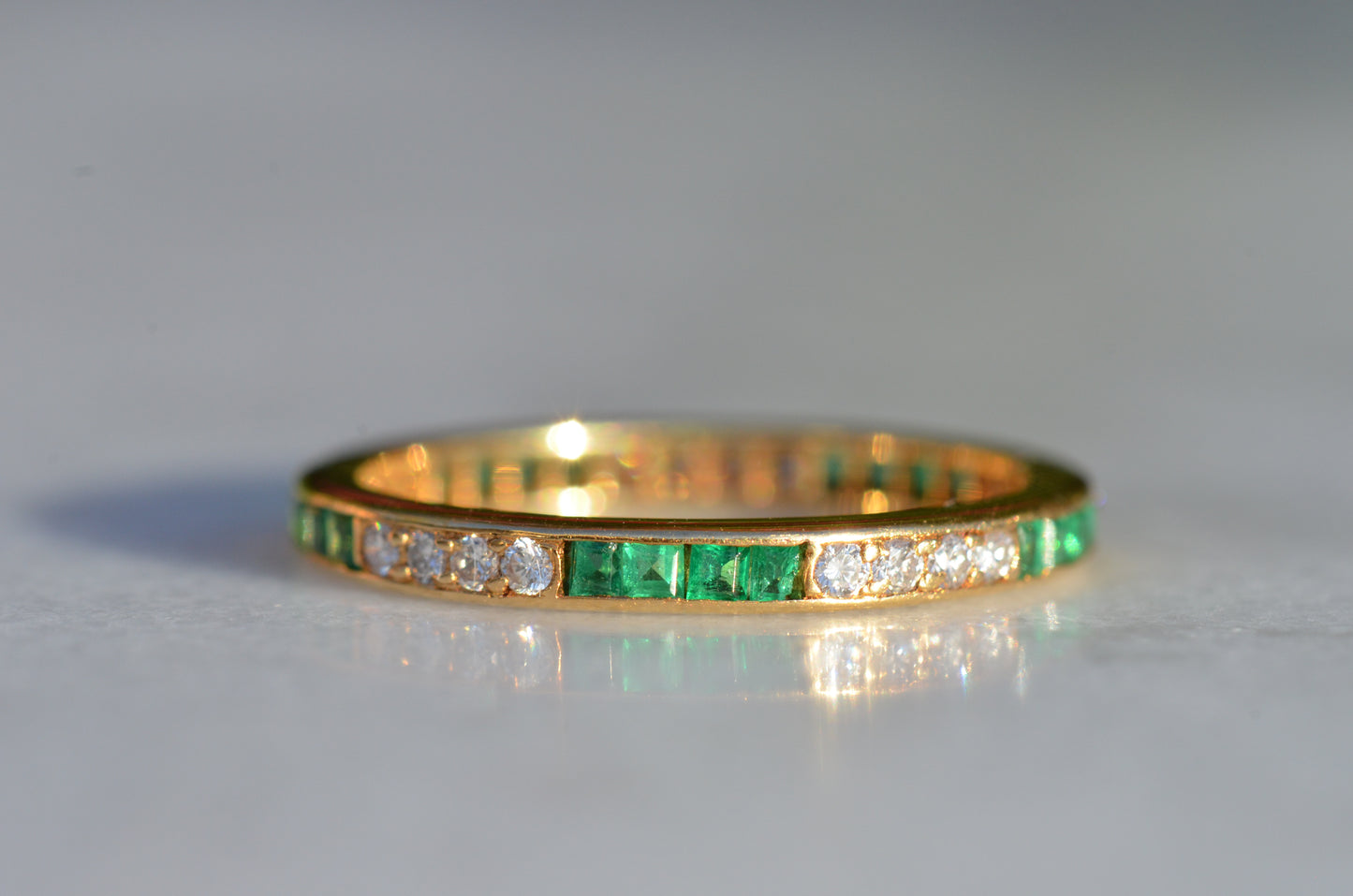 An absolutely gorgeous vintage piece that pairs the rich contrast of verdant emeralds and sunny yellow gold with crisp, white brilliant cut diamonds sprinkled between. The ring feels both sleek and luxurious, bold enough to wear alone yet minimal enough to stack.