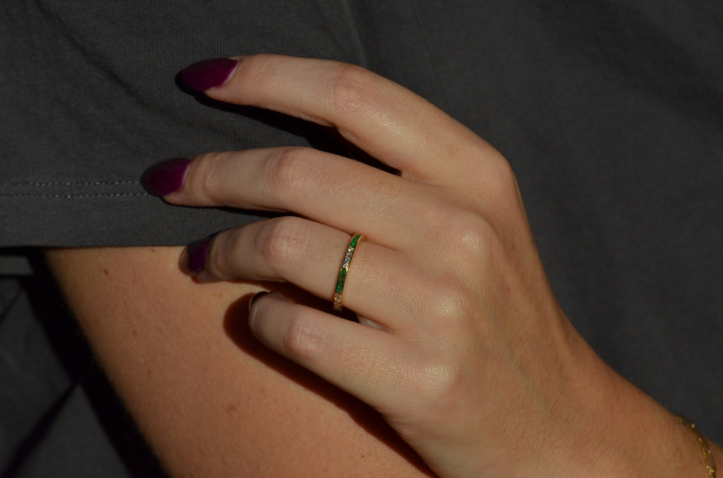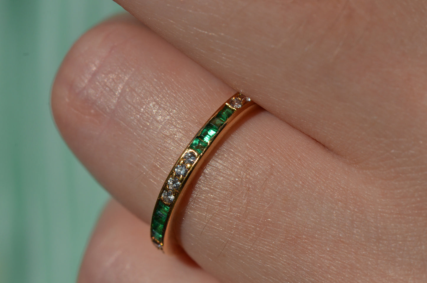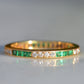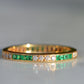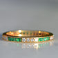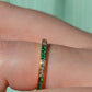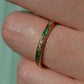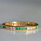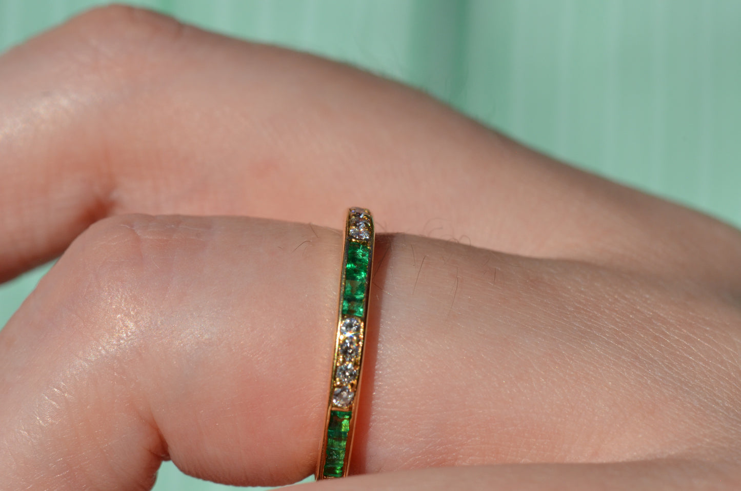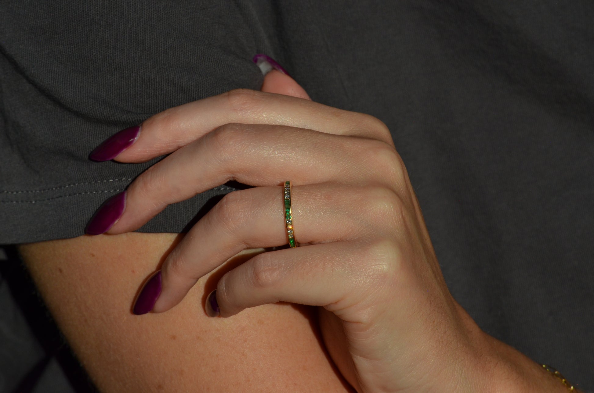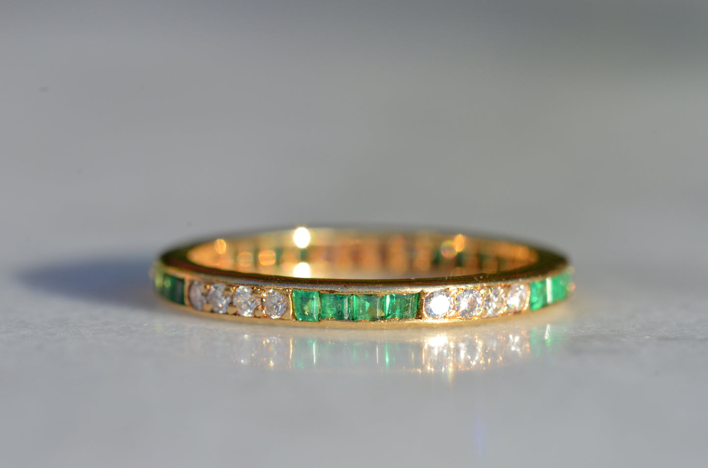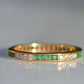 An absolutely gorgeous vintage piece that pairs the rich contrast of verdant emeralds and sunny yellow gold with crisp, white brilliant cut diamonds sprinkled between. The ring feels both sleek and luxurious, bold enough to wear alone yet minimal enough to stack.