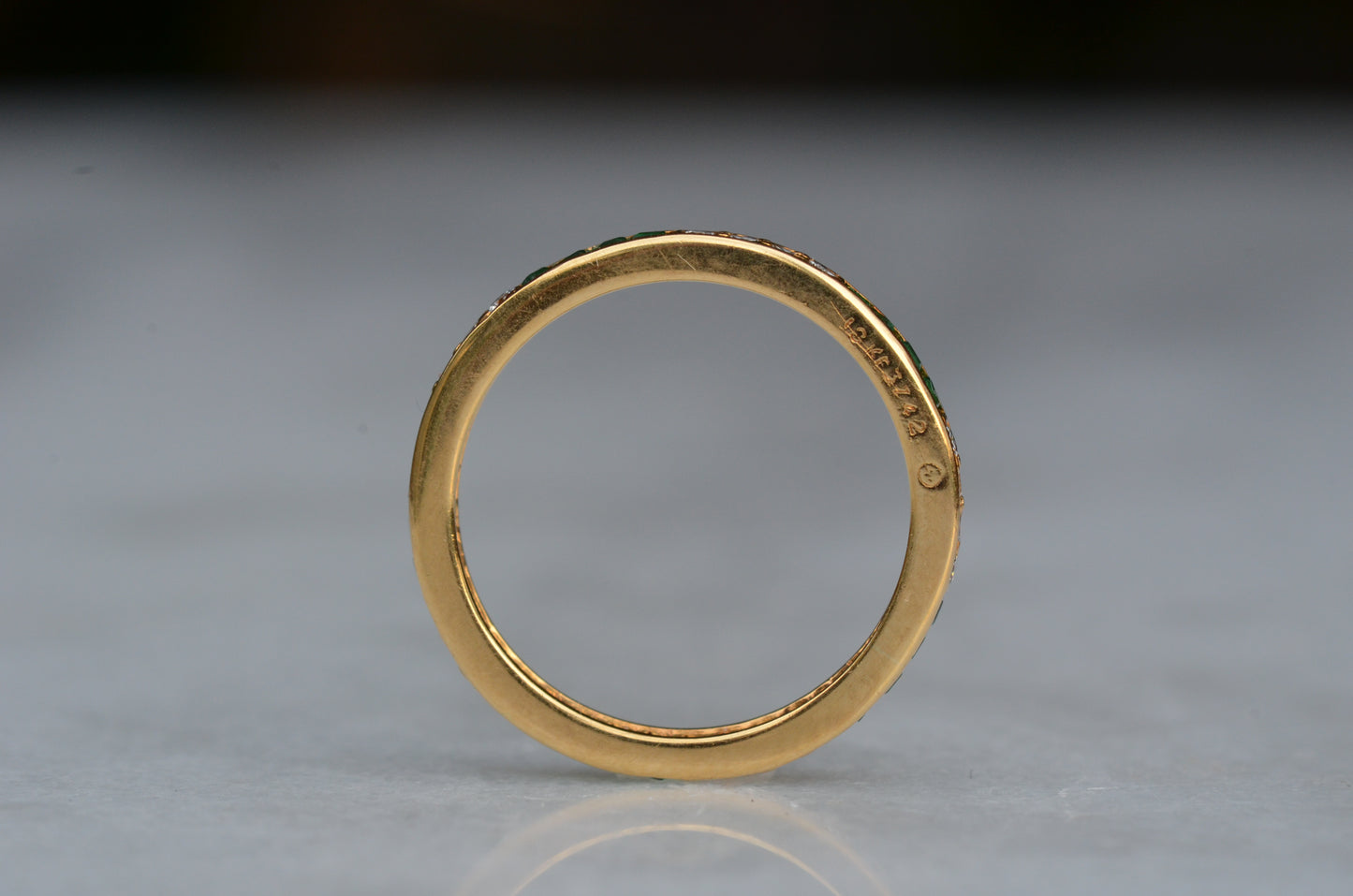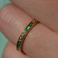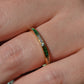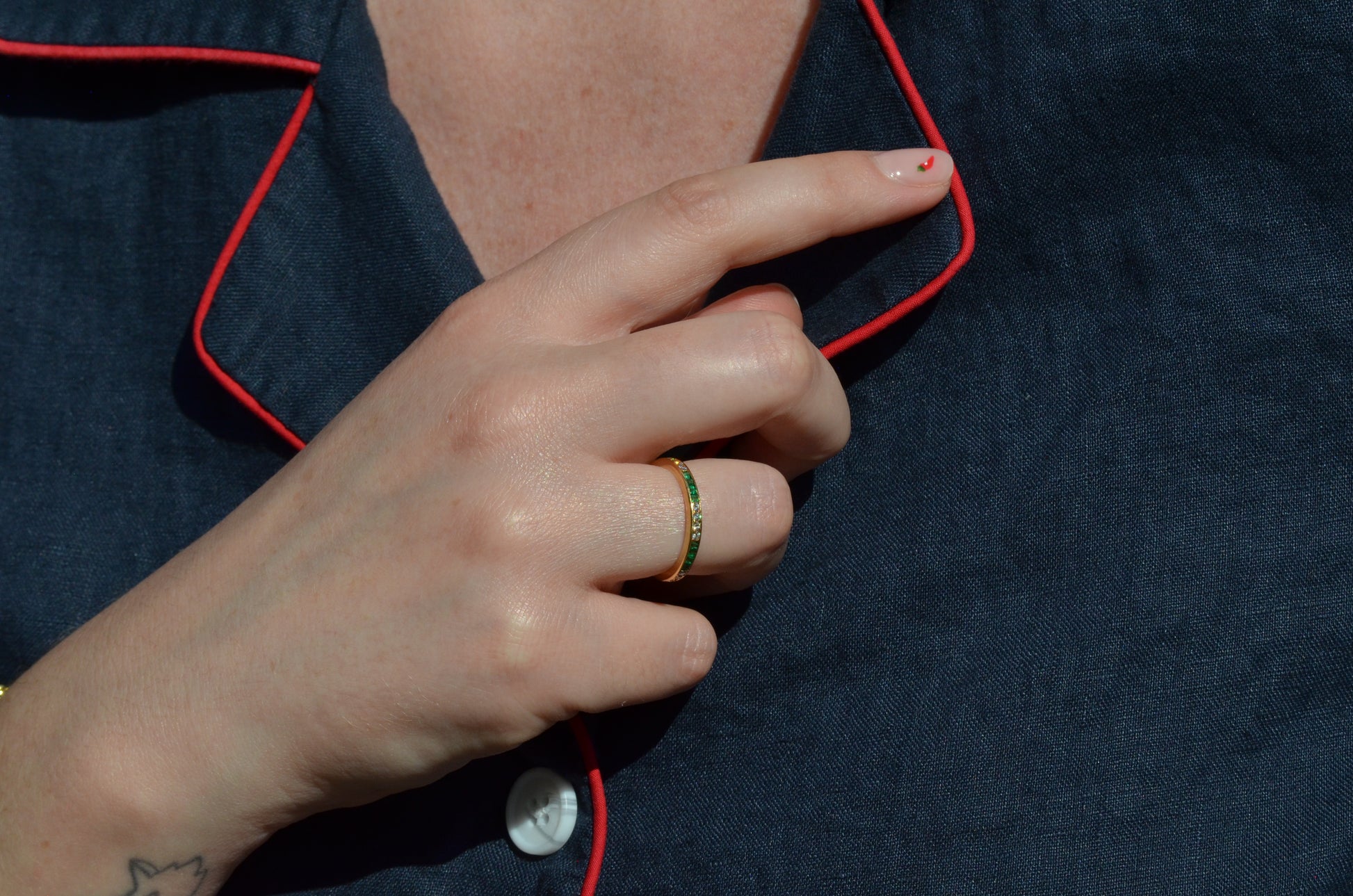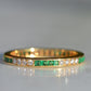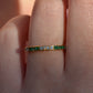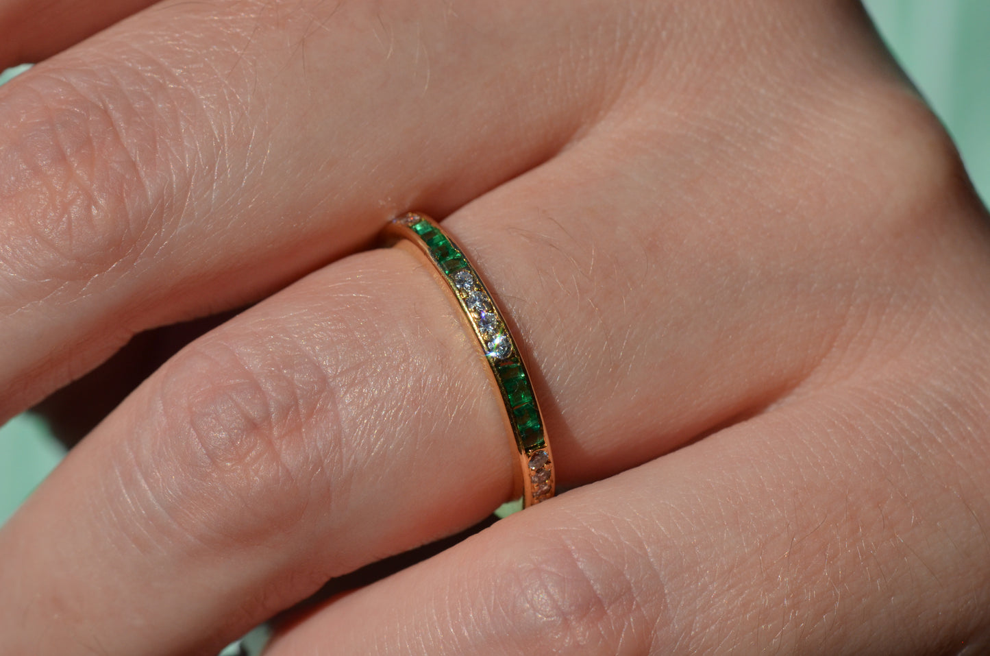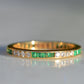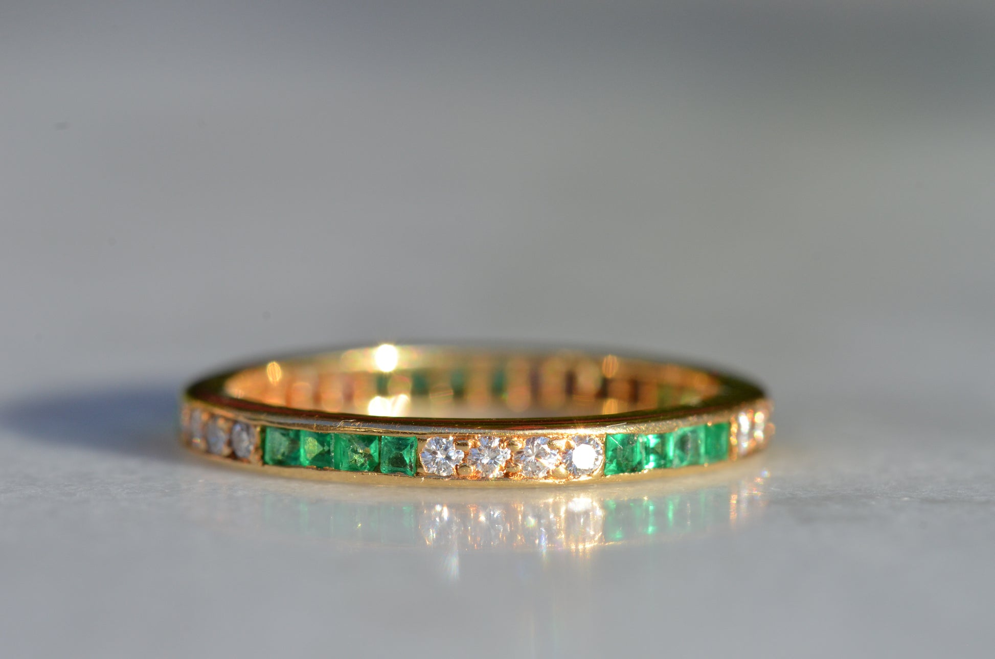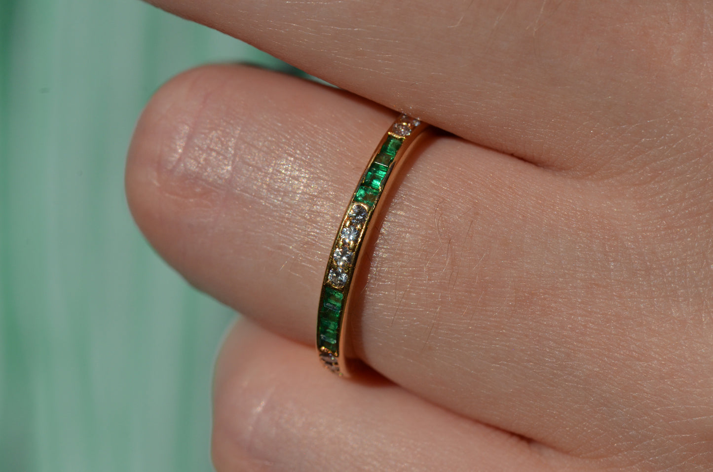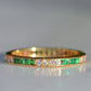 An absolutely gorgeous vintage piece that pairs the rich contrast of verdant emeralds and sunny yellow gold with crisp, white brilliant cut diamonds sprinkled between. The ring feels both sleek and luxurious, bold enough to wear alone yet minimal enough to stack.
