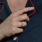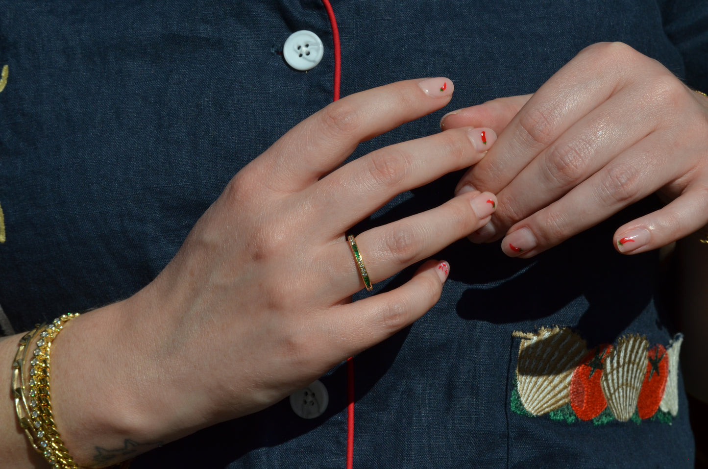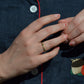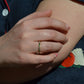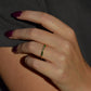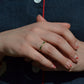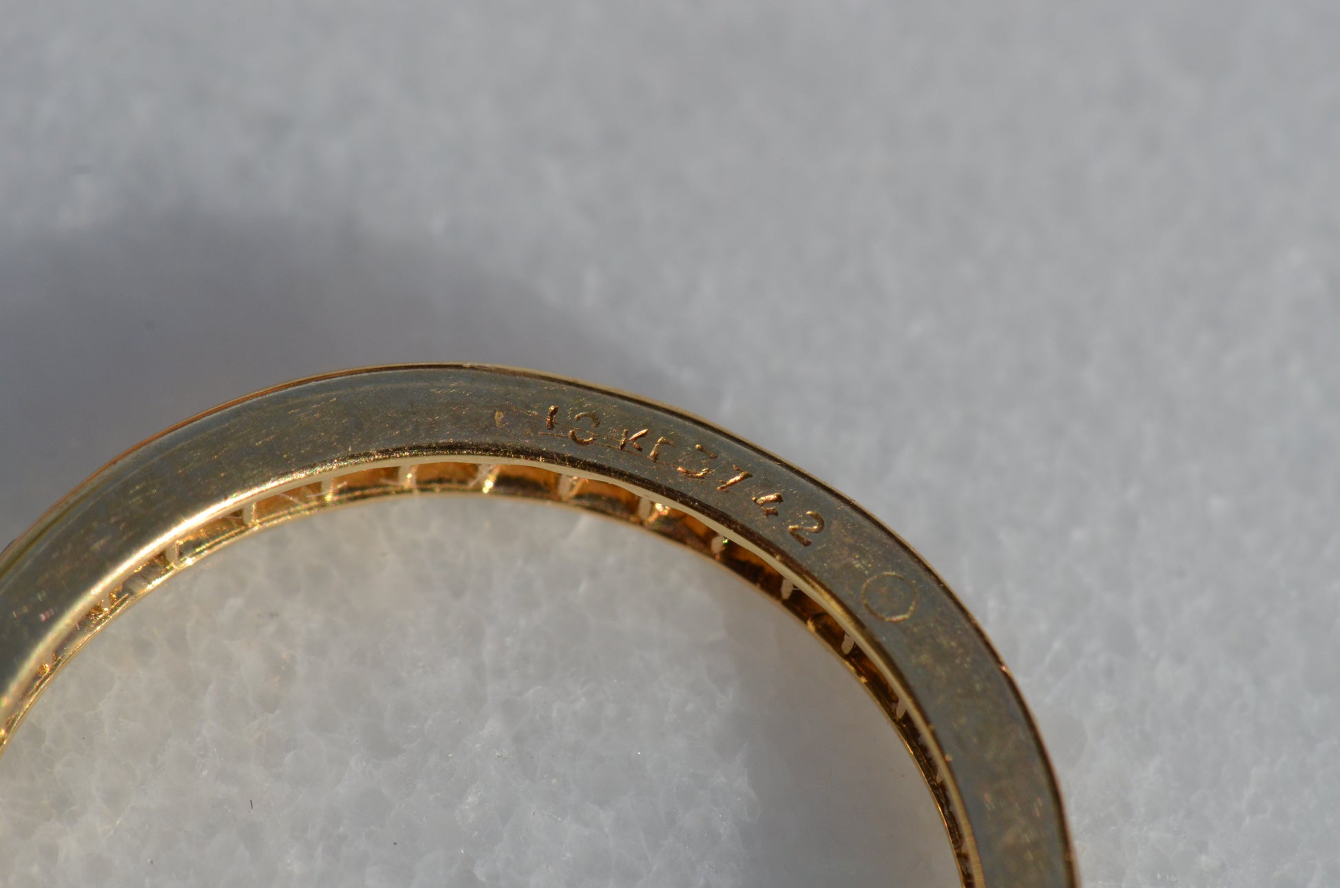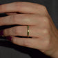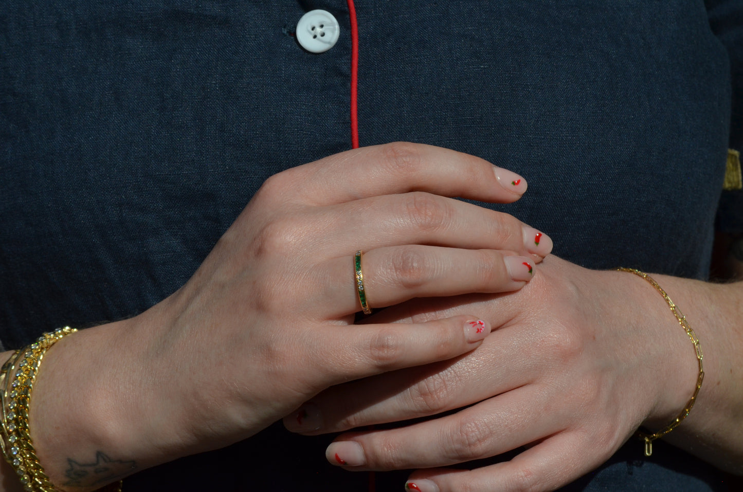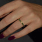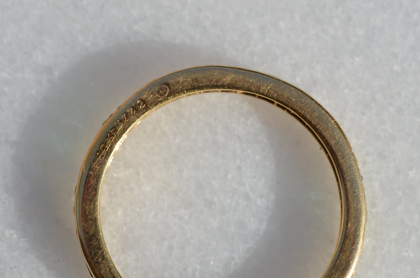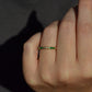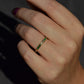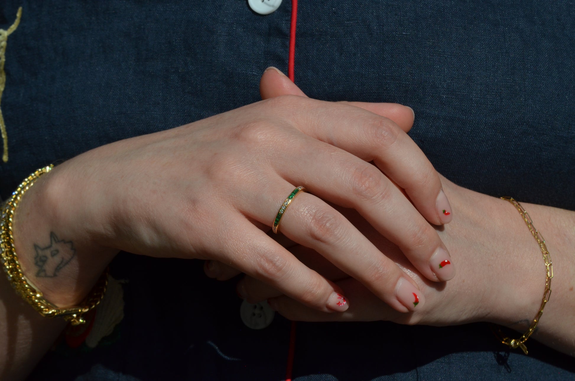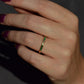 An absolutely gorgeous vintage piece that pairs the rich contrast of verdant emeralds and sunny yellow gold with crisp, white brilliant cut diamonds sprinkled between. The ring feels both sleek and luxurious, bold enough to wear alone yet minimal enough to stack.