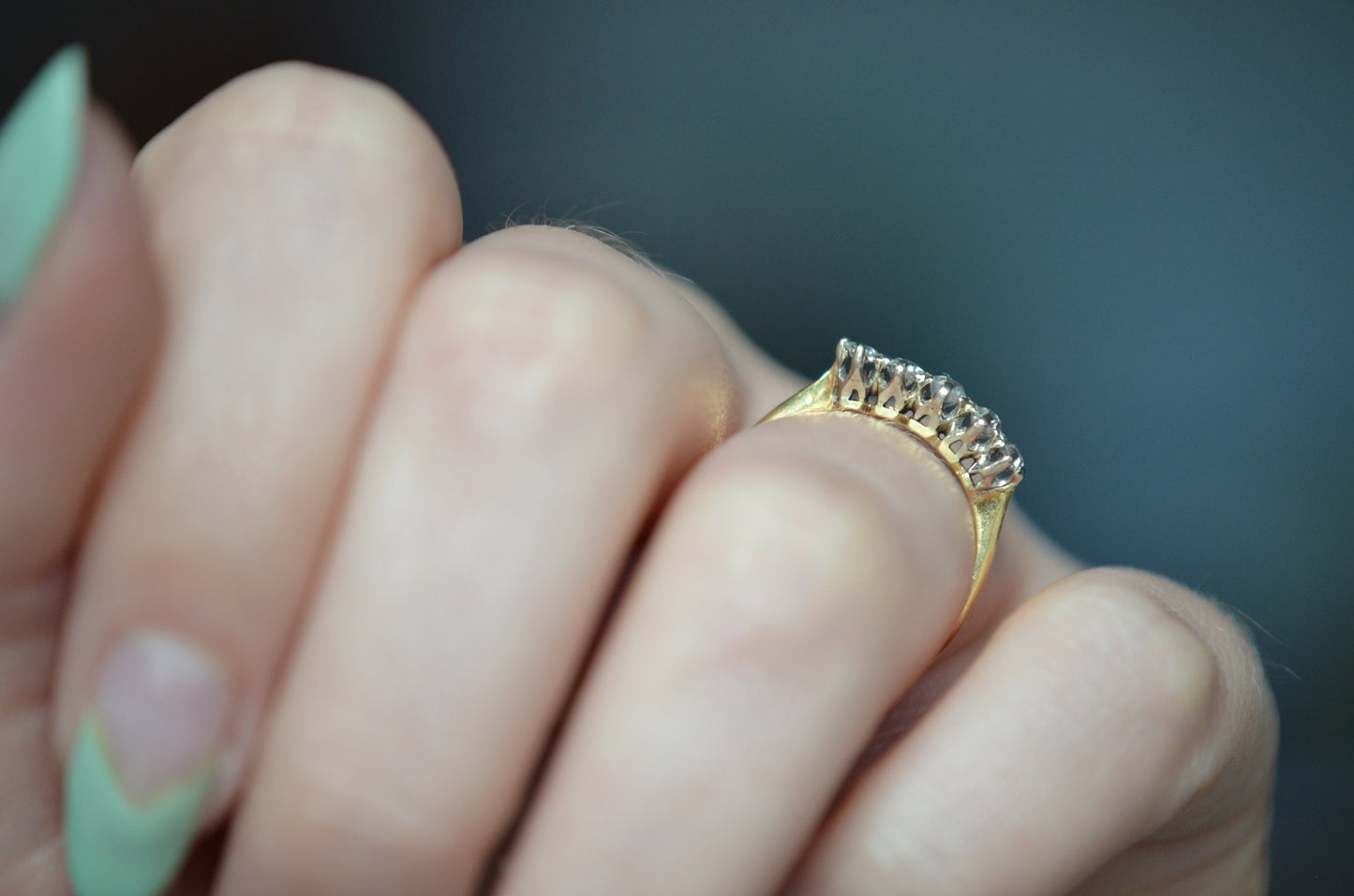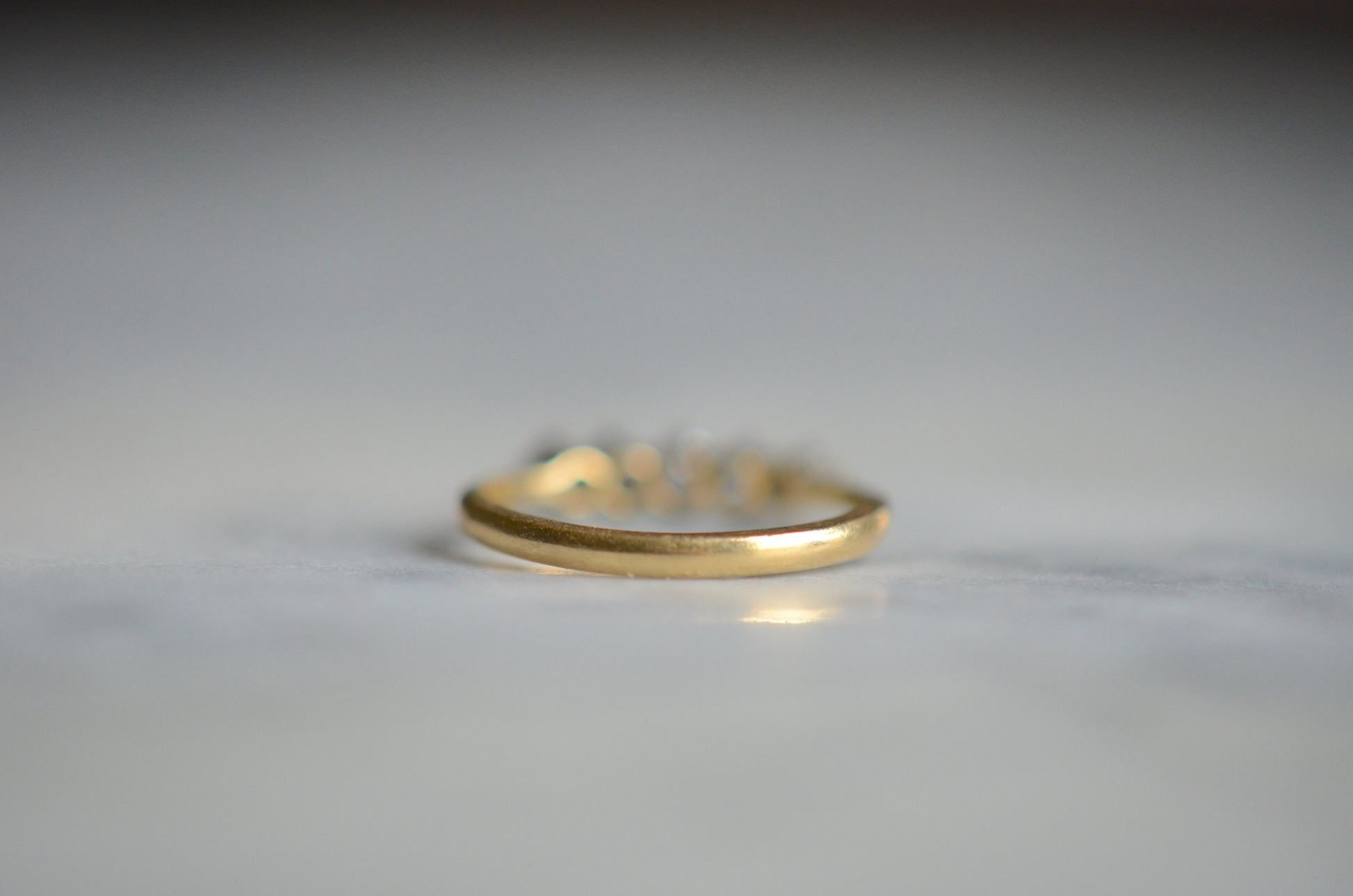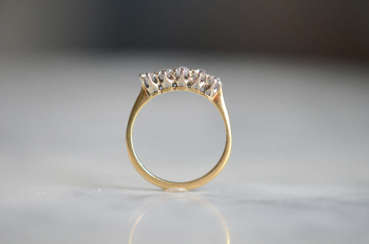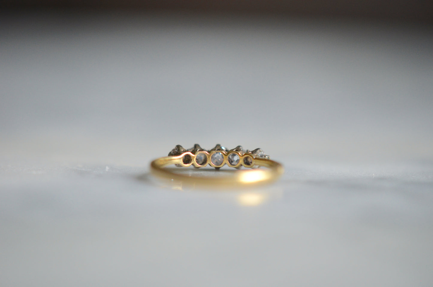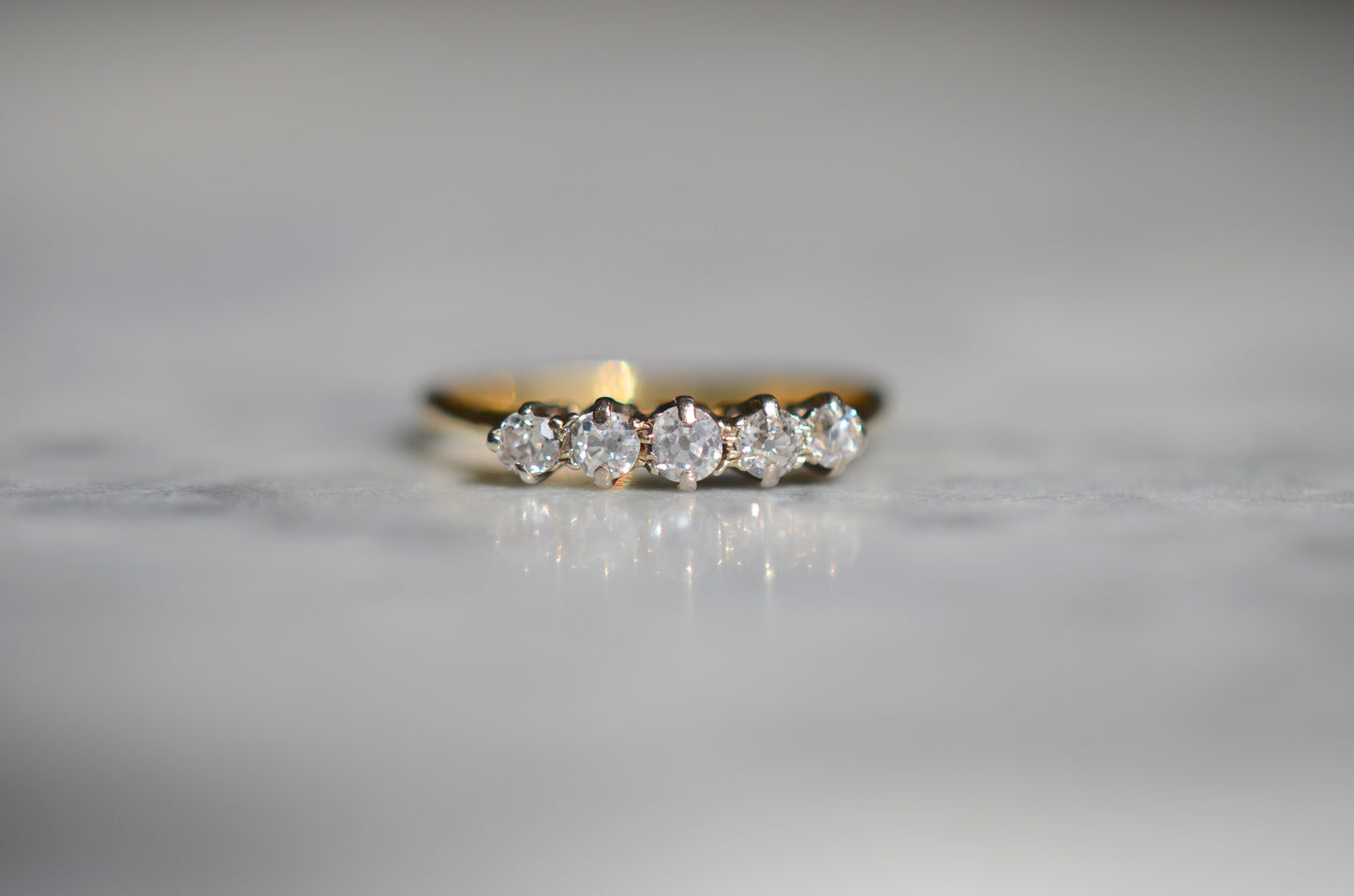 A barely perceptible gradation of stones means this ring can easily pull double duty as an engagement ring, a wedding band, or both, and is just as charming as a right hand or stacking ring. The white and yellow gold combination means this will seamlessly integrate with your jewelry wardrobe, and we love the way five stone rings can mark all sorts of romantic or personal milestones and achievements.