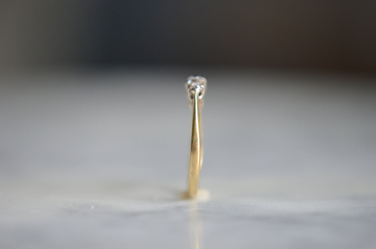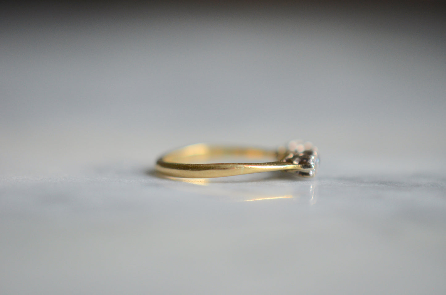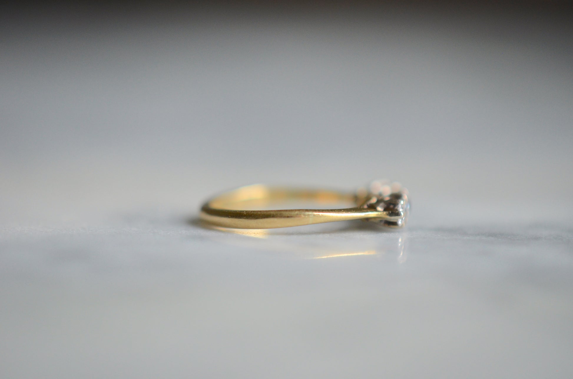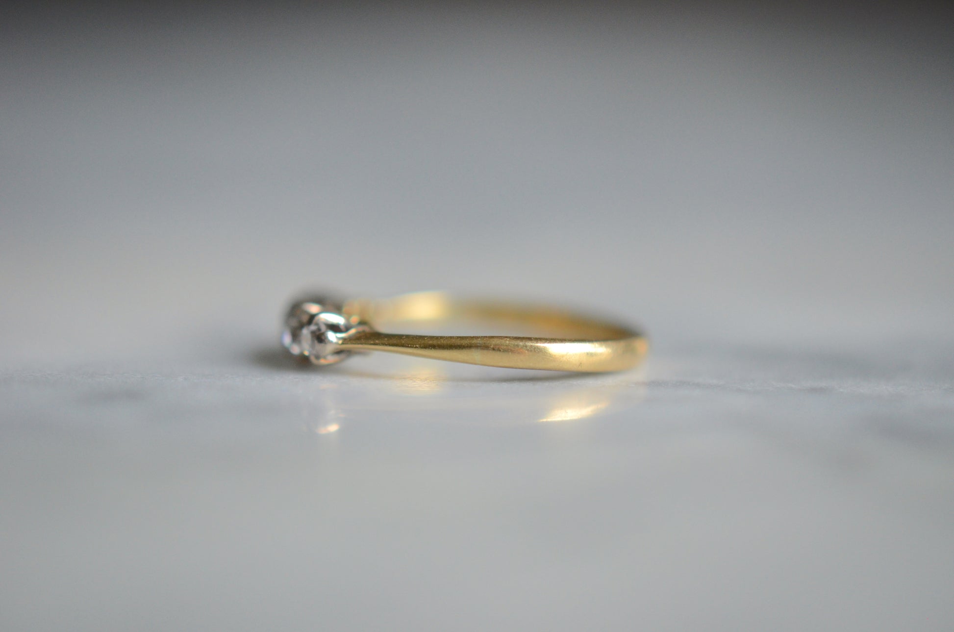 A simple motif, beautifully executed with an economy of style - a perfect example of early art deco jewelry. The two-tone gold and minimal, linear design perfectly bridge the differences between Edwardian and deco rings, while you could get lost in the unique facets of each hand-cut old diamond.