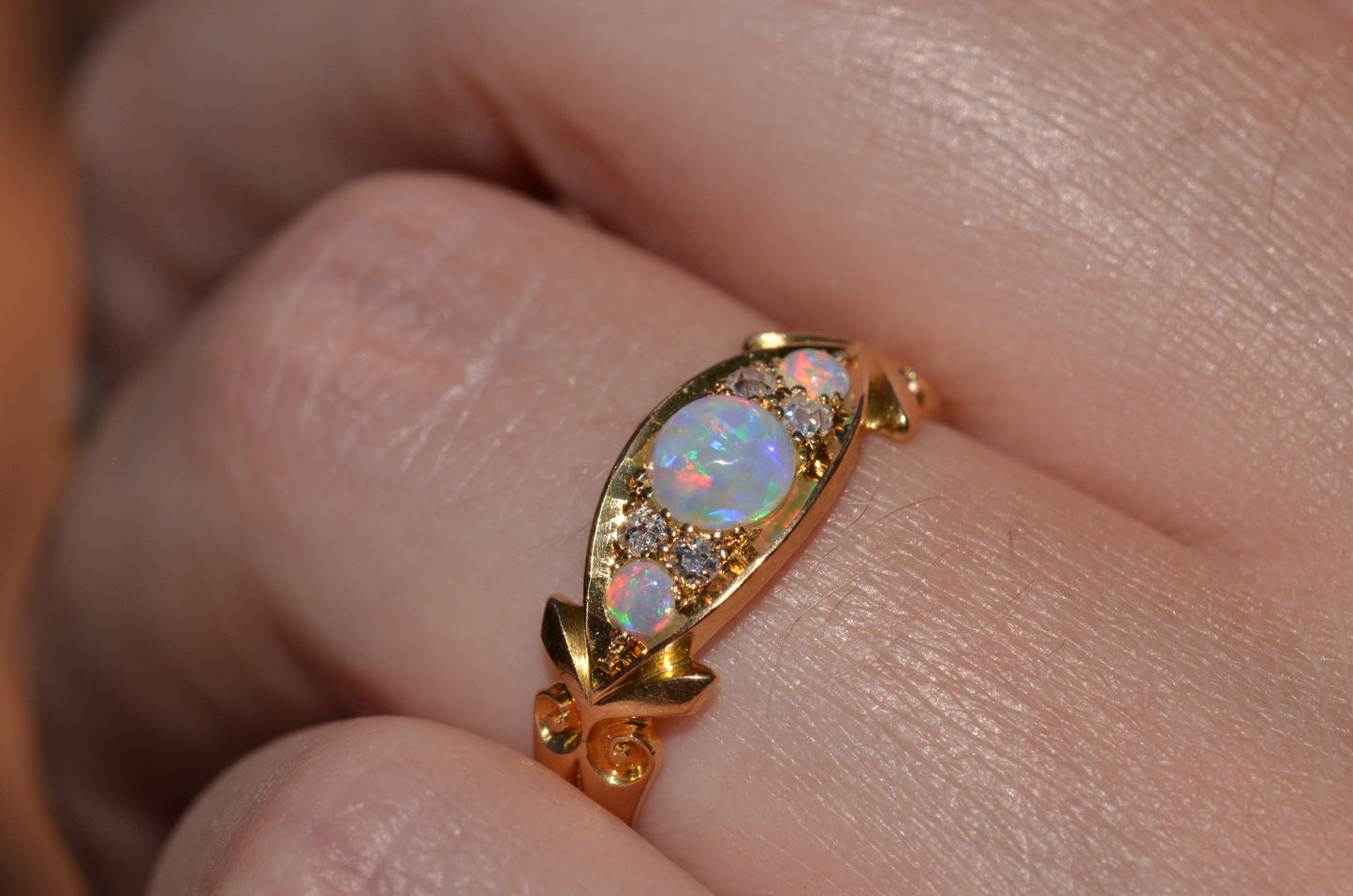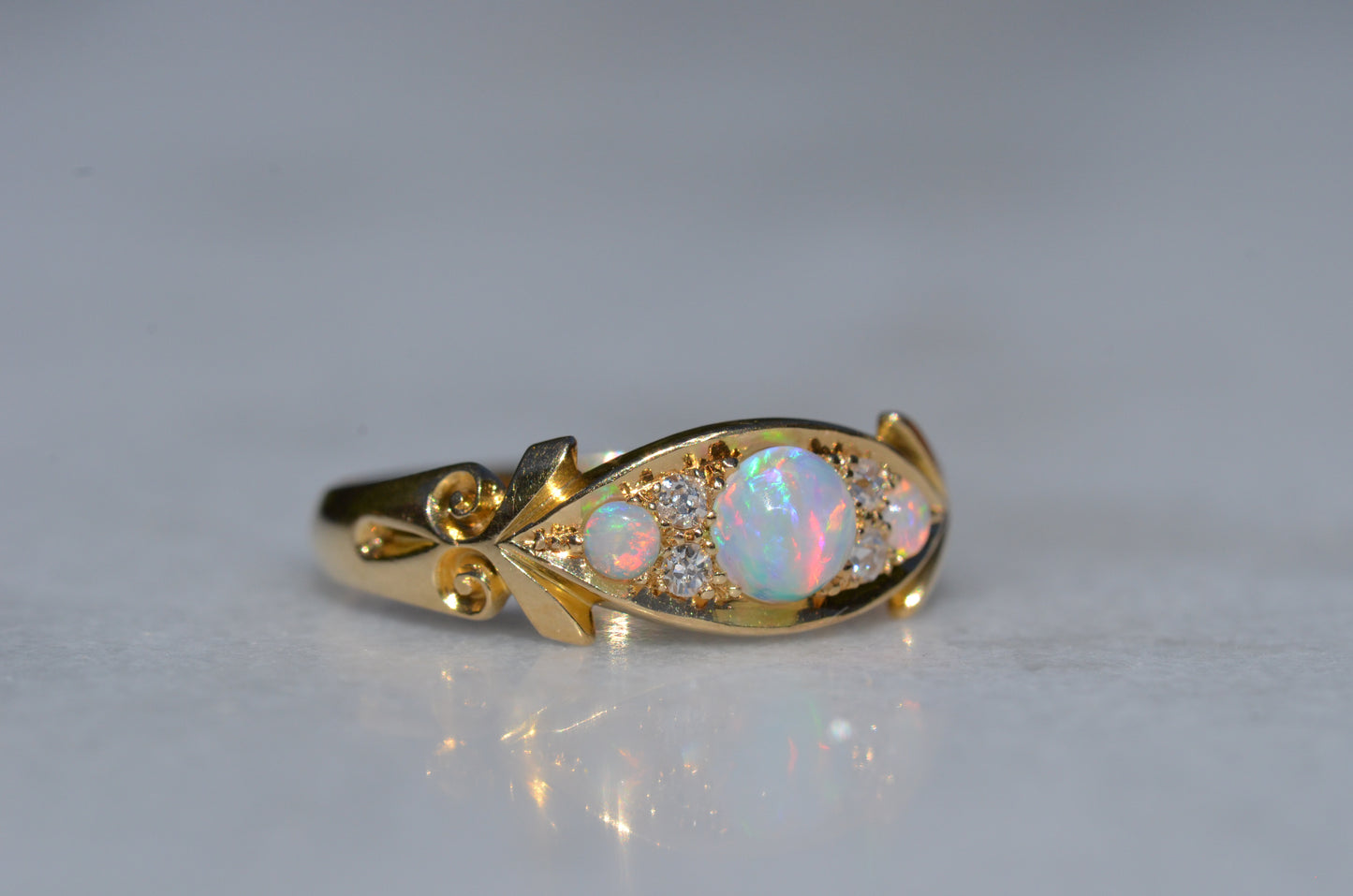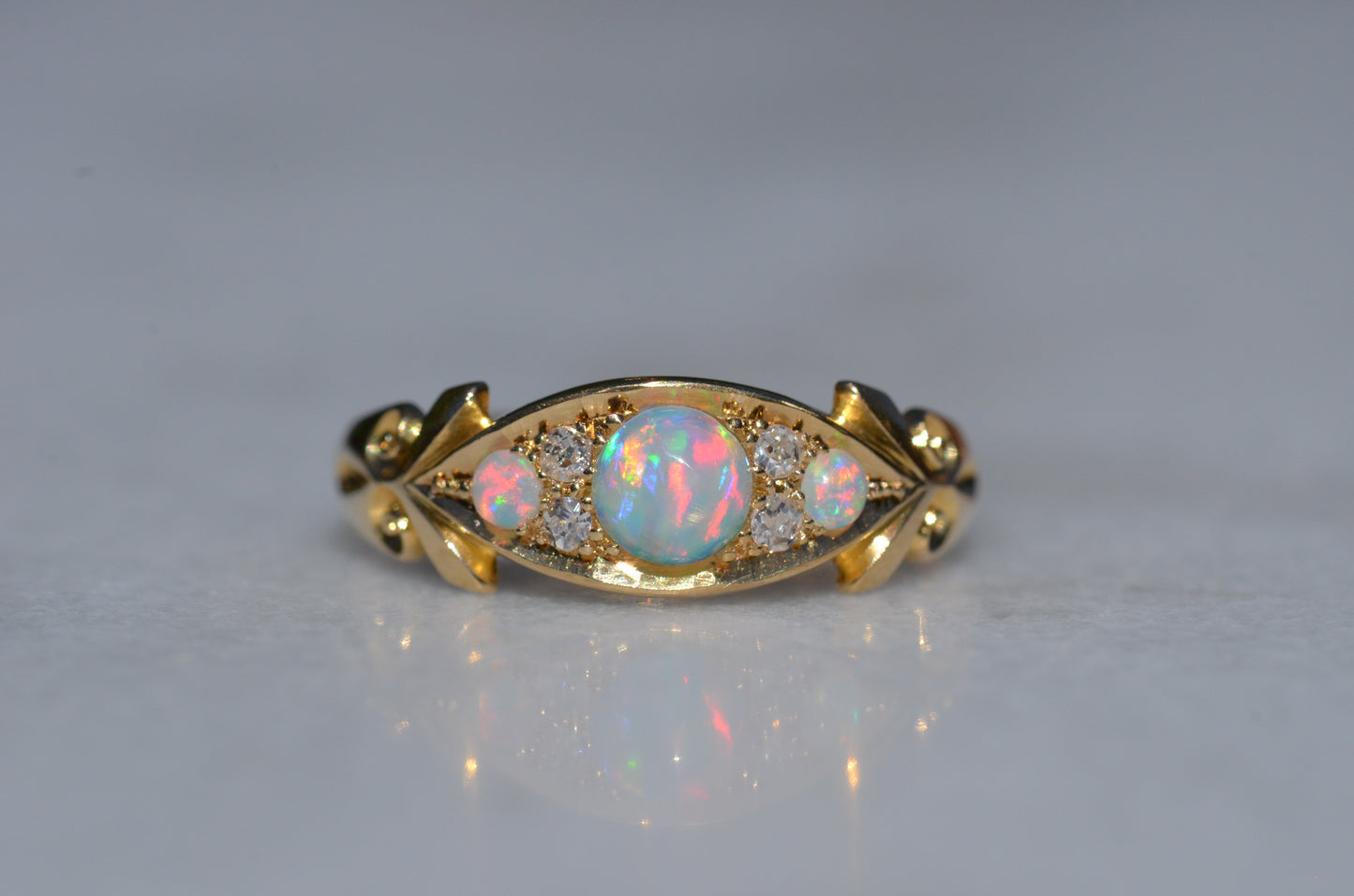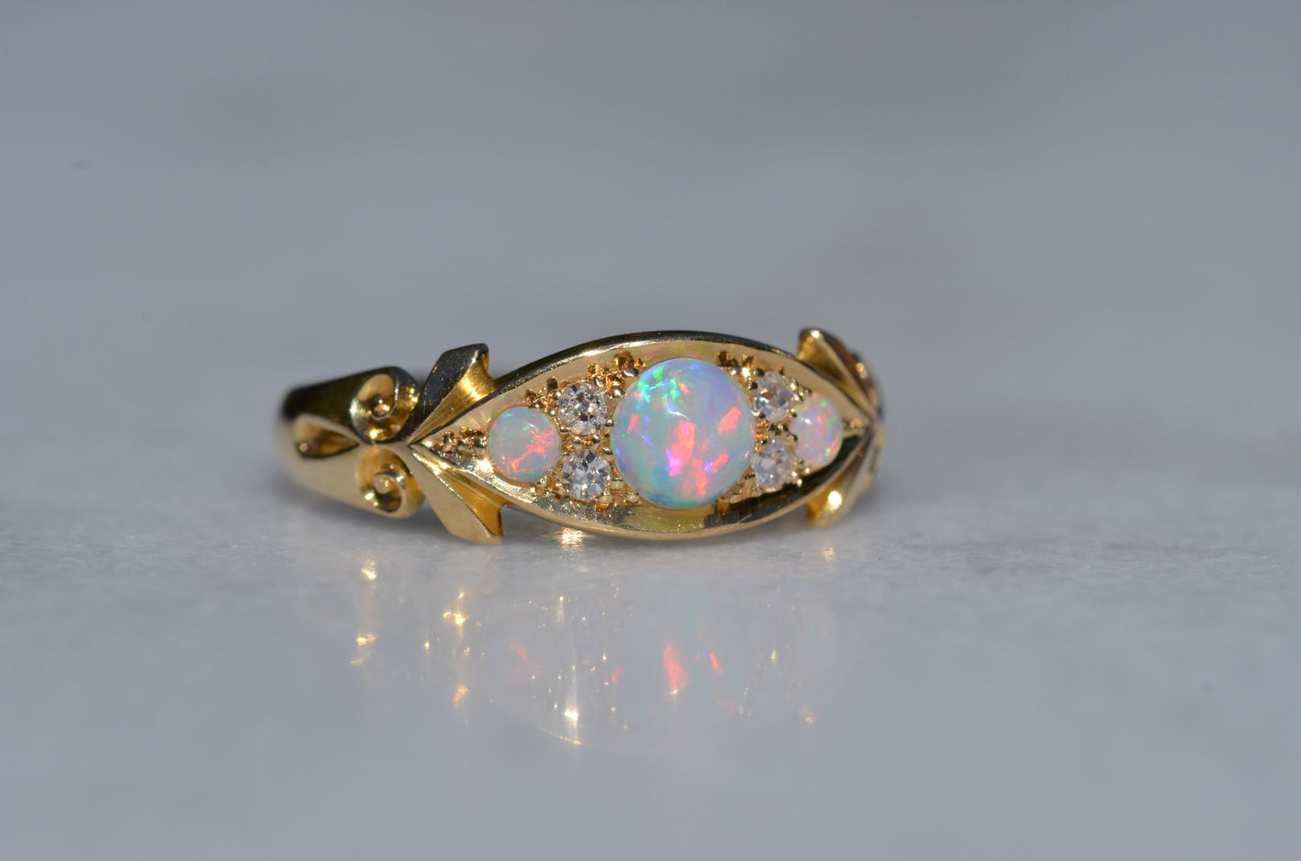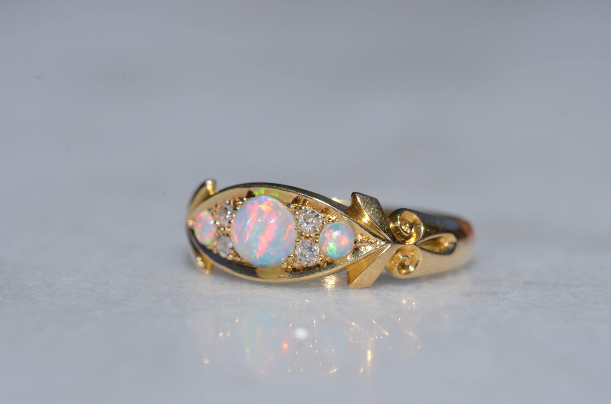• Three natural round opals (approximately 2.25mm and 4.7mm diameters) and four natural old European cut diamonds approximately 0.06 carat total weight