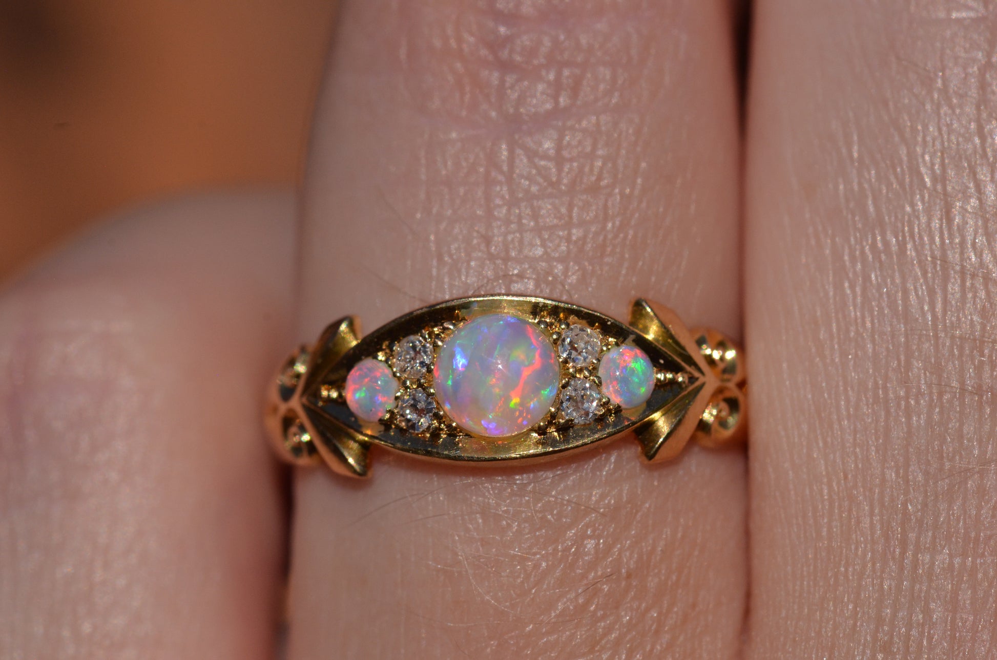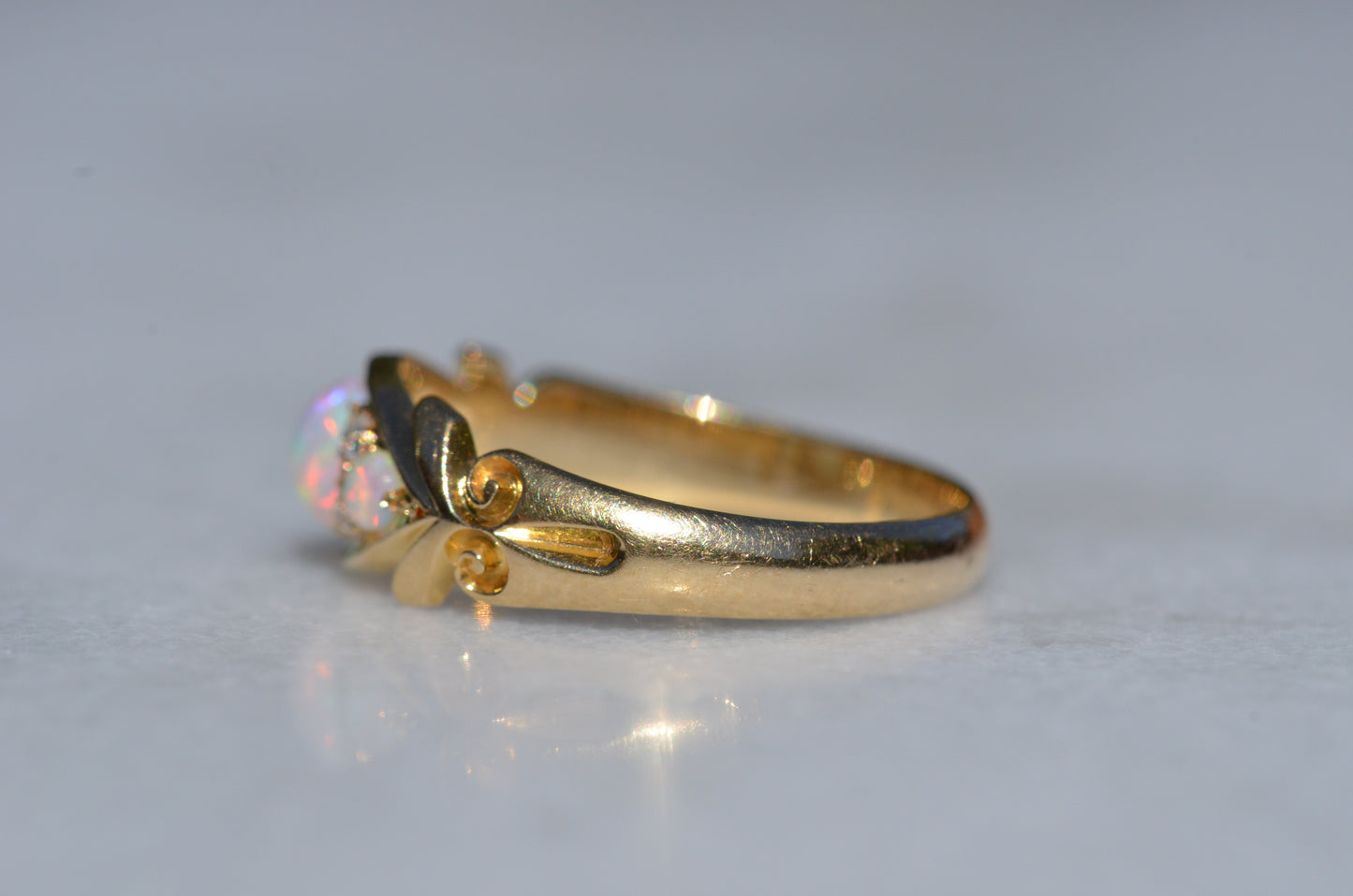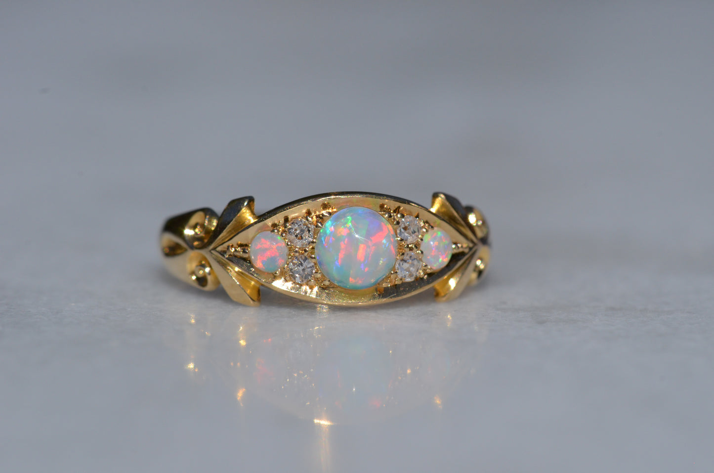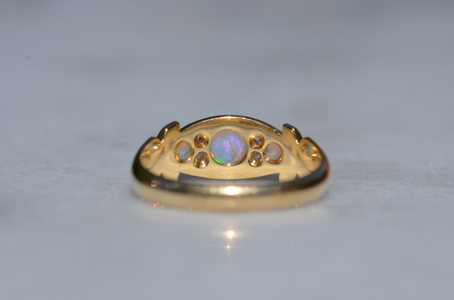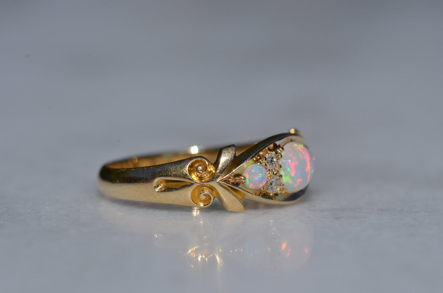 • Three natural round opals (approximately 2.25mm and 4.7mm diameters) and four natural old European cut diamonds approximately 0.06 carat total weight