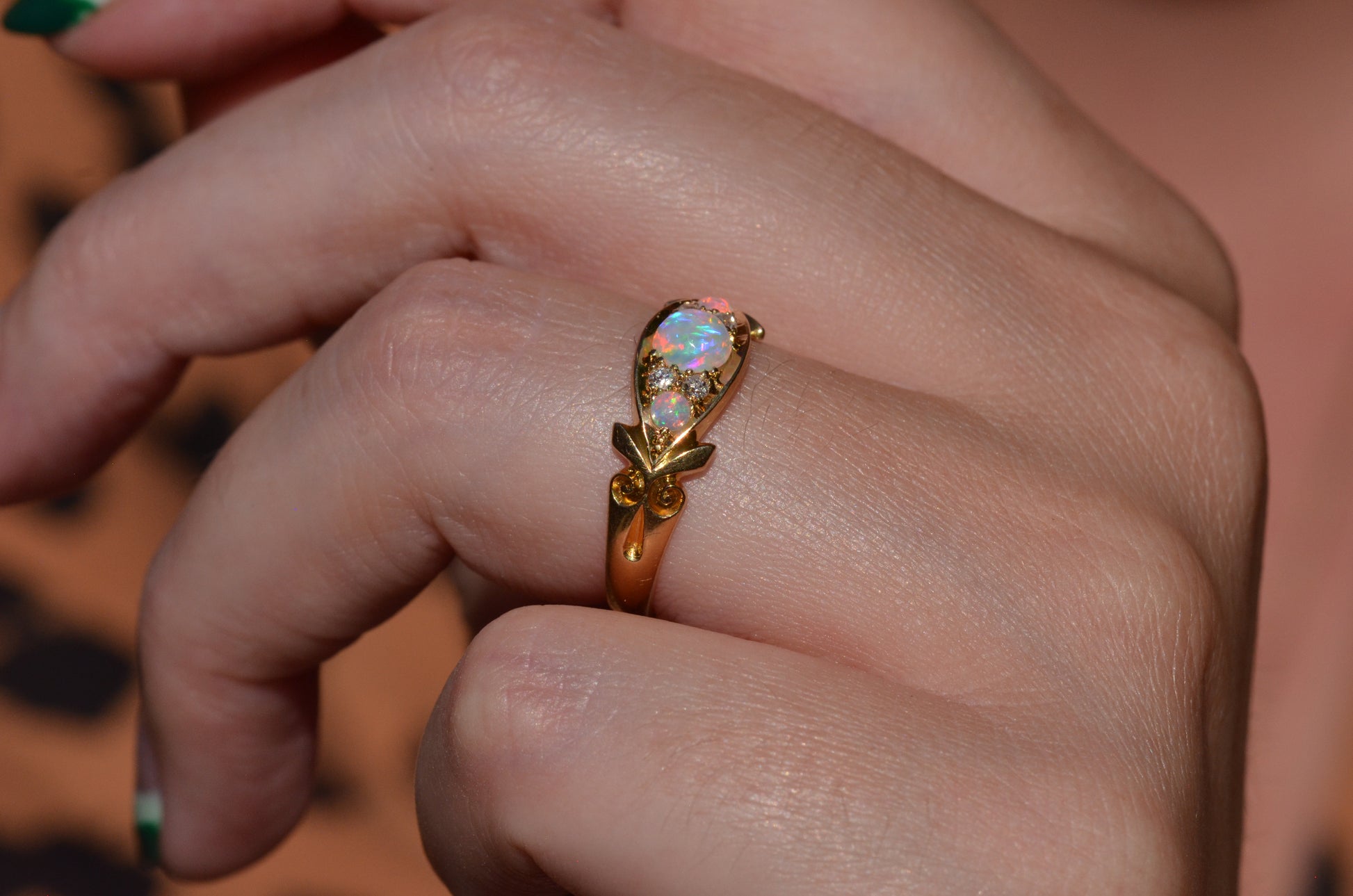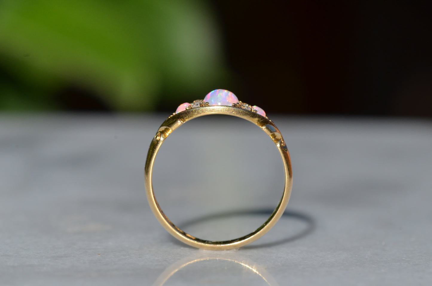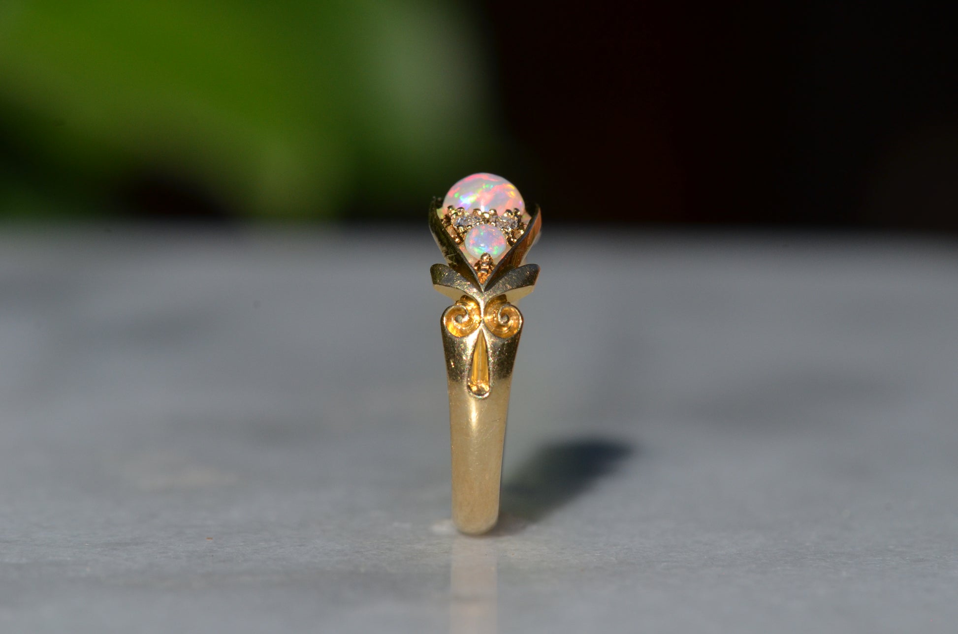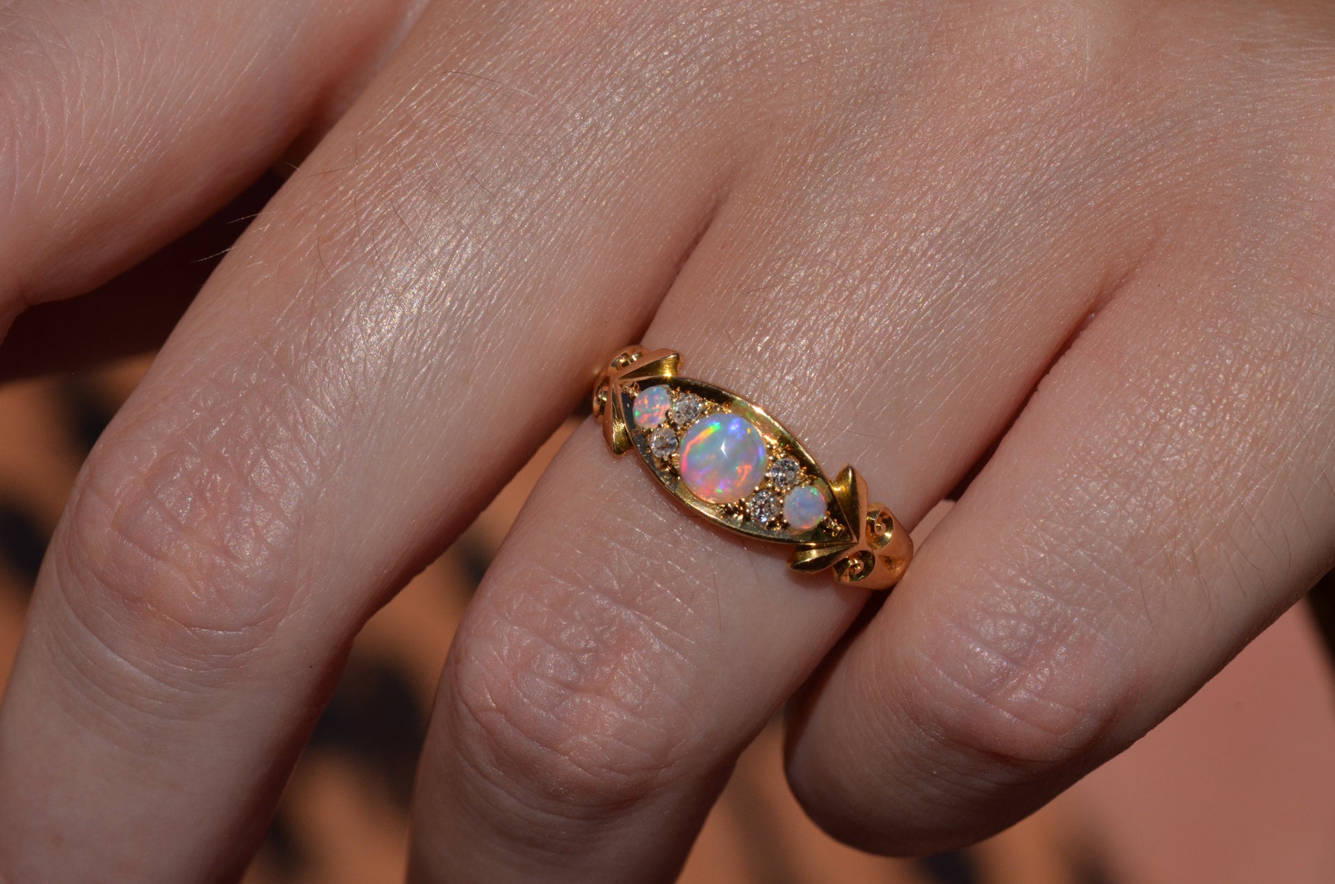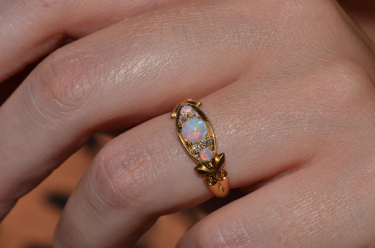 • Three natural round opals (approximately 2.25mm and 4.7mm diameters) and four natural old European cut diamonds approximately 0.06 carat total weight
