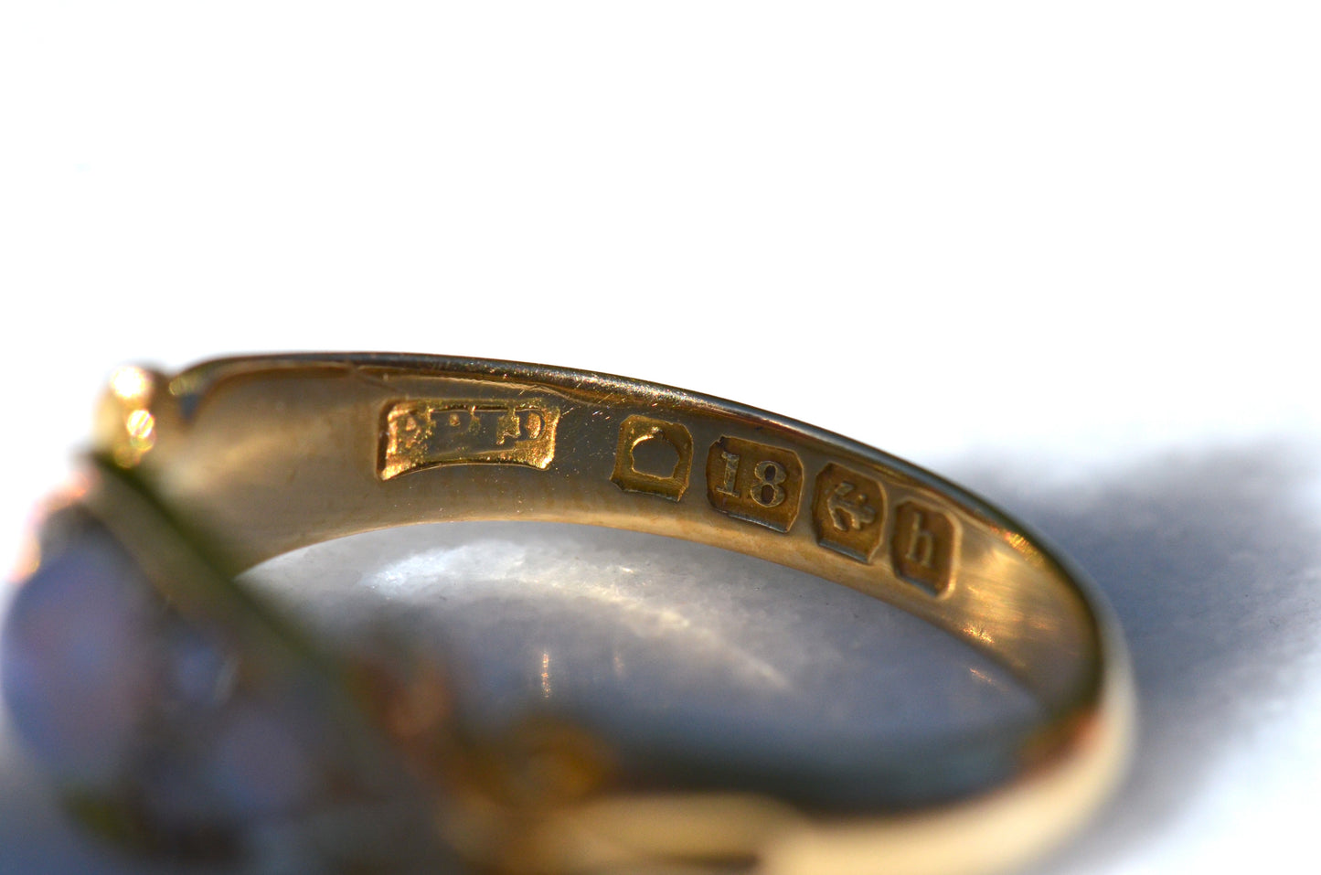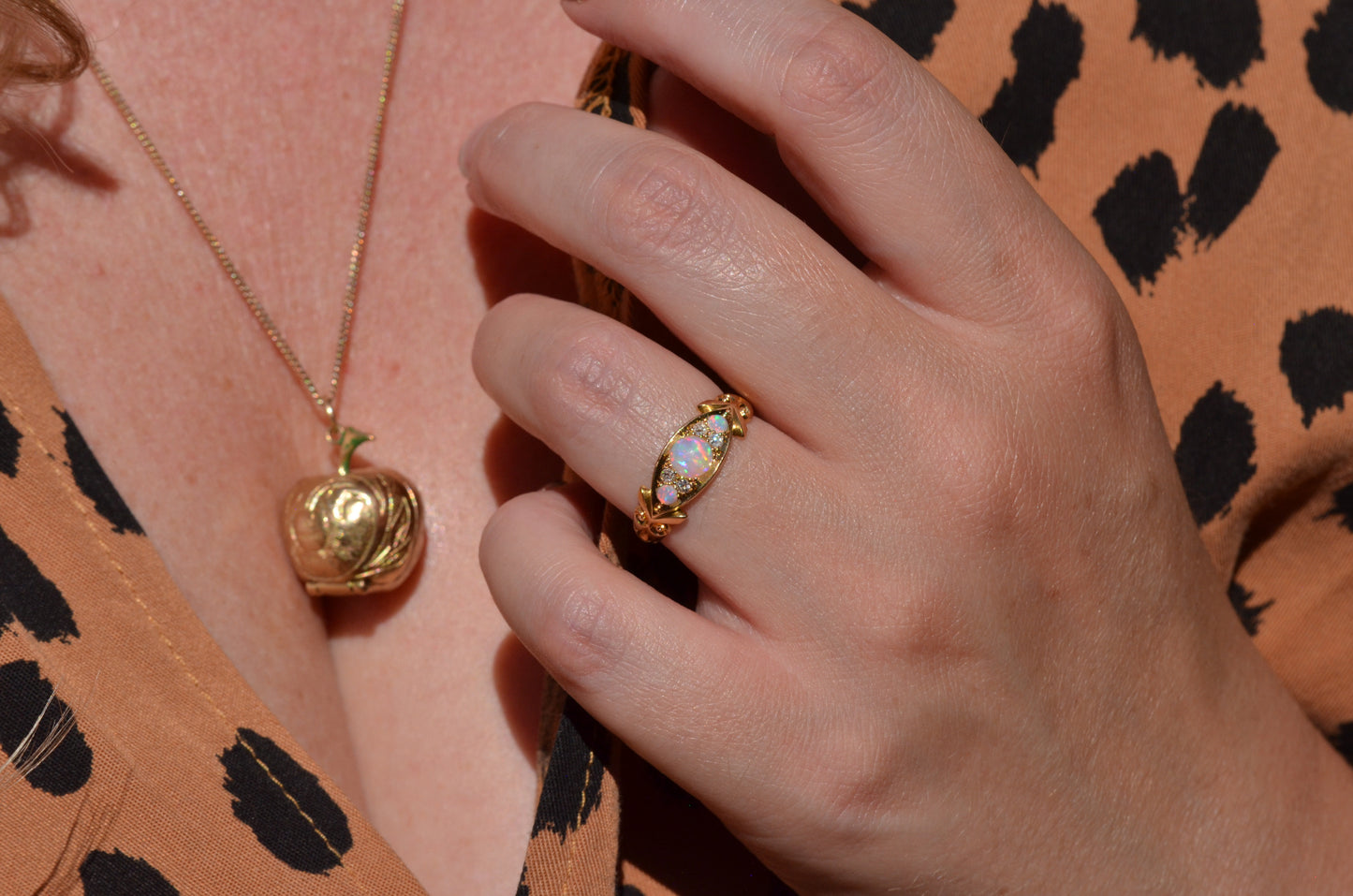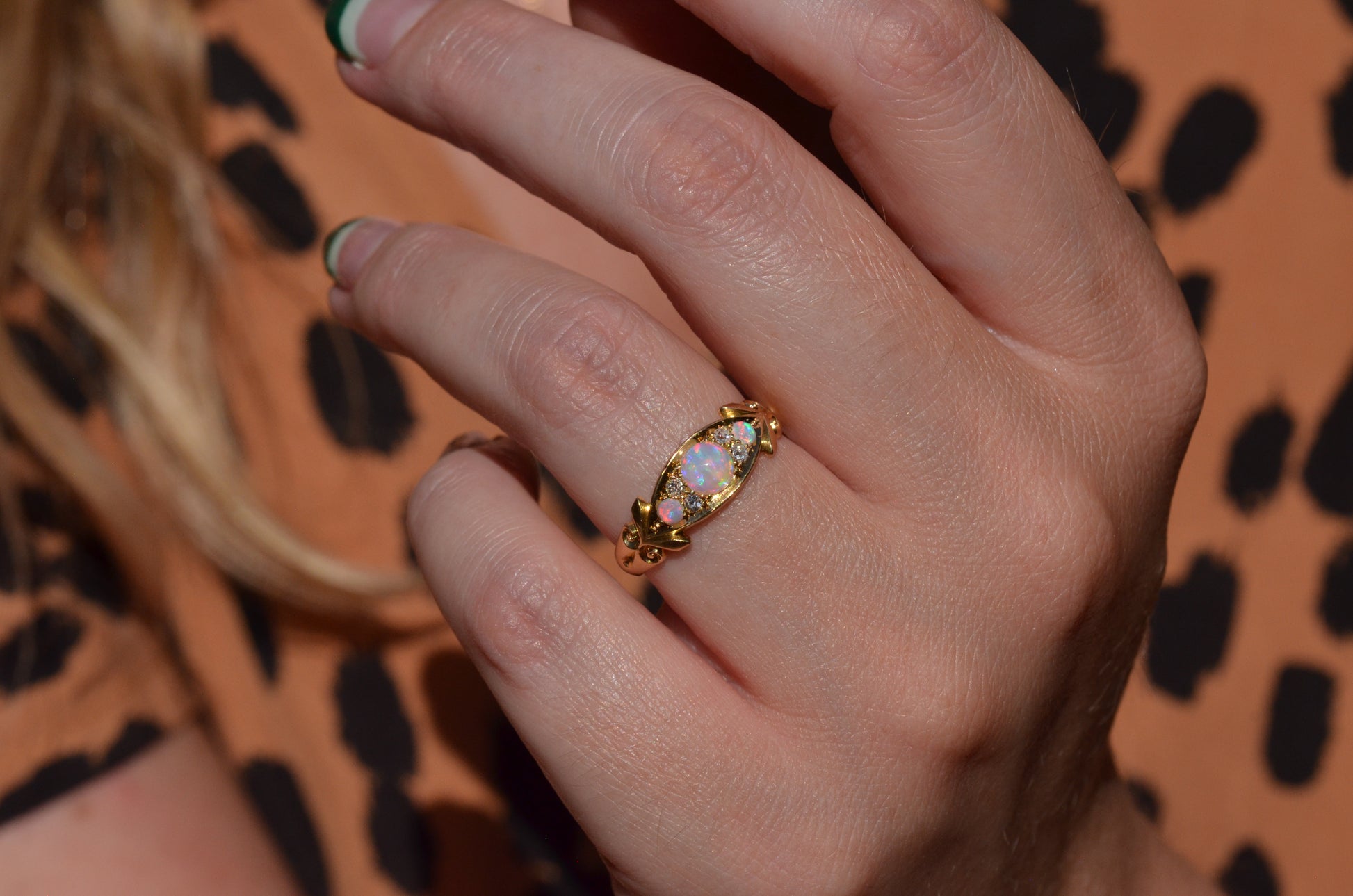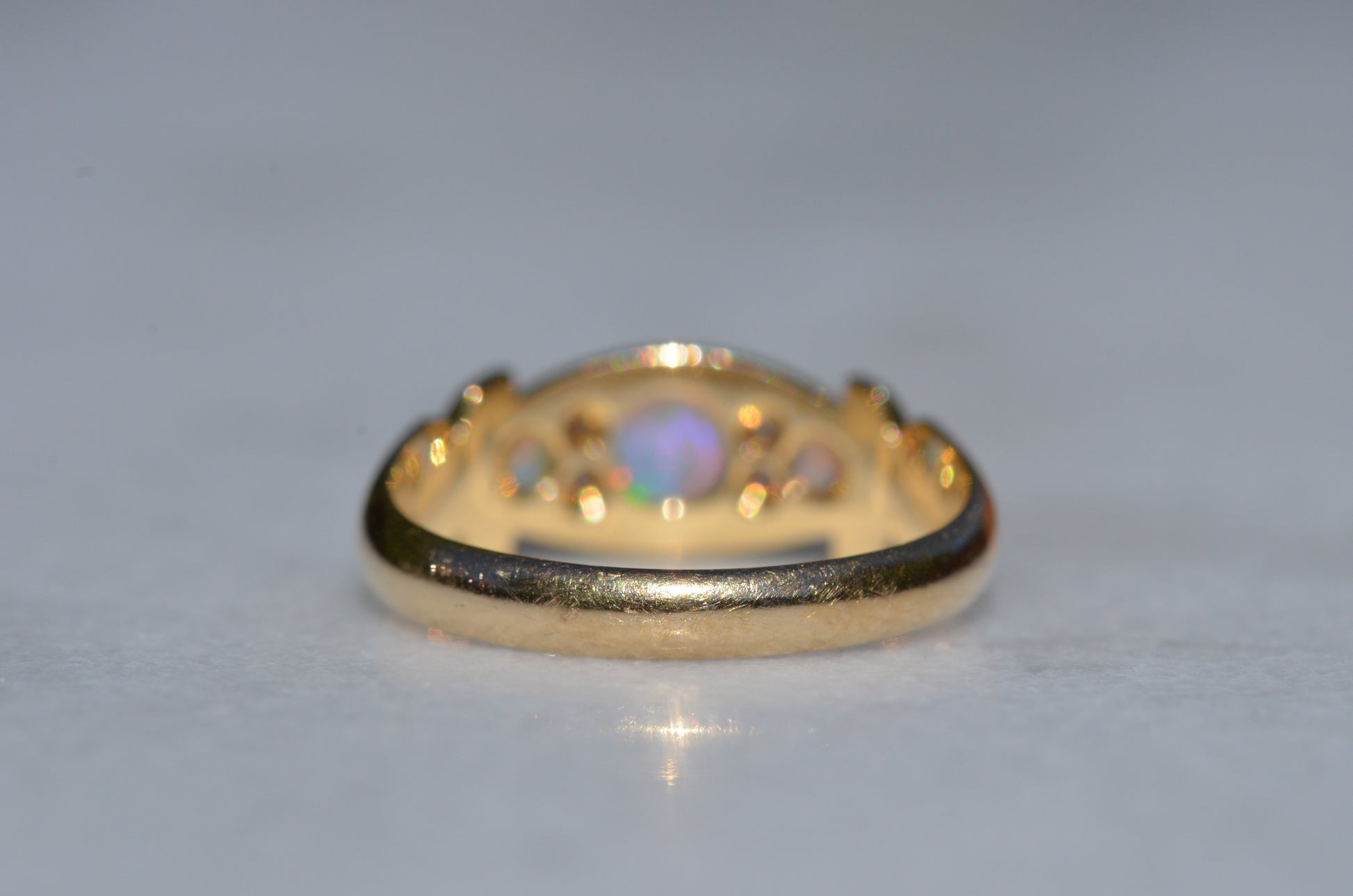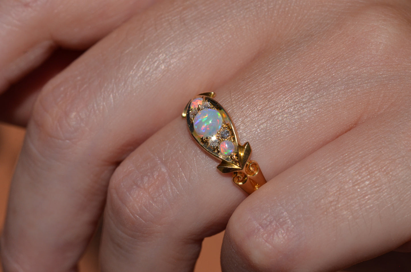 • Three natural round opals (approximately 2.25mm and 4.7mm diameters) and four natural old European cut diamonds approximately 0.06 carat total weight