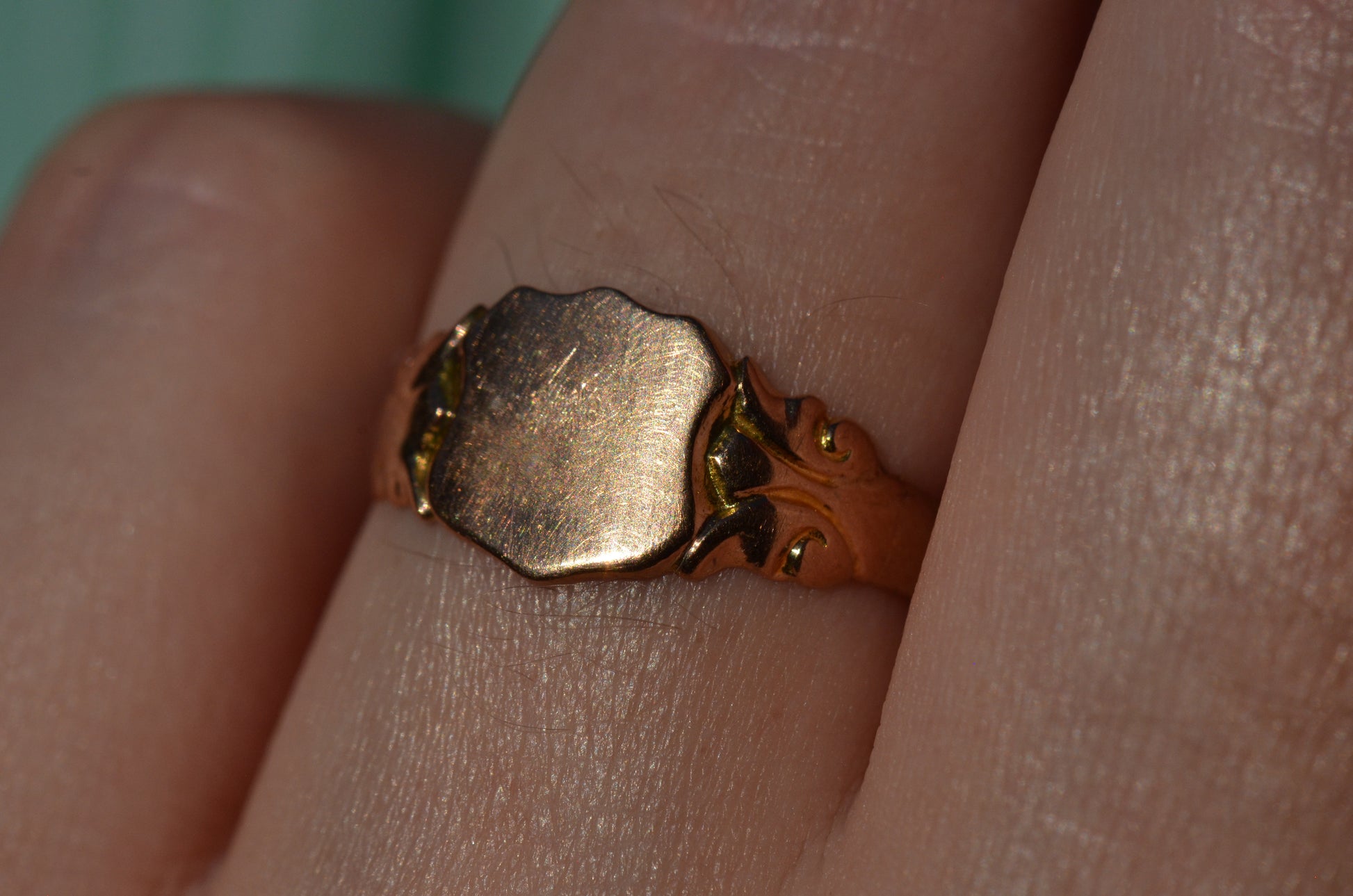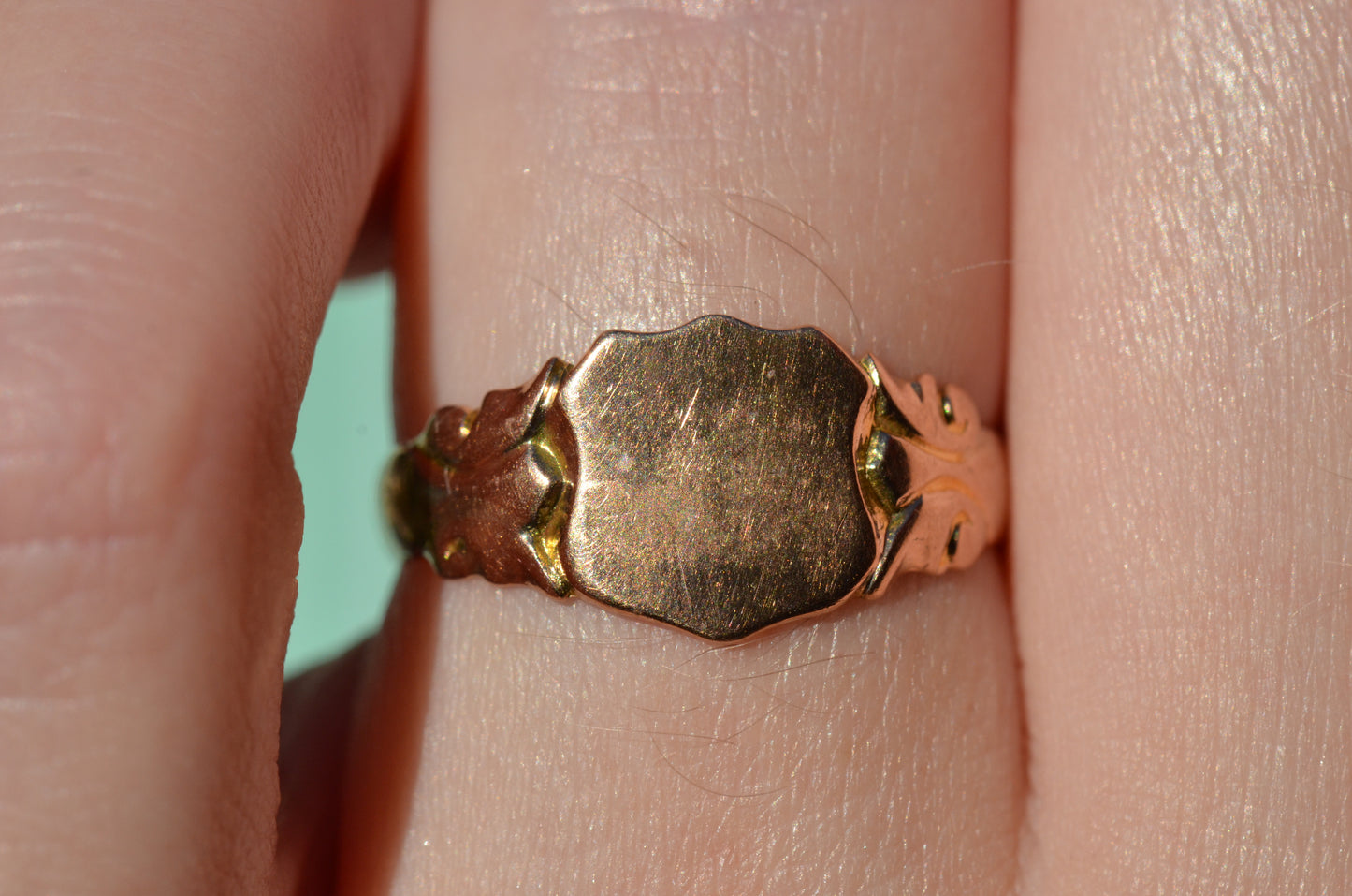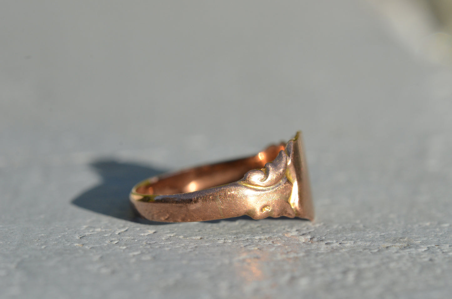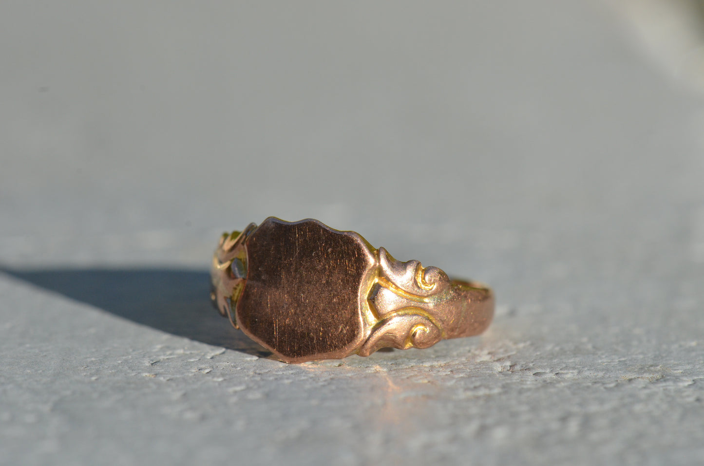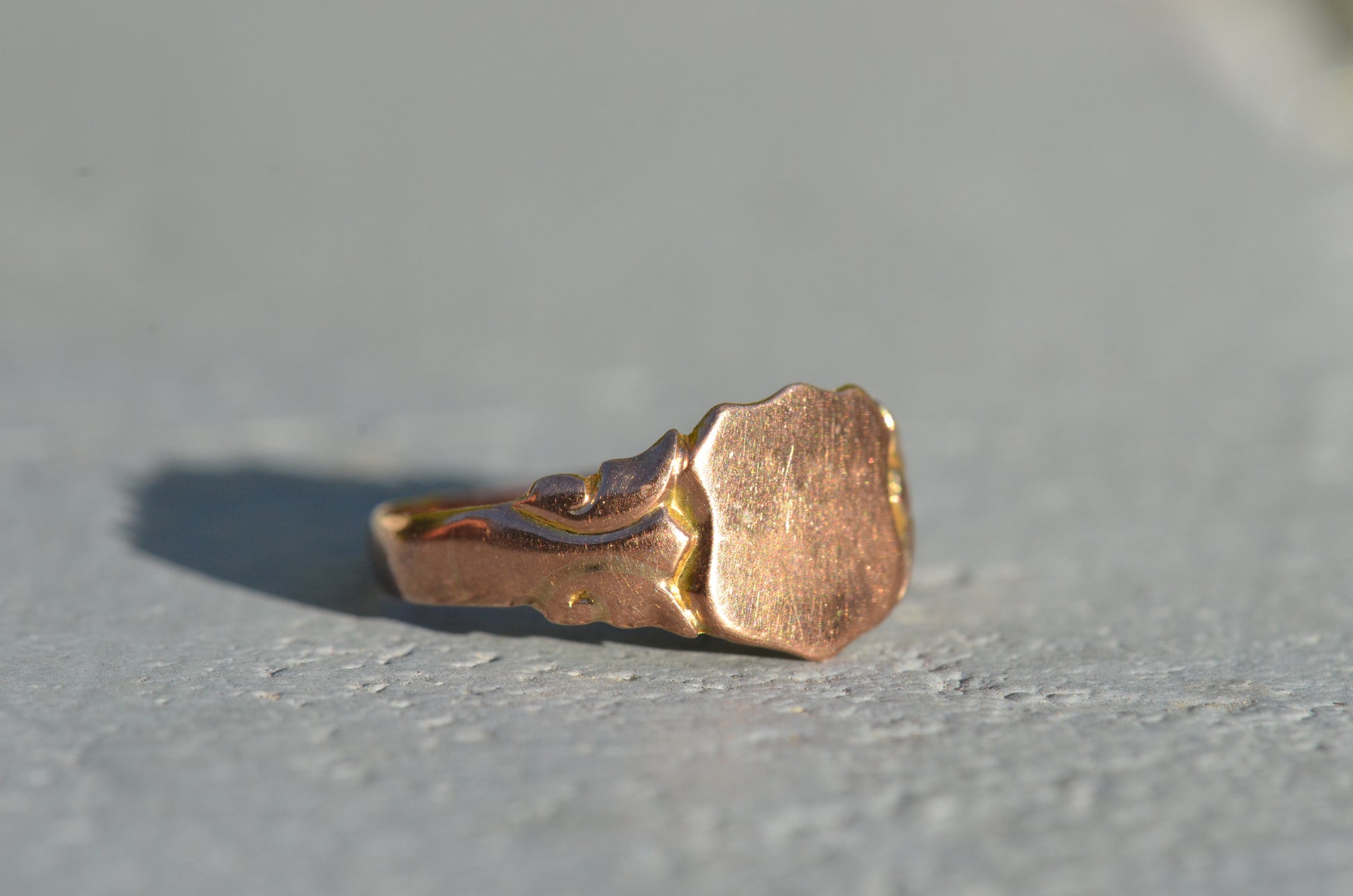 A gorgeous early 20th century signet in a style that feels timeless despite nods to the era, with lovely scrolling shoulders and a smooth blank slate of a face. Often our blank signets come to us either pristine (and younger) or deeply worn with the faintest trace of past engraving - this wonderful piece is a sort of middle ground: while worn and loved with a soft patina that speaks to its age, it appears to have never been engraved.