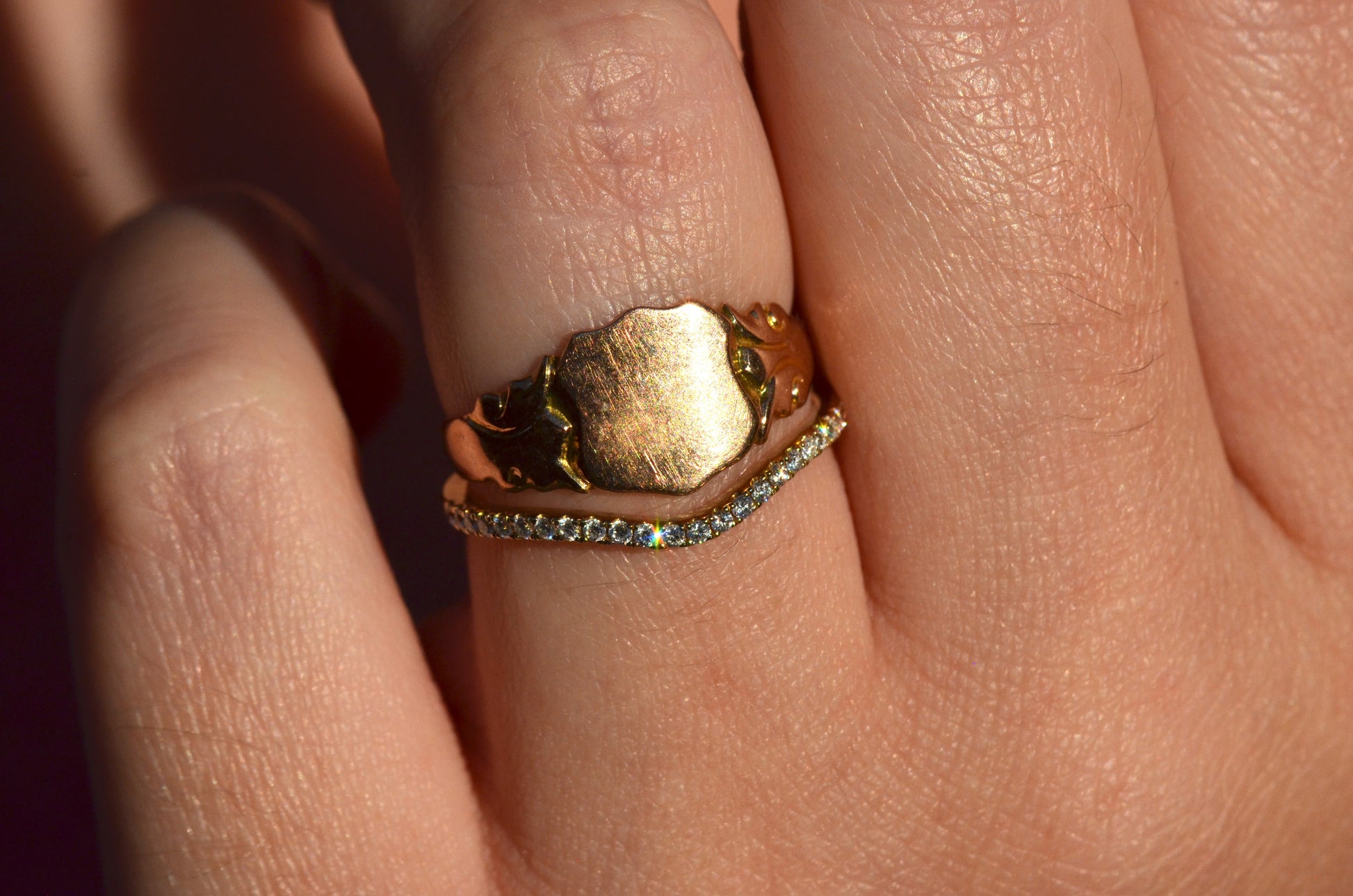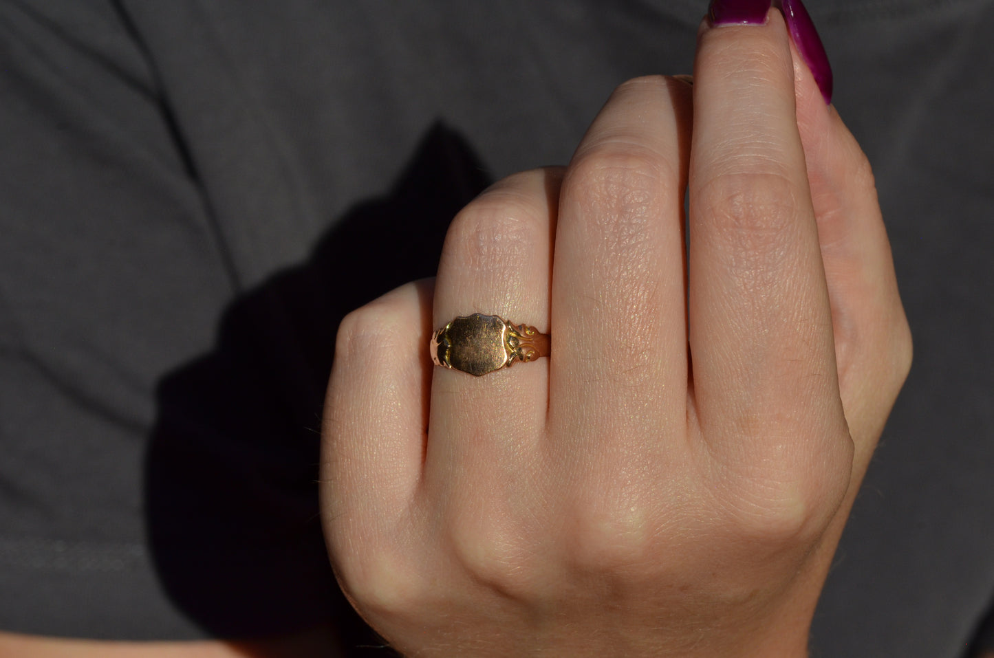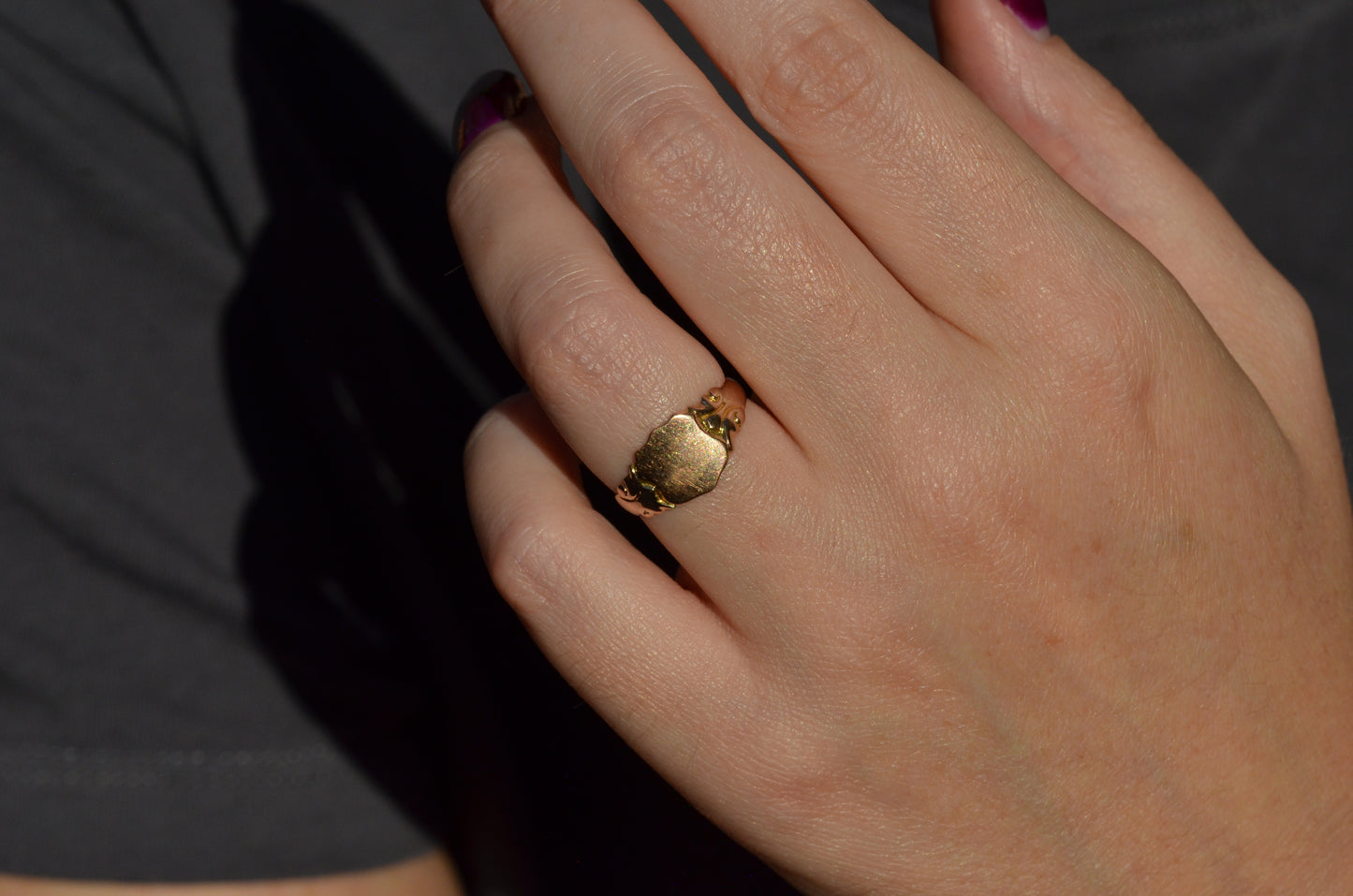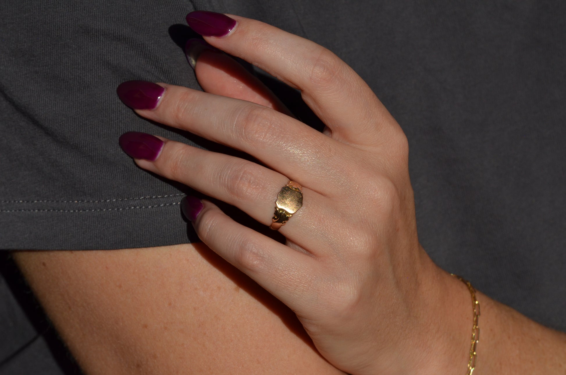 A gorgeous early 20th century signet in a style that feels timeless despite nods to the era, with lovely scrolling shoulders and a smooth blank slate of a face. Often our blank signets come to us either pristine (and younger) or deeply worn with the faintest trace of past engraving - this wonderful piece is a sort of middle ground: while worn and loved with a soft patina that speaks to its age, it appears to have never been engraved.