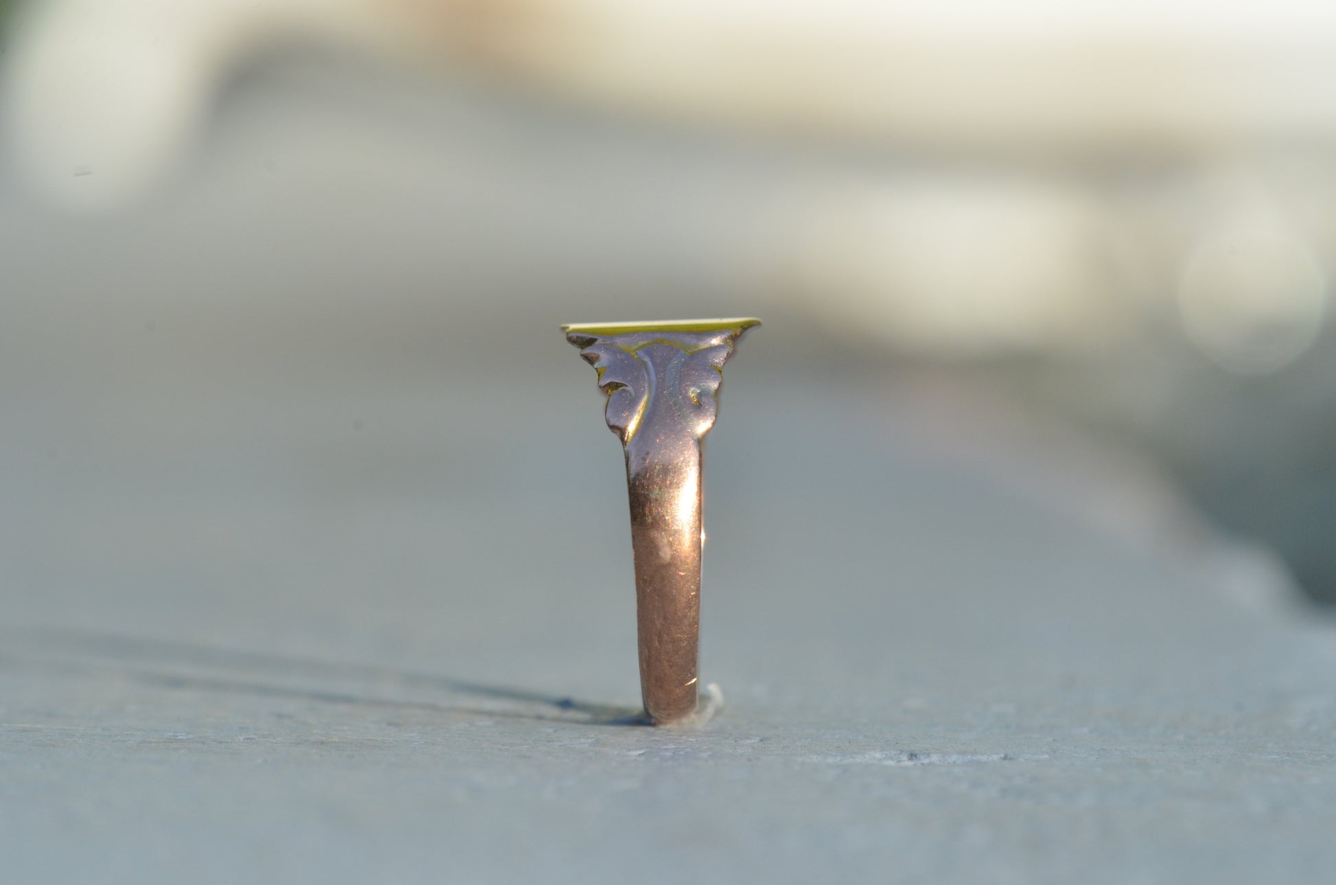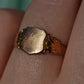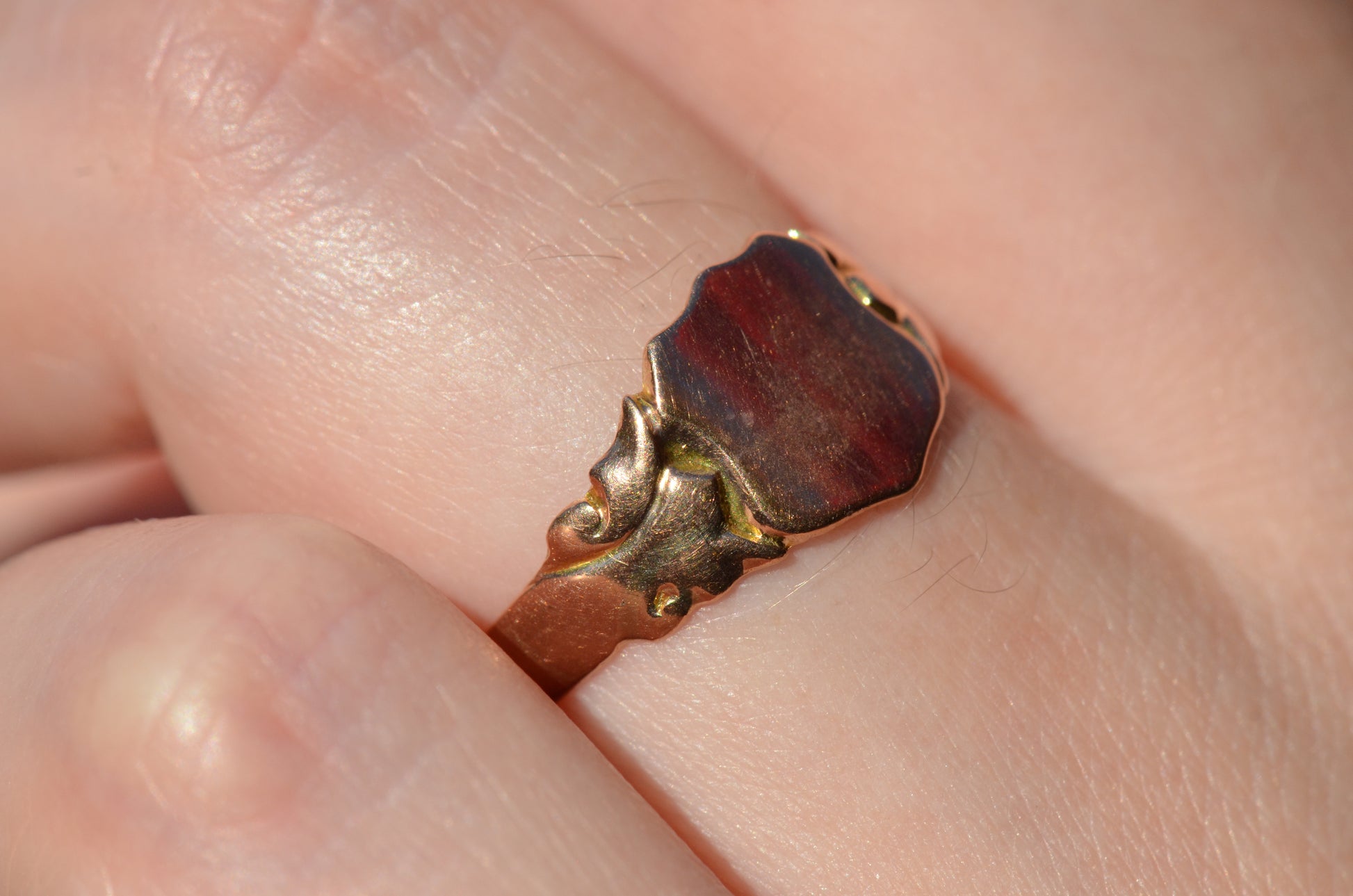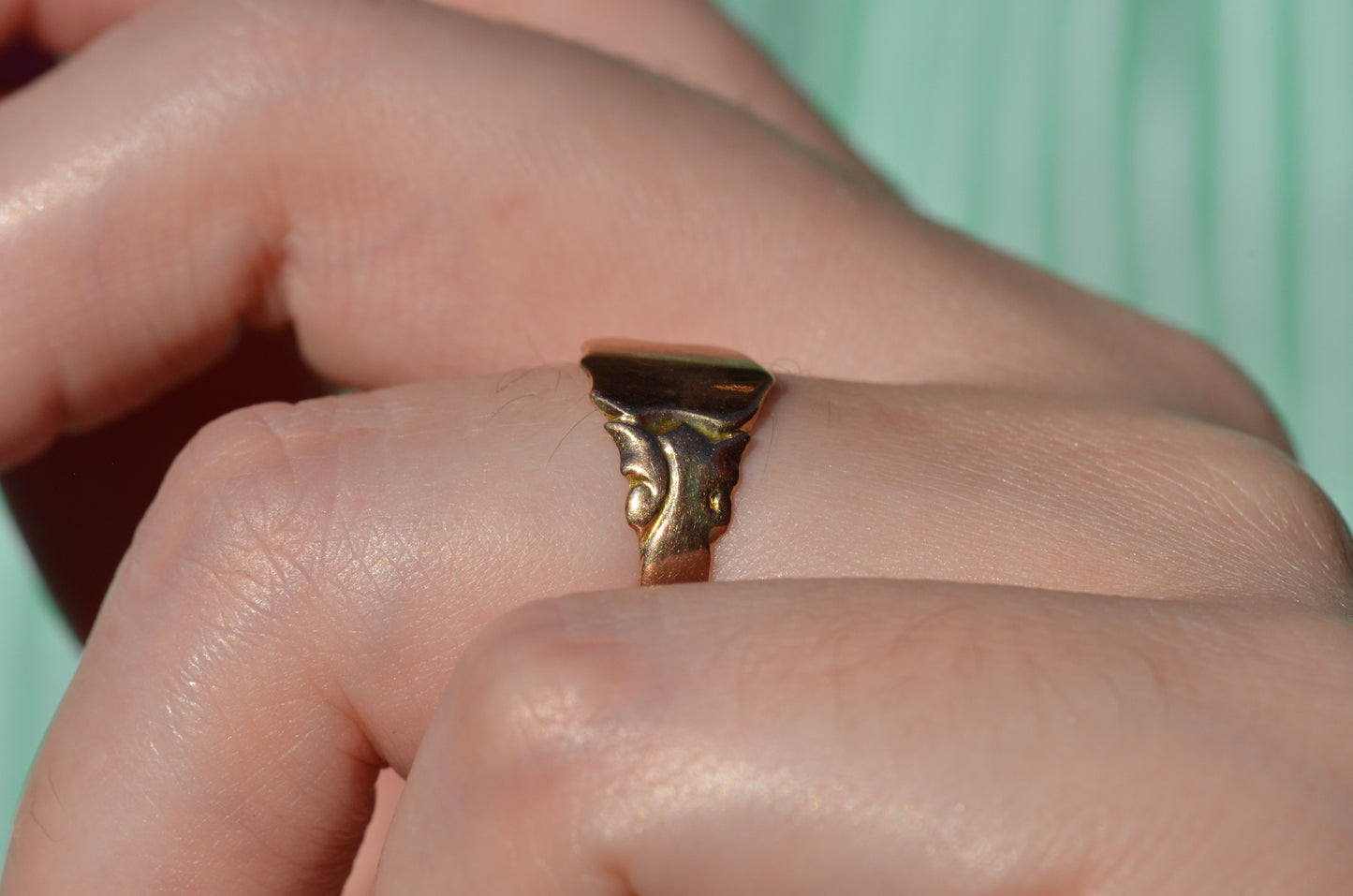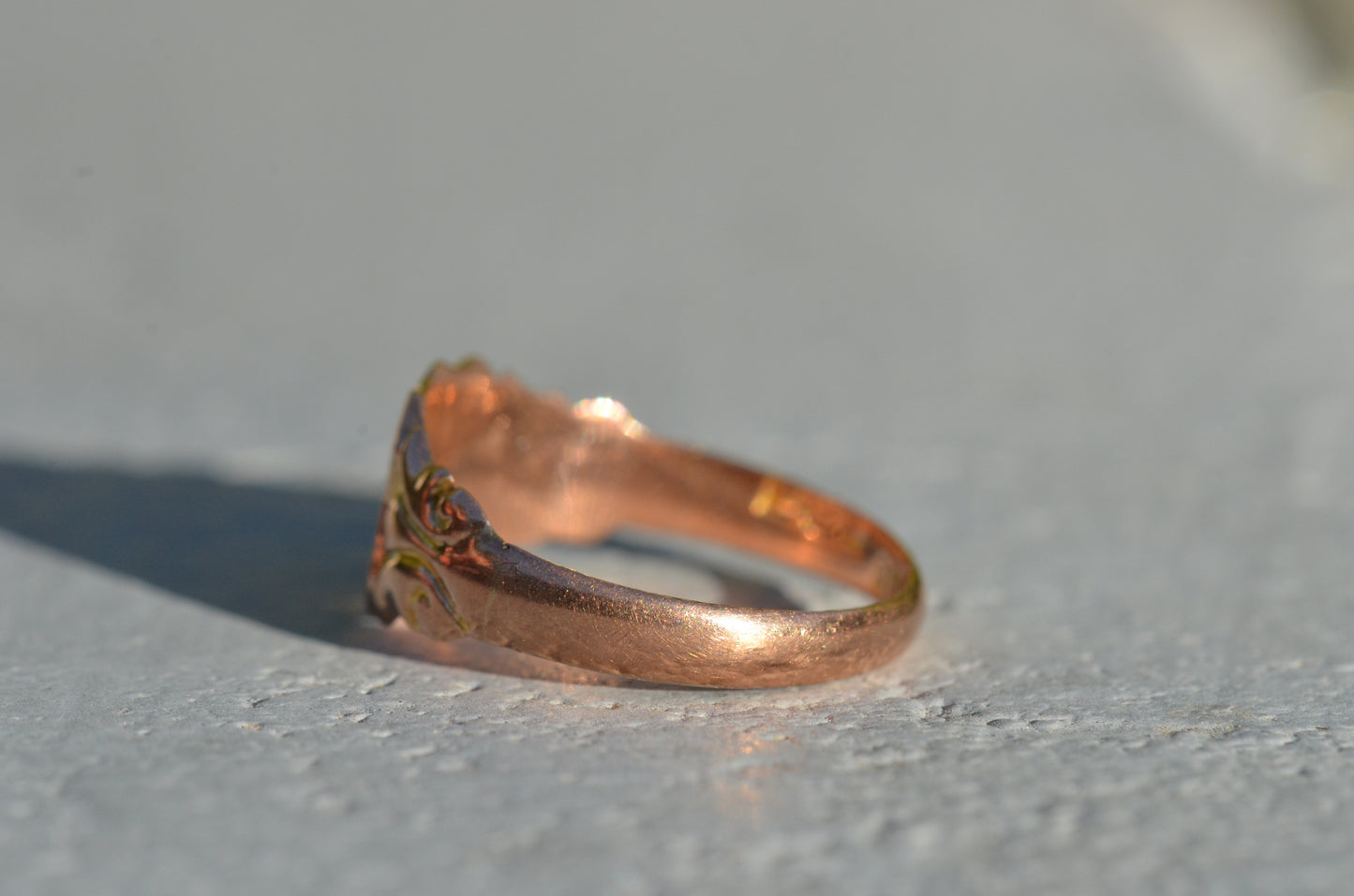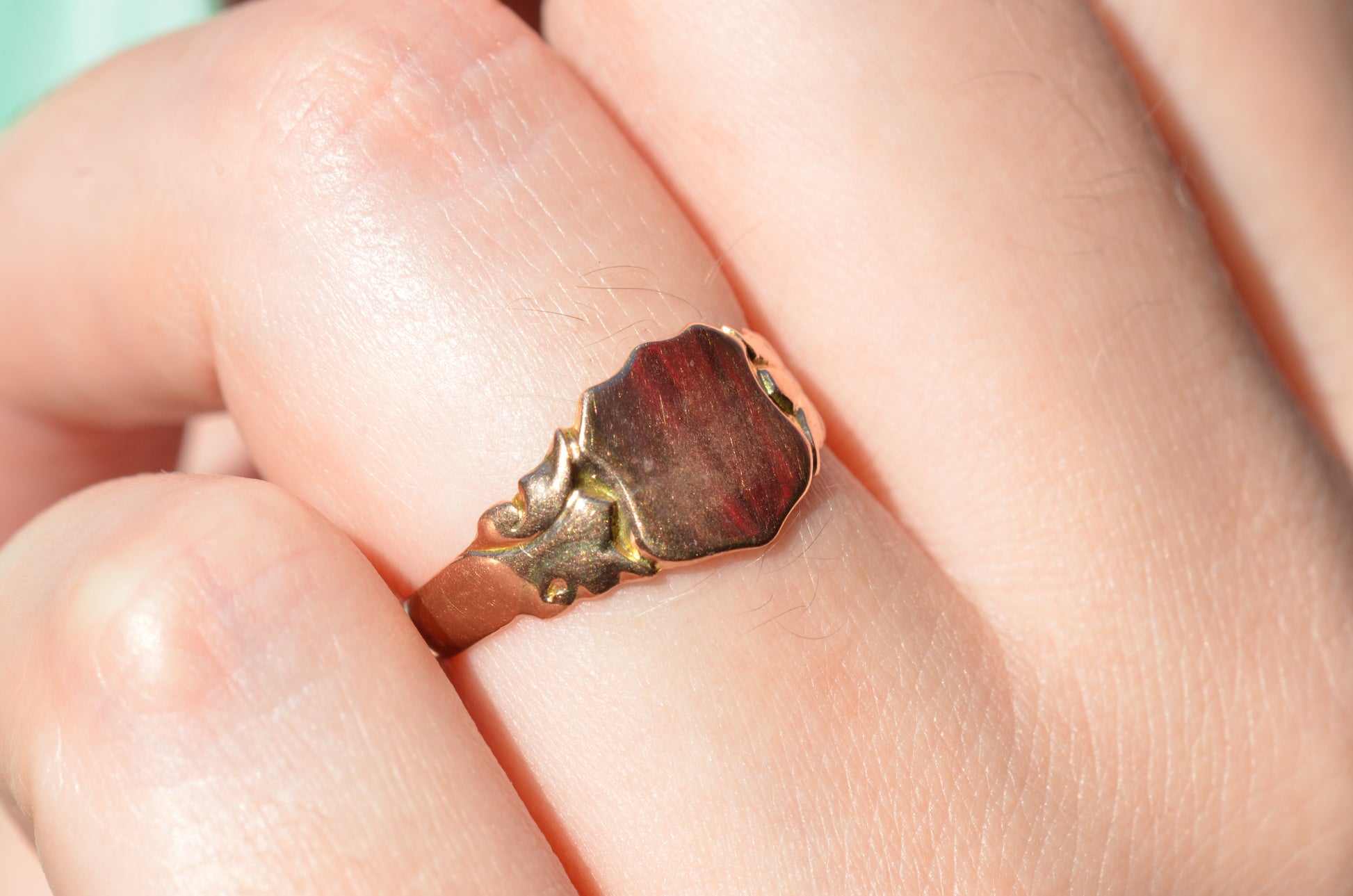A gorgeous early 20th century signet in a style that feels timeless despite nods to the era, with lovely scrolling shoulders and a smooth blank slate of a face. Often our blank signets come to us either pristine (and younger) or deeply worn with the faintest trace of past engraving - this wonderful piece is a sort of middle ground: while worn and loved with a soft patina that speaks to its age, it appears to have never been engraved.