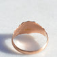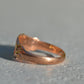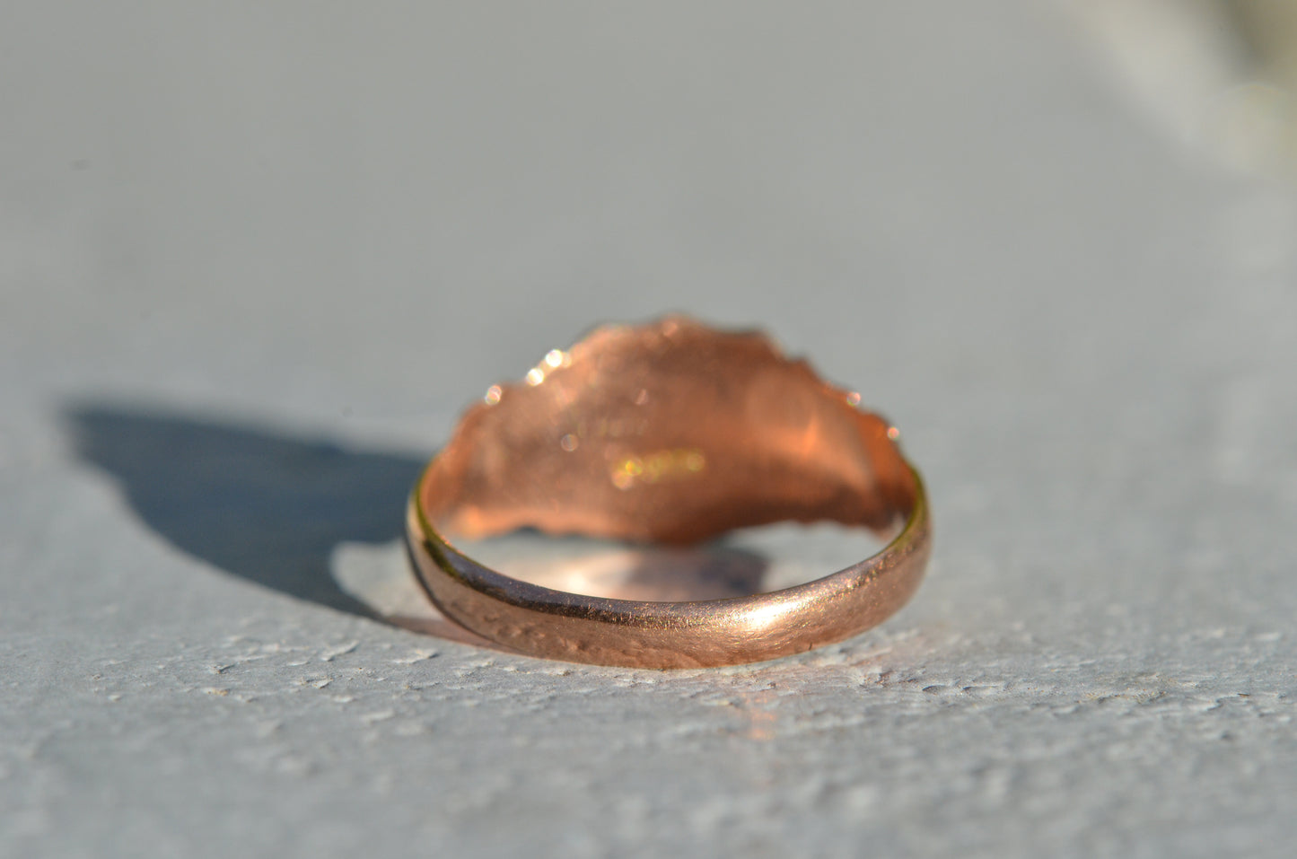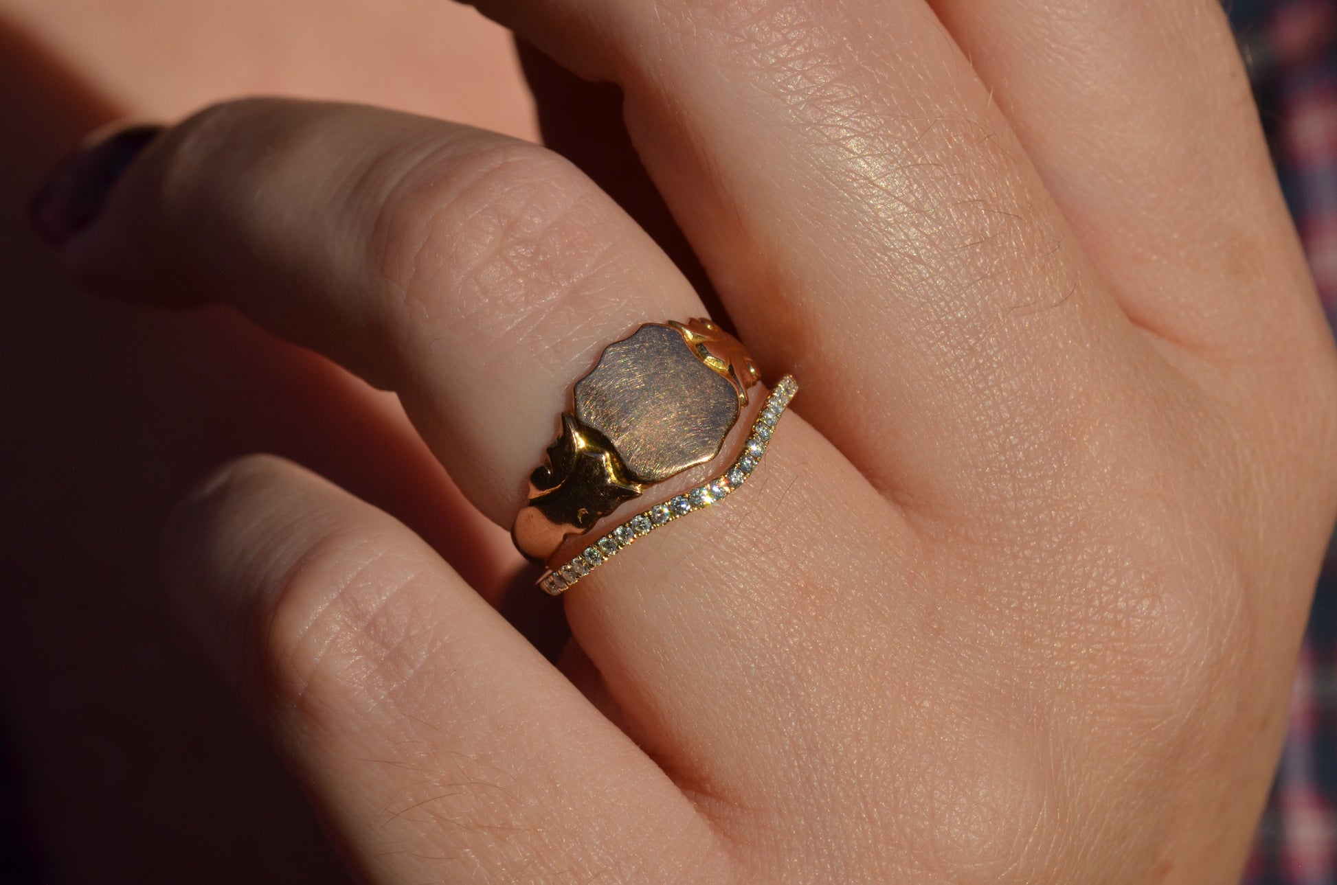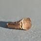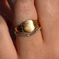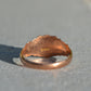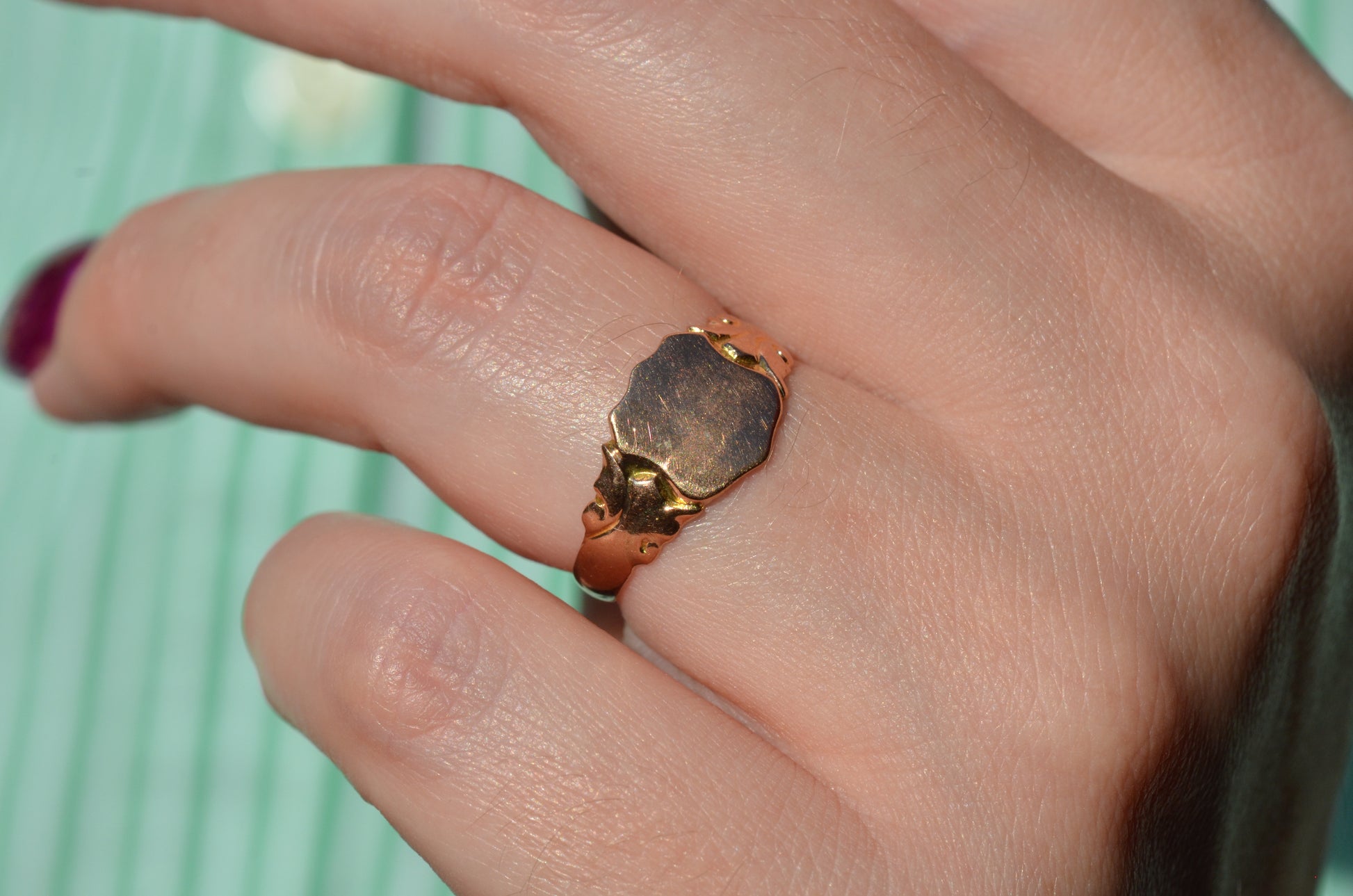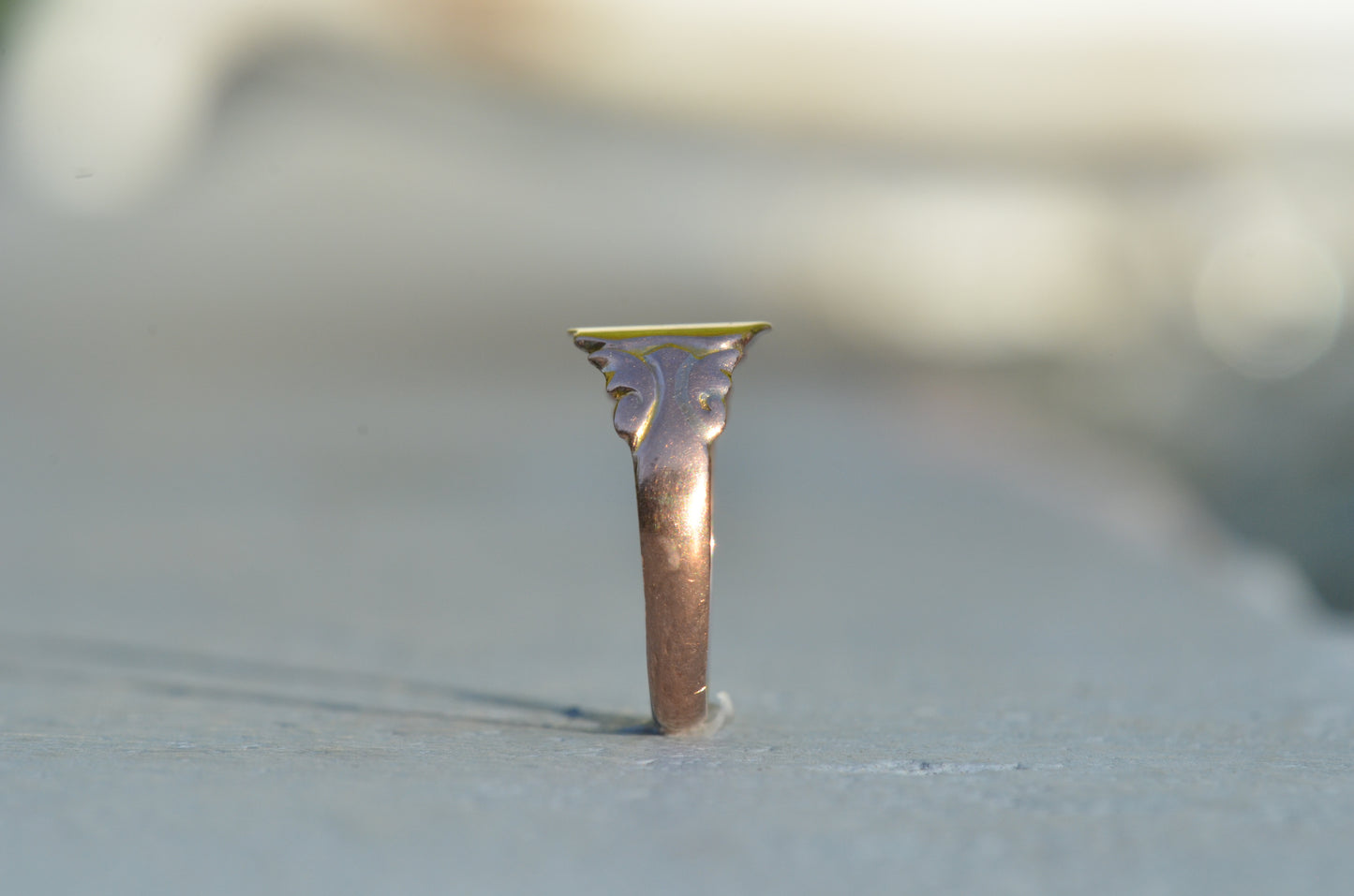 A gorgeous early 20th century signet in a style that feels timeless despite nods to the era, with lovely scrolling shoulders and a smooth blank slate of a face. Often our blank signets come to us either pristine (and younger) or deeply worn with the faintest trace of past engraving - this wonderful piece is a sort of middle ground: while worn and loved with a soft patina that speaks to its age, it appears to have never been engraved.
